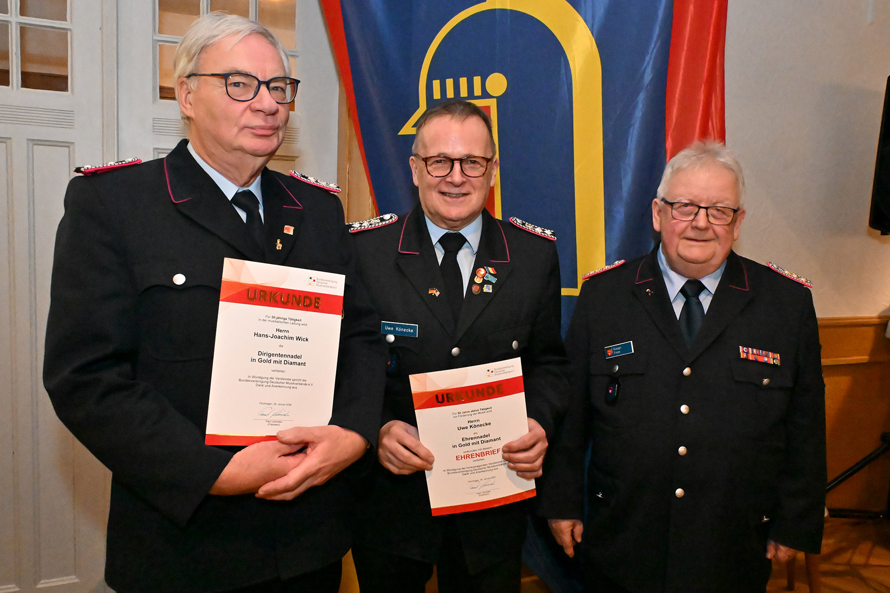 Regionsstabführer Rüdiger Finze zeichnete Hans-Joachim Wick für 30-jährige Tätigkeit in der musikalischen Leitung mit der Dirigentennadel in Gold mit Diamant aus. Die Ehrennadel in Gold mit Diamant erhielt Uwe Könecke für 50-jährige aktive Tätigkeit zur Förderung der Musik.