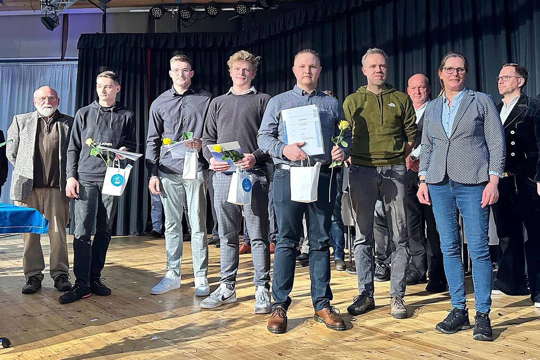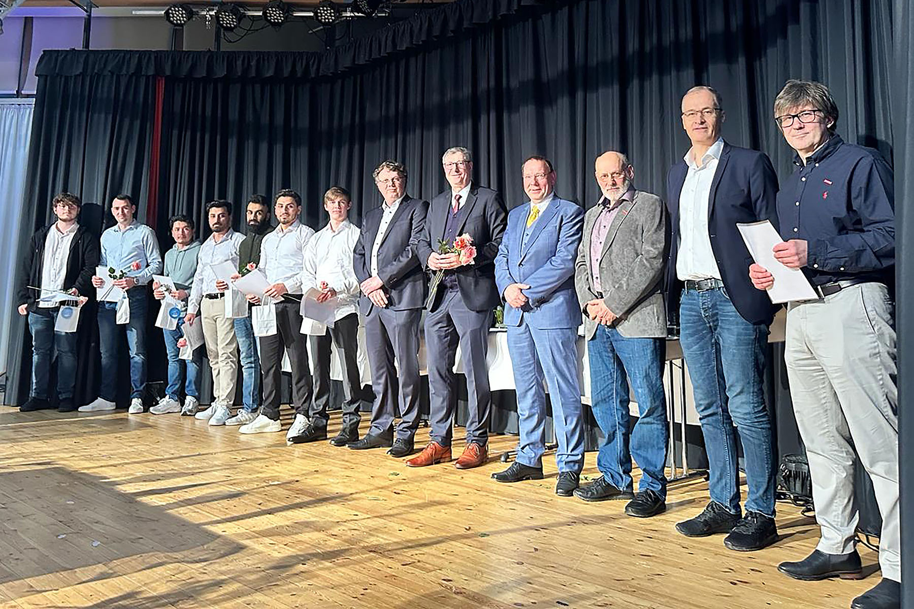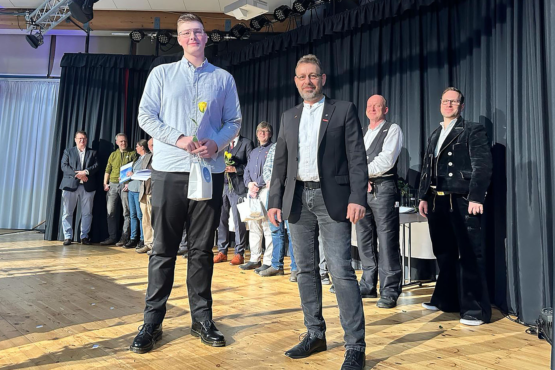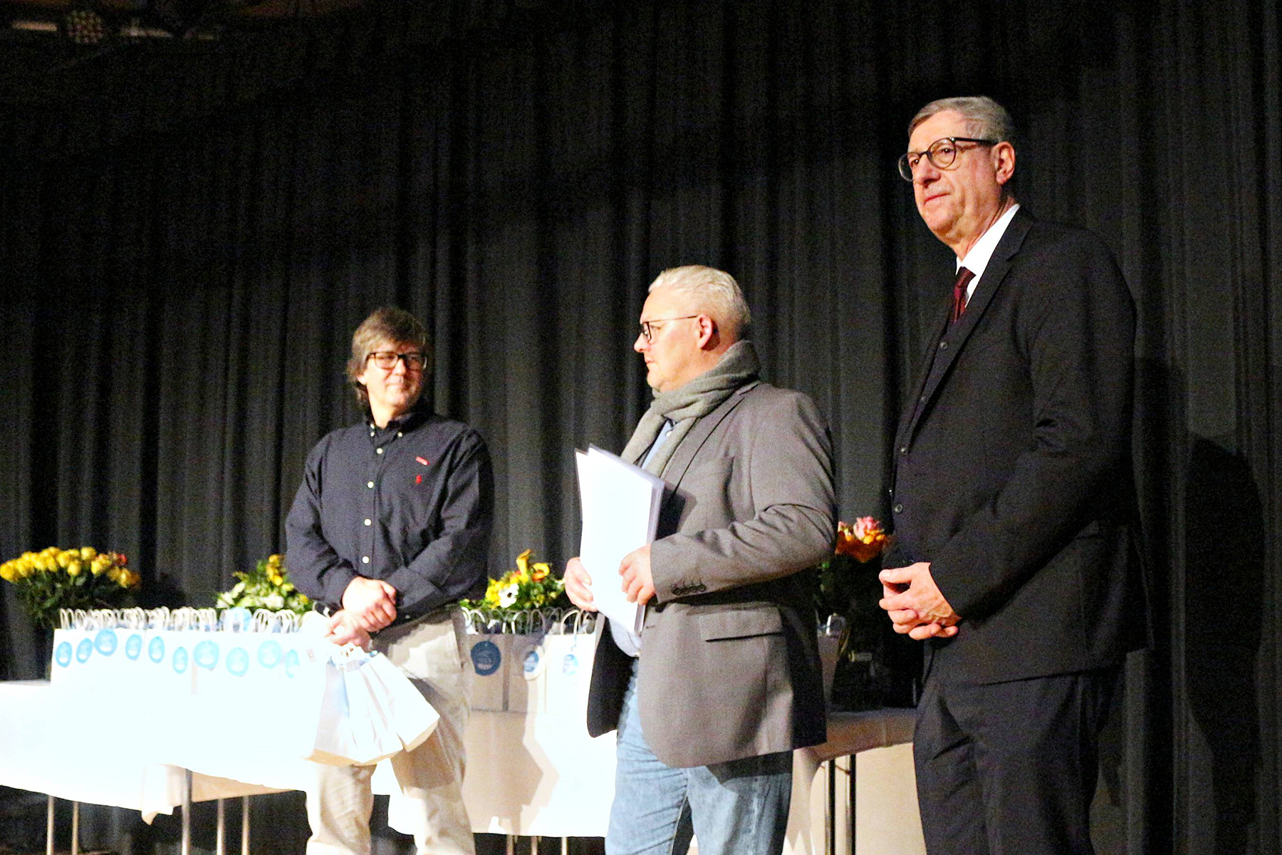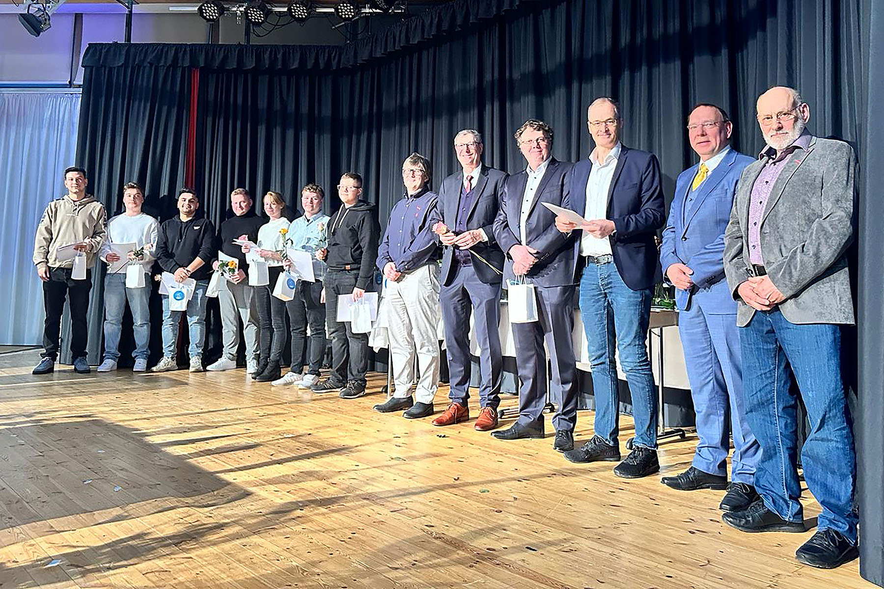Für die dann beginnende erste Überreichung der Gesellenbriefe wurden der gastgebende Bürgermeister Armin Pollehn und der Obermeister der Sanitär- und Heizungstechnik-Innung, Martin Block (Burgdorf), auf die Bühne gebeten.