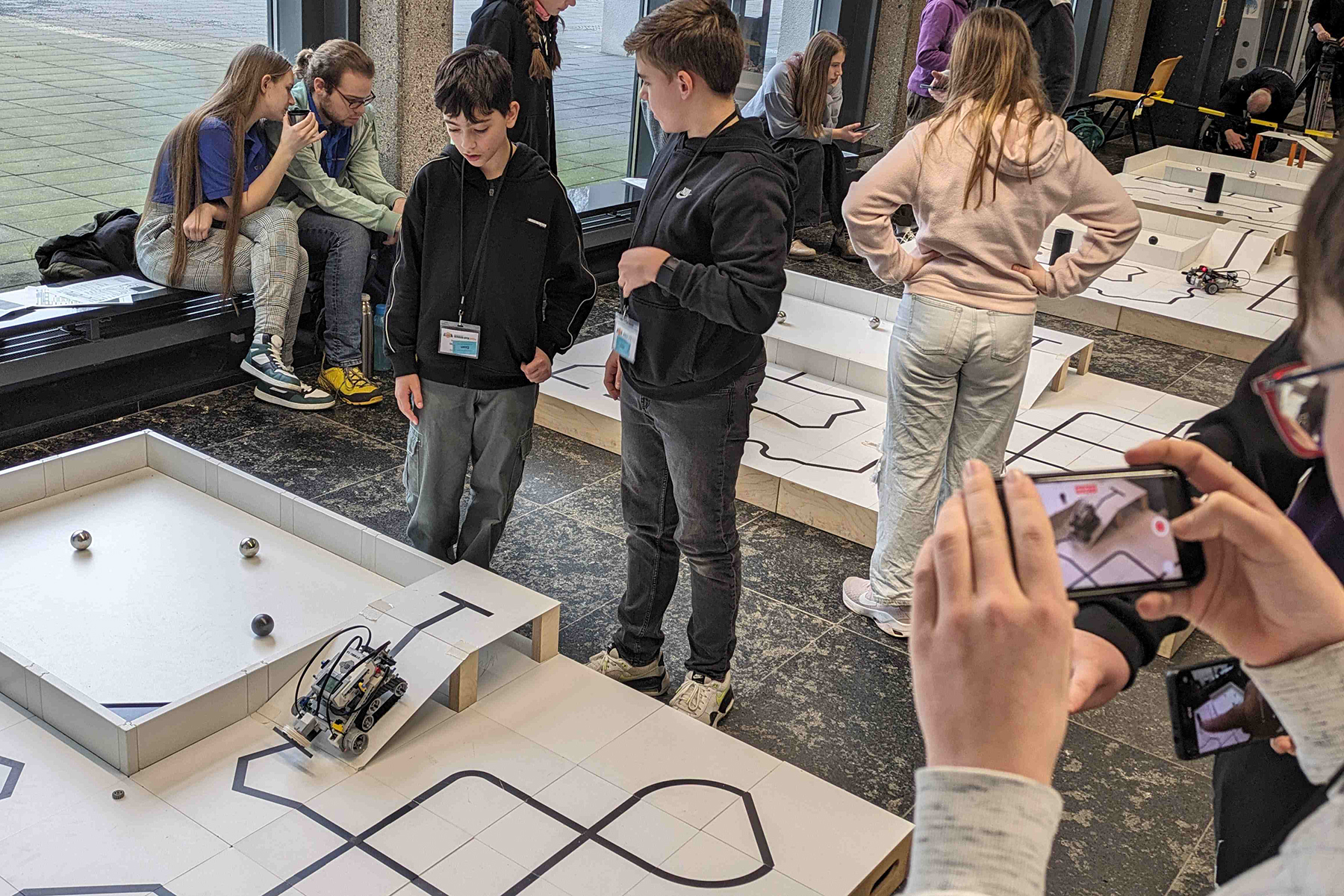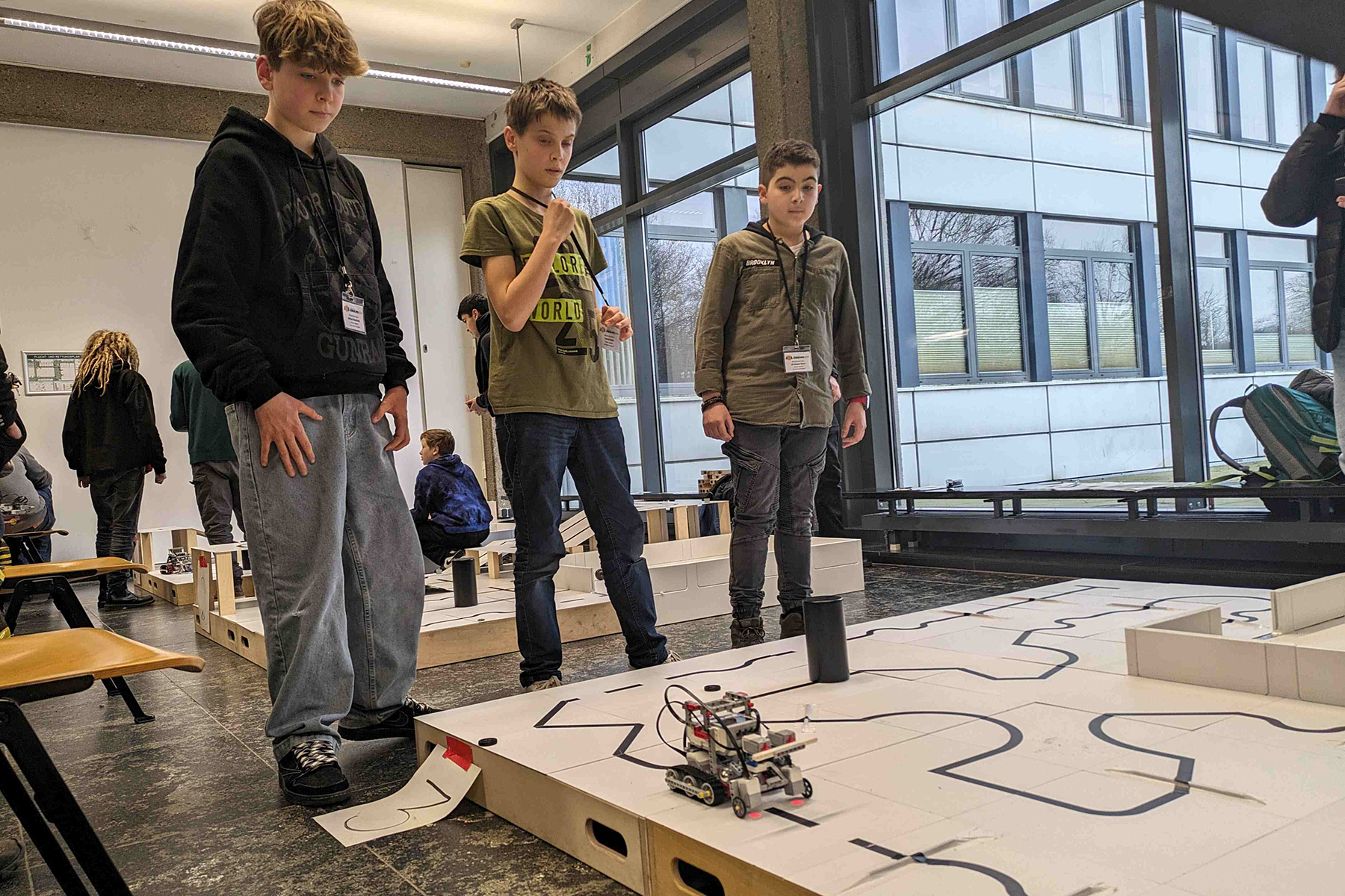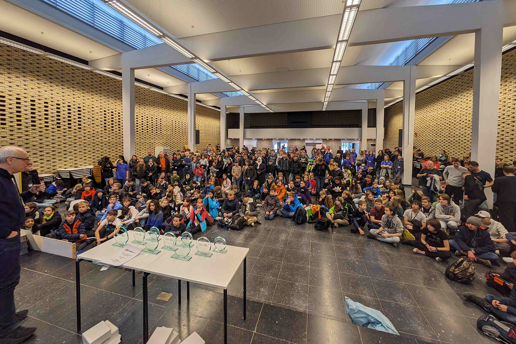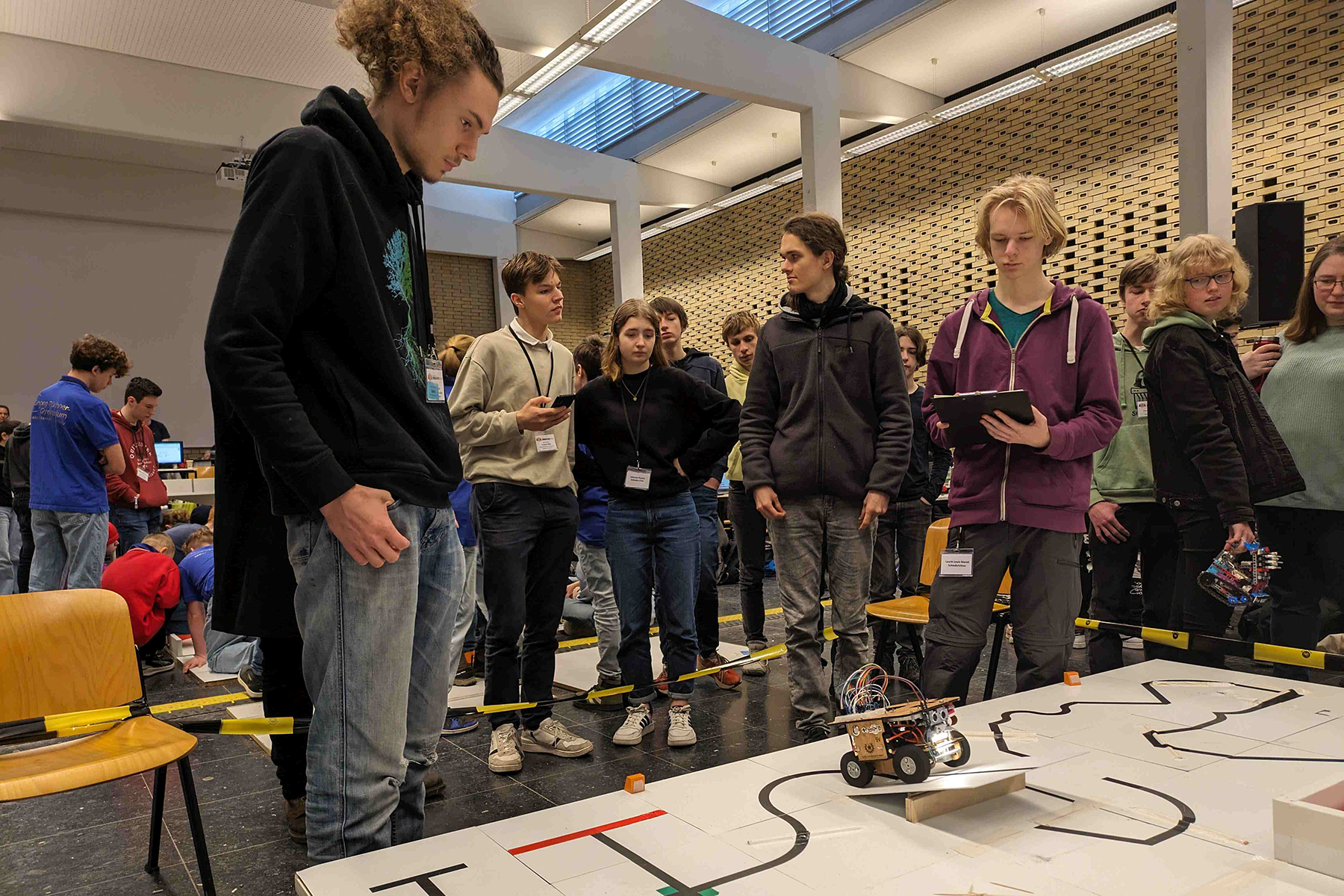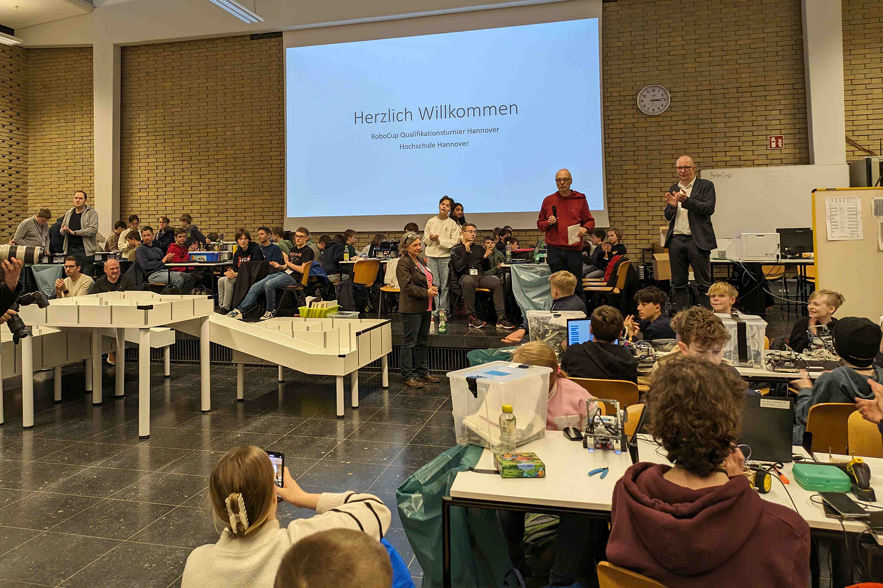 Insgesamt sind 28 Schüler des Gymnasiums Burgdorf aus den Jahrgängen 6 bis 13 zum diesjährigen RoboCupJunior-Qualifikationsturnier in die Aula des Campus der Hochschule Hannover angereist und haben vom 19. bis 21.02. über drei Tage hinweg zusammen mit rund 350 Schülerinnen und Schülern aus ganz Niedersachsen um die begehrten Pokale und die Plätze für die Deutschen Meisterschaften gekämpft.