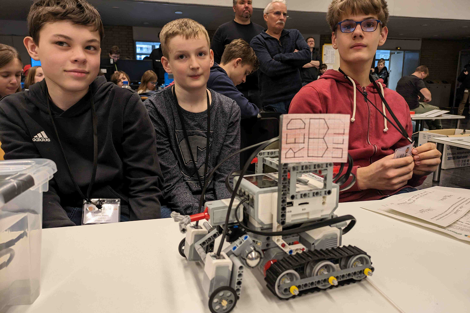 Am letzten Wettkampftag schob sich unser Team "Zentralkomitee für Robotik" auf den fünften Platz vor und belohnte die vier Teammitglieder aus den Jahrgängen 11, 12 und 13 für die Anstrengungen und Mühen in den letzten Wochen. Denn die Konstruktion, Fertigung und die Kosten für den Roboter haben die Schüler aus Jahrgang 13 weitgehend in Eigenregie geleistet. Erst eine Woche vor Beginn des Wettbewerbs wurde der Roboter während des Tages der offenen Tür am Gymnasium Burgdorf zum Laufen gebracht und in den letzten Tagen vor dem Wettbewerb konsequent weiterentwickelt. Die erzielte Platzierung ist für die Gruppe ein weiterer Ansporn, die Programmierung mithilfe der Bilderkennung noch weiter voranzubringen und sich in Kassel ebenfalls zu bewähren. Hierbei gilt es zu beachten, dass sich zwei Schüler gleichzeitig auf die Abiturprüfungen vorbereiten, aber dies tut der Motivation keinen Abbruch.
