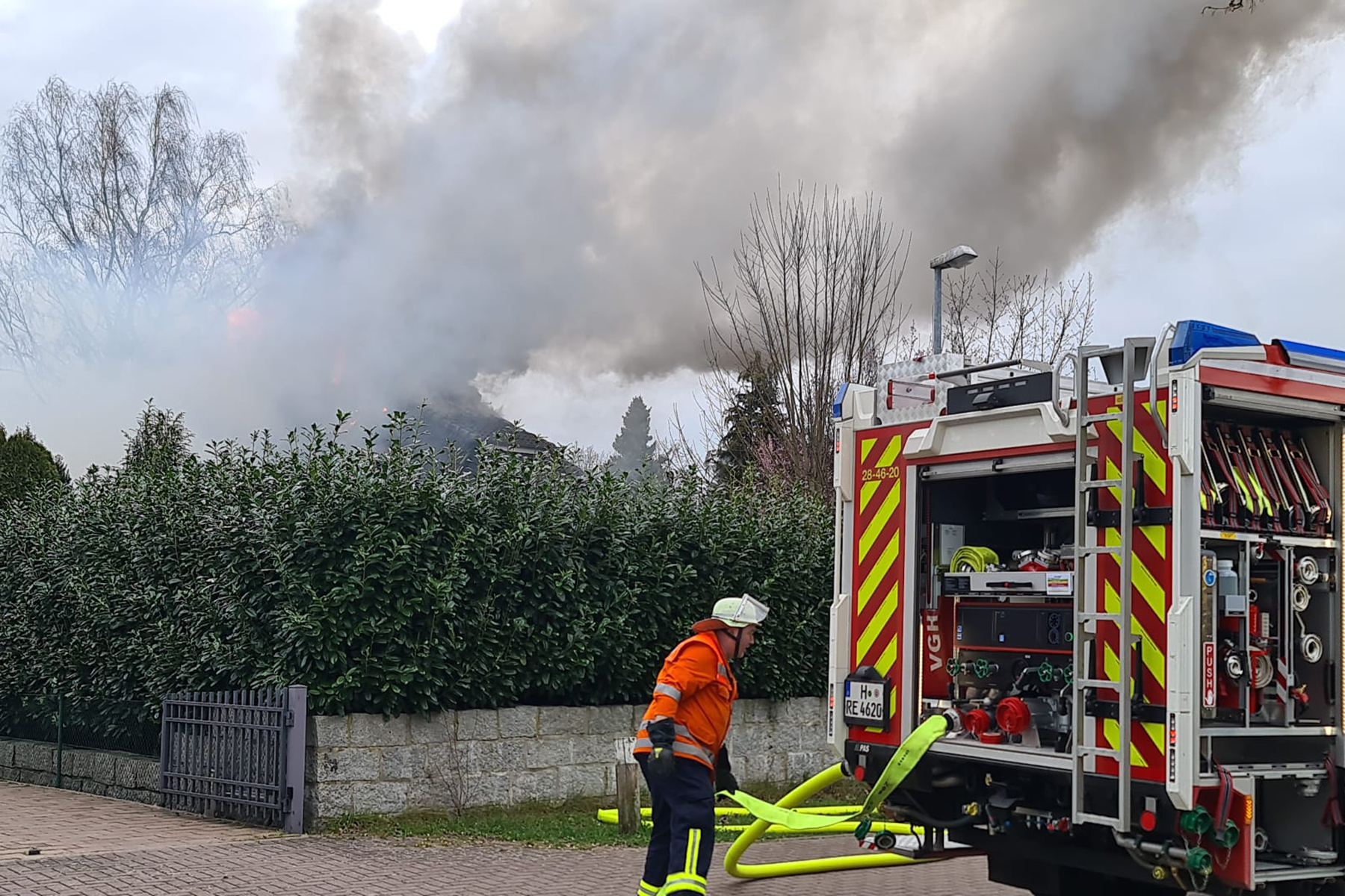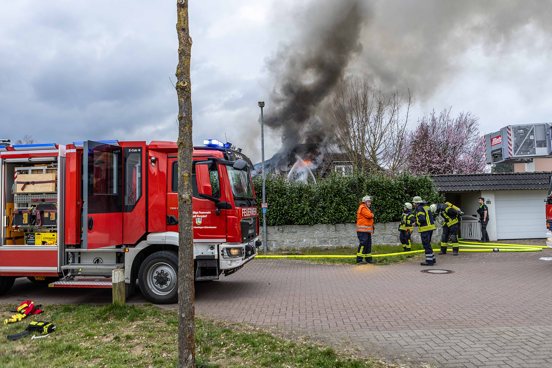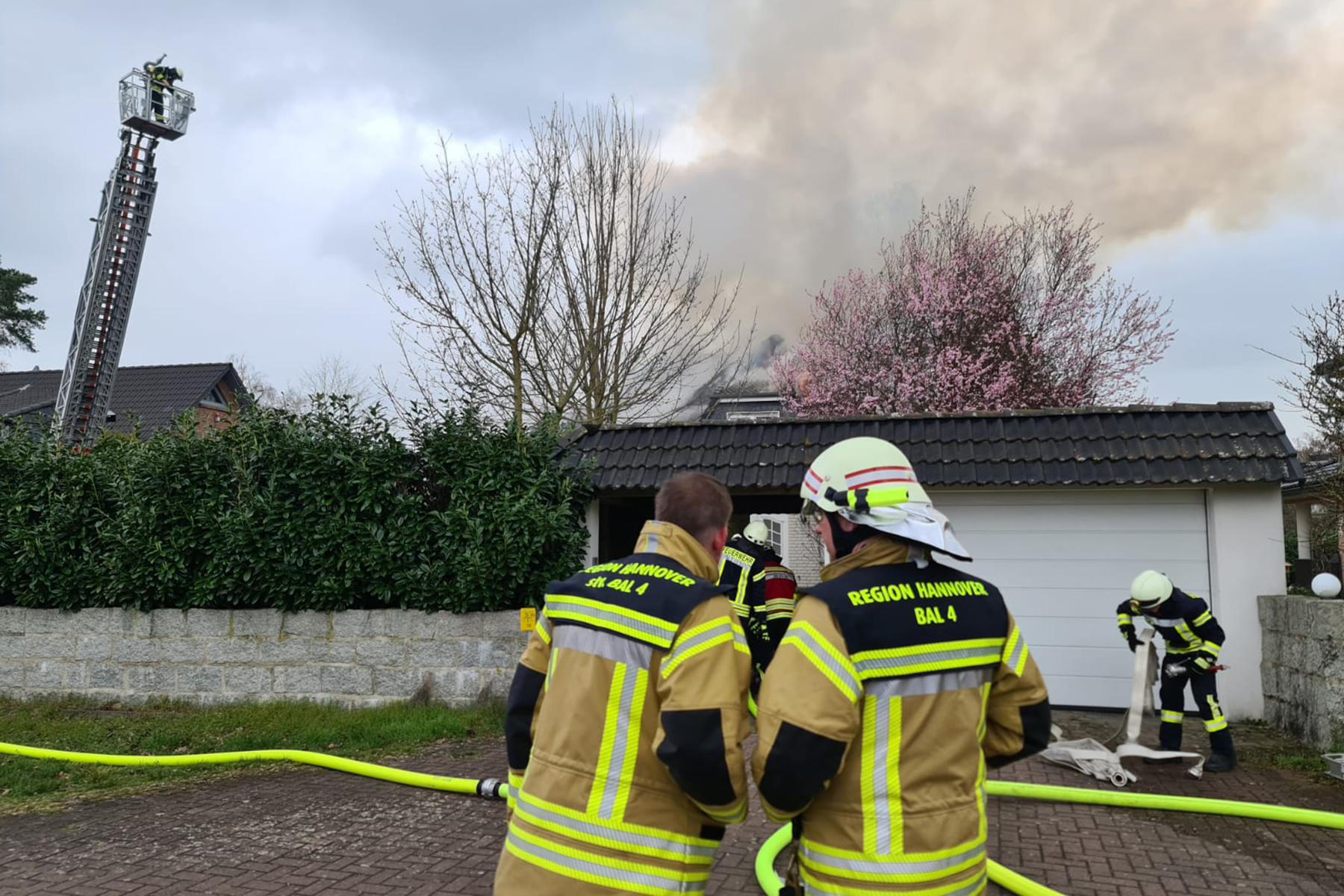 Ersten Informationen zufolge steht im Rotkehlchenweg der Dachstuhl eines Einfamilienhauses im Vollbrand. Die Feuerwehrkräfte haben die Löschmaßnahmen eingeleitet. Auch die Drehleiter der Ortsfeuerwehr Burgdorf ist im Einsatz. Personen sind ersten Angaben zufolge nicht verletzt worden.