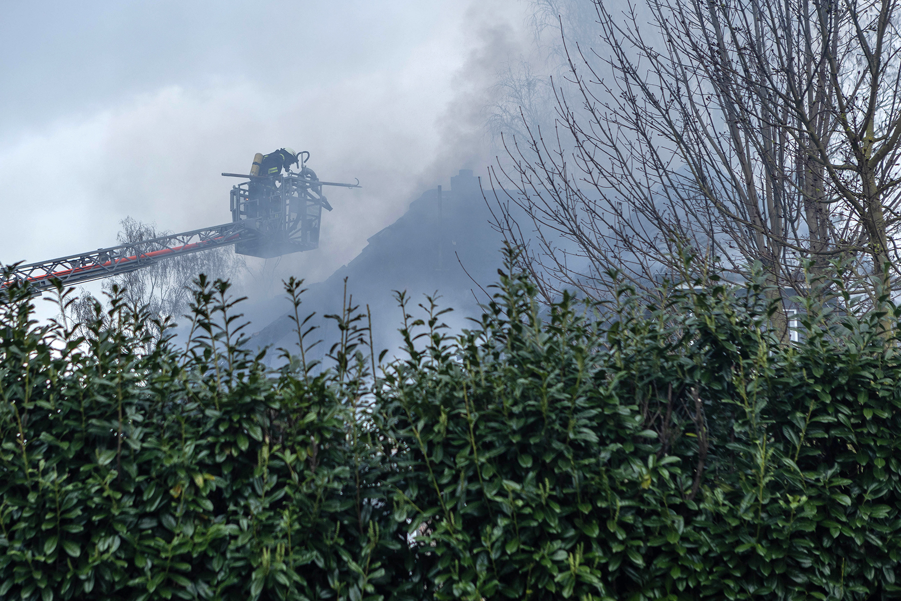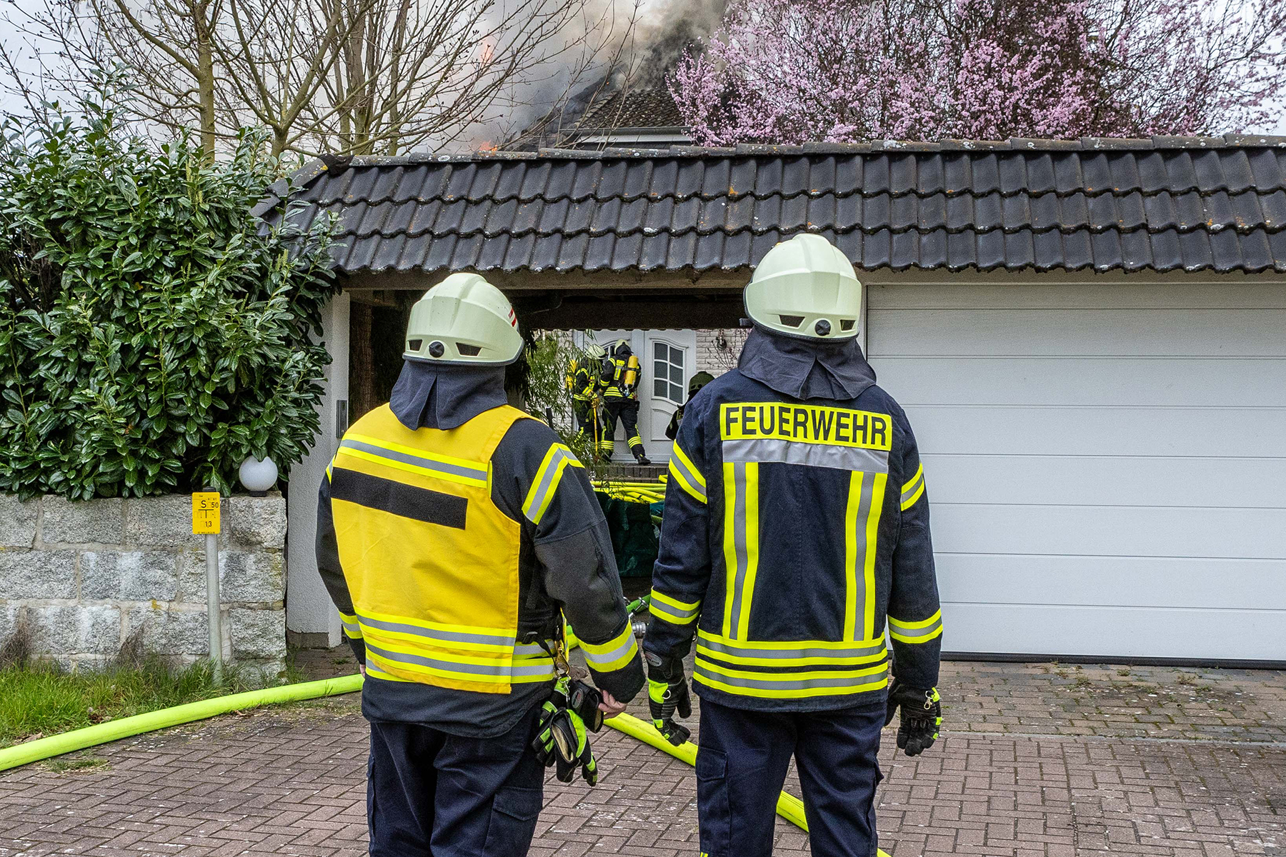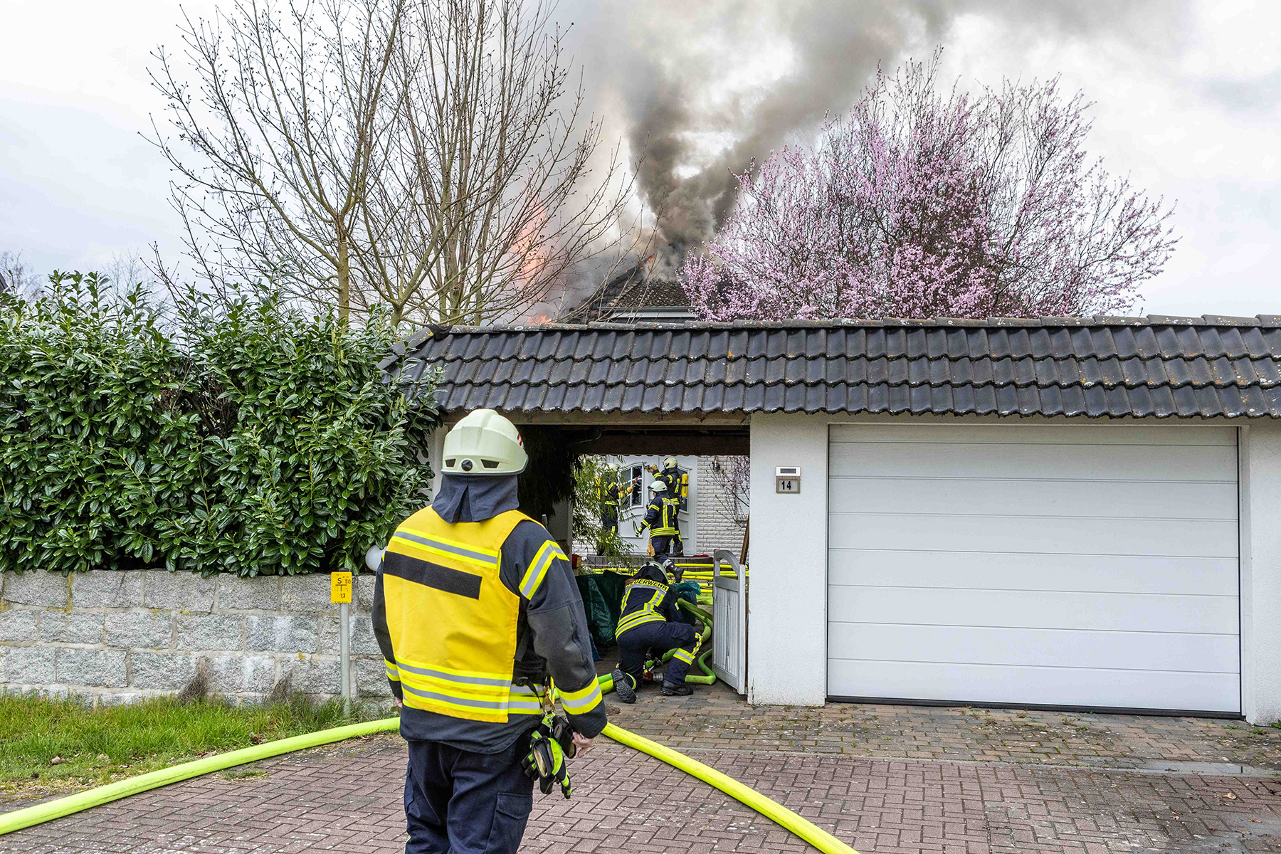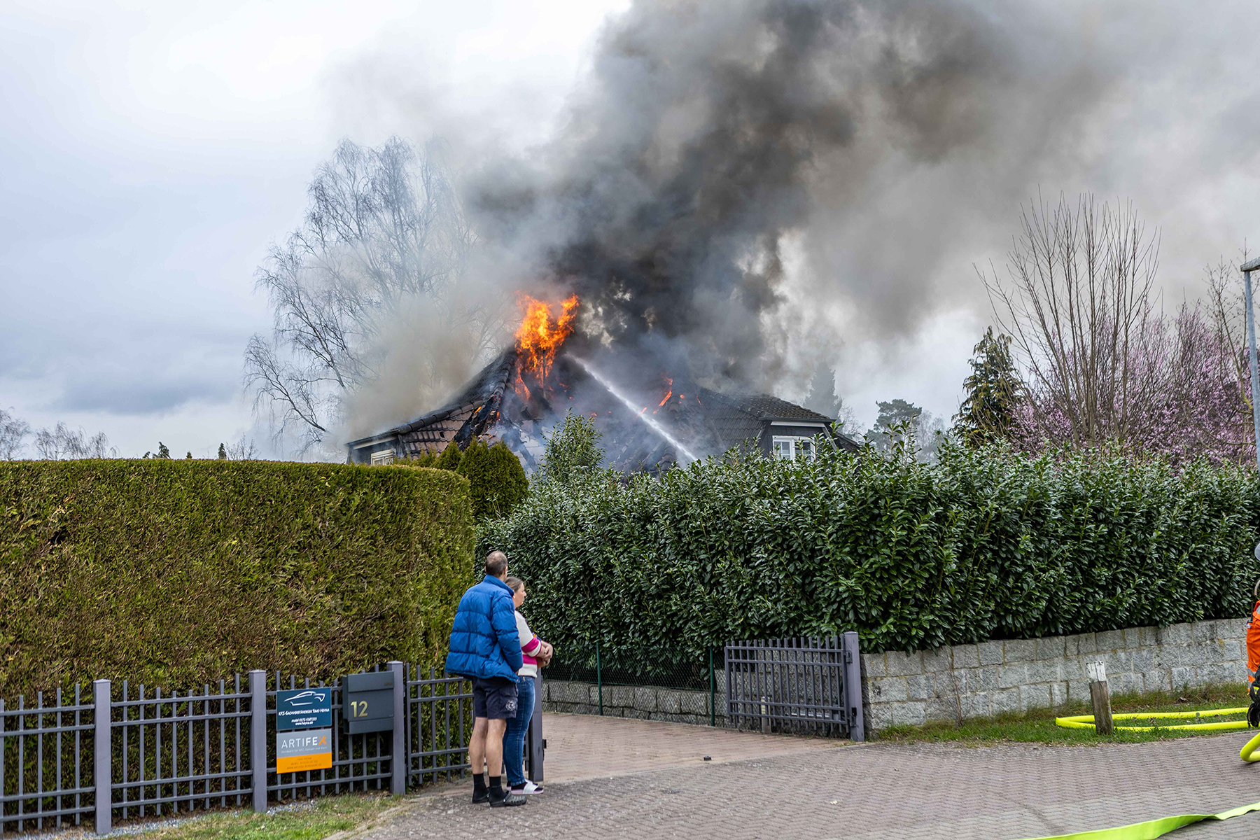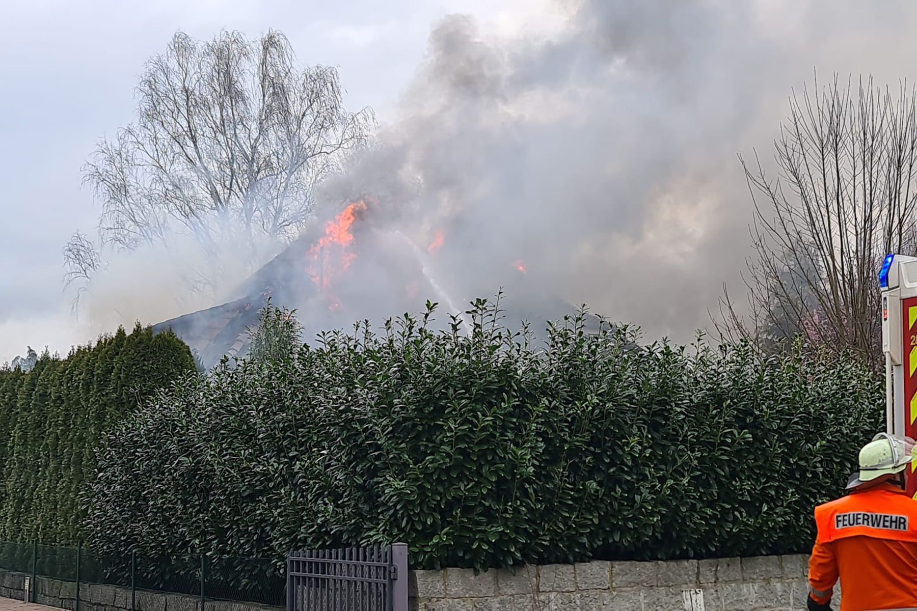 Beim Eintreffen der Feuerwehren entwickelte sich der Brand weiter und der komplette Dachstuhl wurde in Mitleidenschaft gezogen.