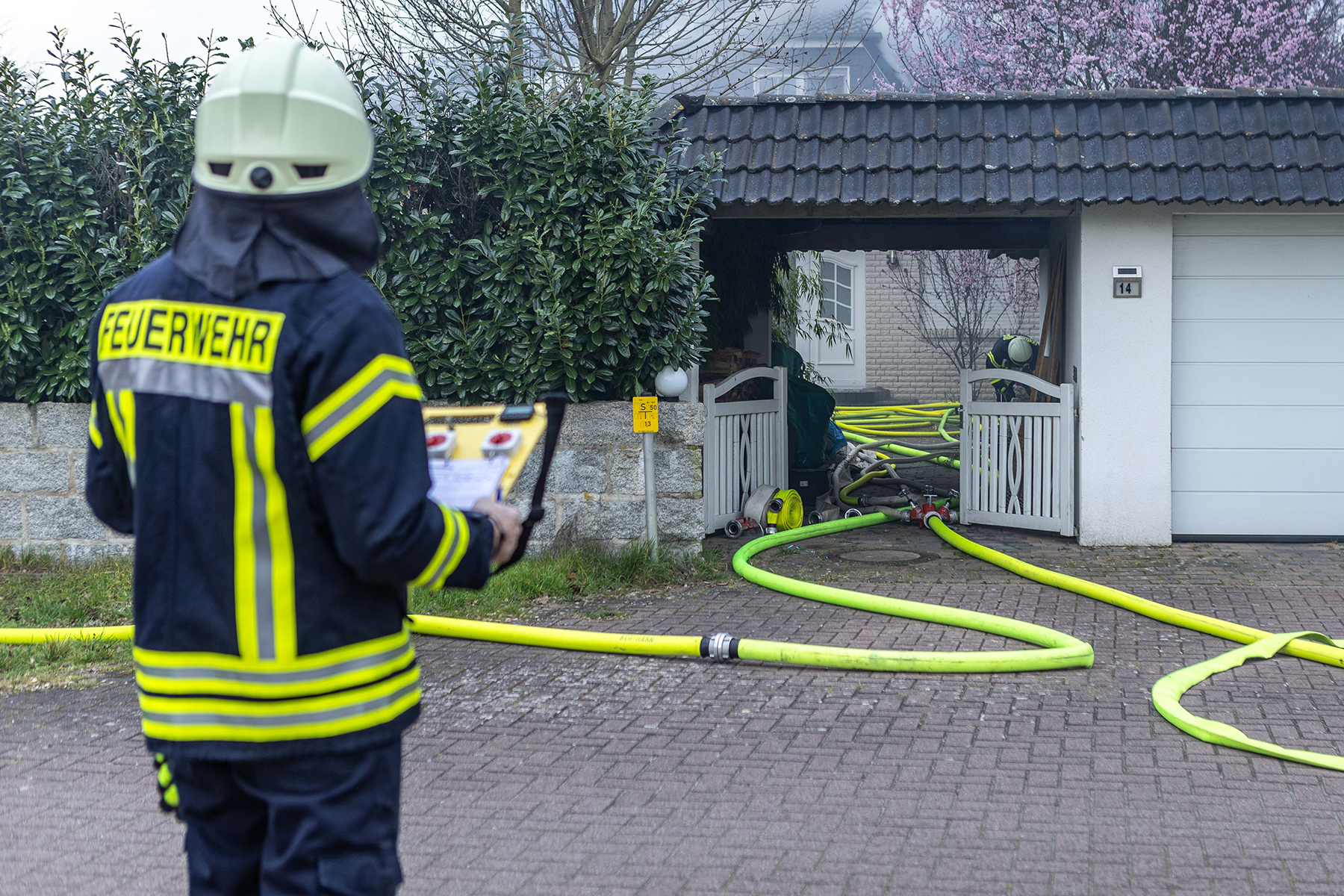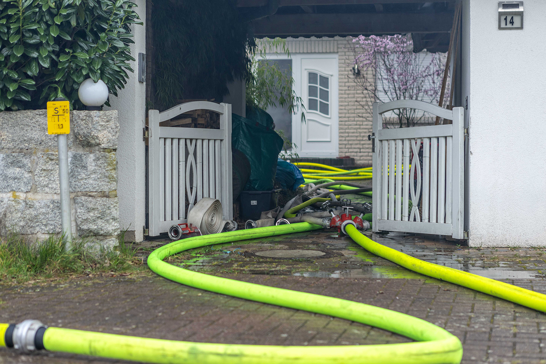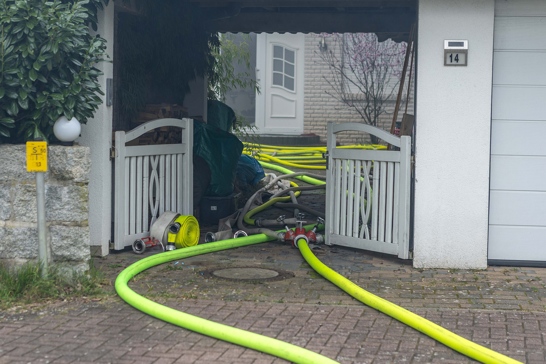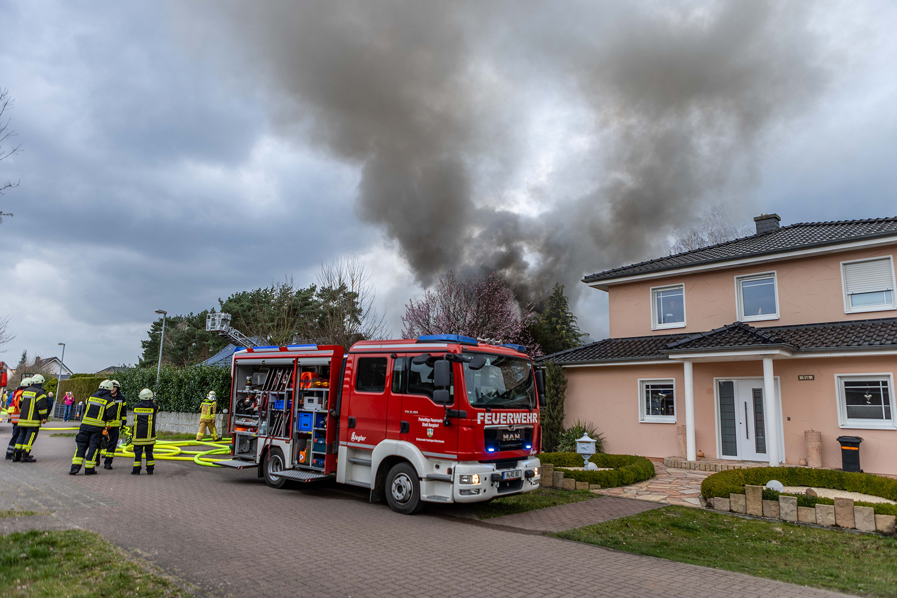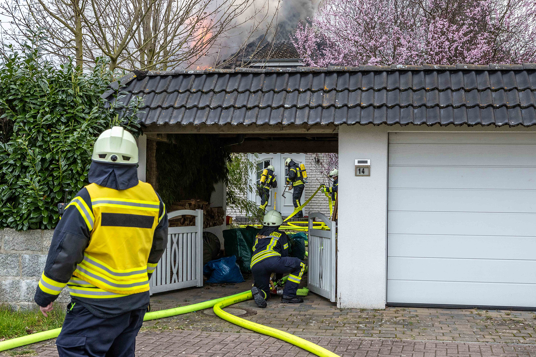 Durch das schnelle Eingreifen der Rettungskräfte, Einsatz der Drehleiter sowie mehrere Rohre wurden vorgenommen, konnte ein Übergreifen auf den am Haus stehenden Anbau sowie die am Hause stehenden Bäume verhindert werden.