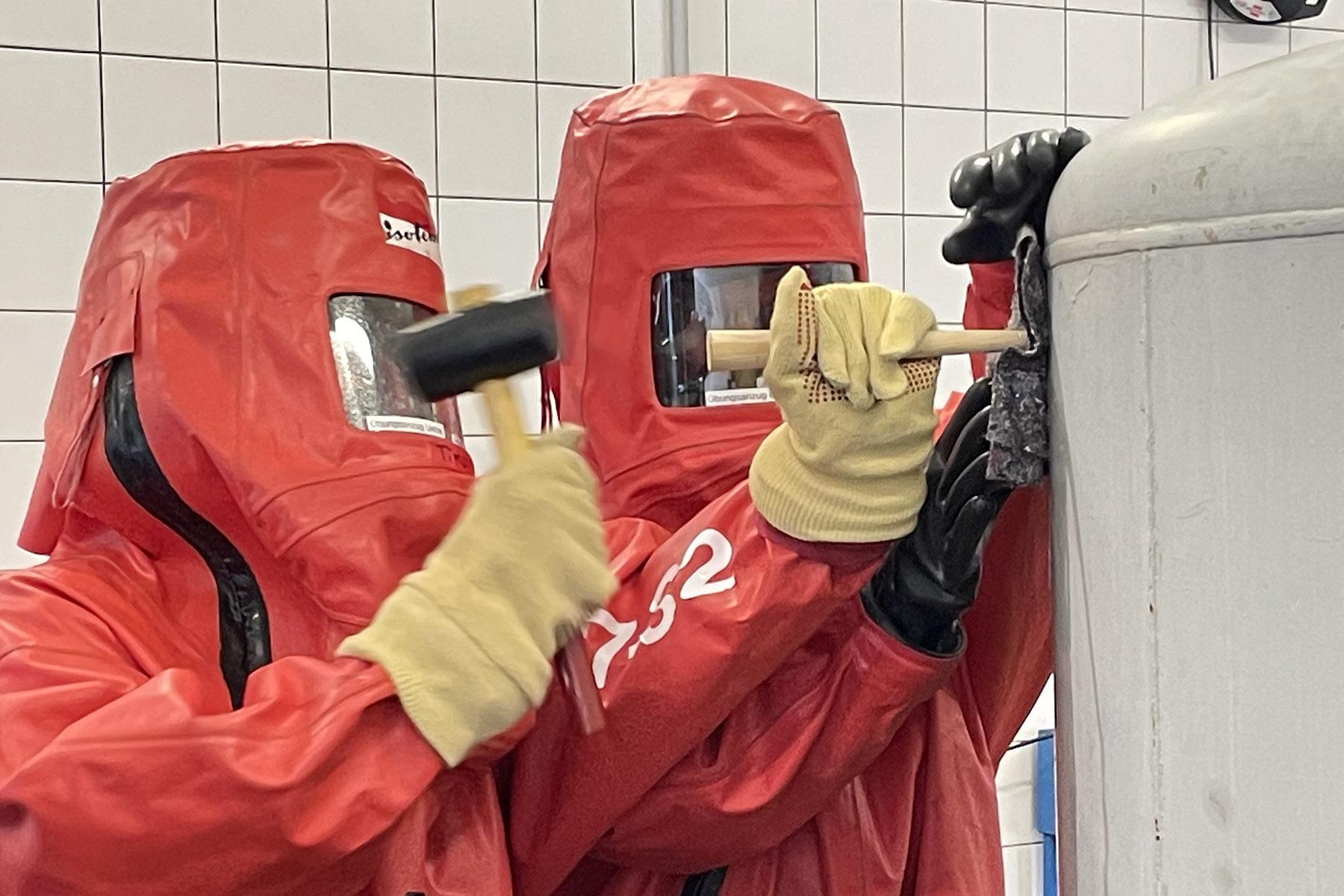 Während des Seminars, welches von insgesamt 12 Ausbildern durchgeführt wurde, erlernten die Teilnehmenden nicht nur das Tragen des Chemikalienschutzanzuges, sondern vor allem auch das richtige An- und Ablegen des Anzuges. Bei einem Gefahrgutunfall gehört der Chemikalienschutzanzug zur persönlichen Ausrüstung und schützt den Träger nicht nur vor chemischen, sondern auch vor biologischen, radiologischen und nuklearen Gefahren. Da der Anzug gasdicht abgeschlossen ist, stellt das Tragen an die Träger eine besondere Herausforderung dar. Daher müssen alle Träger nicht nur ihre Feuerwehrausbildung abgeschlossen, sondern auch einen zusätzlichen Lehrgang als Atemschutzgeräteträger absolviert haben. Zusätzlich zu dem Umgang mit dem Chemikalienschutzanzug lernten die Teilnehmer während des Seminars auch die weitere Ausrüstung und das Arbeiten mit den Gerätschaften des Gefahrgutzuges kennen.