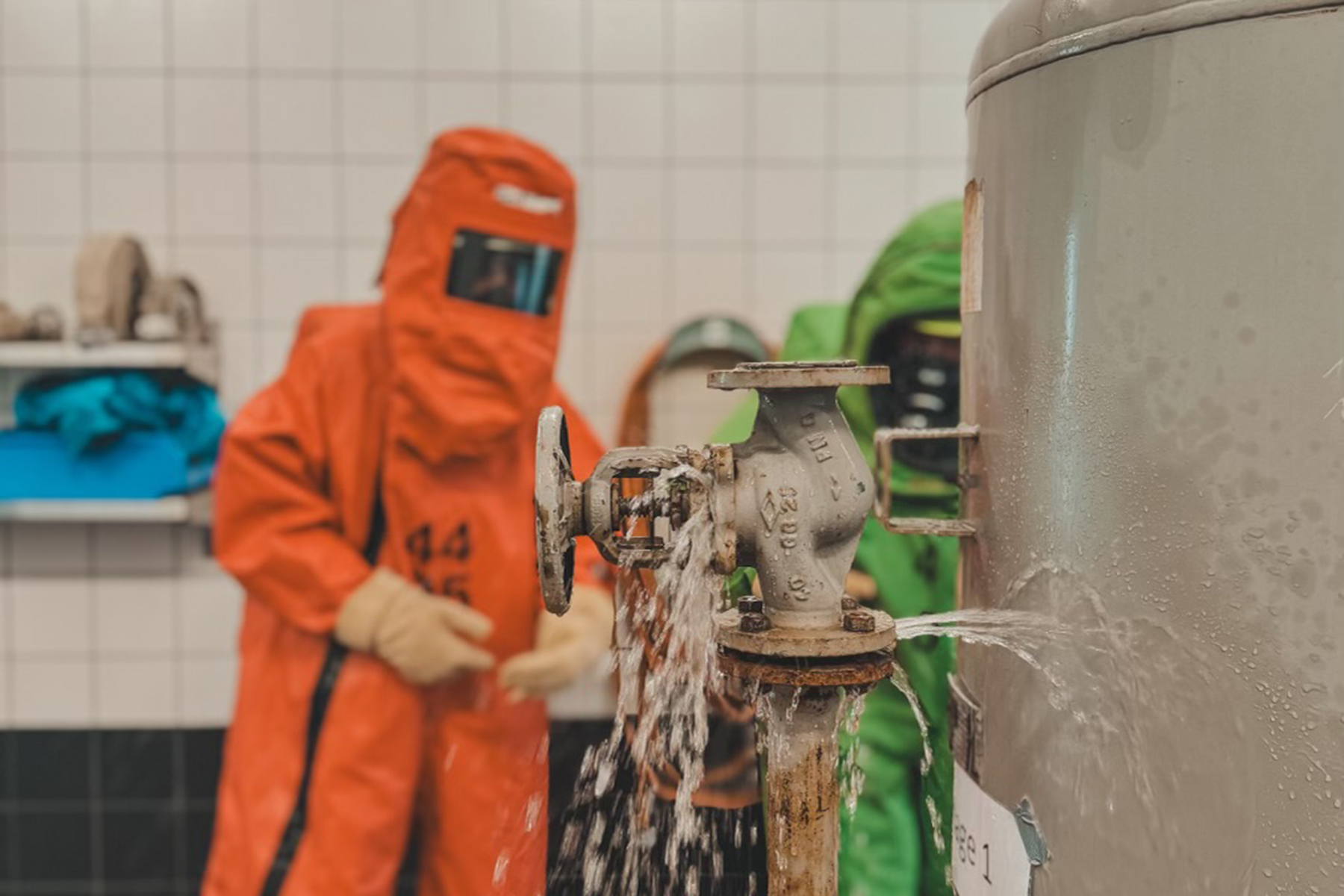 Bei der praktischen Abschlussübung konnten die Teilnehmer an einem undichten Behälter ihre Fähigkeiten beweisen. Neben der korrekten Erkundung und der Rückmeldung über Funk an den Zugführer des ABC-Zuges mussten anschließend die Undichtigkeiten mit Hilfe diverser Materialien, wie zum Beispiel Dichtmatten, Spannguten und Dichtstopfen beseitigt werden. Wie bei echten Einsätzen wurden die CSA-Träger nach dem Abschluss an die Arbeiten einer Dekontamination unterzogen, wobei sich die Feuerwehrleute mit samt dem Anzug in eine bis zu 50 Grad heiße Spezial-Dusche begeben haben. Dort wurde der Anzug von einem Dekontaminationstrupp so weit gereinigt, dass der Träger diesen anschließend gefahrlos verlassen konnte.