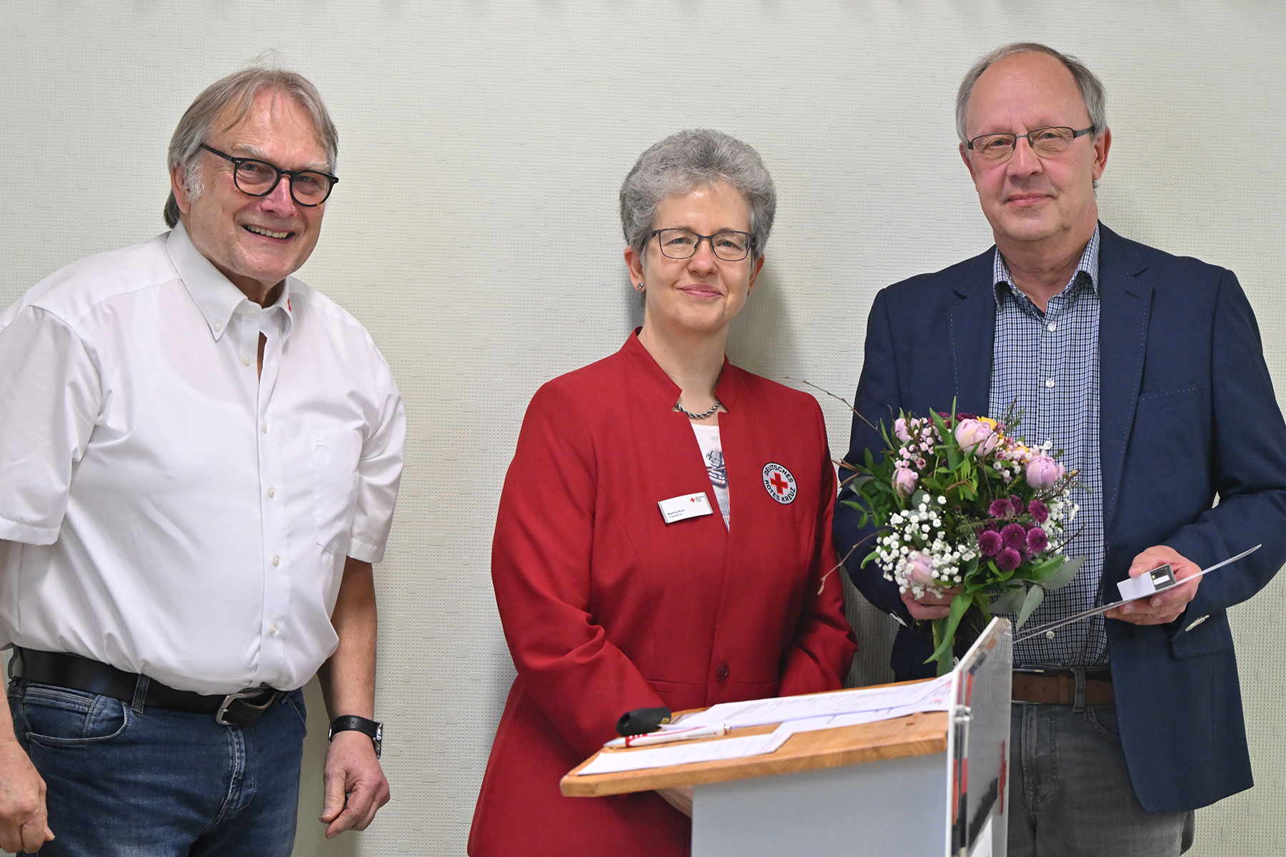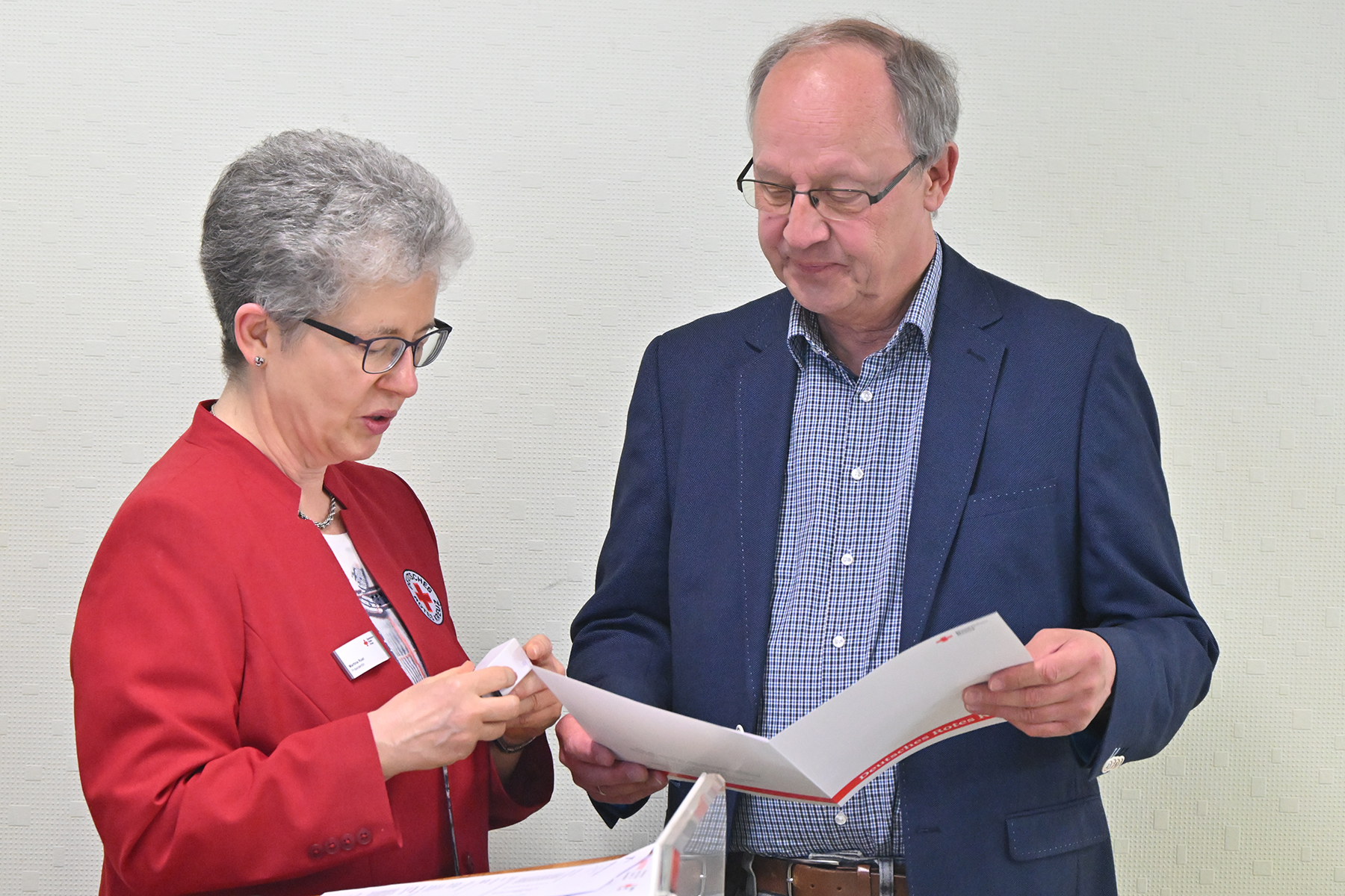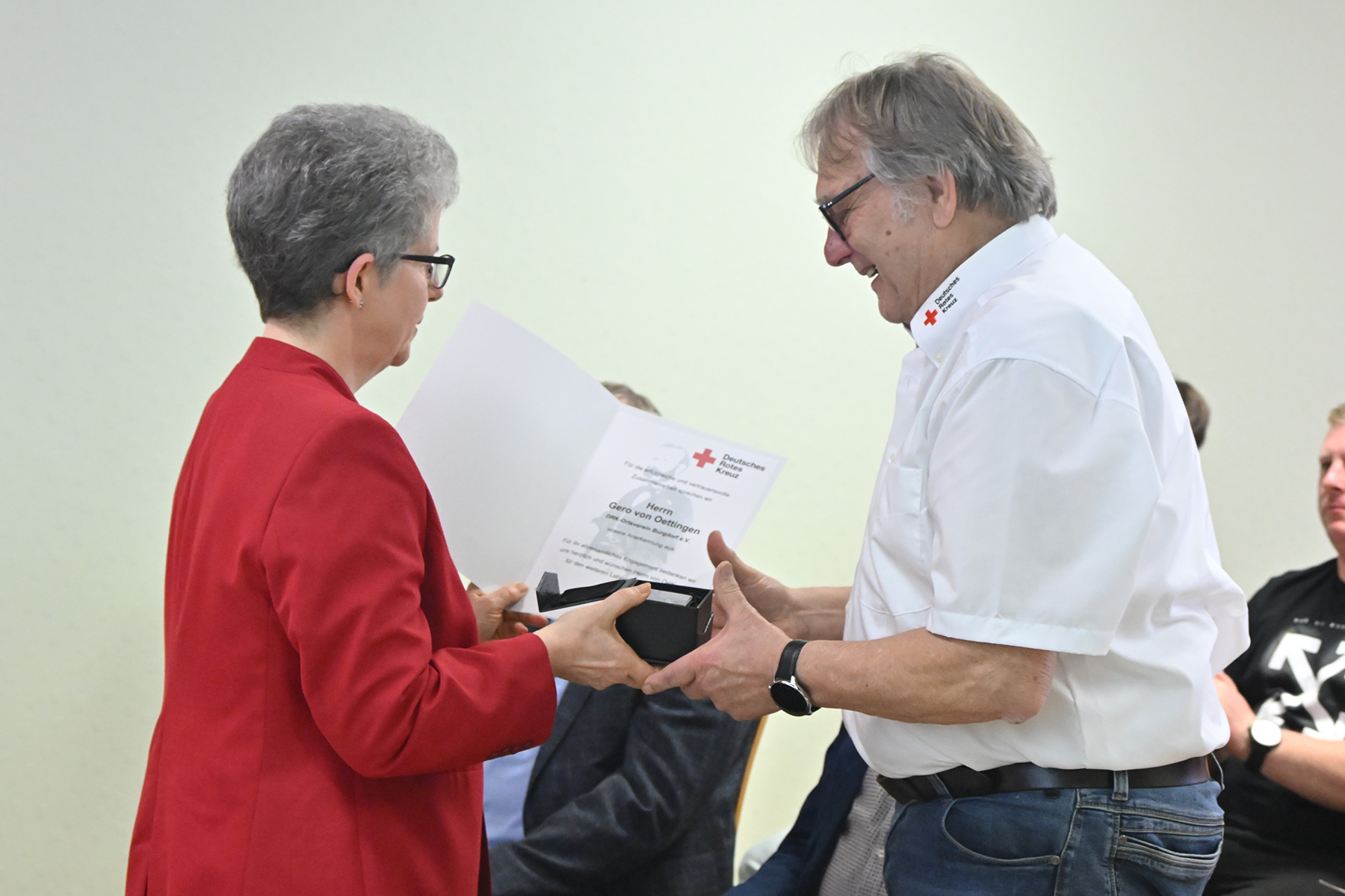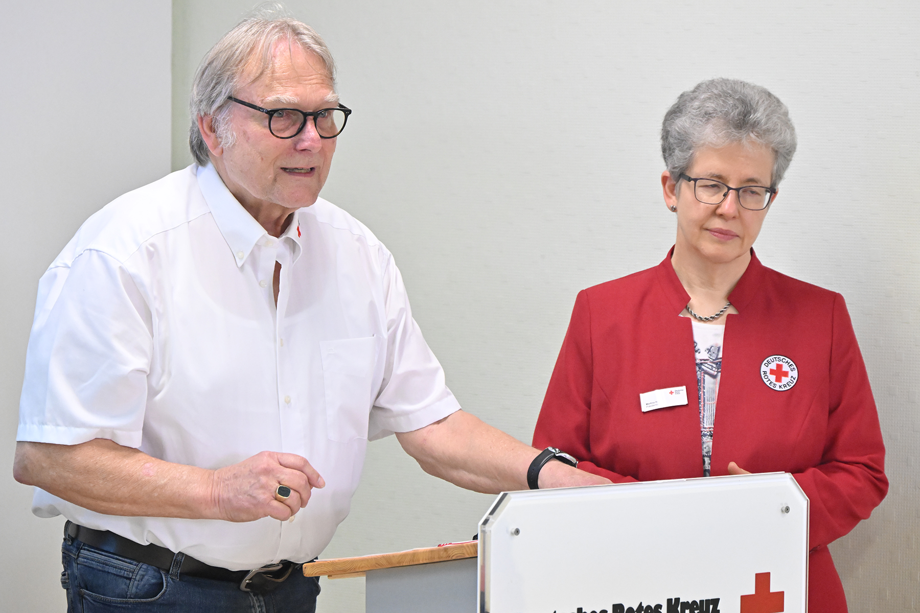Der scheidende Ortsvereinsvorsitzende Gero von Oettingen nutzt die Gelegenheit, einen Rückblick auf seine neunjährige Arbeit als 1. Vorsitzender vorzunehmen. Ob die Zusammenarbeit mit vielen anderen Organisationen wie der Tageswohnung oder dem Kinderschutzbund, einen Erste-Hilfe-Gutschein im SMB-Begrüßungsgutscheinheft: "Es war eine Zeit, die ich nicht missen möchte", so Gero von Oettingen. Er habe damals 2015 keine reibungslose Übergabe gehabt, umso besser sollte es bei diesem Wechsel laufen. Auch die Regions-DRK-Präsidentin Martina Rust freute sich über den reibungslosen Übergang.