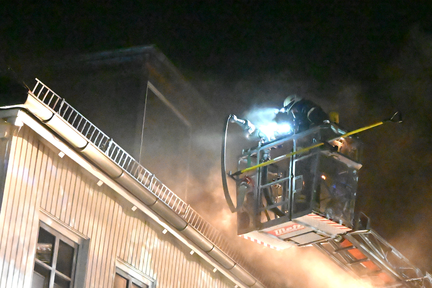 Da sich viel Rauch unter dem Dach angesammelt hatte und auch aus dem Schornstein Rauch aufstieg, konzentrierten sich die ersten Maßnahmen auf den Dachstuhl. Mit einer Steckleiter ging ein Trupp auf das Dach vor, auch über die Drehleiter wurde Stellung zum 2. Obergeschoss bezogen. Doch ein Feuer fanden die Brandbekämpfer dort nicht vor. Auch die Kontrolle des 1. Obergeschosses verlief erfolglos. Derweil blieb es bei einer immer stärker zunehmenden Rauchentwicklung, die nun auch aus dem Mauerwerk und Lüftungsschlitzen drang.