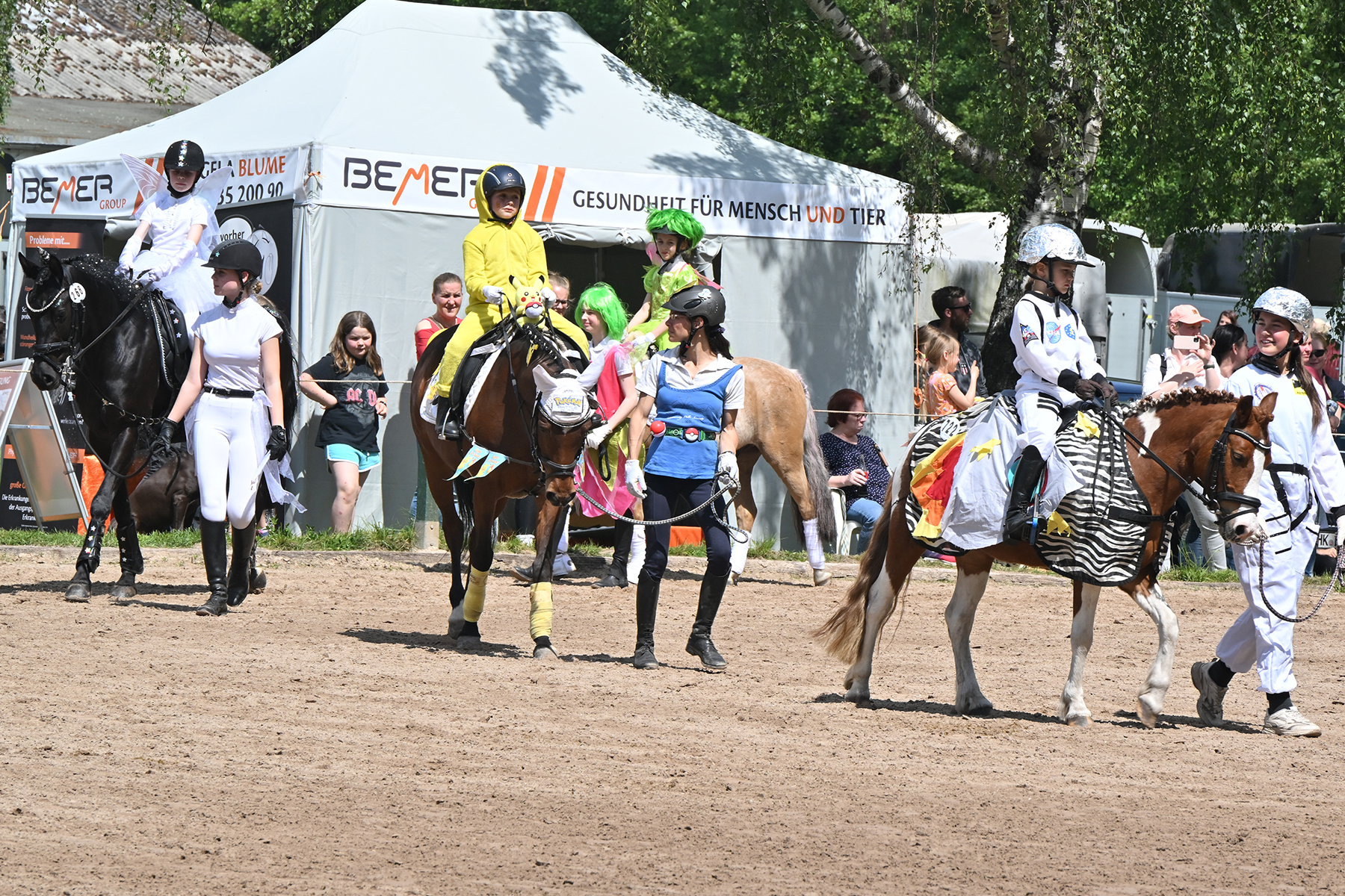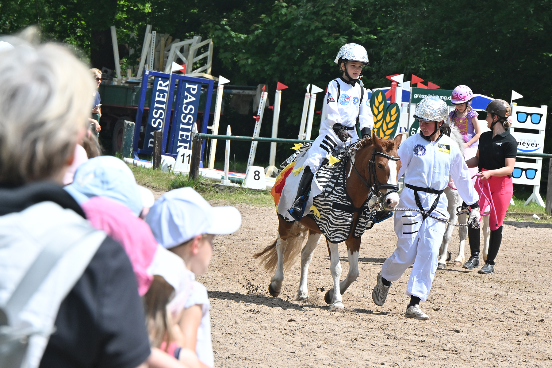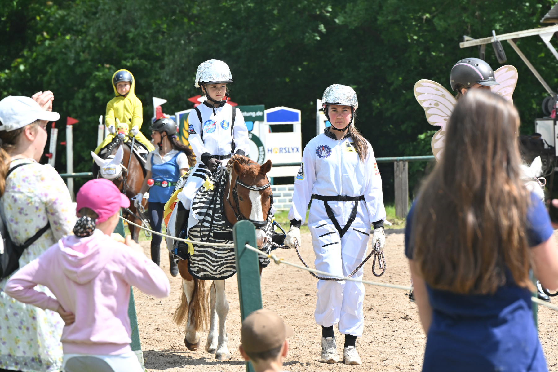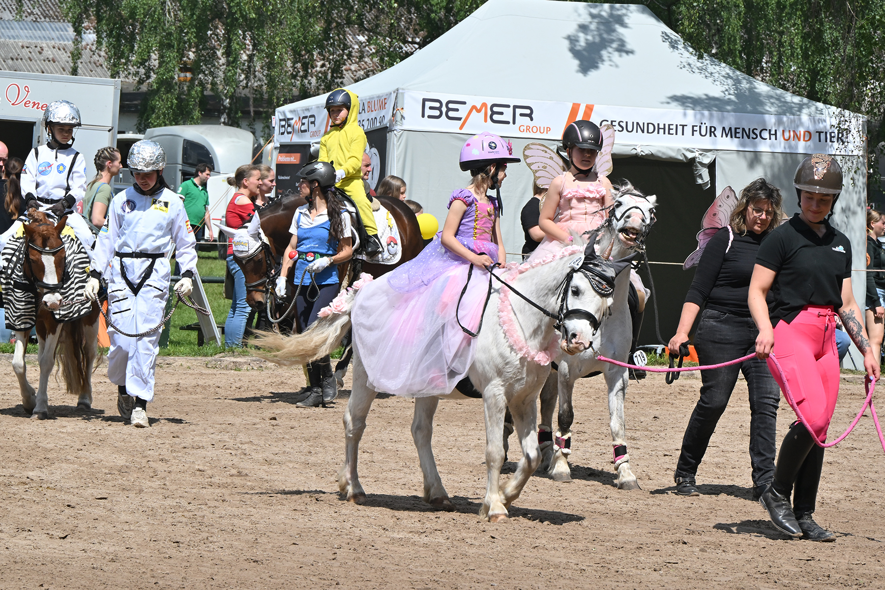 Am heutigen Donnerstag, 9. Mai 2024, standen die jüngsten Reiter im Mittelpunkt. Besonders beim Führzügel-Wettbewerb, der in diesem Fall sogar mit Kostüm stattfand, wurden nicht nur die Reiterleistungen, sondern auch die Kostüme von Reiter und Führungsperson bewertet.