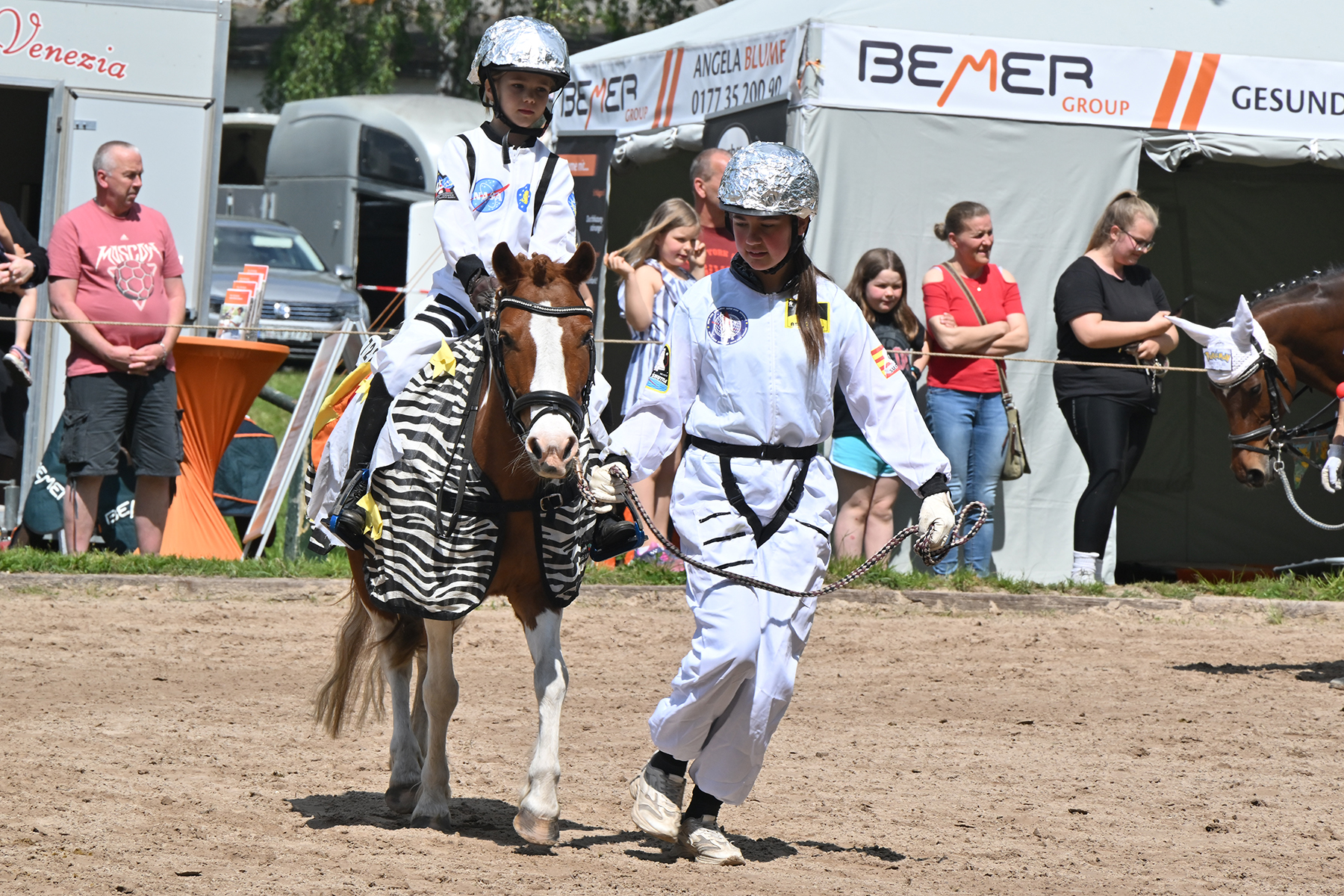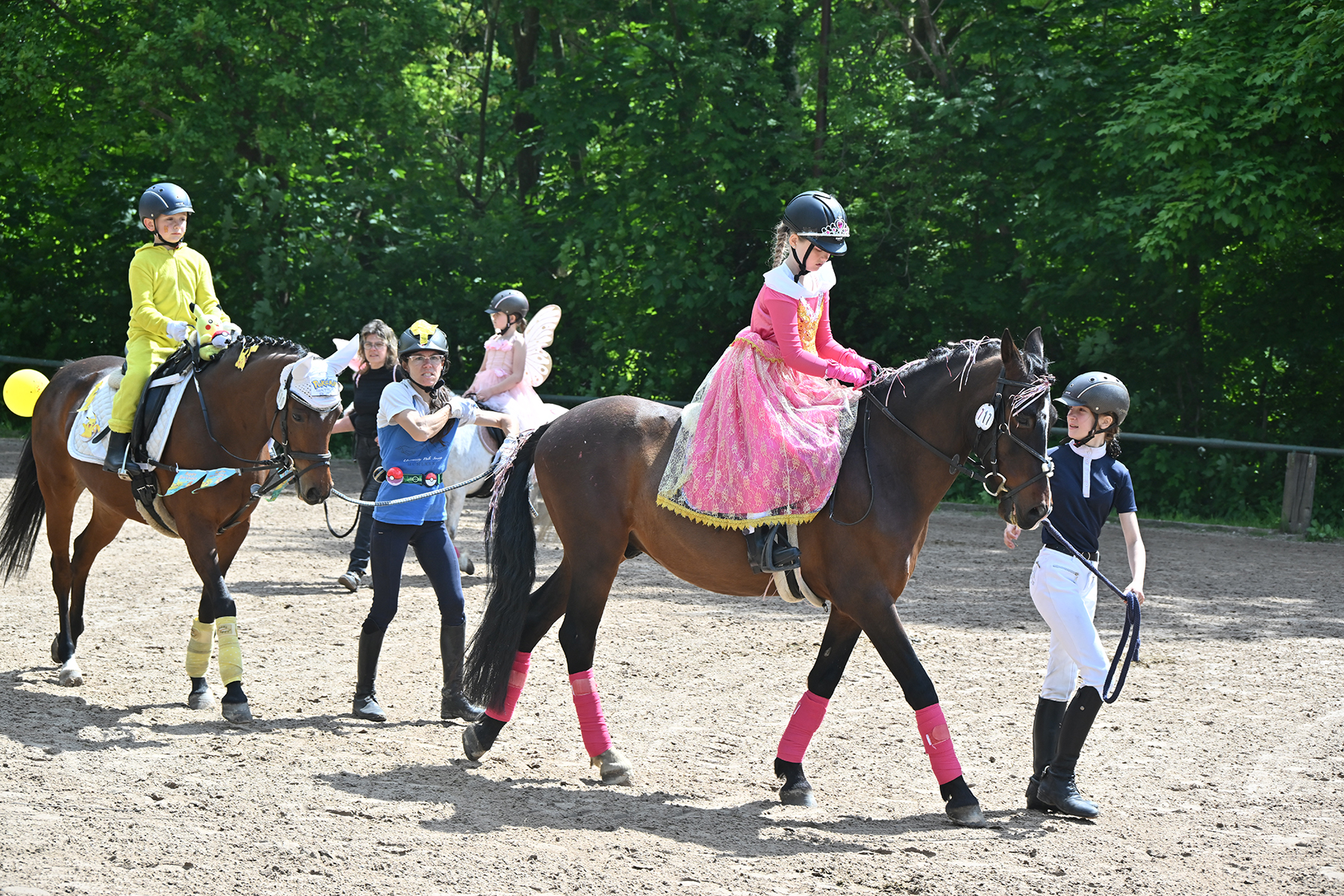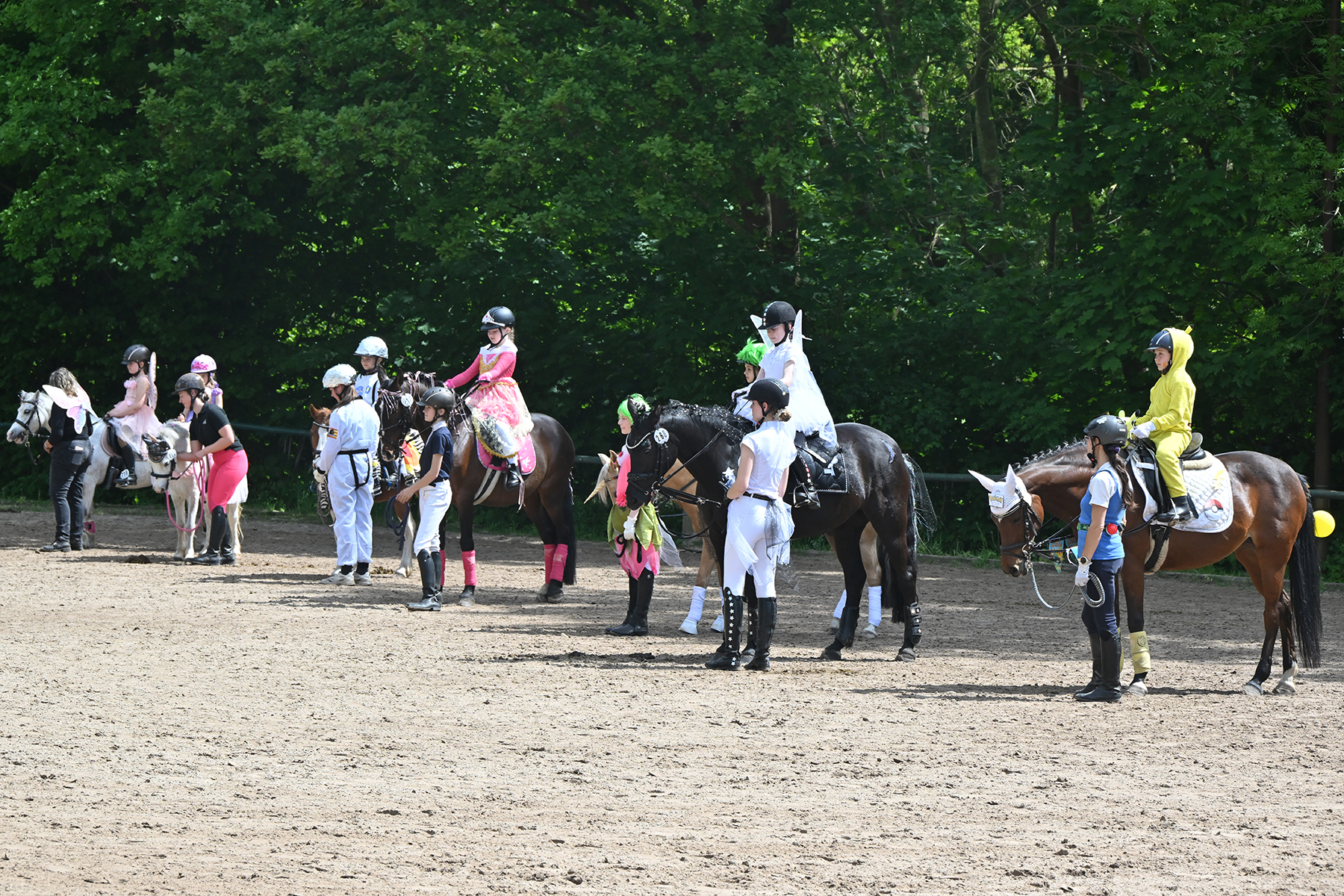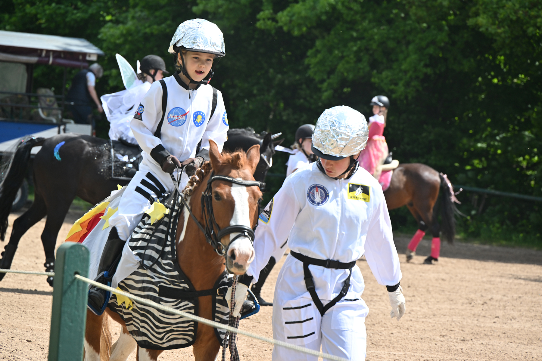 Am heutigen Donnerstag, 9. Mai 2024, standen die jüngsten Reiter im Mittelpunkt. Besonders beim Führzügel-Wettbewerb, der in diesem Fall sogar mit Kostüm stattfand, wurden nicht nur die Reiterleistungen, sondern auch die Kostüme von Reiter und Führungsperson bewertet.