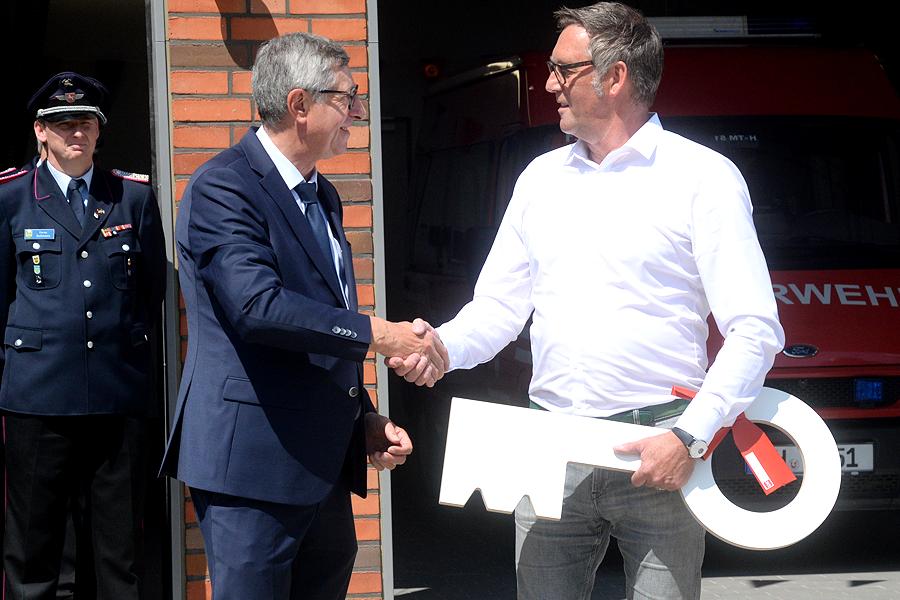 Das neue Feuerwehr-Gerätehaus der Freiwilligen Feuerwehr Schillerslage ist am heutigen Sonnabend, 25. Mai 2024, seiner Bestimmung übergeben worden. Ortsbrandmeister Timo Scheffler übernahm von Armin Pollehn, Bürgermeister der Stadt Burgdorf, im feierlichen Rahmen symbolisch den Schlüssel für das zukünftige Heim der Brandschützer in Schillerslage.