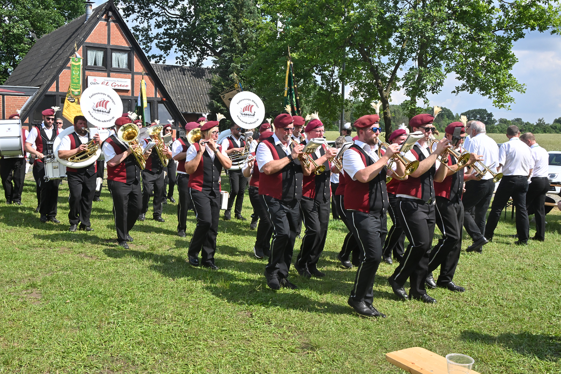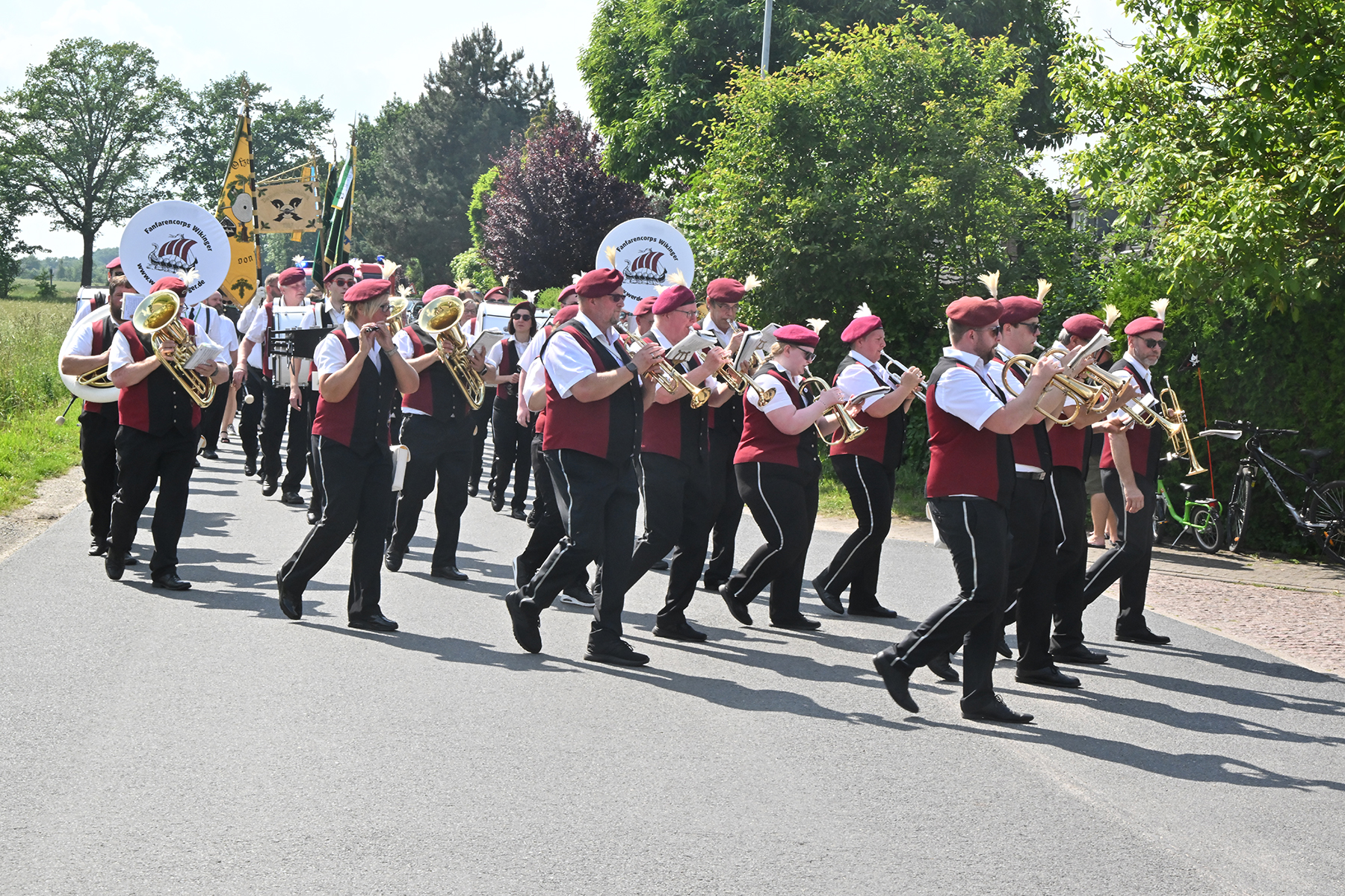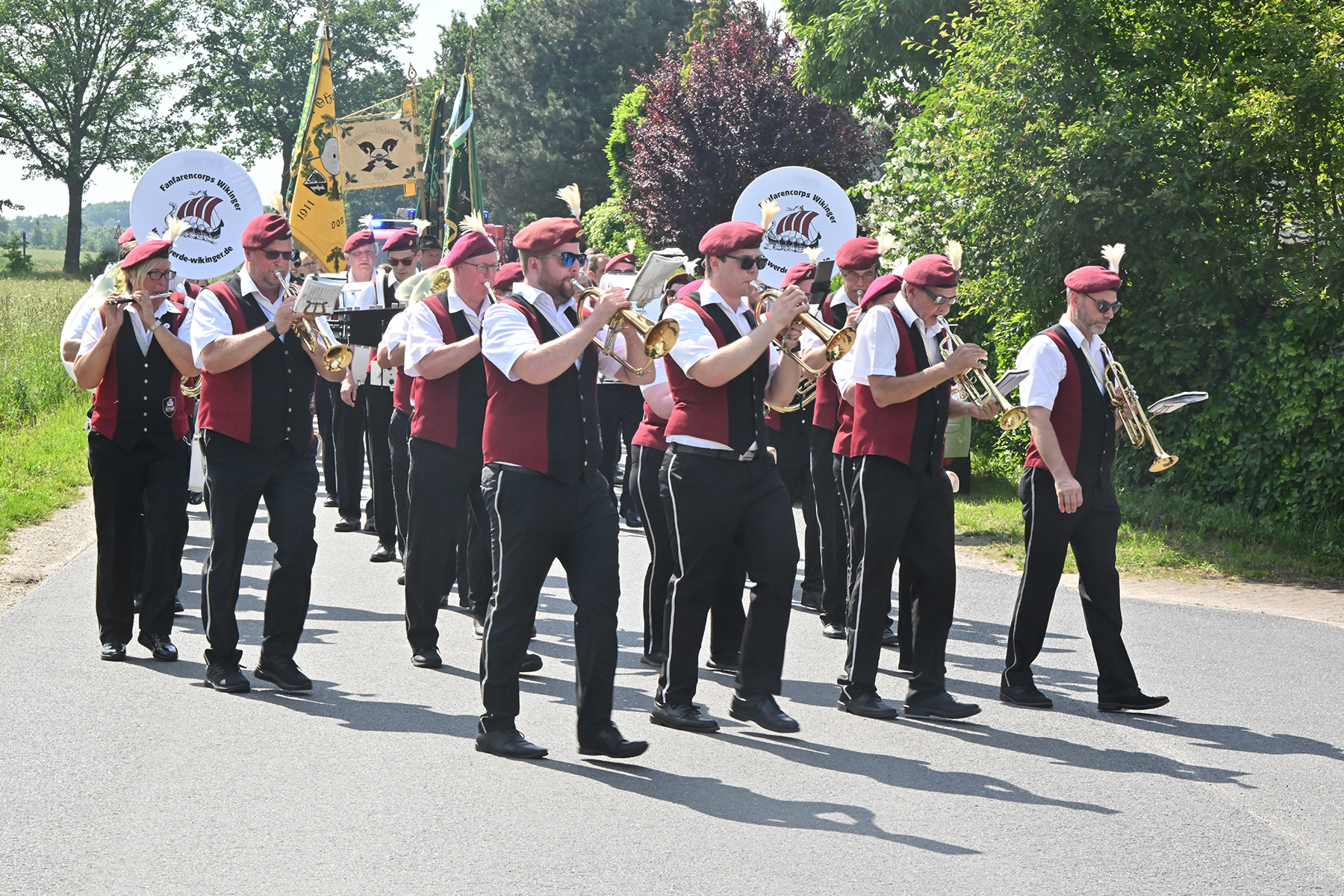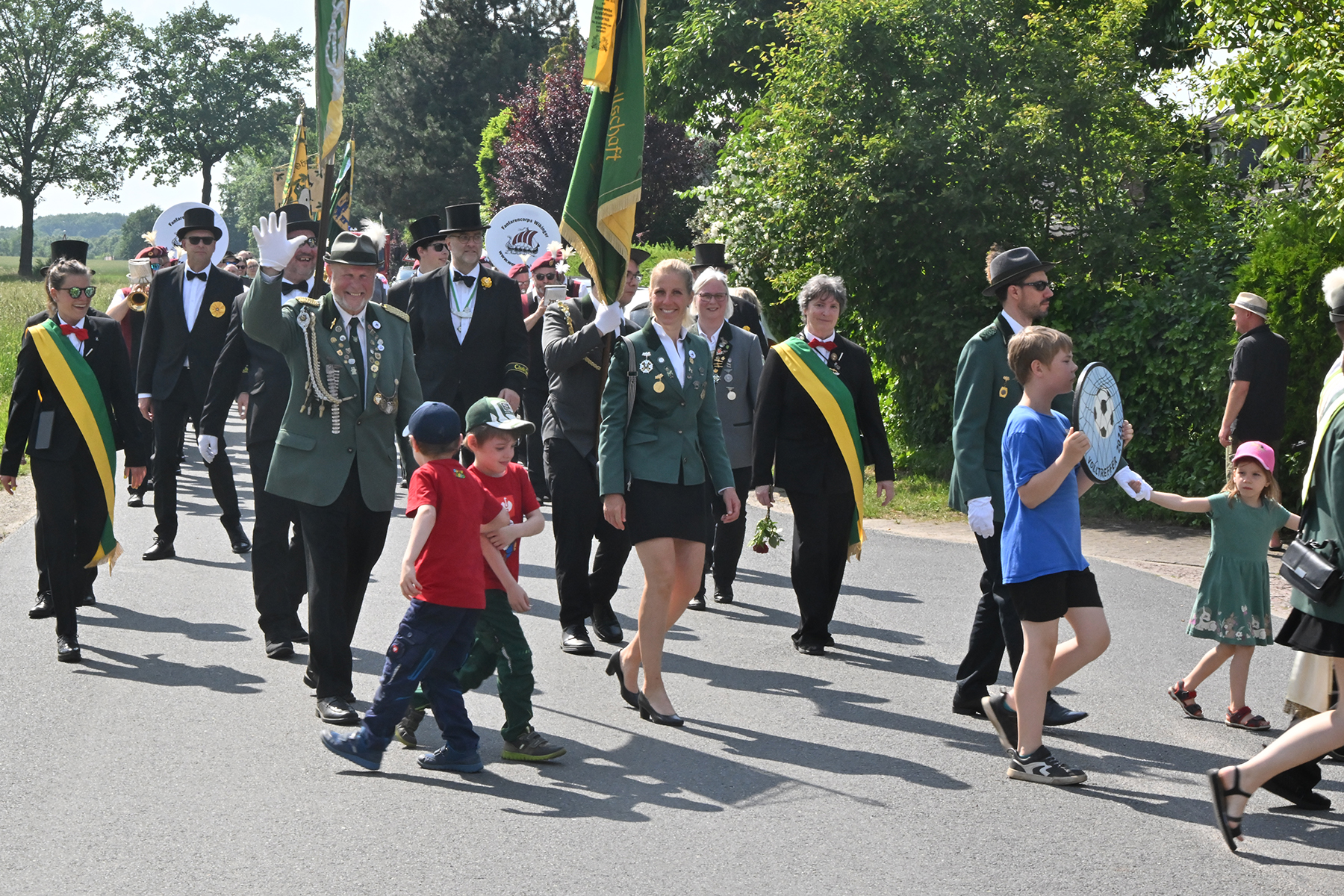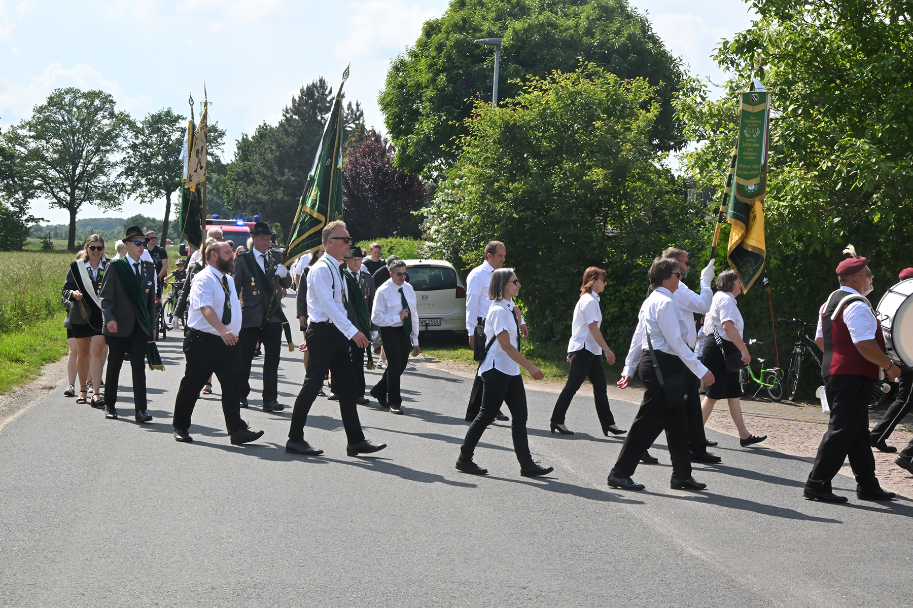 Zuvor hieß es aber, die Königsscheibe zu überbringen: Unter der musikalischen Begleitung des Fanfarencorps "Wikinger" Burgdorf und Absicherung durch die Ortsfeuerwehr Dachtmissen marschierten die Sorgenser Schützen, begleitet von Abordnungen der Schützenvereine aus Burgdorf, Hülptingsen, Otze und Schillerslage, zur neuen Königin wie auch zur Dorfkönigin, ehe es wieder zum Schützenplatz neben der Schützenkate ging.