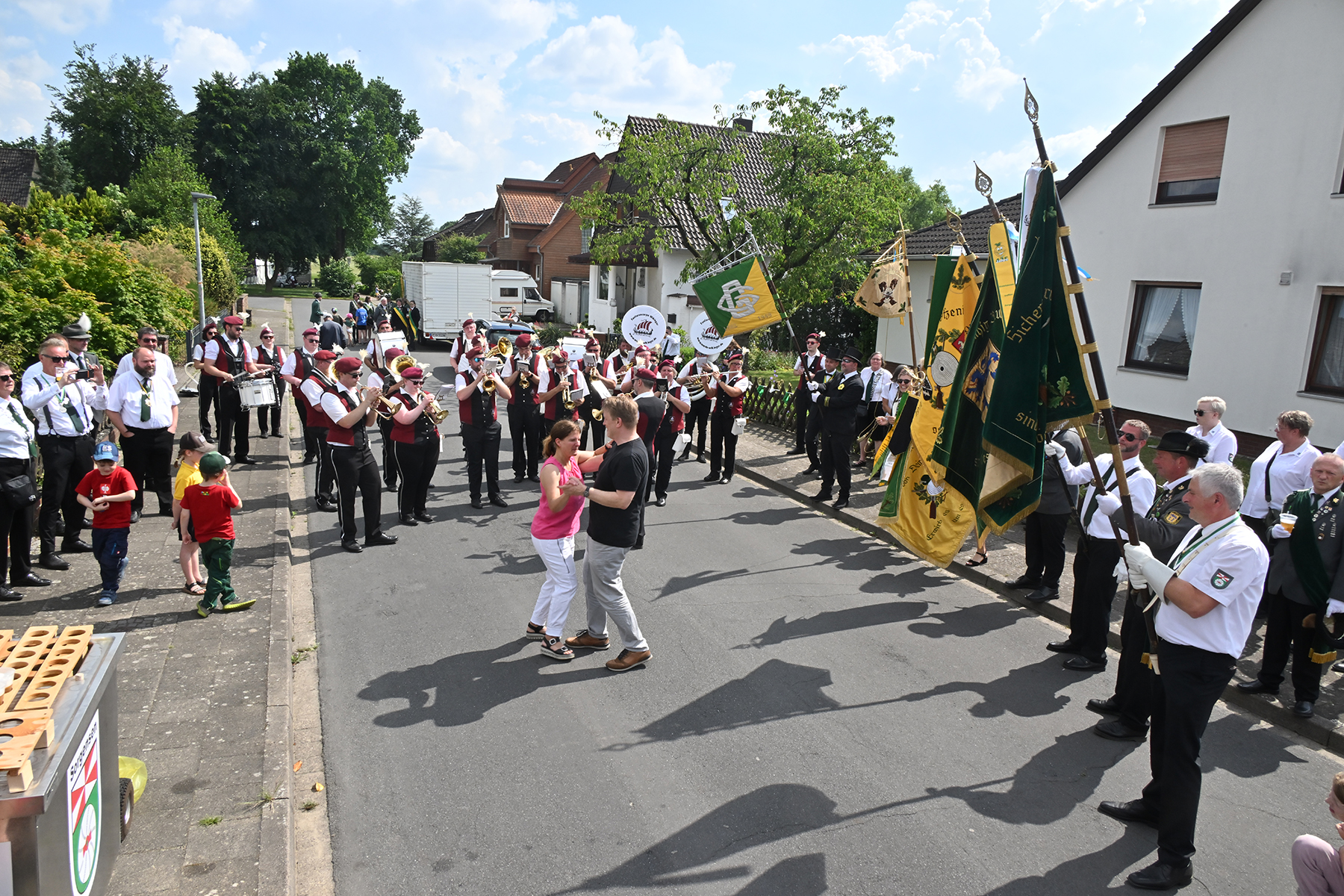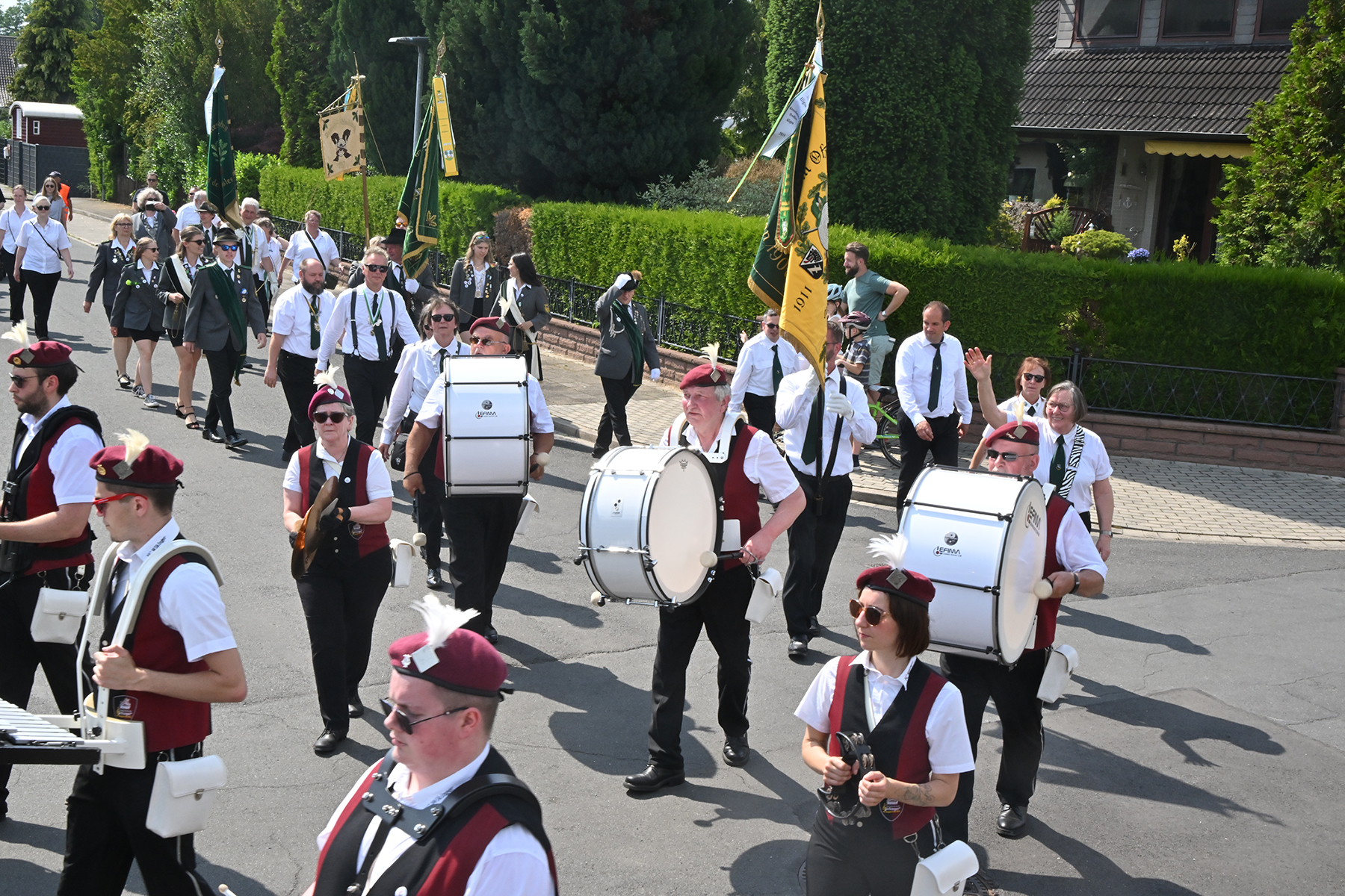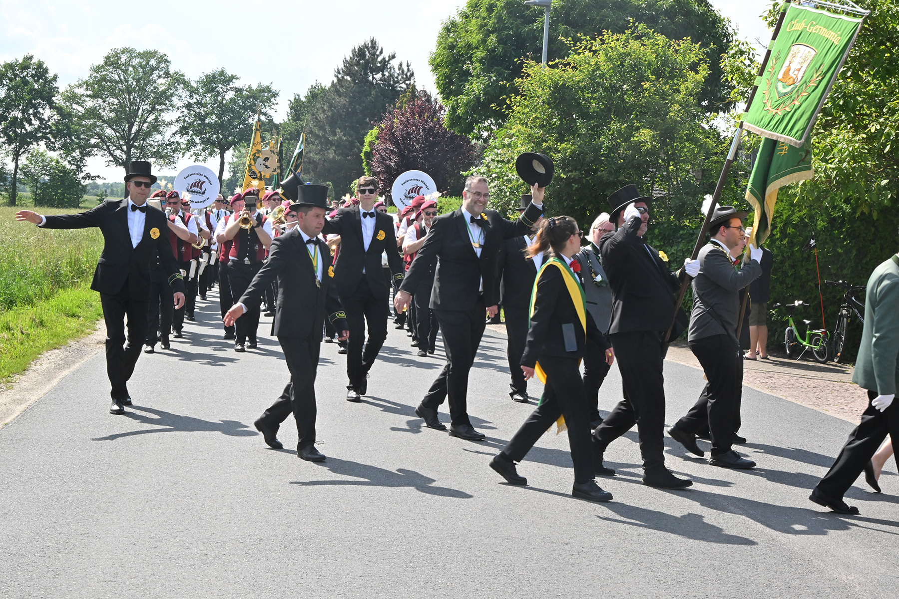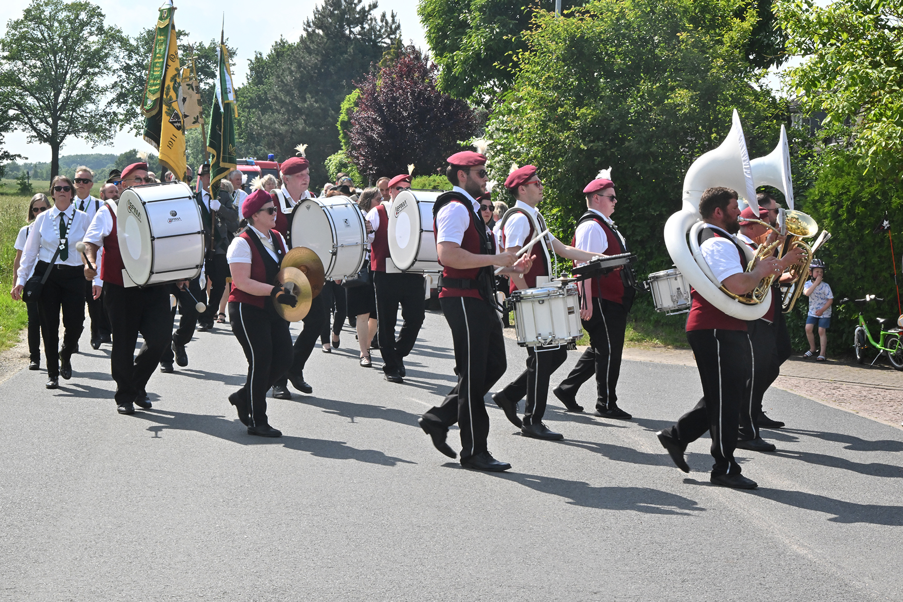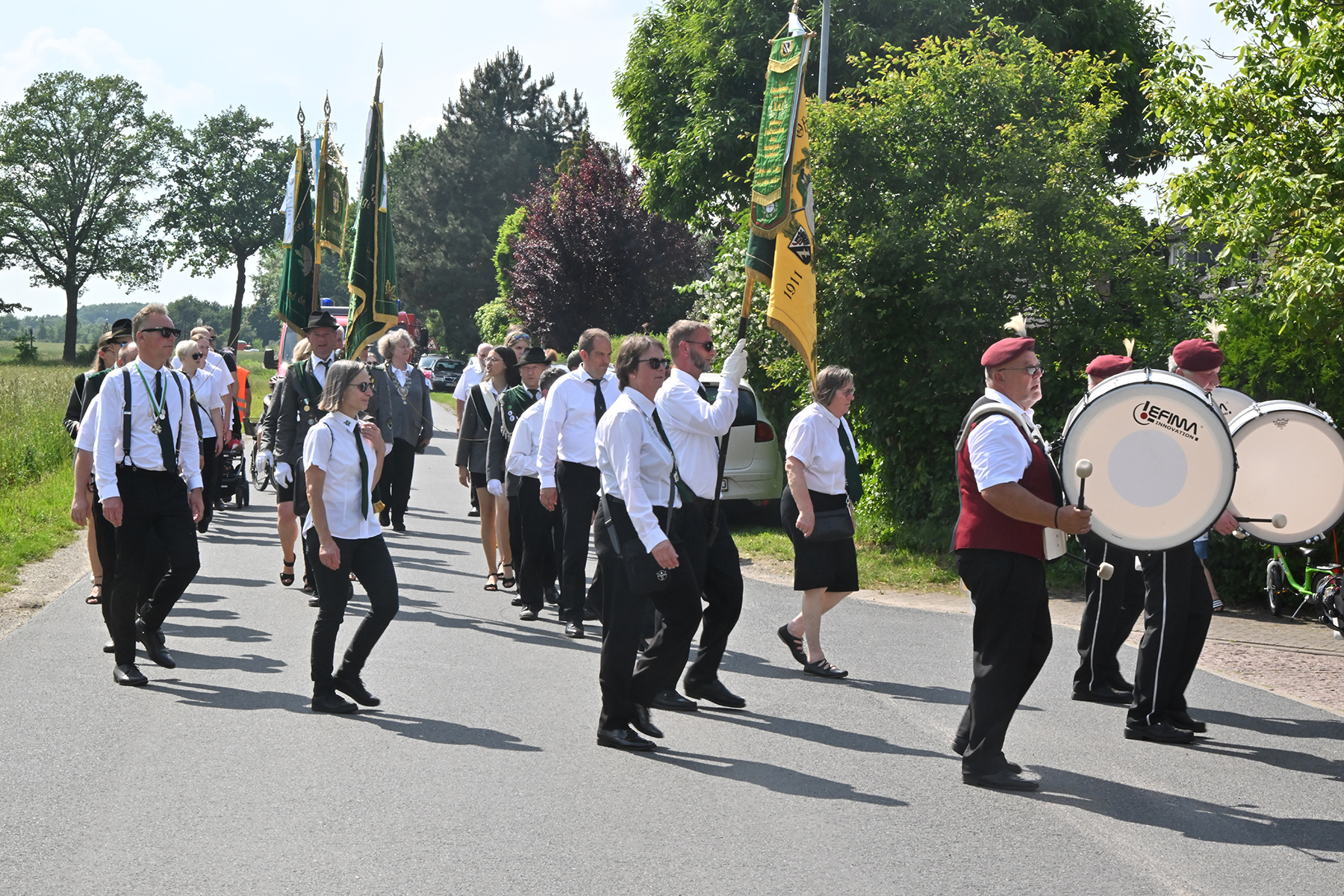 Zuvor hieß es aber, die Königsscheibe zu überbringen: Unter der musikalischen Begleitung des Fanfarencorps "Wikinger" Burgdorf und Absicherung durch die Ortsfeuerwehr Dachtmissen marschierten die Sorgenser Schützen, begleitet von Abordnungen der Schützenvereine aus Burgdorf, Hülptingsen, Otze und Schillerslage, zur neuen Königin wie auch zur Dorfkönigin, ehe es wieder zum Schützenplatz neben der Schützenkate ging.