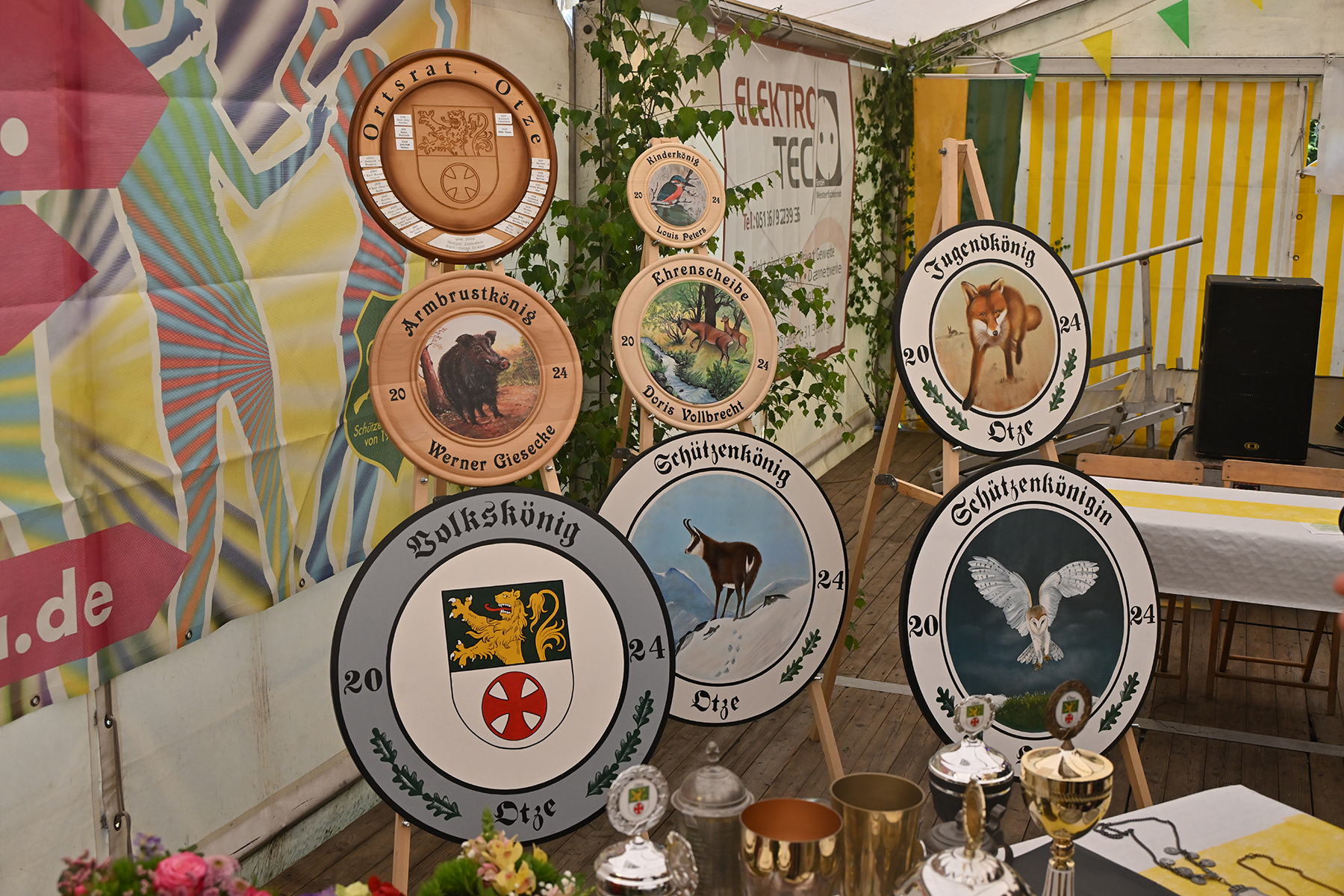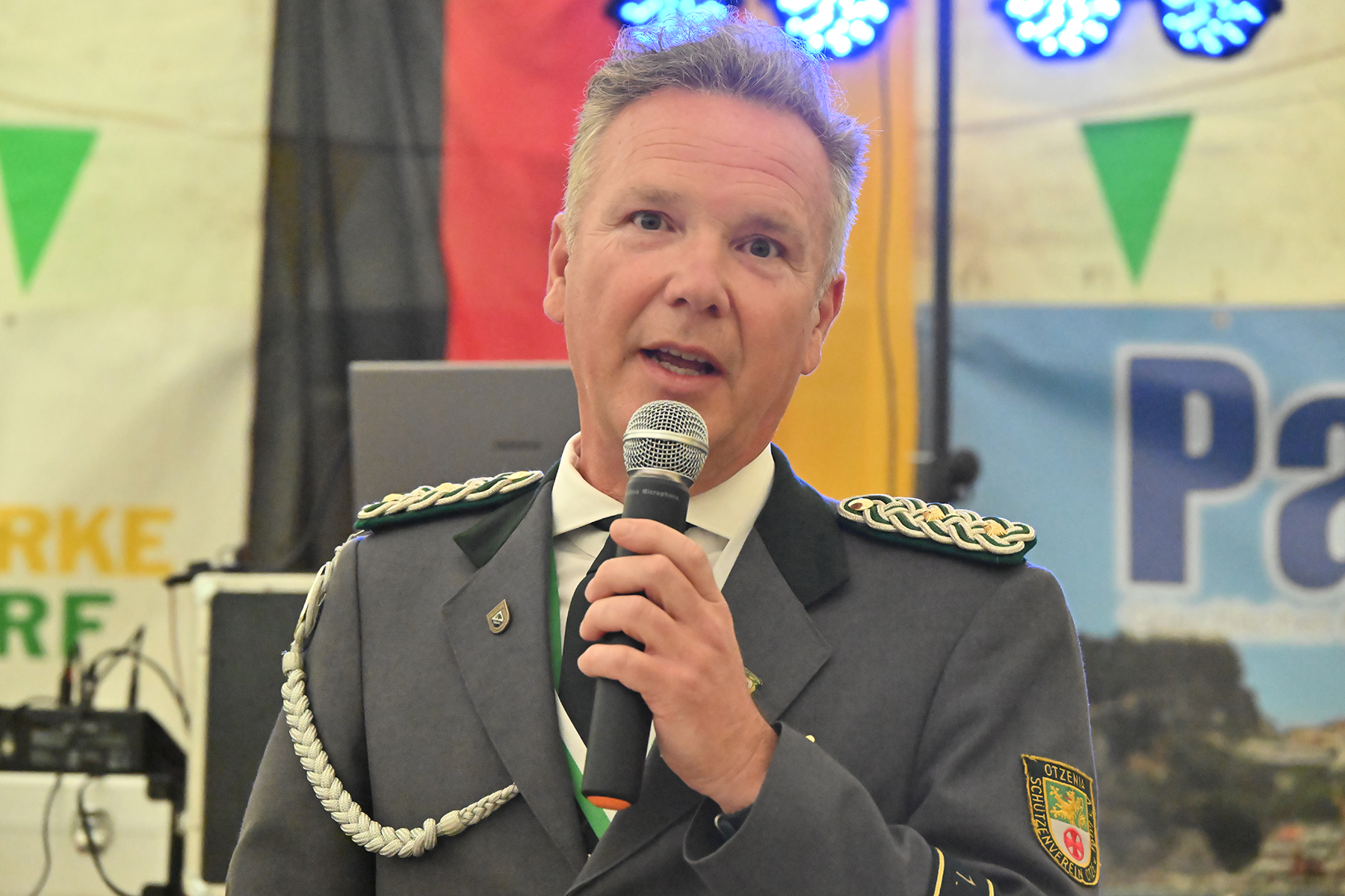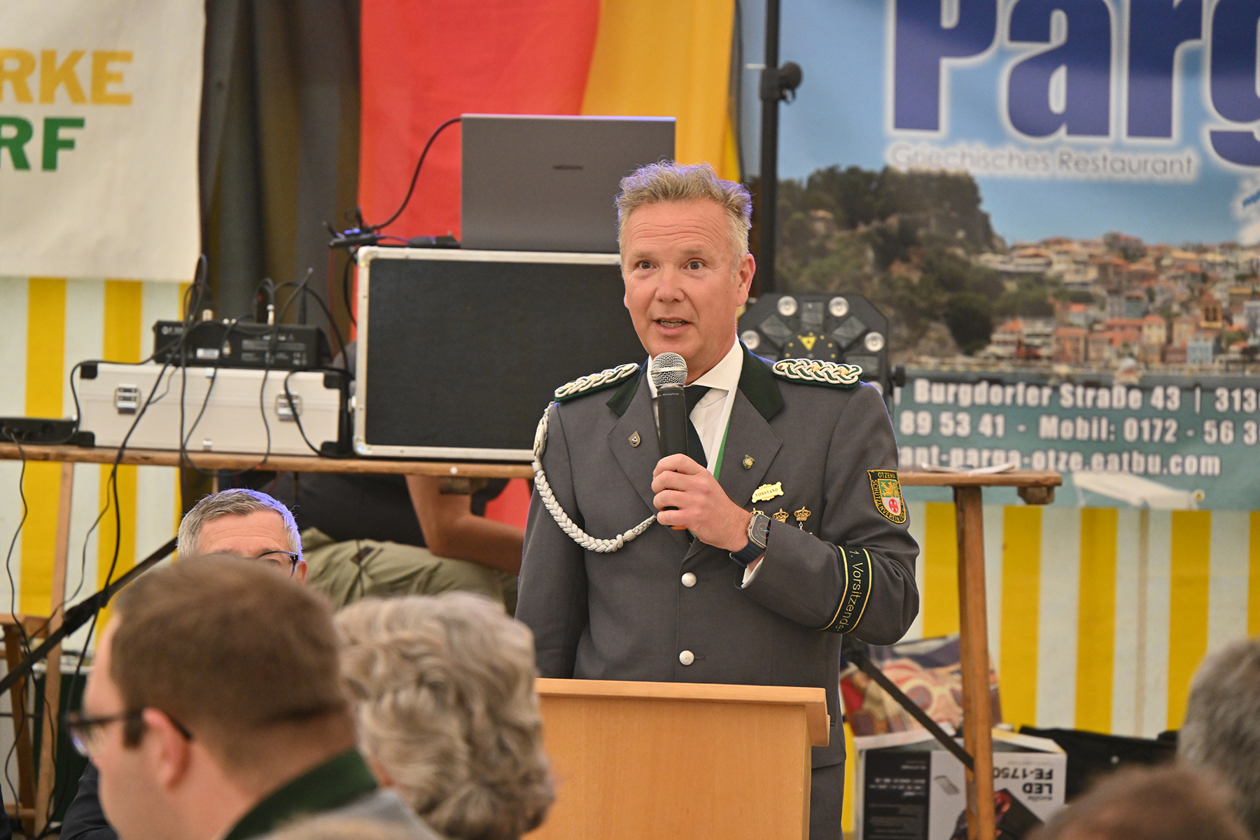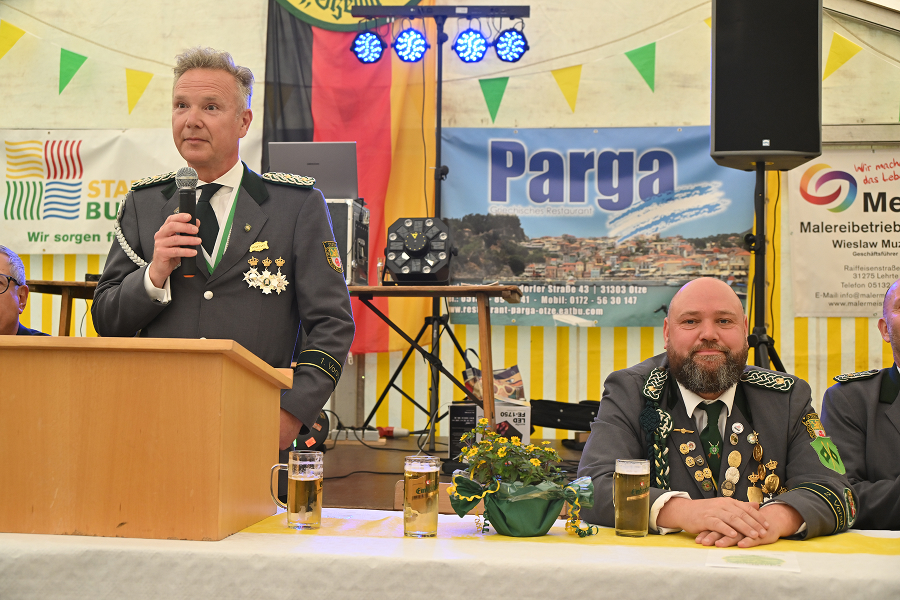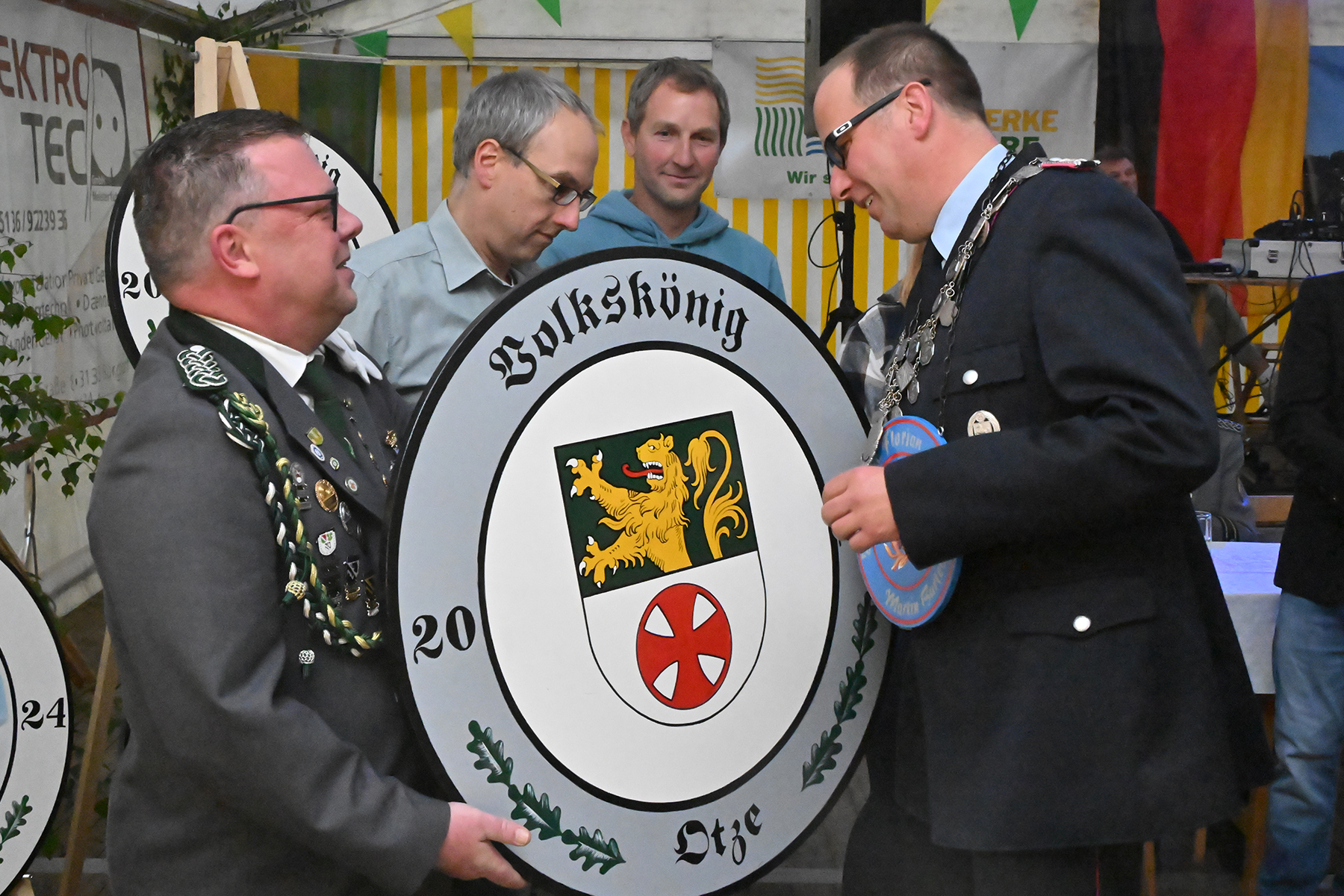 Rund 150 Gäste konnte der 1. Vorsitzende Maik Heuer am gestrigen Freitag, 7. Juni 2024, beim Festkommers im Festzelt zur Übergabe der Pokale und feierlichen Proklamation der neuen Majestäten begrüßen. Entsprechend war die Liste der namentlich zu erwähnenden Gäste lang. So waren unter anderem Burgdorfs Bürgermeister Armin Pollehn, Ortsbürgermeister Andreas Meyer, der Präsident des Kreisschützenverbandes (KSV) Burgdorf, Werner Bösche, mit Vertretern des KSV, der Ehrenvorsitzende Carl Hunze, Abordnungen der befreundeten Vereine aus Burgdorf, Hülptingsen, Schillerslage, Sorgensen, Obershagen und Fuhrberg sowie Vertreter Junggesellencorporation von 1648 zu Burgdorf nach Otze gekommen. Zudem konnte er Vertreter des SV Hertha Otze, dem Kaninchenzuchtverein, dem Reit- und Fahrverein und dem Tischtennisclub willkommen heißen.