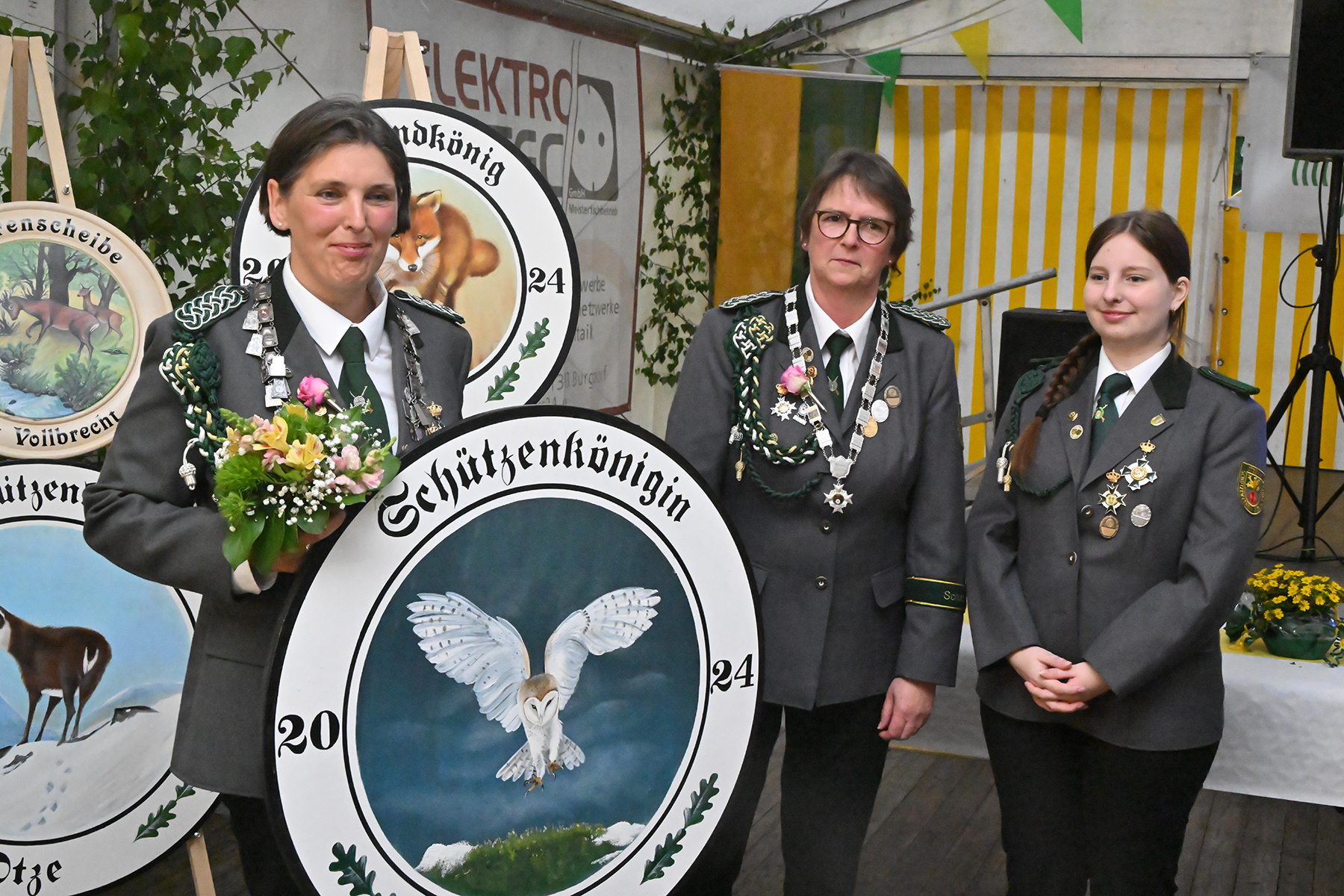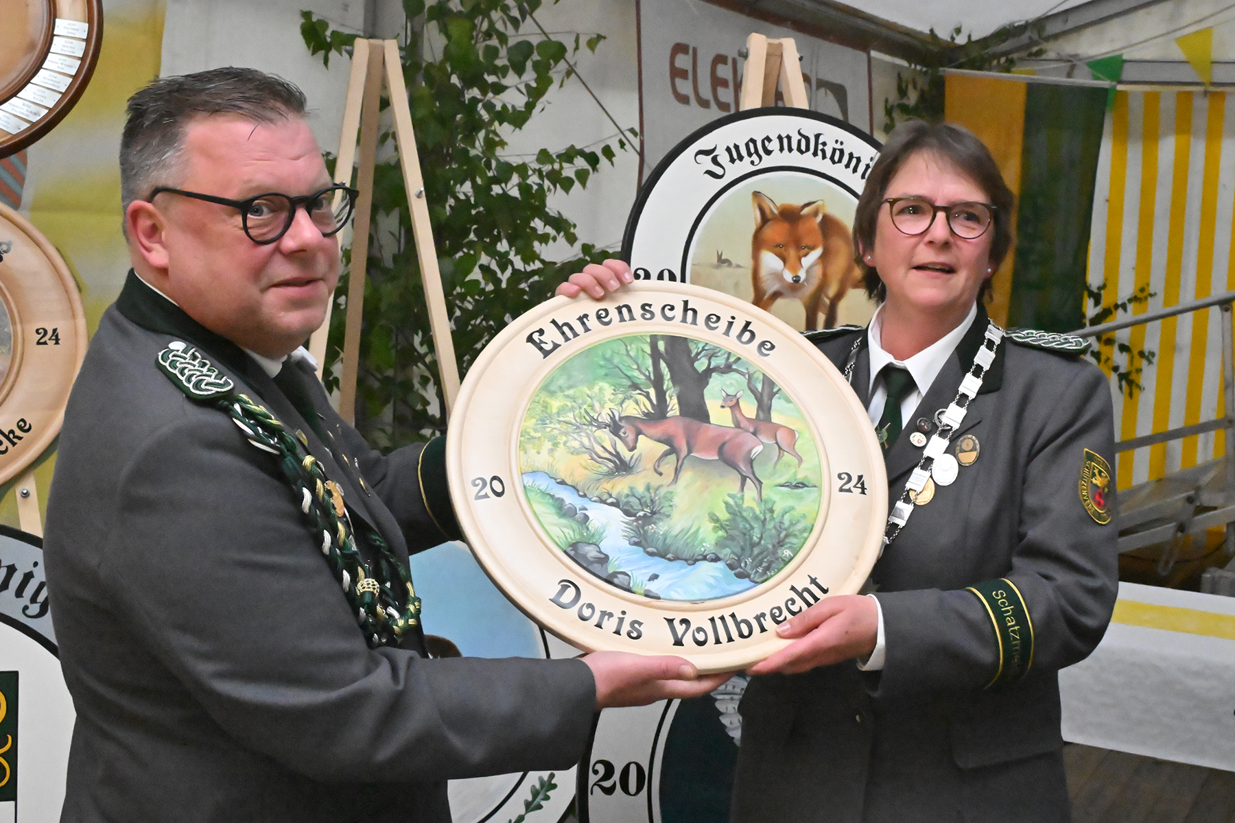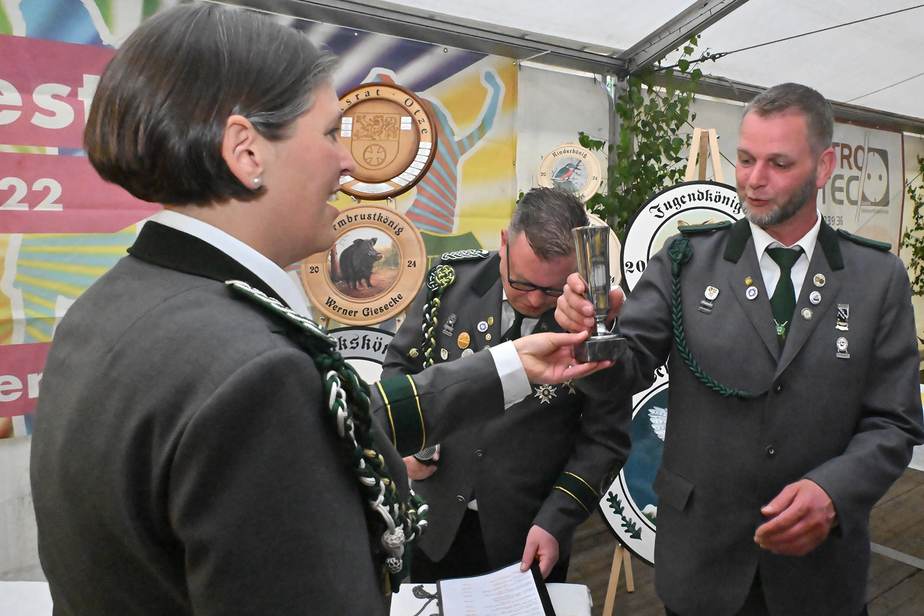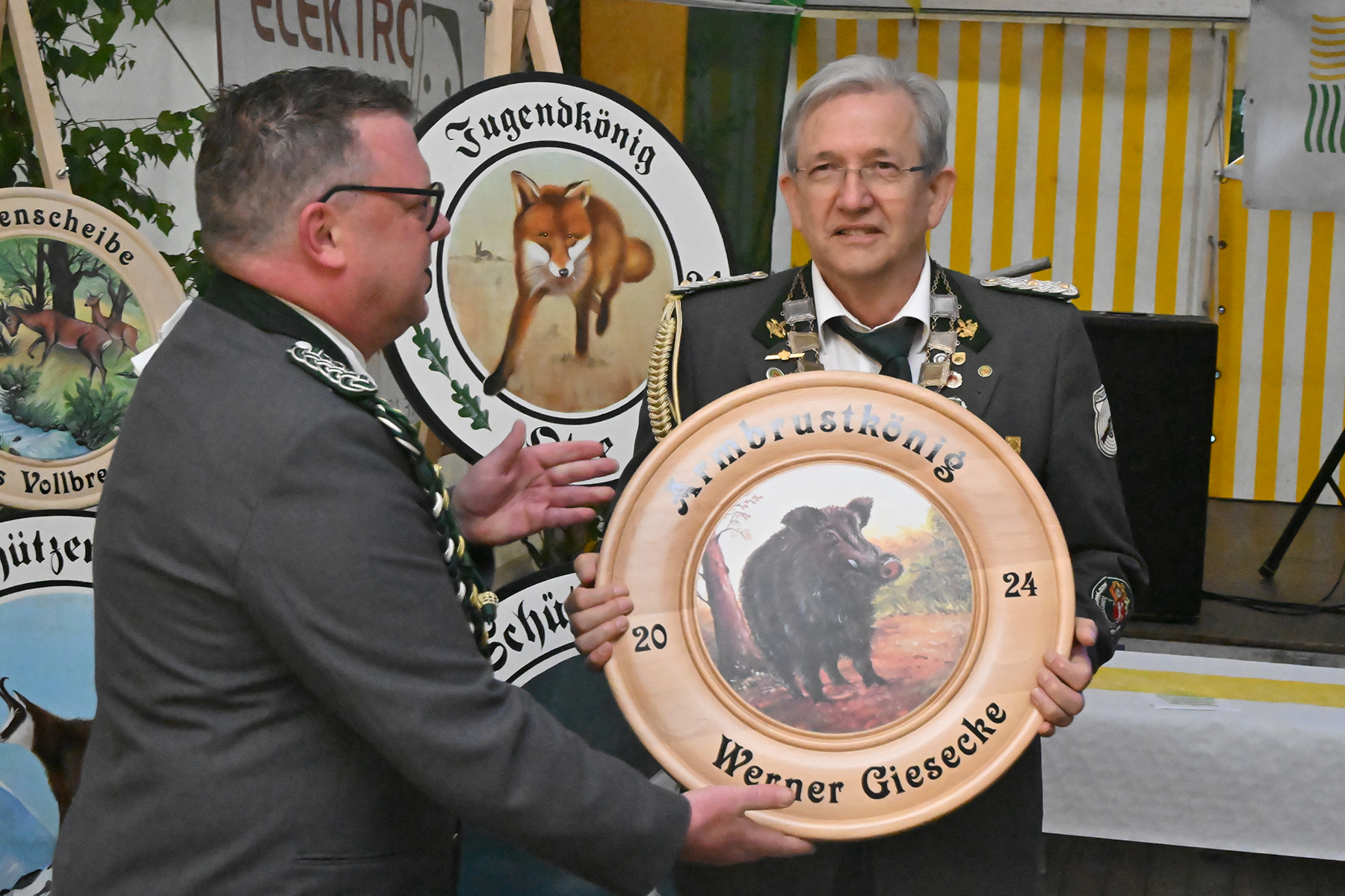 Die Ortsratsscheibe konnte an Joachim Höfner, der sich zudem, wie im Vorjahr, den Titel des Schützenkönigs gesichert hatte. Weiter erhielten die weiteren Majestäten, die am vergangenen Sonntag bereits bekannt gegeben worden waren (wir berichteten) ihre Insignien: Schützenkönigin Sonja Prieß, Jugendkönig Tjorben Beeneken, Kinderkönig Louis Peters, Armbrustkönig Werner Giesecke und die Gewinnerin der Ehrenscheibe, Doris Vollbrecht.