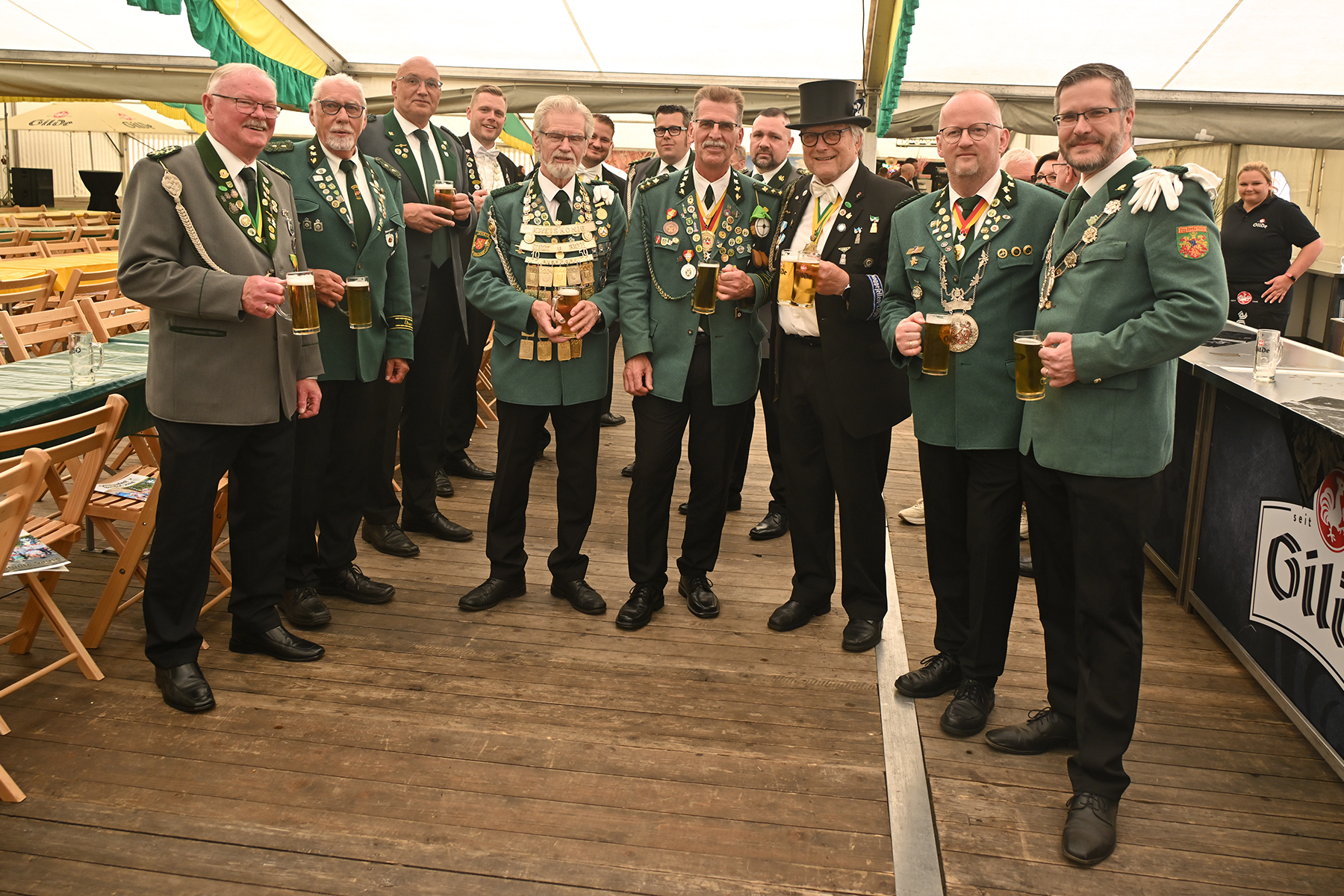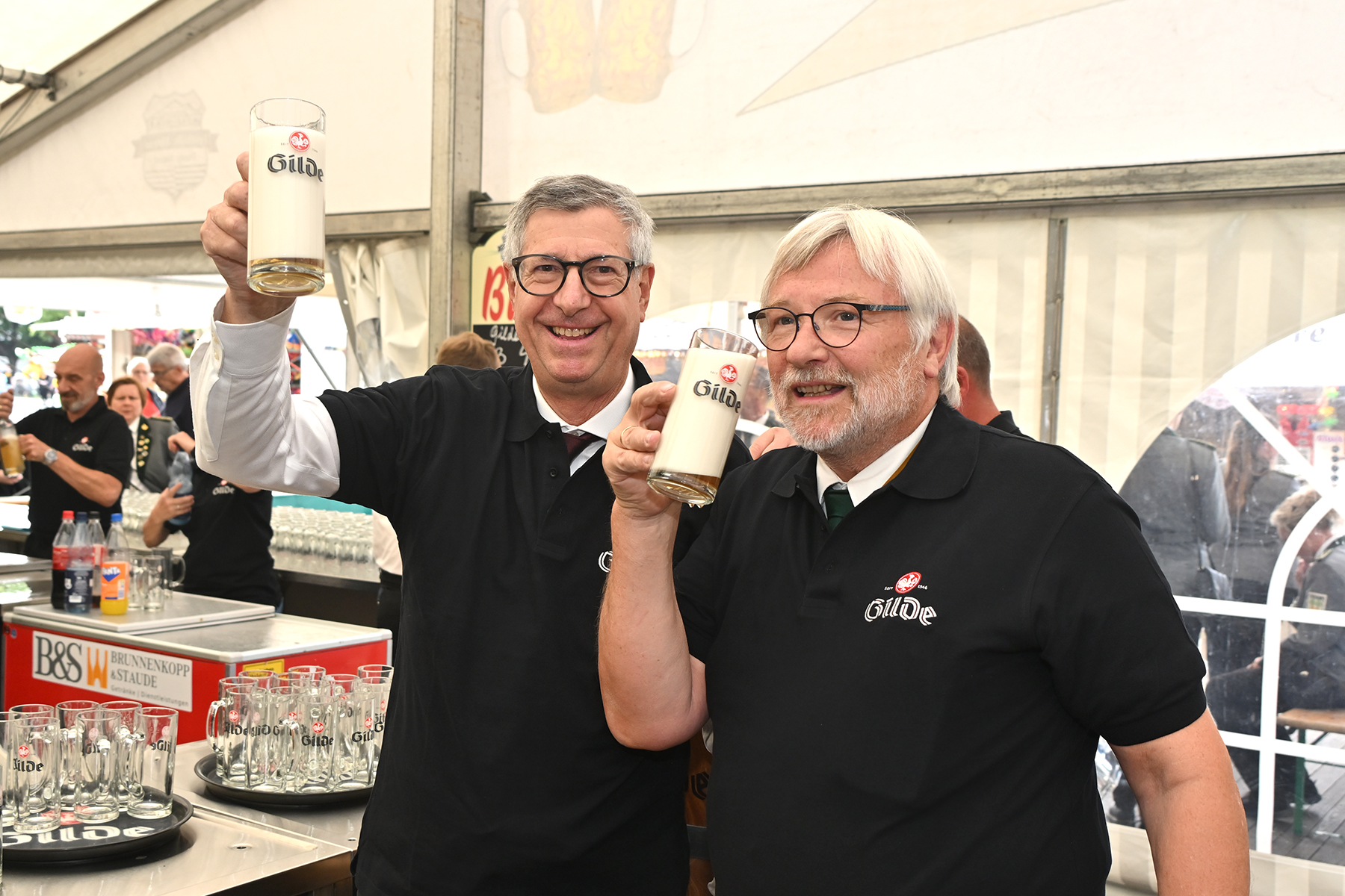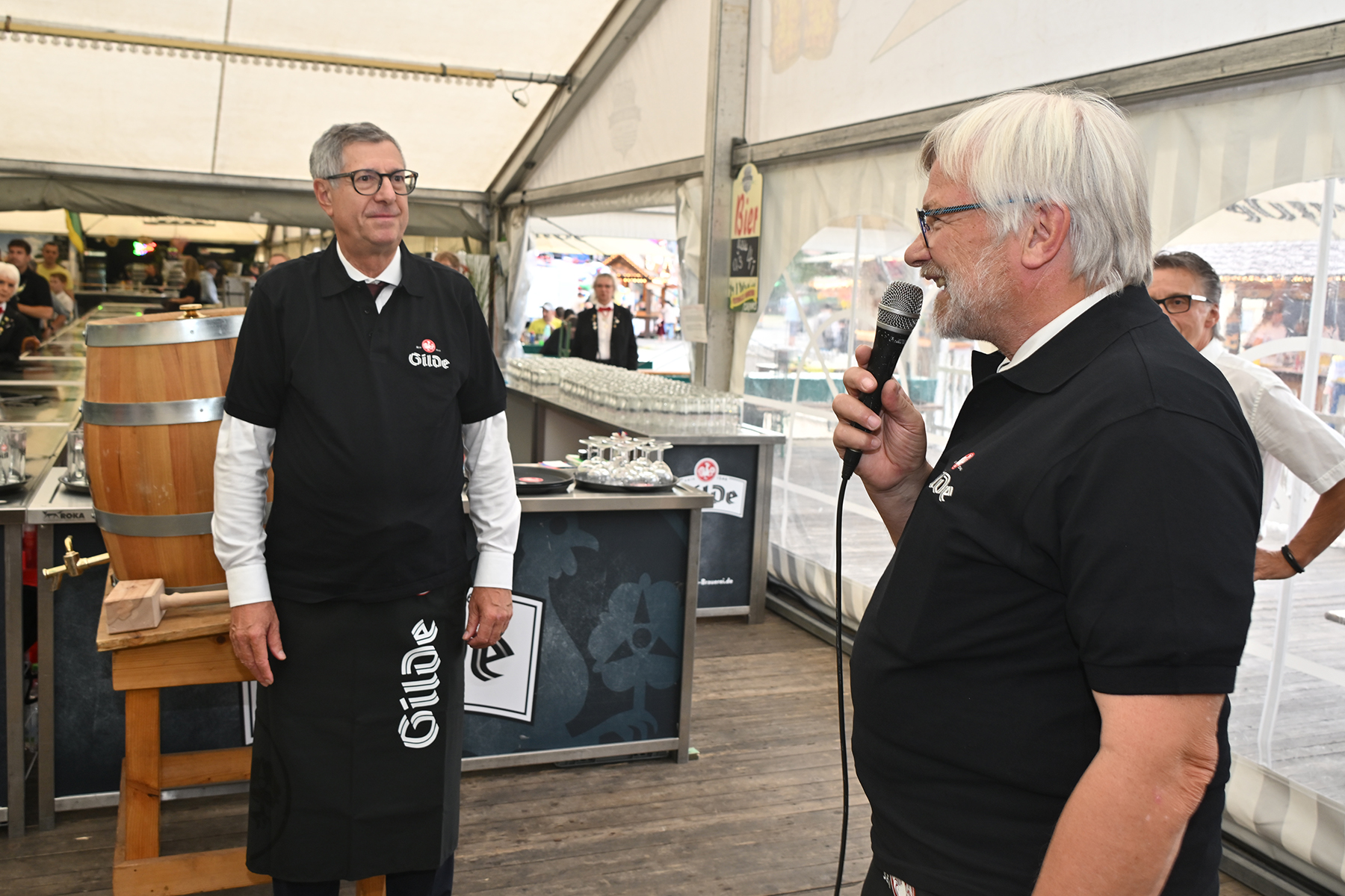 Mit gekonnten zwei Schlägen trieb er den Hahn in das Holzfass. Dieses war von der Gilde Brauerei Hannover gesponsort worden. Und das Fass feierte hierbei sogar eine kleine Premiere. Wie Olaf Schinkler, Gebietsverkaufsleiter bei der Gilde Brauerei, berichtet, ist dieses das erste Fass einer neuen Charge, welche in mühevoller Handarbeit hergestellt wird. In den vergangenen Jahren hatten die Burgdorfer Schützen eher weniger traditionell auf ein Aluminium-Fass gesetzt und hieraus die ersten Biere ausgeschenkt, da es immer wieder Probleme mit dem Zapfhahn gab und eine größere Menge des goldenen Getränkes zwischen den Brettern des Zeltbodens verschwand. Nach der gelungenen Premiere kann dieses Fass nun auch beim größten Schützenfest der Welt in Hannover zum Einsatz kommen.