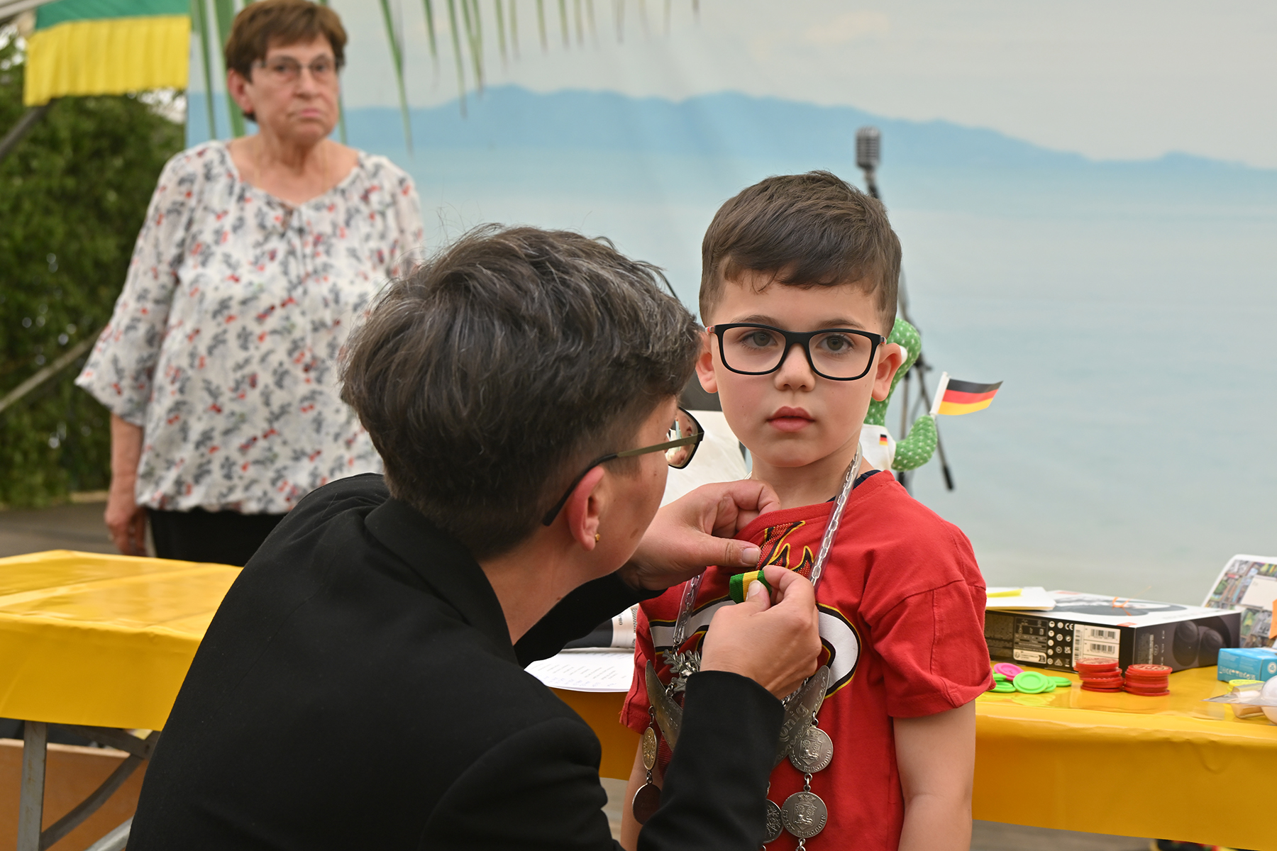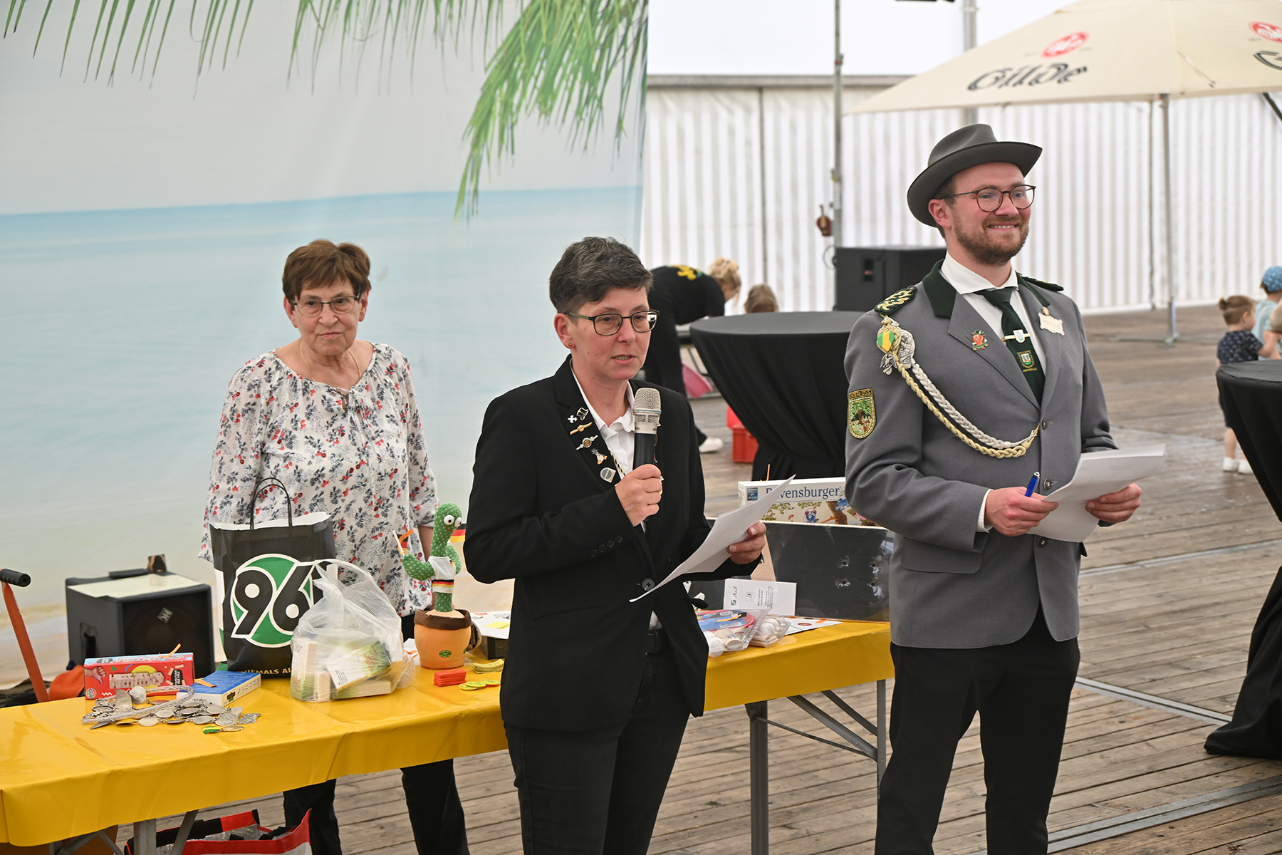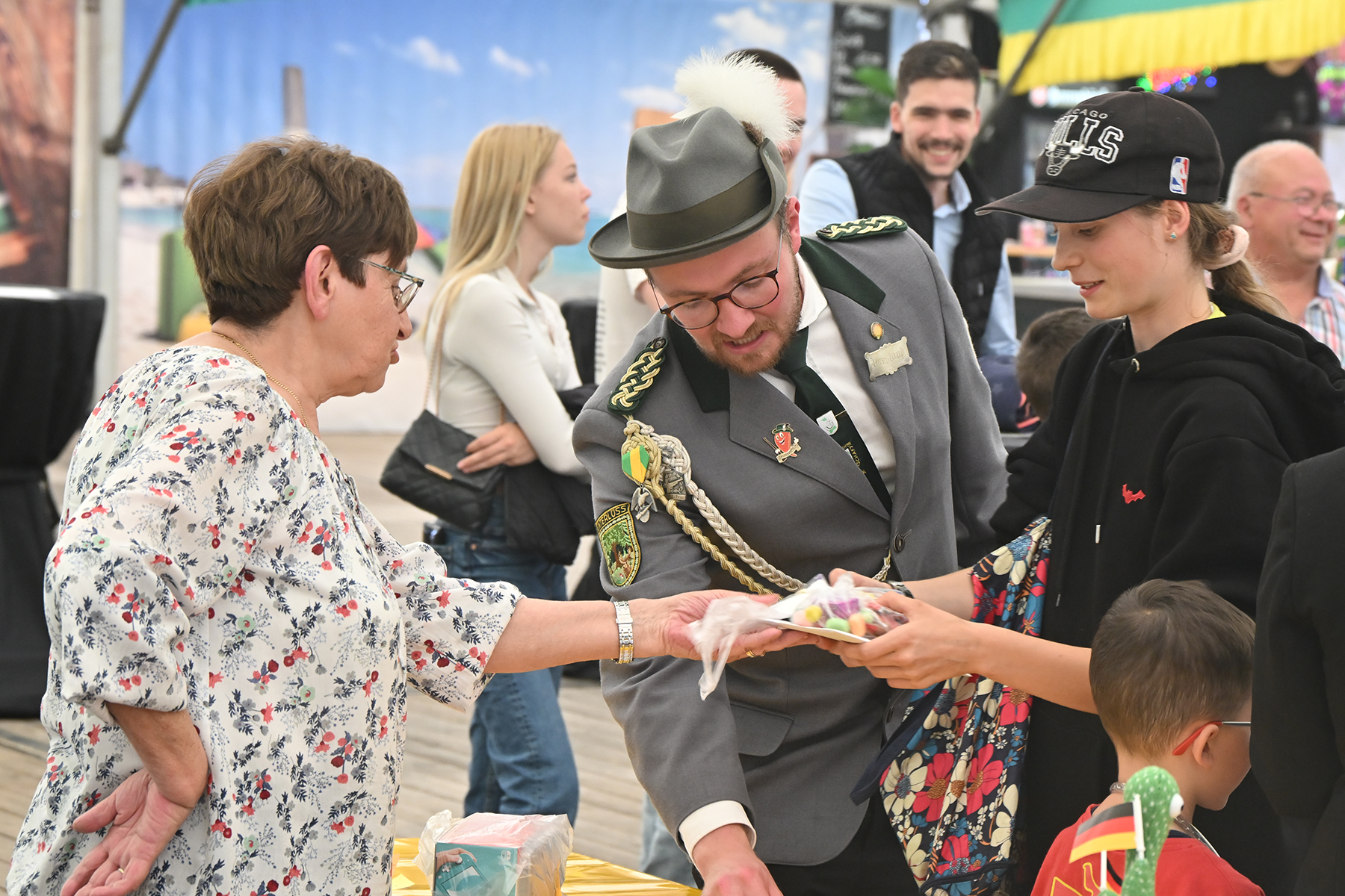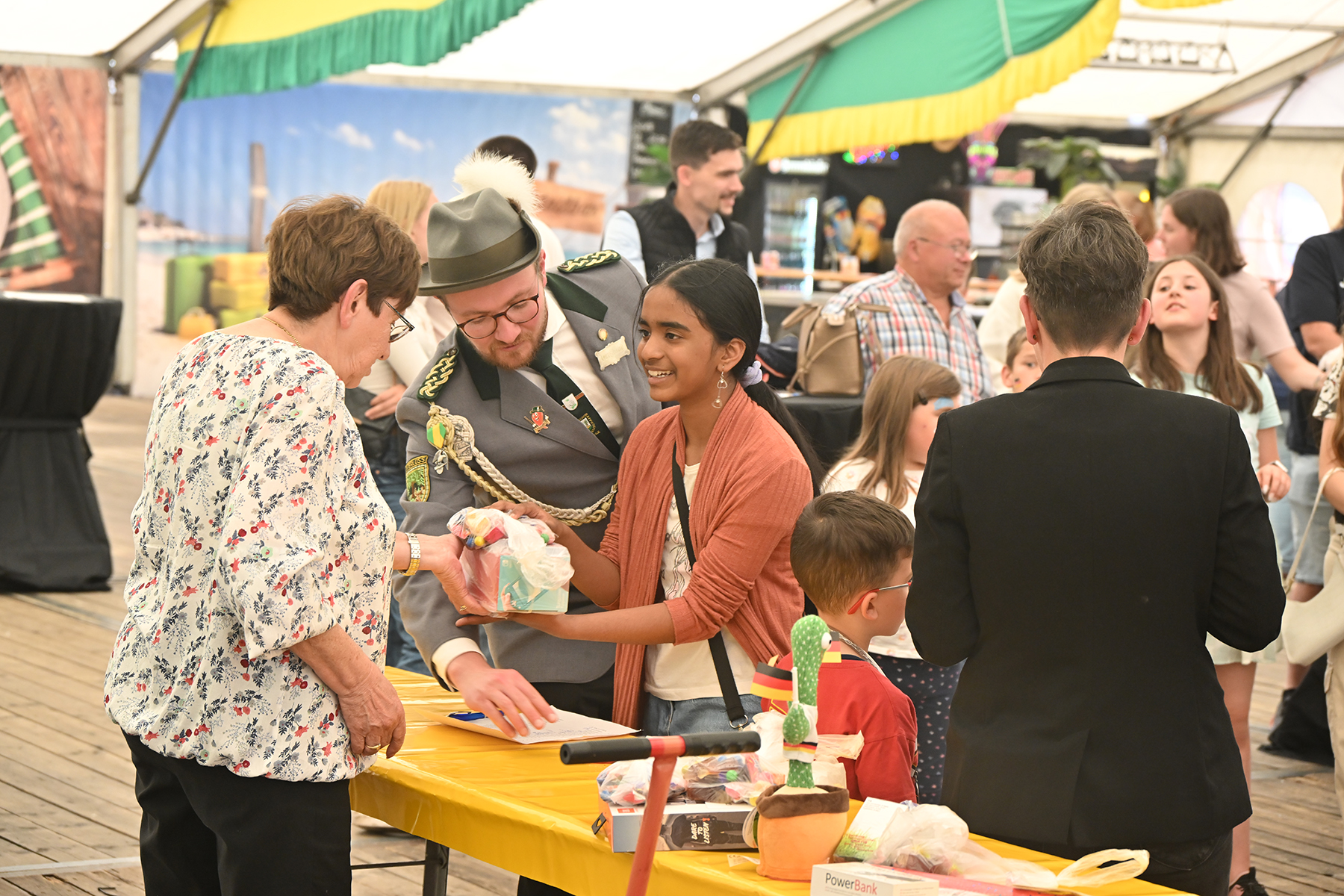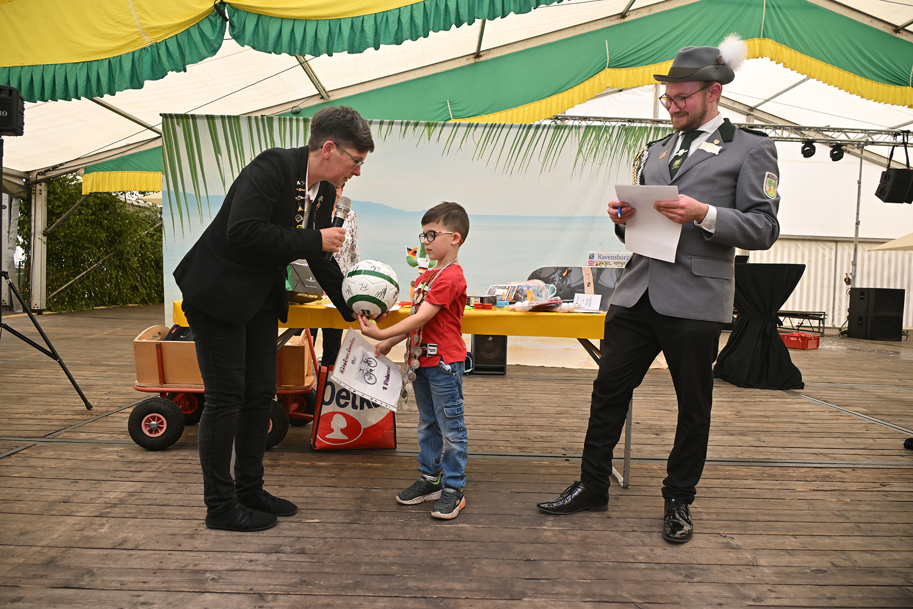 Am heutigen Donnerstag, 20. Juni 2024, wurde im Festzelt die erste Königswürde des Burgdorfer Volks- und Schützenfestes verliehen. Diese erhielt der gerade sechs Jahre alt gewordene Alejandro Bermudo. Er kann sich neben der Königskette, die er nun ein Jahr tragen darf, über einen Fahrer sowie einen signierten 96-Fußball freuen.