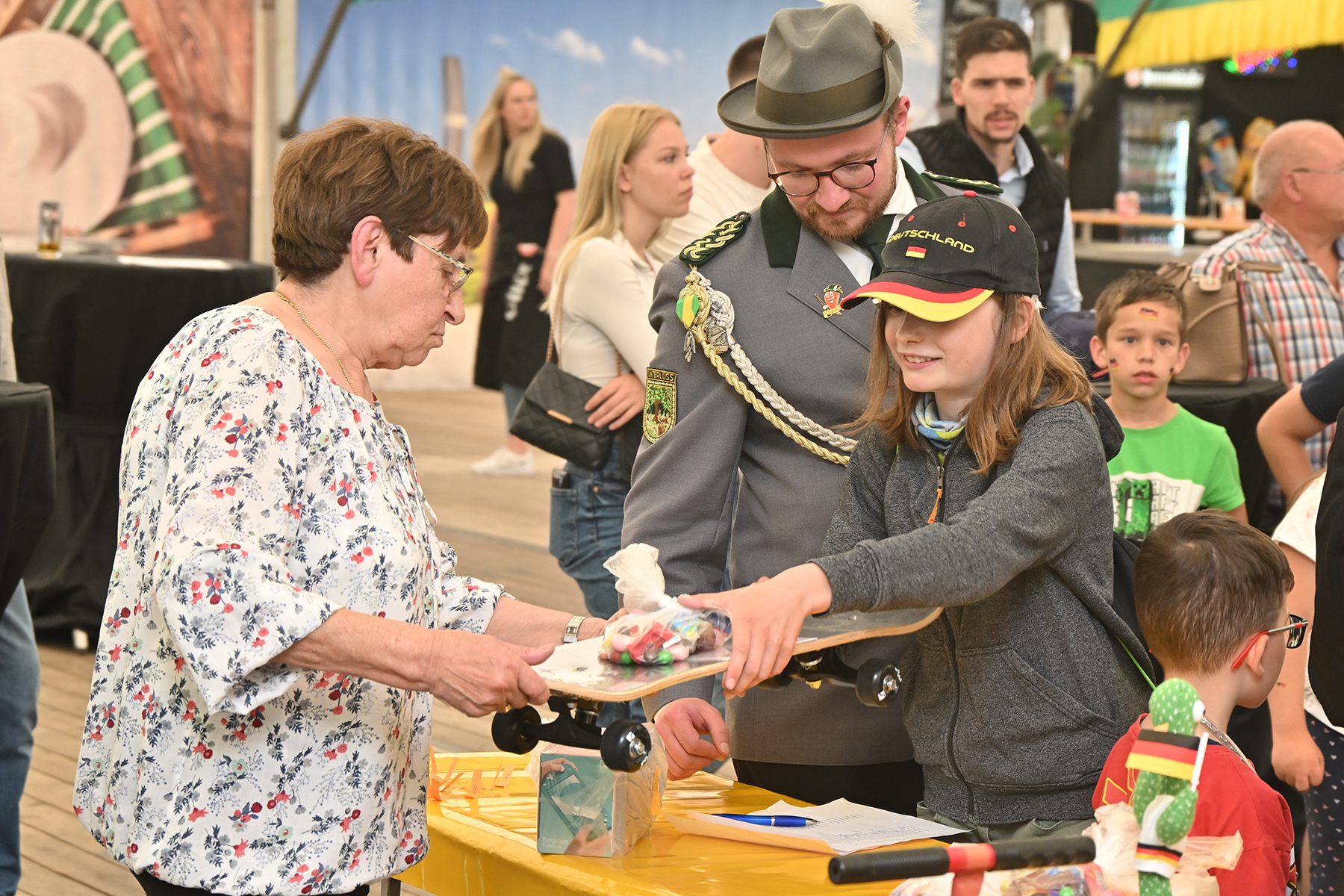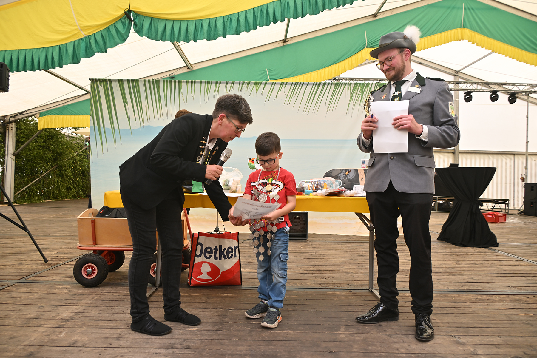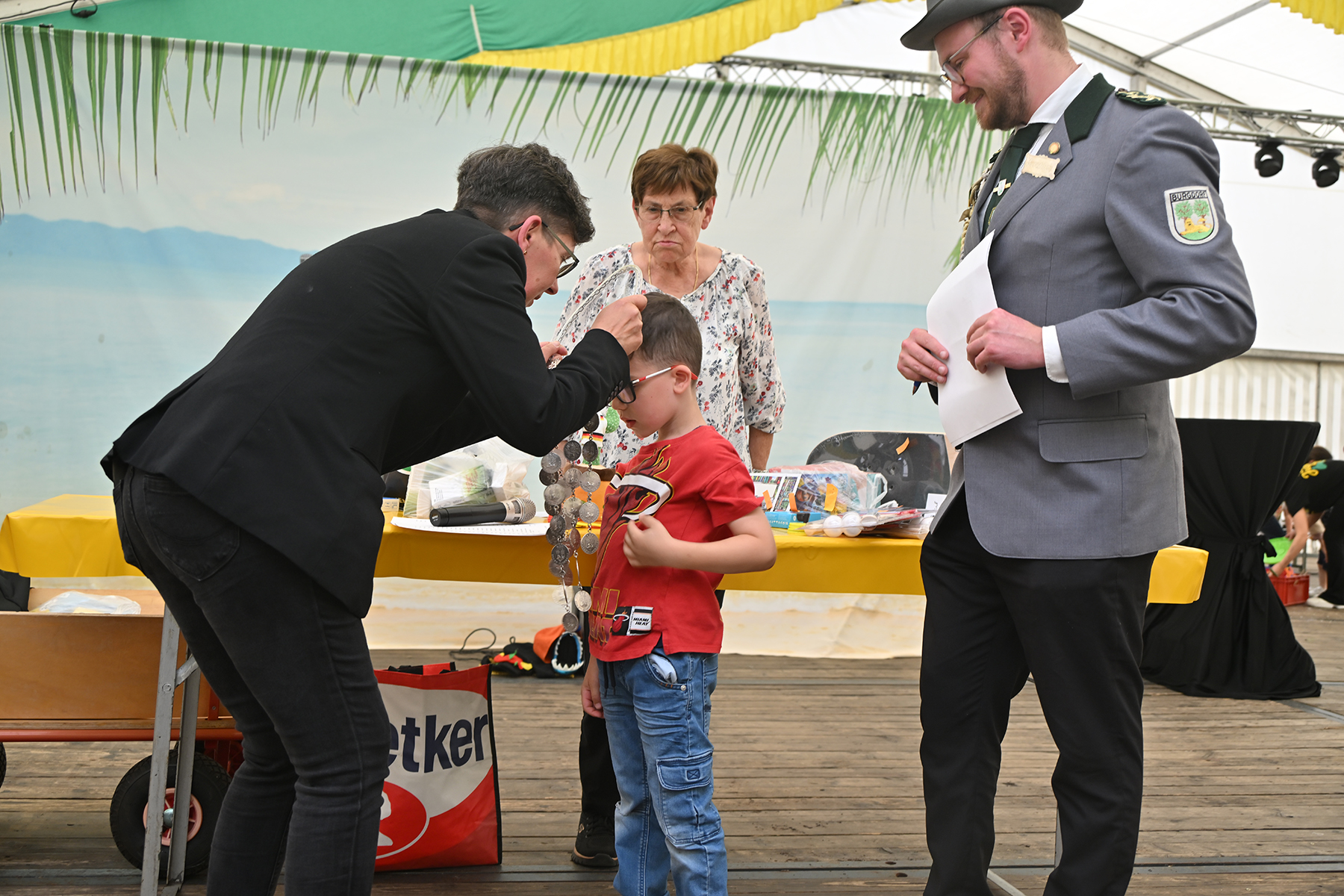 Wie immer zeichneten sich Cathrin und Elfi Eichner für die Durchführung des Wettbewerbs um den Kinderkönig verantwortlich. Ihnen zur Seite stand bei der Preisverleihung Georg Rieger vom Festvorstand der Burgdorfer Schützengesellschaft. Der Wettbewerb kannte keine Verlierer. Jedes Kind erhielt einen Preis sowie eine kleine Tüte mit Süßigkeiten und Chips der Fahrgeschäfte, die an diesem Nachmittag zudem vergünstigte Preise angeboten hatten.