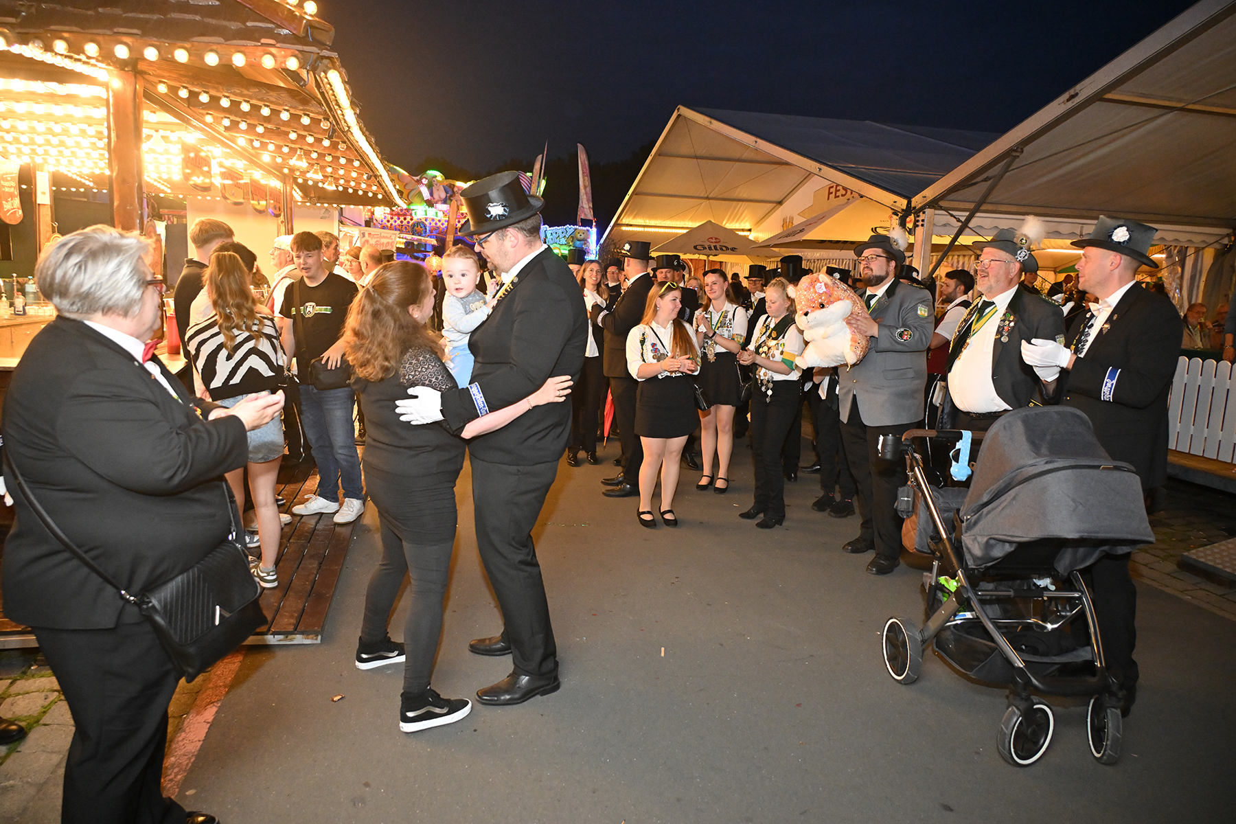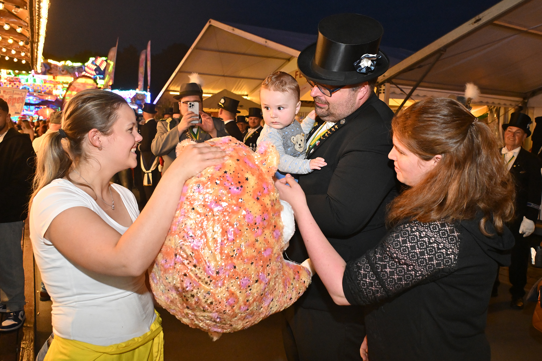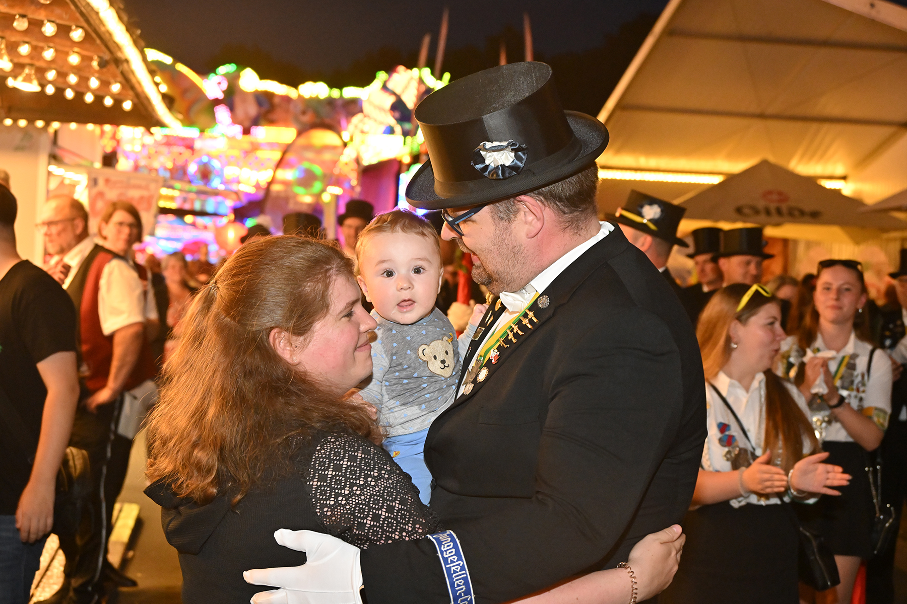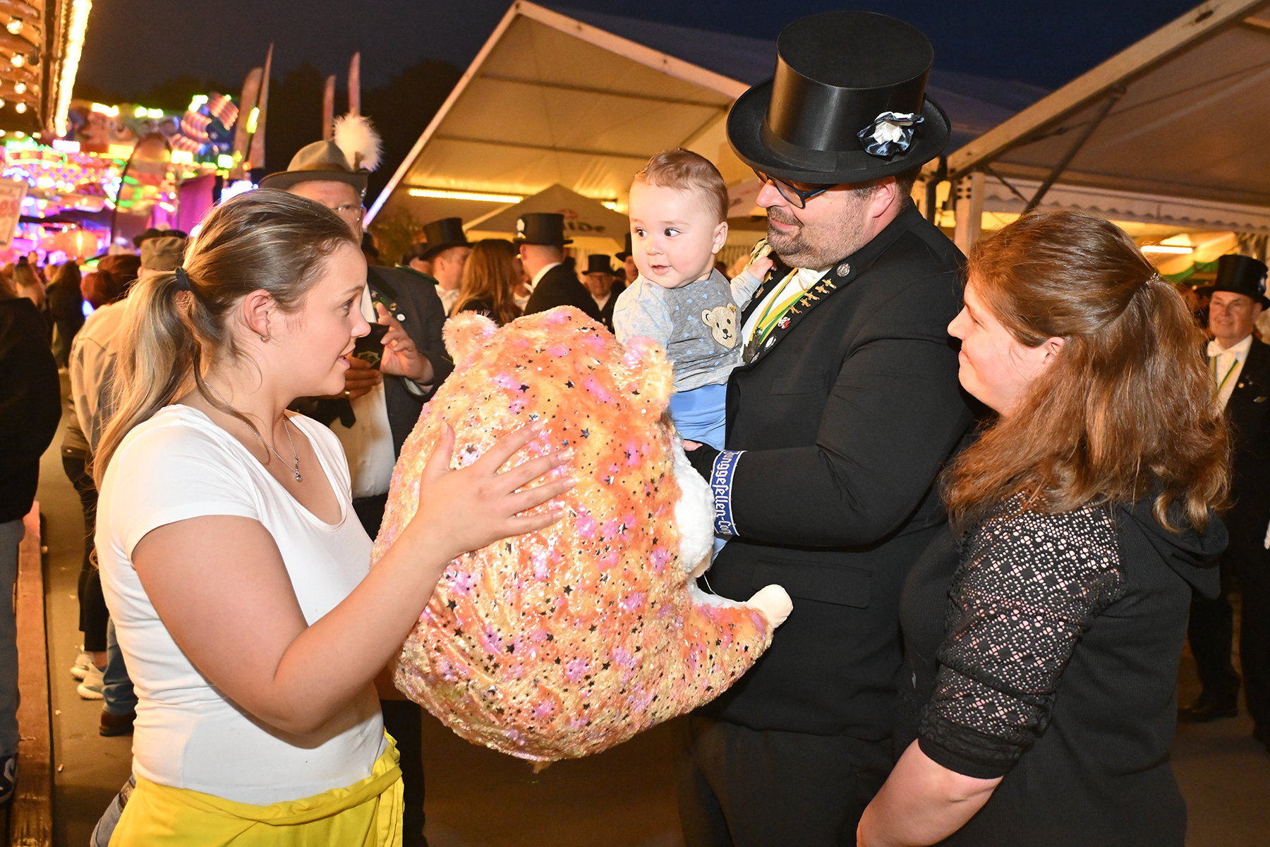 Sohn Eric fand sichtbares Gefallen an der Aktion, bei der es zunächst unter der Begleitung des Spielmannszugs der Burgdorfer Schützengesellschaft einmal über den Festplatz ging, ehe die Übergabe stattfand. Mit großen Augen betrachtete er den Teddy, und auch die Musik des Spielmannszugs schien ihm angetan zu haben. Der acht Monate alte Junge verfolgte mit Gelassenheit den Trubel um sich herum.