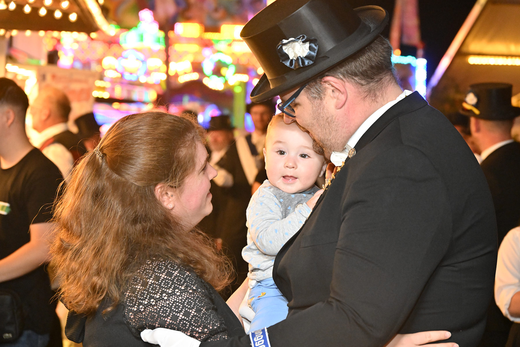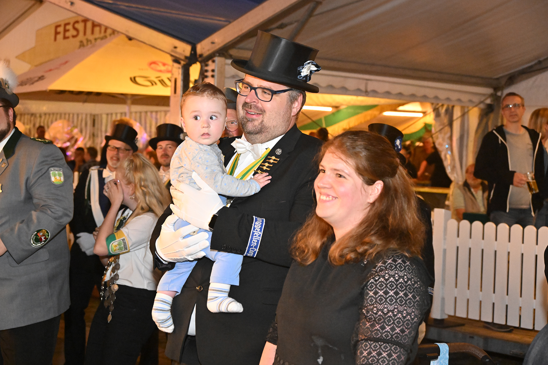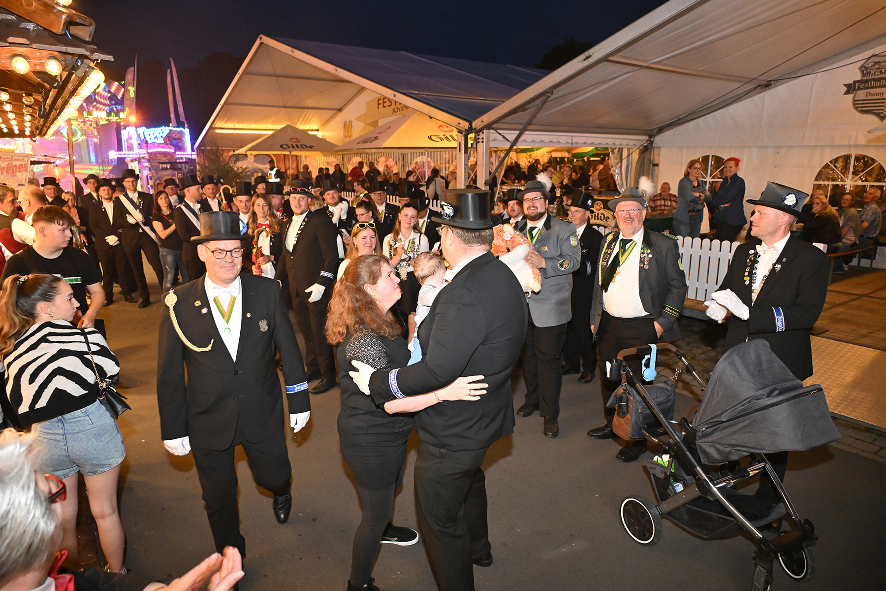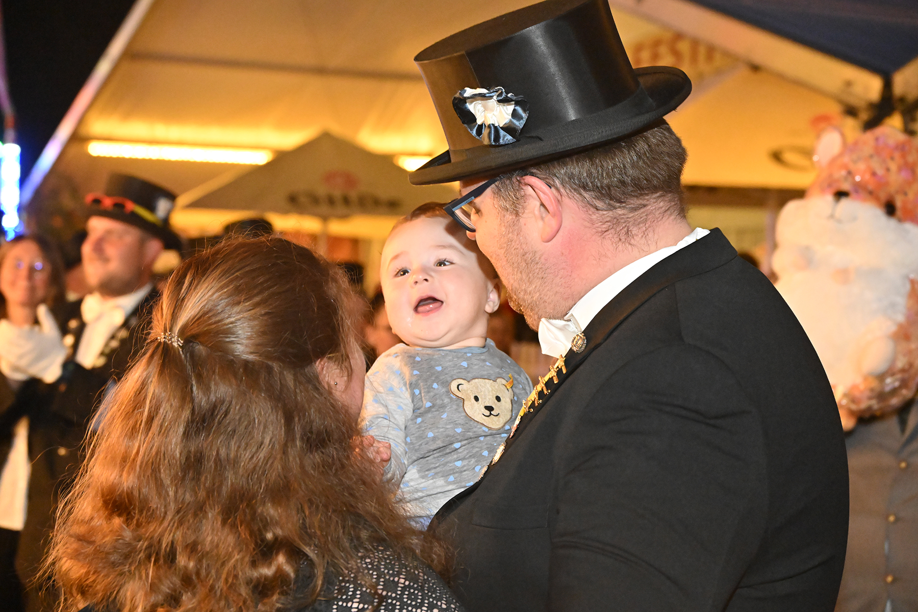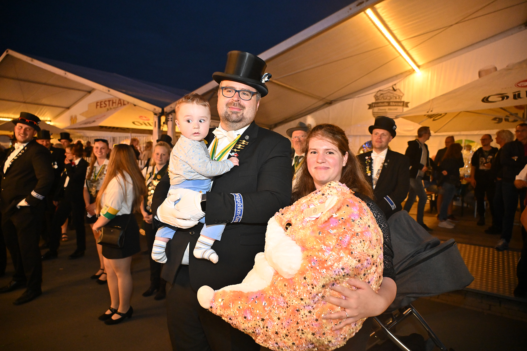 Sohn Eric fand sichtbares Gefallen an der Aktion, bei der es zunächst unter der Begleitung des Spielmannszugs der Burgdorfer Schützengesellschaft einmal über den Festplatz ging, ehe die Übergabe stattfand. Mit großen Augen betrachtete er den Teddy, und auch die Musik des Spielmannszugs schien ihm angetan zu haben. Der acht Monate alte Junge verfolgte mit Gelassenheit den Trubel um sich herum.