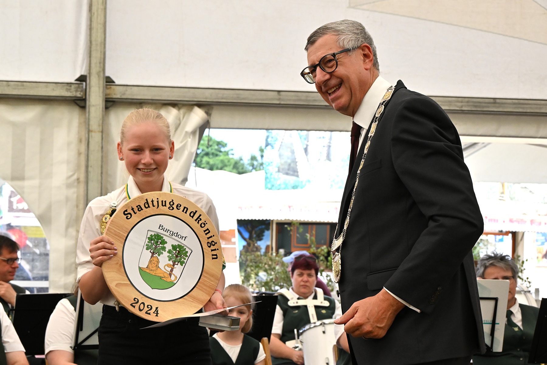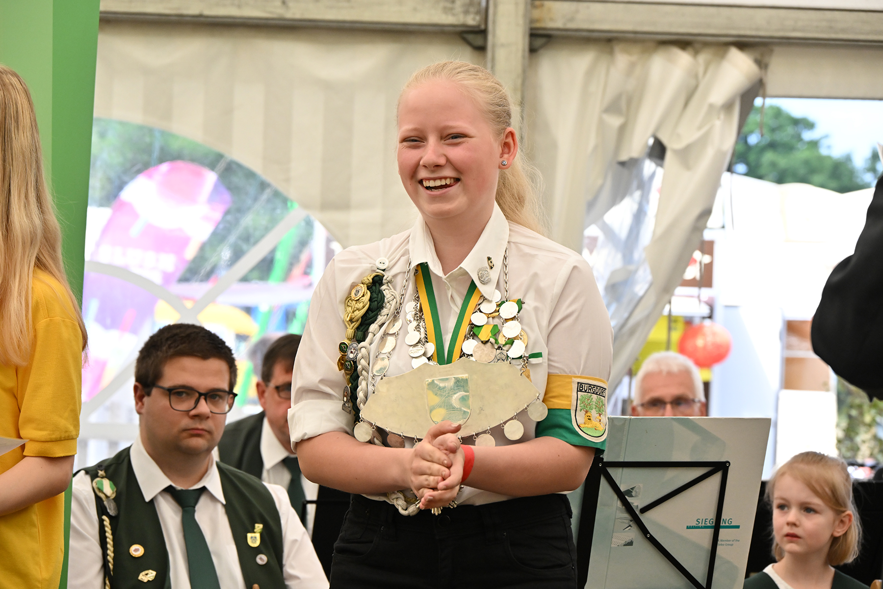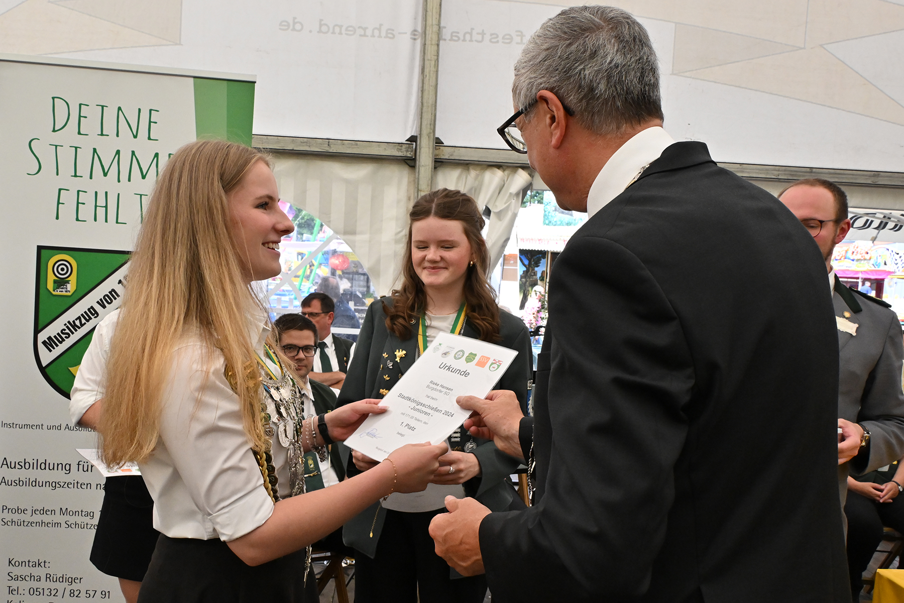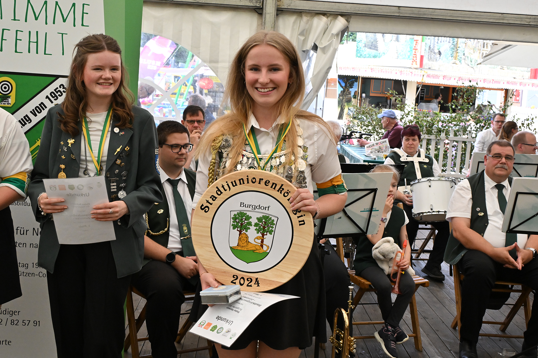 Die Königsriege komplettieren die Stadtjuniorenkönigin Rieke Hansen, die vor ihrer Schwester Ronja Hansen, beide von der Burgdorfer Schützengesellschaft, und Vivien Schwartz vom Schützenverein Hülptingsen gewann, sowie die Stadtjugendkönigin Leah-Sophie Bähre von der Burgdorfer Schützengesellschaft, die Luisa Marie Wessarges und Rica Thiesen, beide vom Schützenverein Hülptingsen, auf die weiteren Plätze verwies.