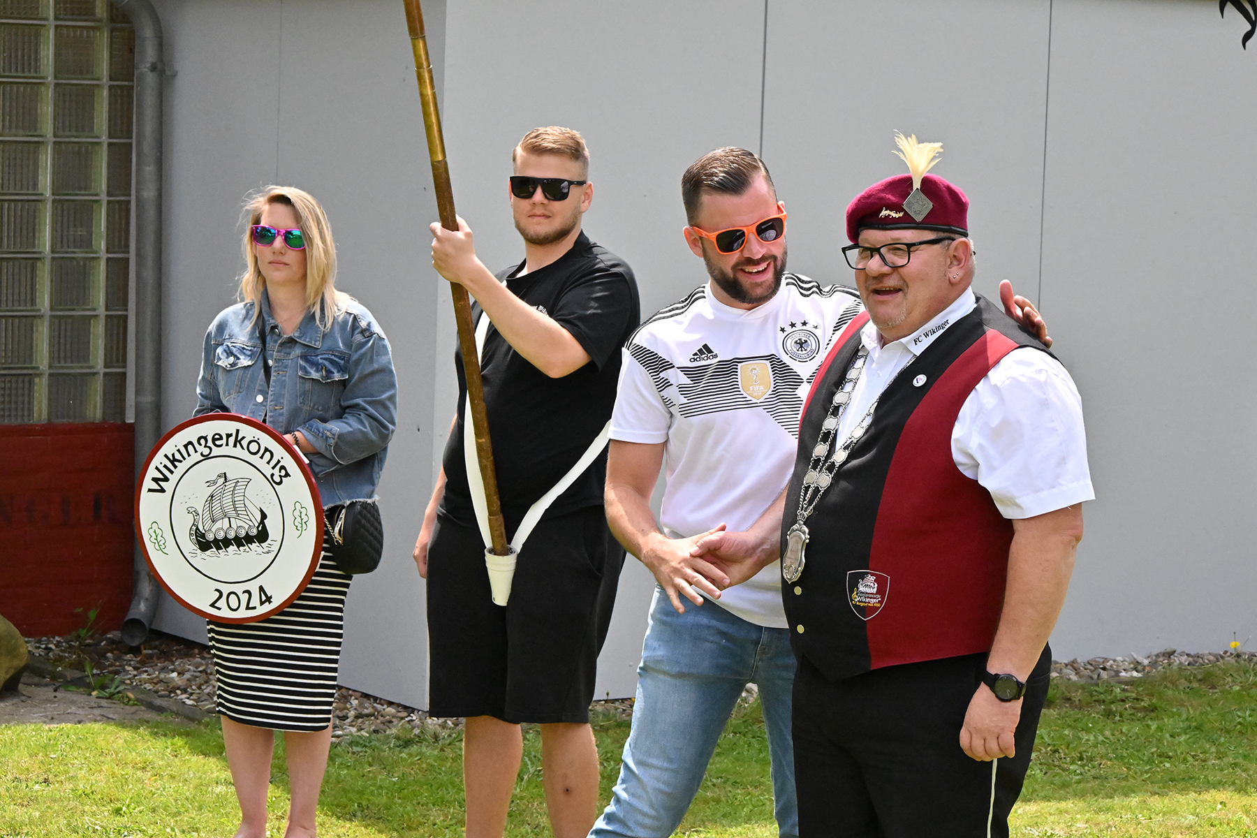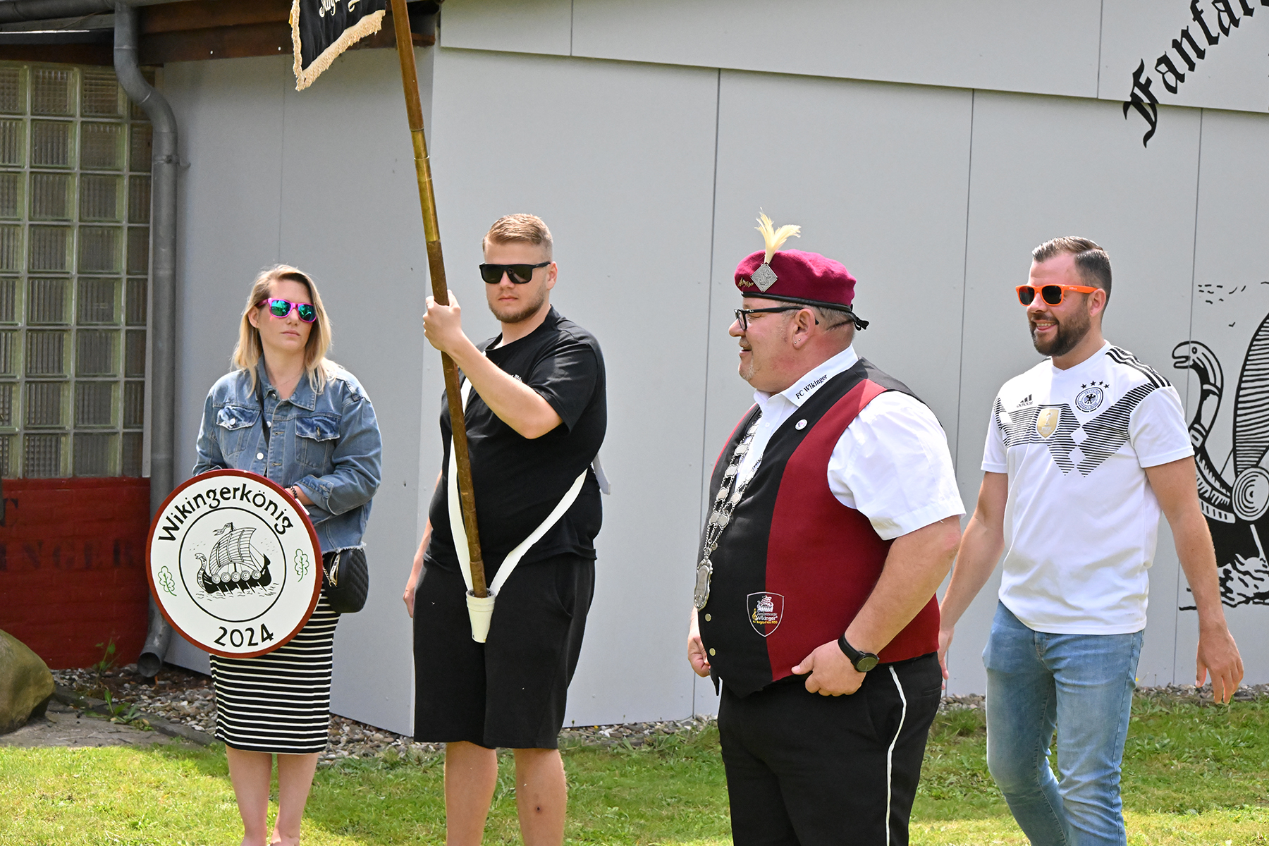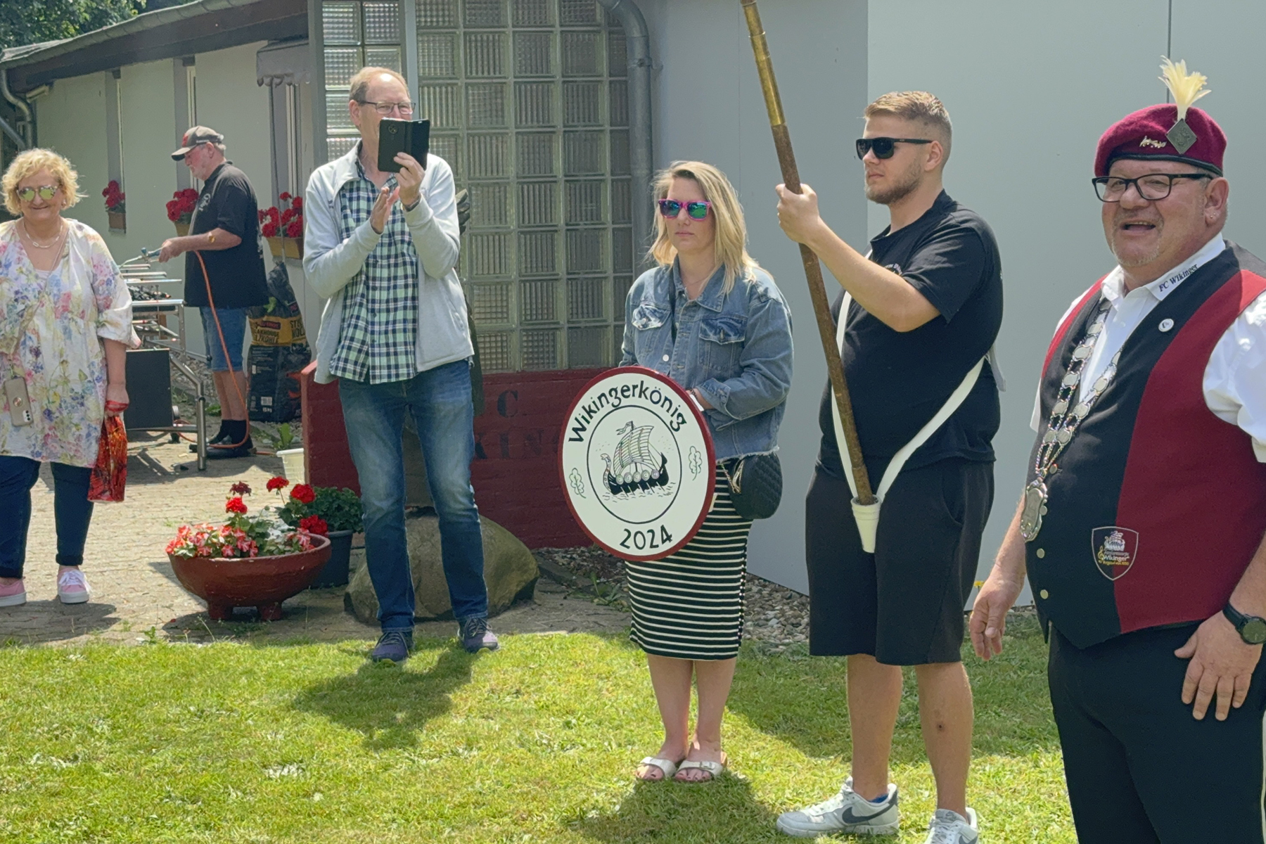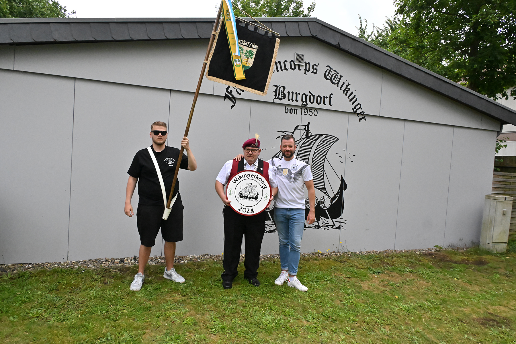 Mit der Unterstützung seiner Brüder, Neffen sowie der Rosenkönigin Christine Neumärker war am Wikingerheim in der Friederikenstraße am heutigen Sonnabend, 22. Juni 2024, alles für den Empfang des neuen Königs vorbereitet. Dieser hatte bereits am Donnerstag seine Königskette erhalten und bekam heute unter den Klängen des Präsentiermarsches seine Königsscheibe.