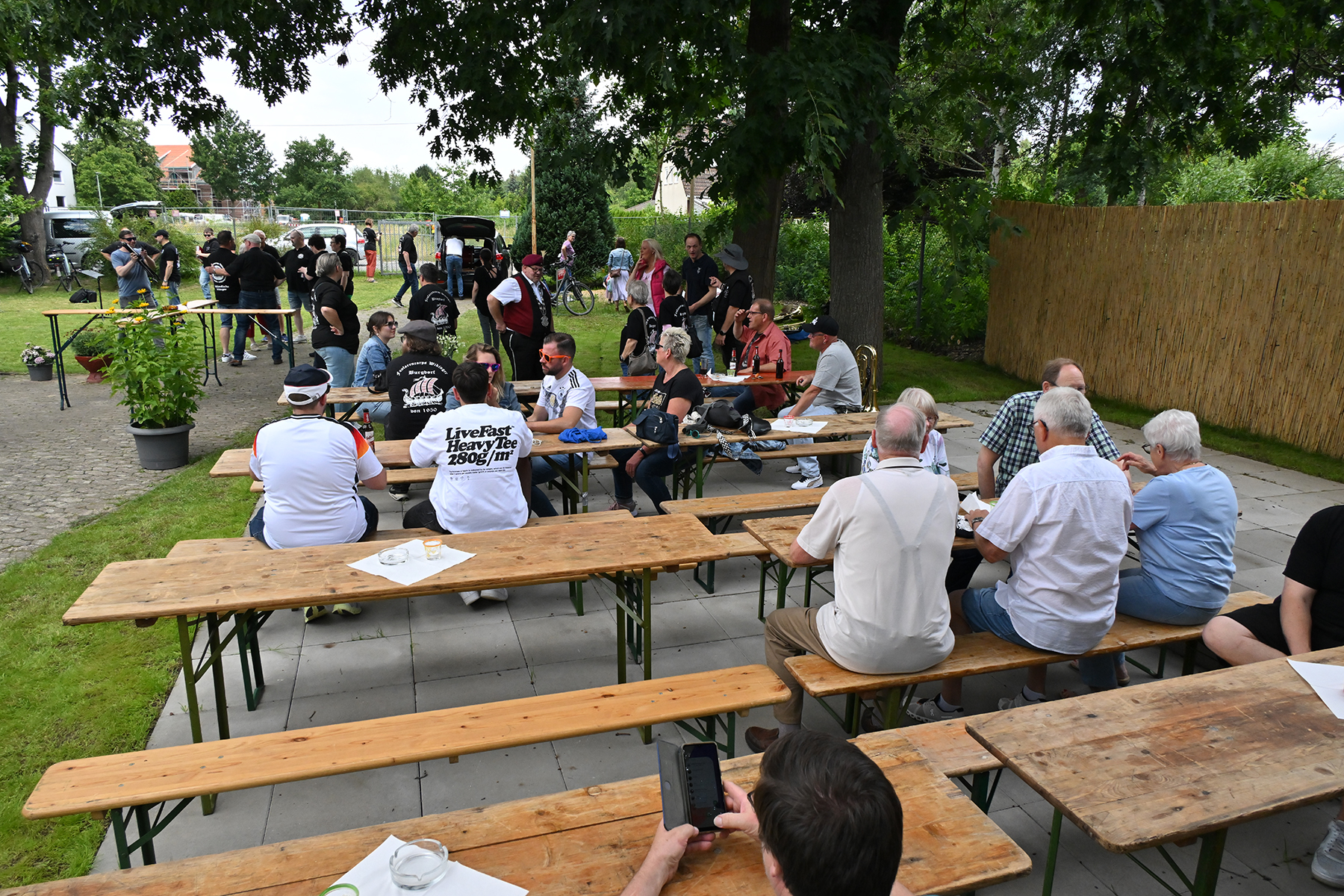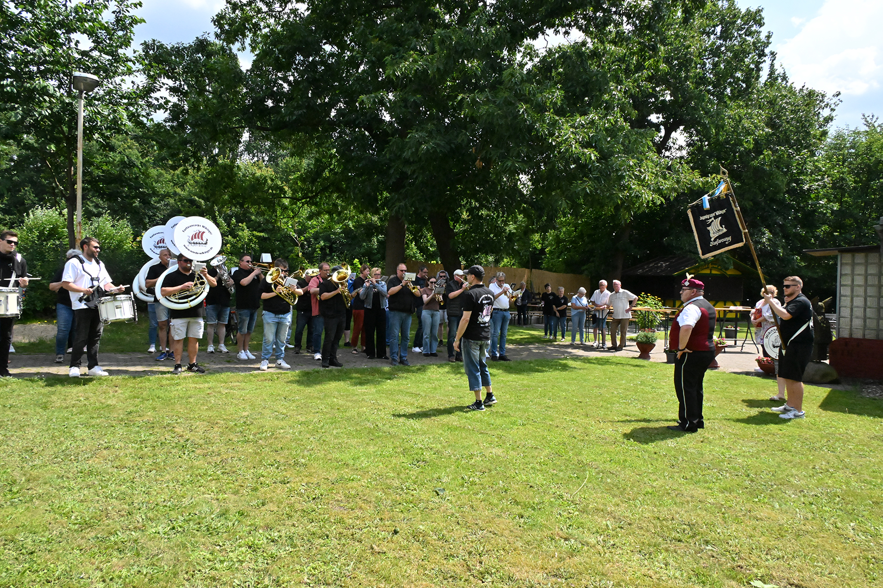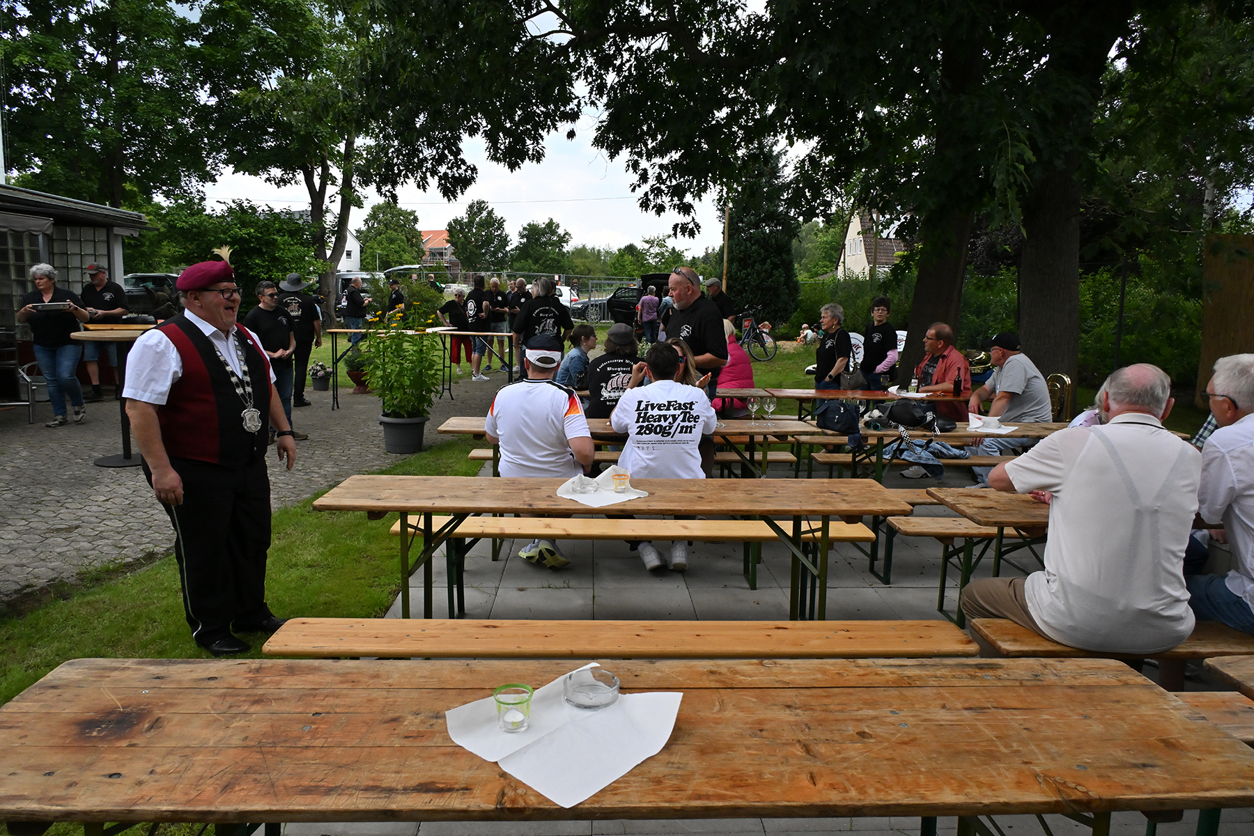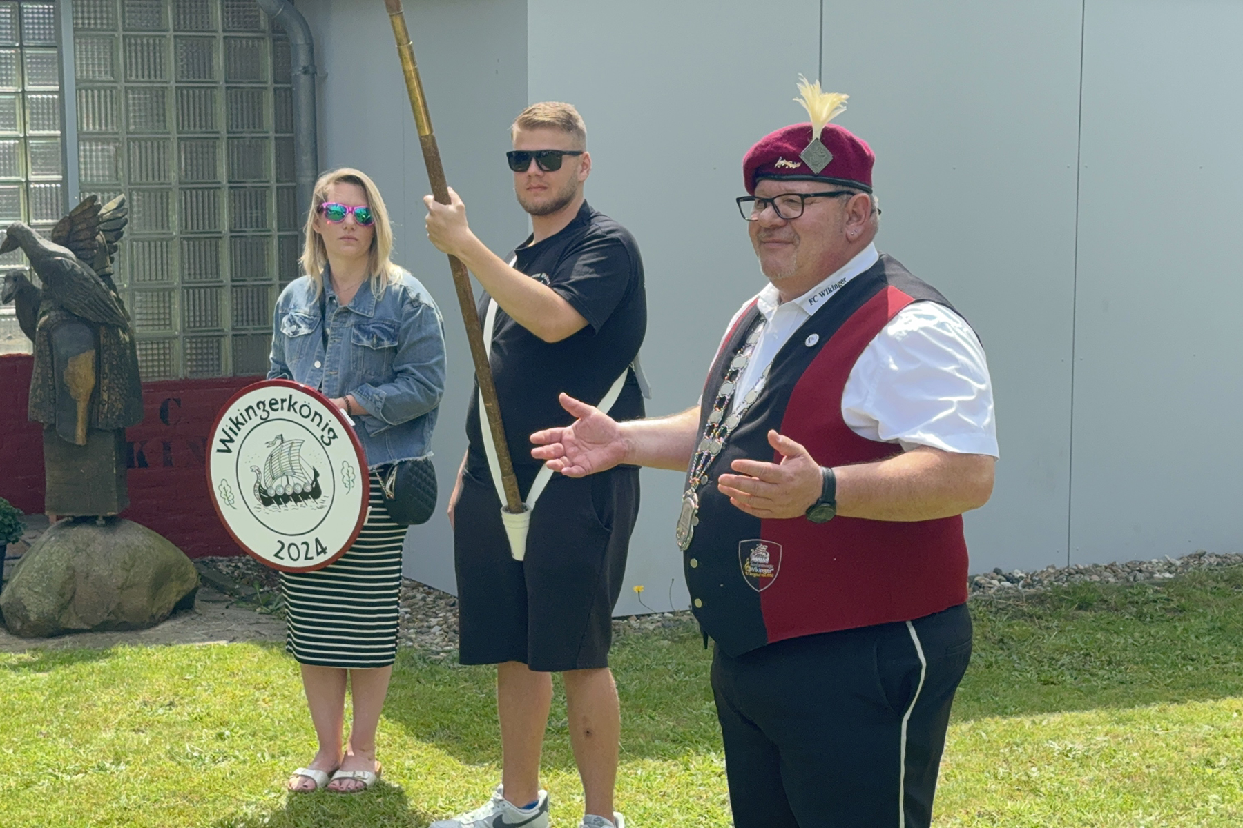 Mit der Unterstützung seiner Brüder, Neffen sowie der Rosenkönigin Christine Neumärker war am Wikingerheim in der Friederikenstraße am heutigen Sonnabend, 22. Juni 2024, alles für den Empfang des neuen Königs vorbereitet. Dieser hatte bereits am Donnerstag seine Königskette erhalten und bekam heute unter den Klängen des Präsentiermarsches seine Königsscheibe.