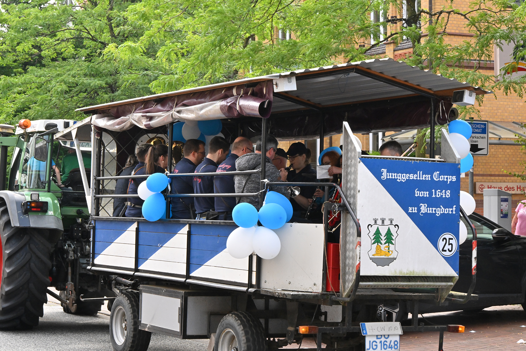 "Heute wie in jedem Jahr sind die Junggesellen da, um nach alter Tradition, Essen und Trinken abzuholn": Mit diesem Ausruf gingen auch in diesem Jahr die Junggesellen am Schützenfest-Sonnabendvormittag durch die Stadt, um ebendieses Essen und Trinken einzufordern. Bereits um 6:30 Uhr hatten sich die Mitglieder der Junggesellencorporation von 1648 zu Burgdorf beim Haar-Team Wadewitz in der Braunschweiger Straße eingefunden. Dort wurden sie entsprechend für ihre Tour kostümiert und vorbereitet.