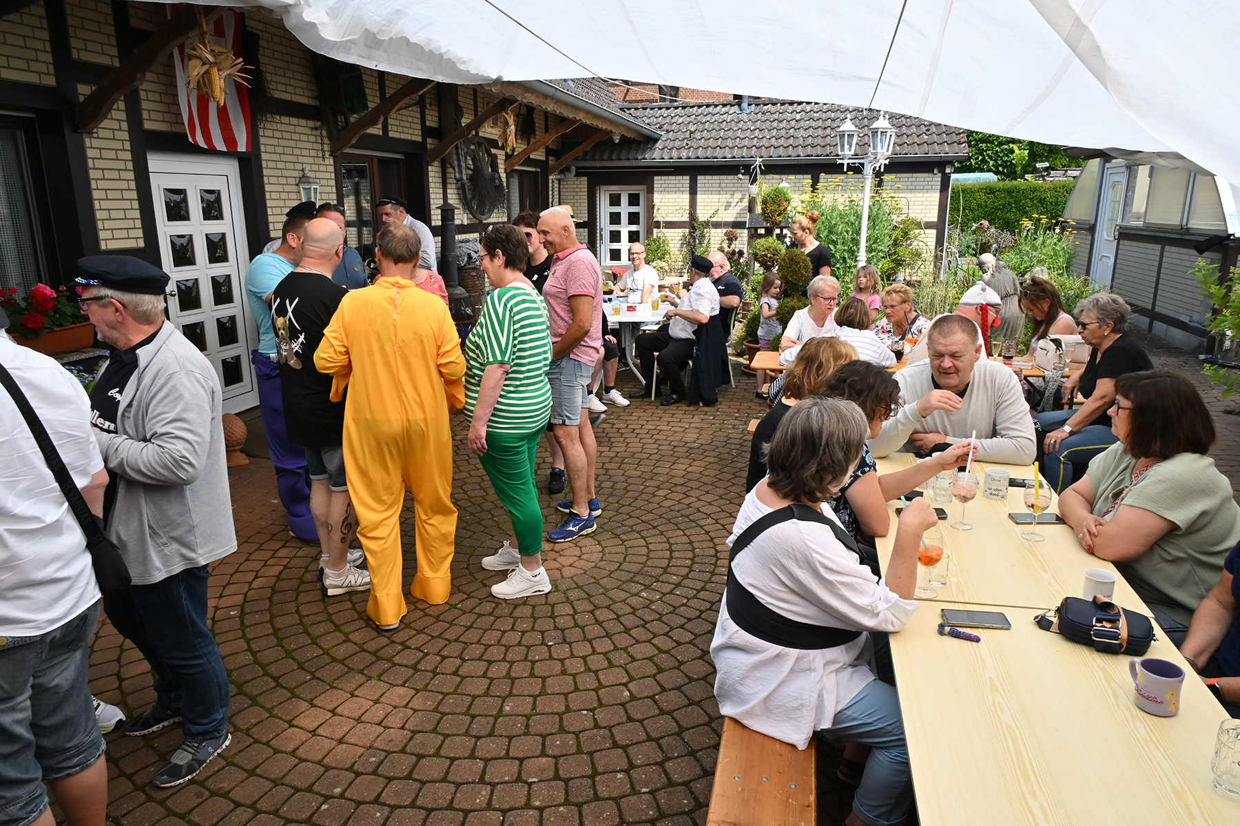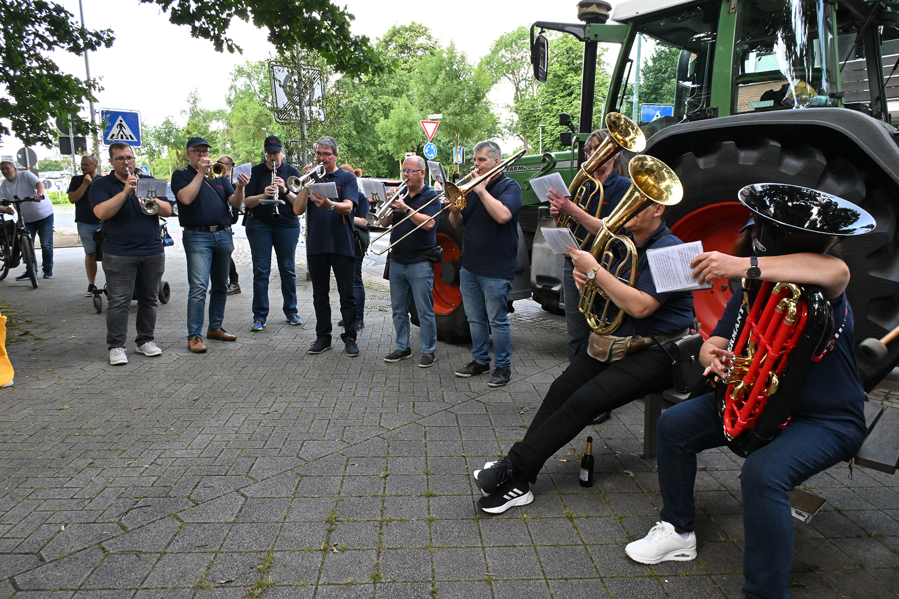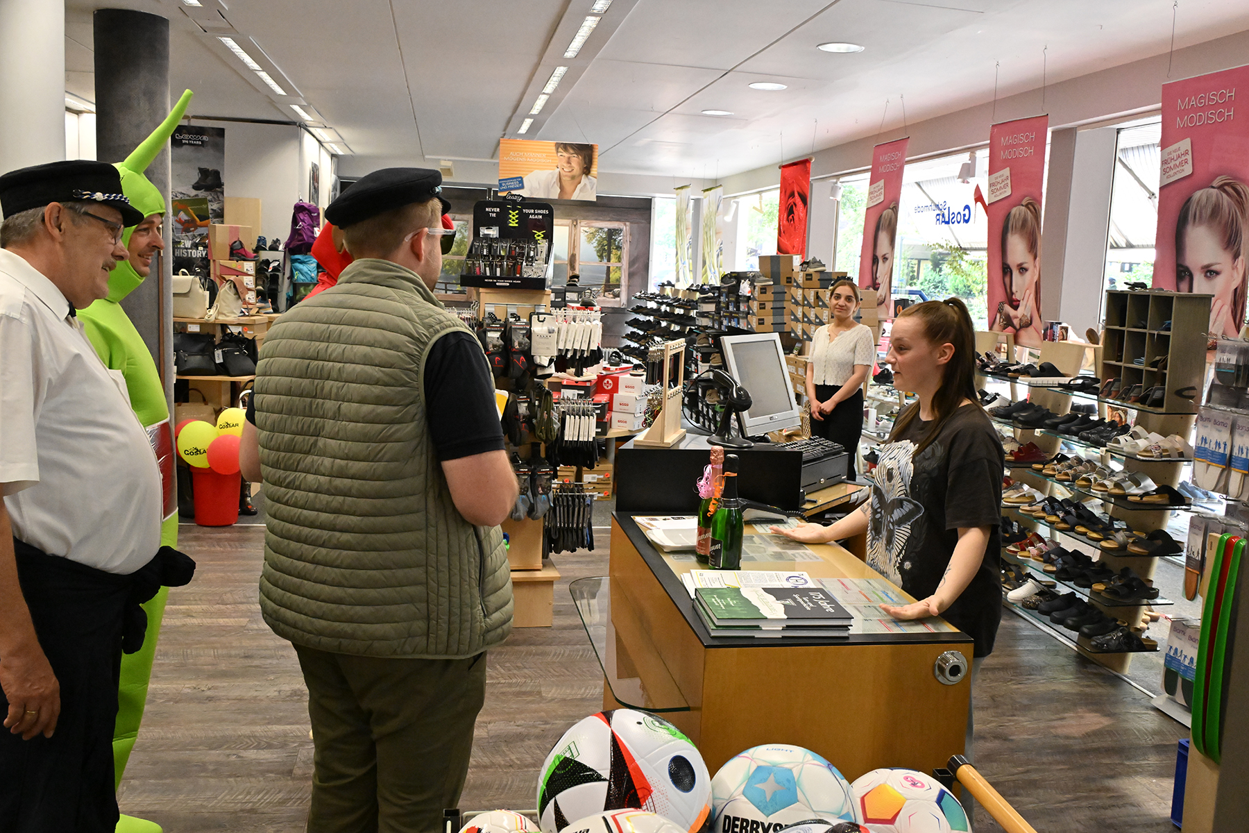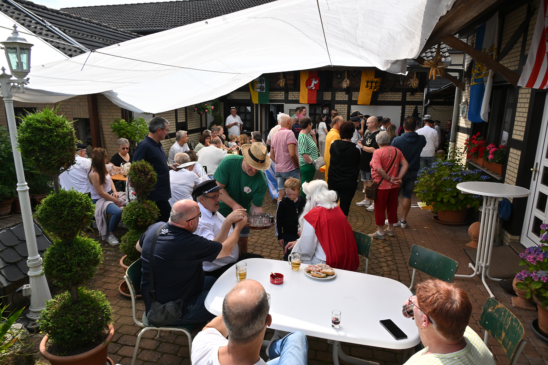 Nach einem Stärkungsstopp bei Familie Volkmann in der Wallgartenstraße mit entsprechenden Ständchen und Tänzchen ging es weiter in den westlichen Innenstadtbereich bis zum Kreisel an der Hochbrücke, zu Petrick Moden wie auch der Zurich-Agentur von Andreas Kanth. Zum Verweilen wurden Speis und Trank zugunsten der Junggesellen verkauft. Weiter ging es dann zum Bürgermeister, der die Junggesellen wie bereits im vergangenen Jahr zusammen mit seiner Frau in der Landratsvilla begrüßte. Auch in diesem Jahr wurden vorweg drei Runden durch den Kreisel an der Hochbrücke absolviert, ehe es nach wenigen Metern bereits auf das Gelände der Landratsvilla ging.