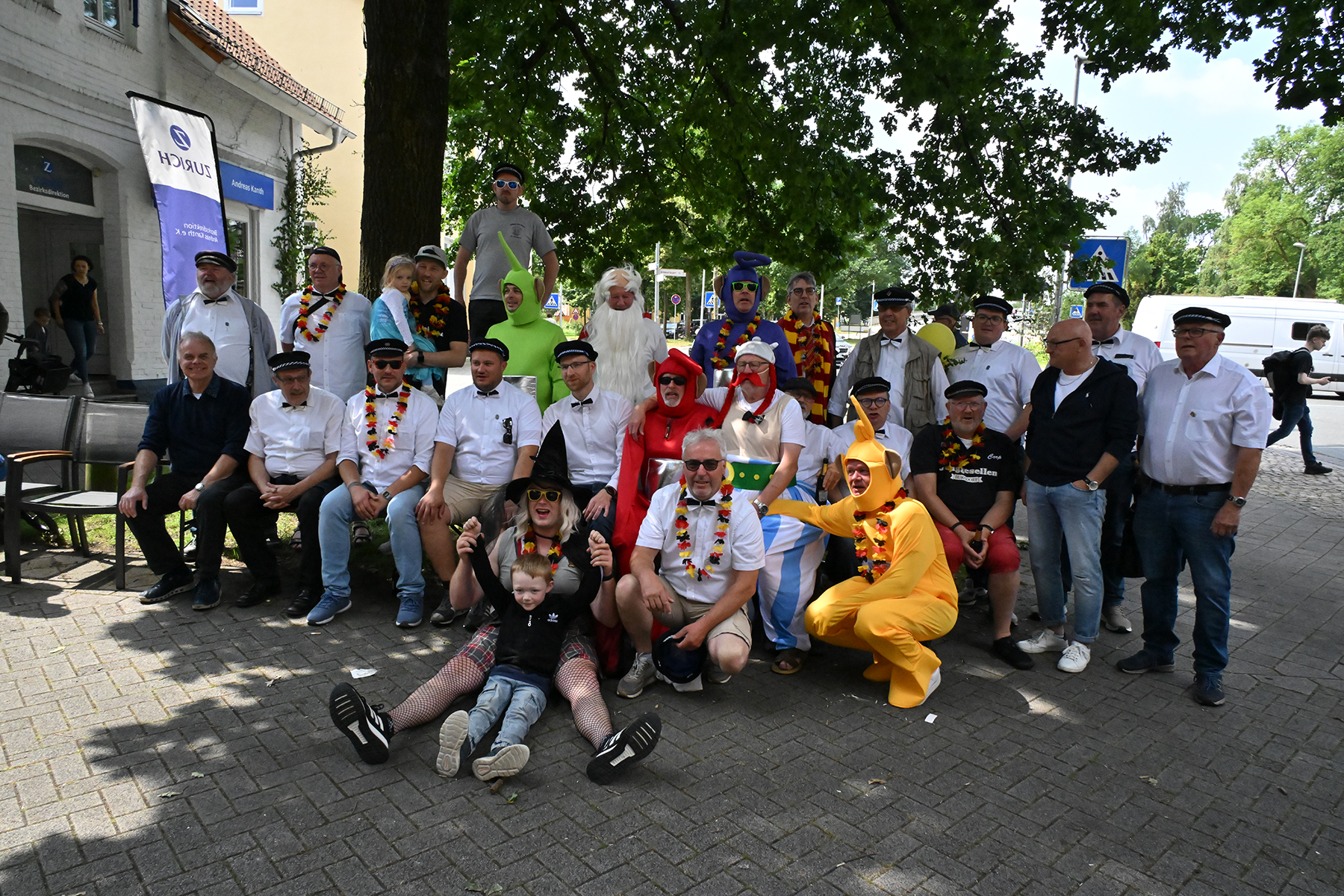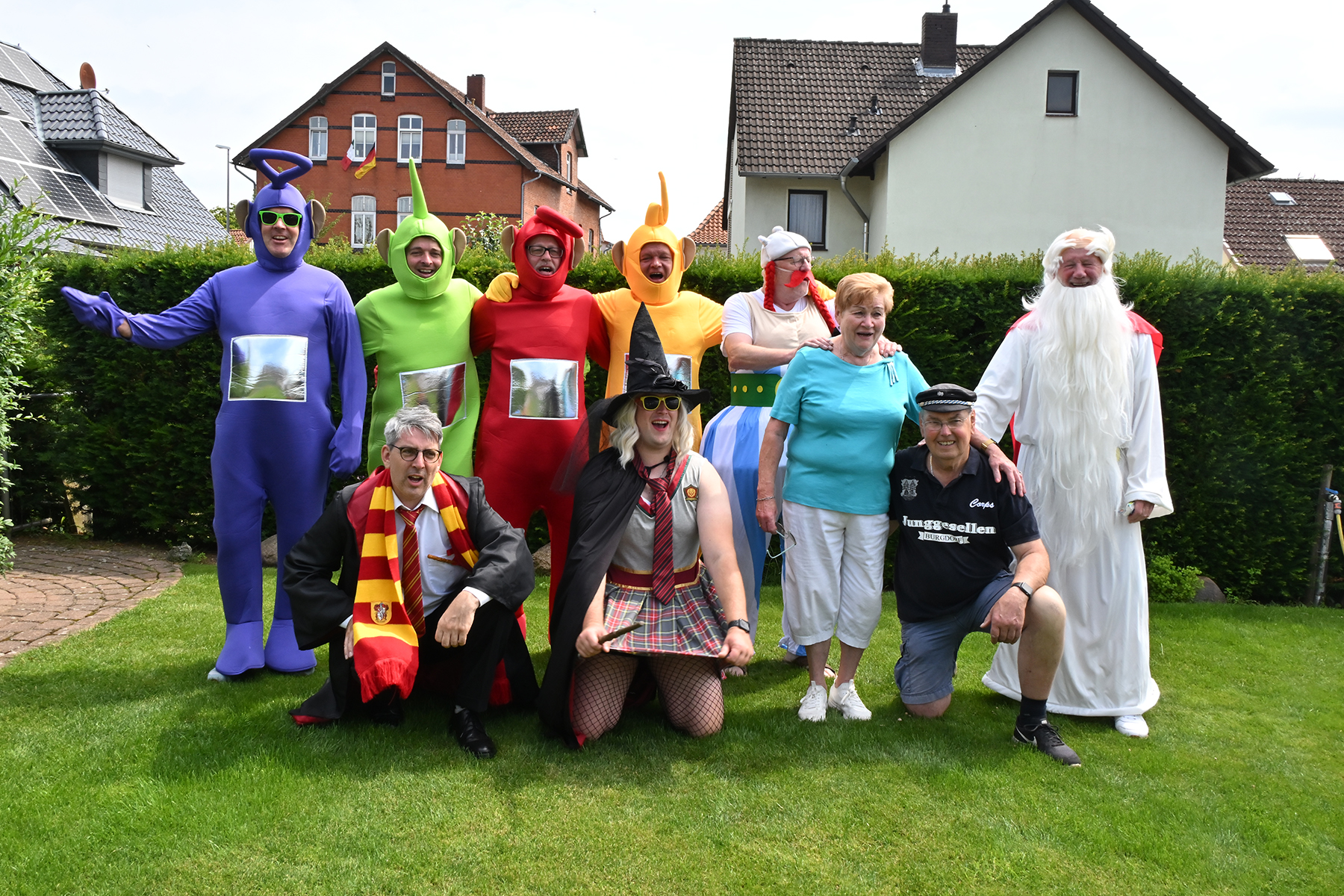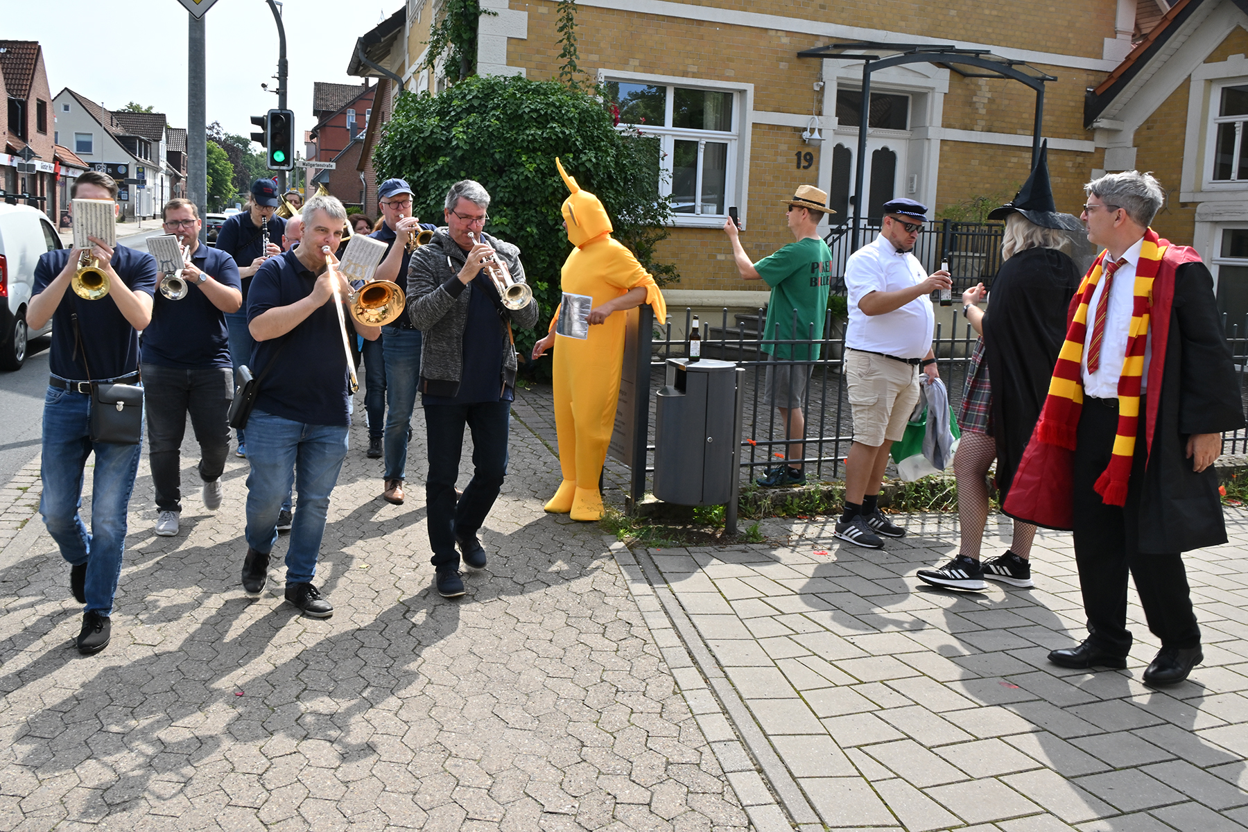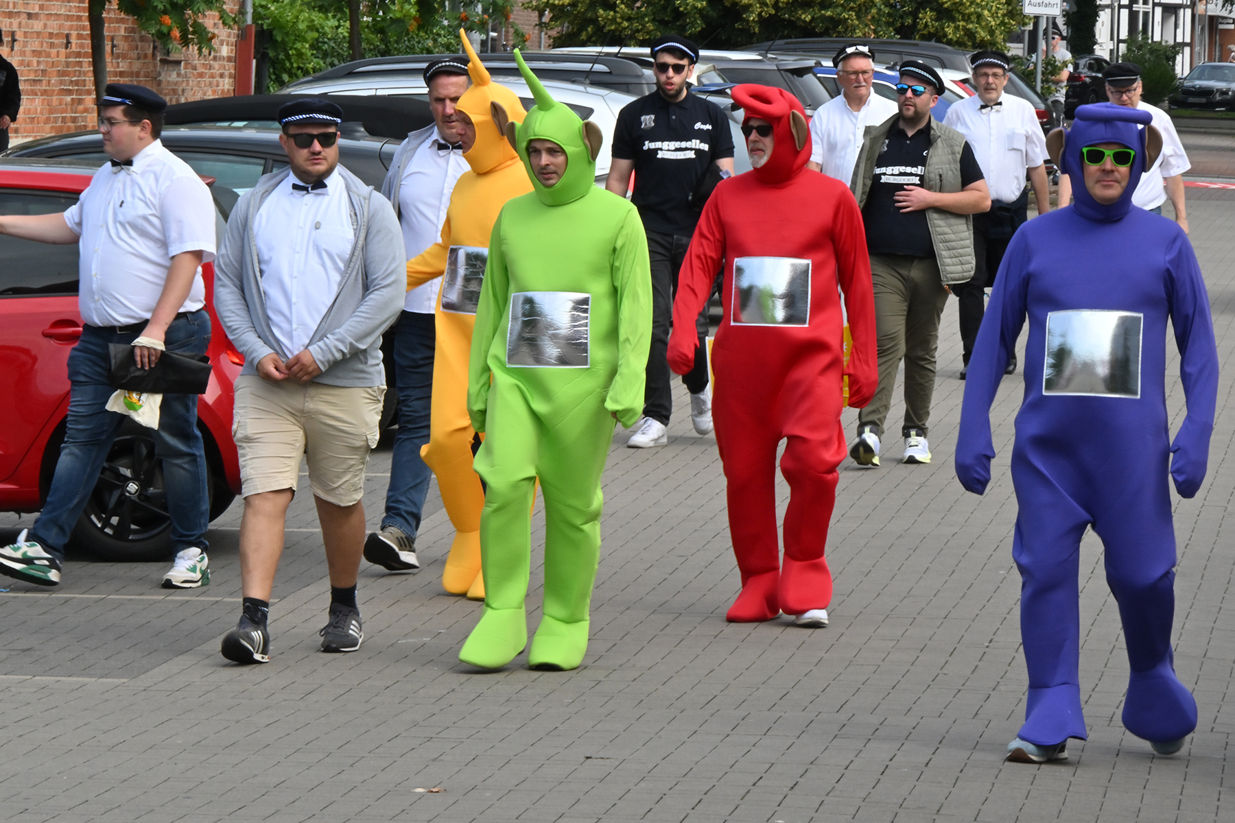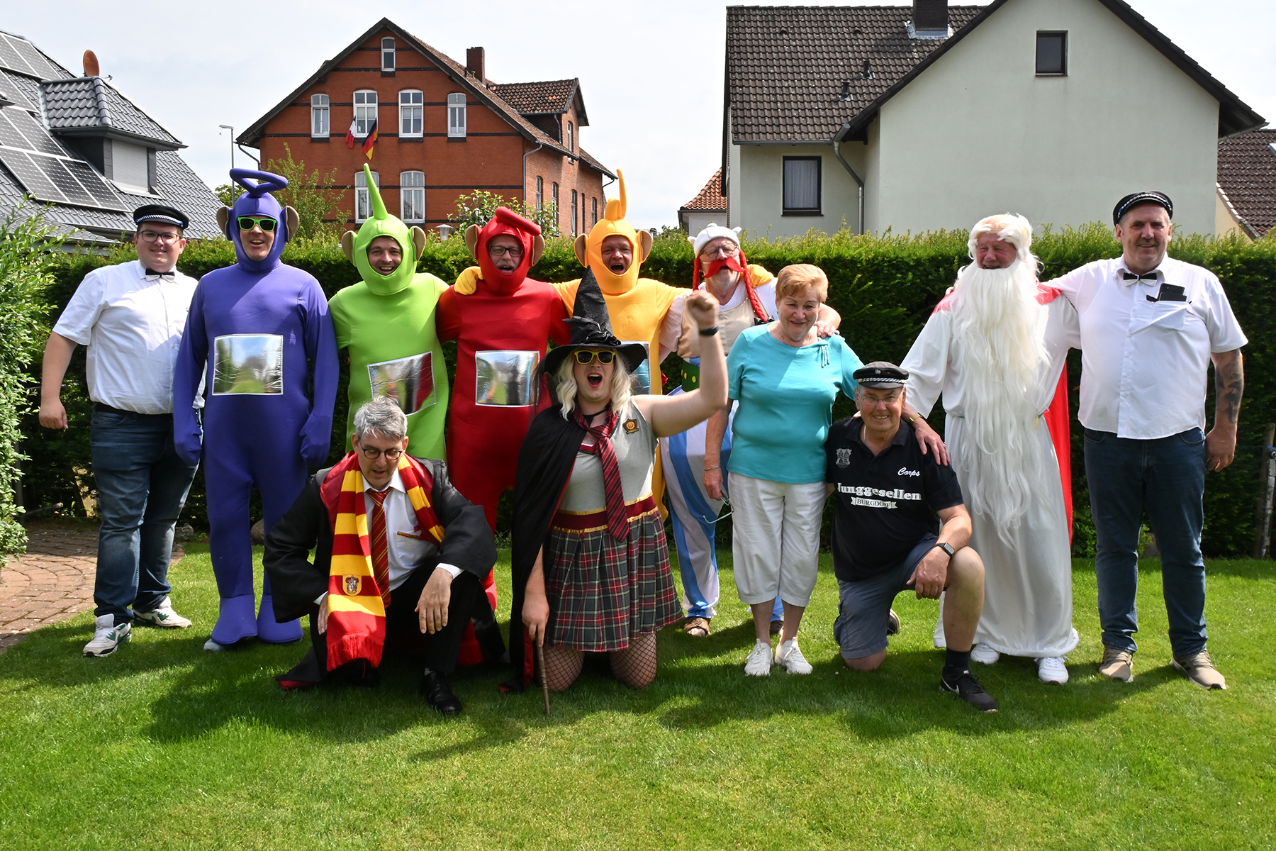 Um 7:45 Uhr starteten sie dann zu ihrer Tour durch die Stadt, um zu sammeln. Begleitet wurden die Junggesellen vom Musikzug der Freiwilligen Feuerwehr Misburg. Als Verkleidungen waren in diesem Jahr unter anderem Teletubbies und Harry Potter zu sehen, aber auch Obelix und Miraculix. Bei wechselndem Sonnenschein und warmen Temperaturen kamen auch schon die Junggesellen in ihren Kostümen ins Schwitzen.