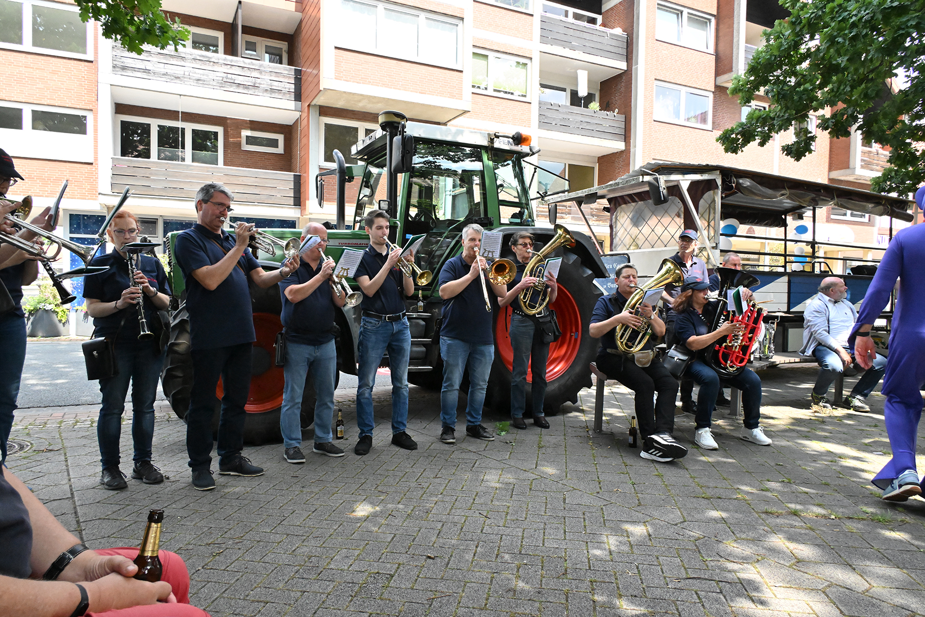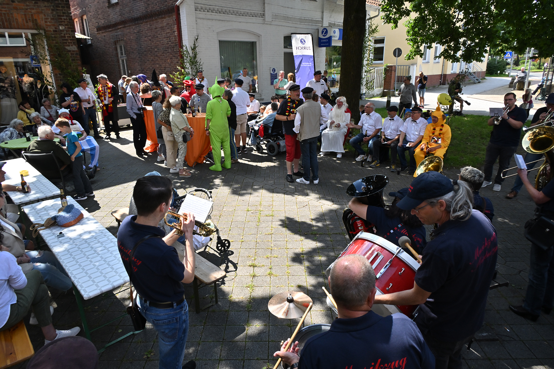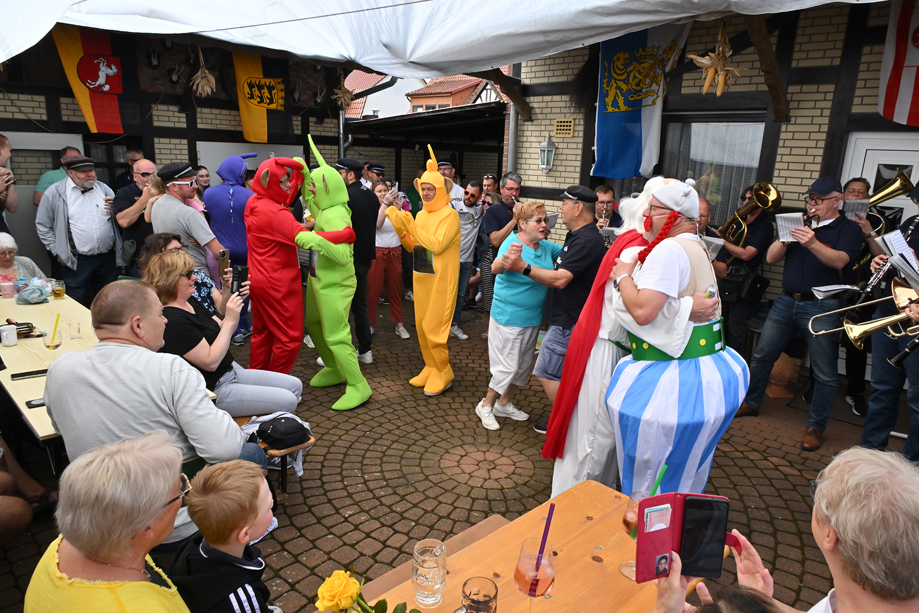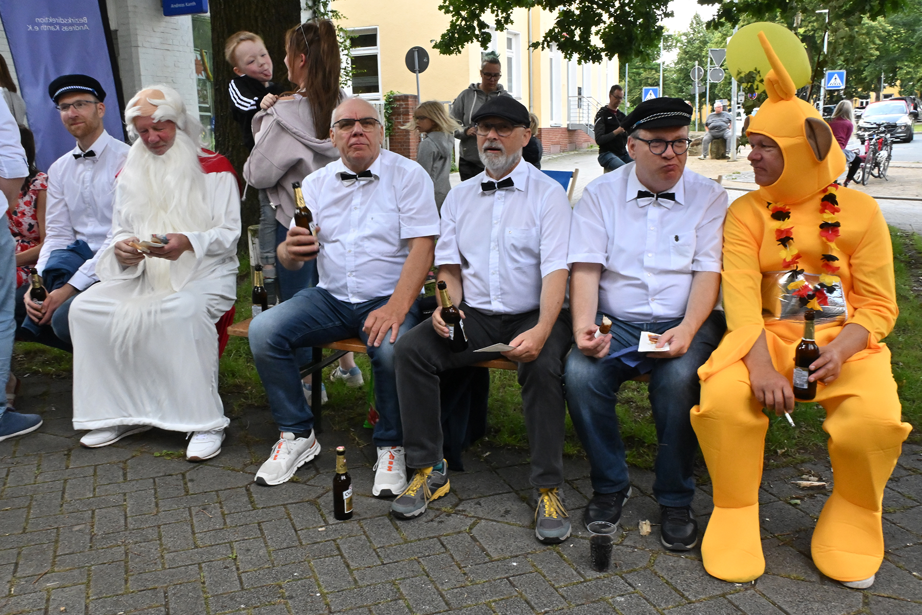 Um 7:45 Uhr starteten sie dann zu ihrer Tour durch die Stadt, um zu sammeln. Begleitet wurden die Junggesellen vom Musikzug der Freiwilligen Feuerwehr Misburg. Als Verkleidungen waren in diesem Jahr unter anderem Teletubbies und Harry Potter zu sehen, aber auch Obelix und Miraculix. Bei wechselndem Sonnenschein und warmen Temperaturen kamen auch schon die Junggesellen in ihren Kostümen ins Schwitzen.