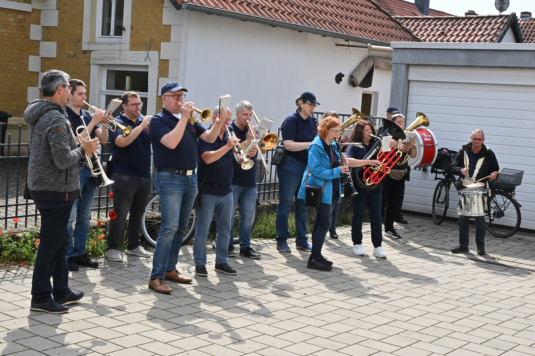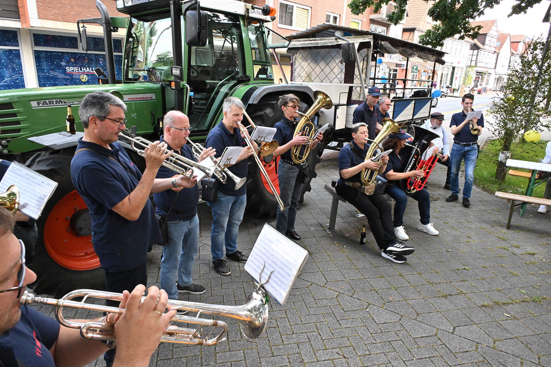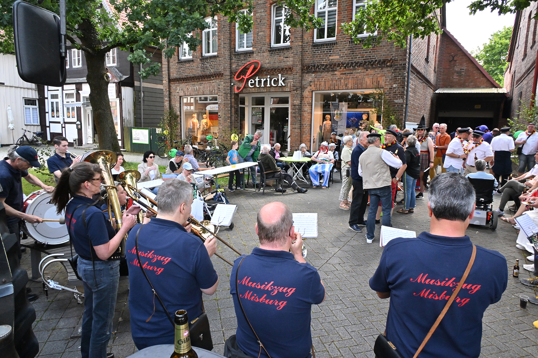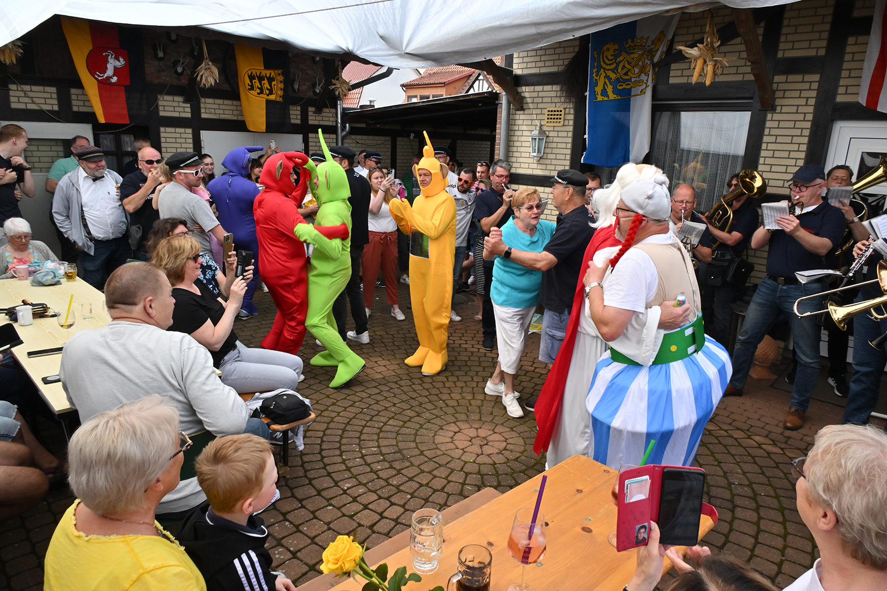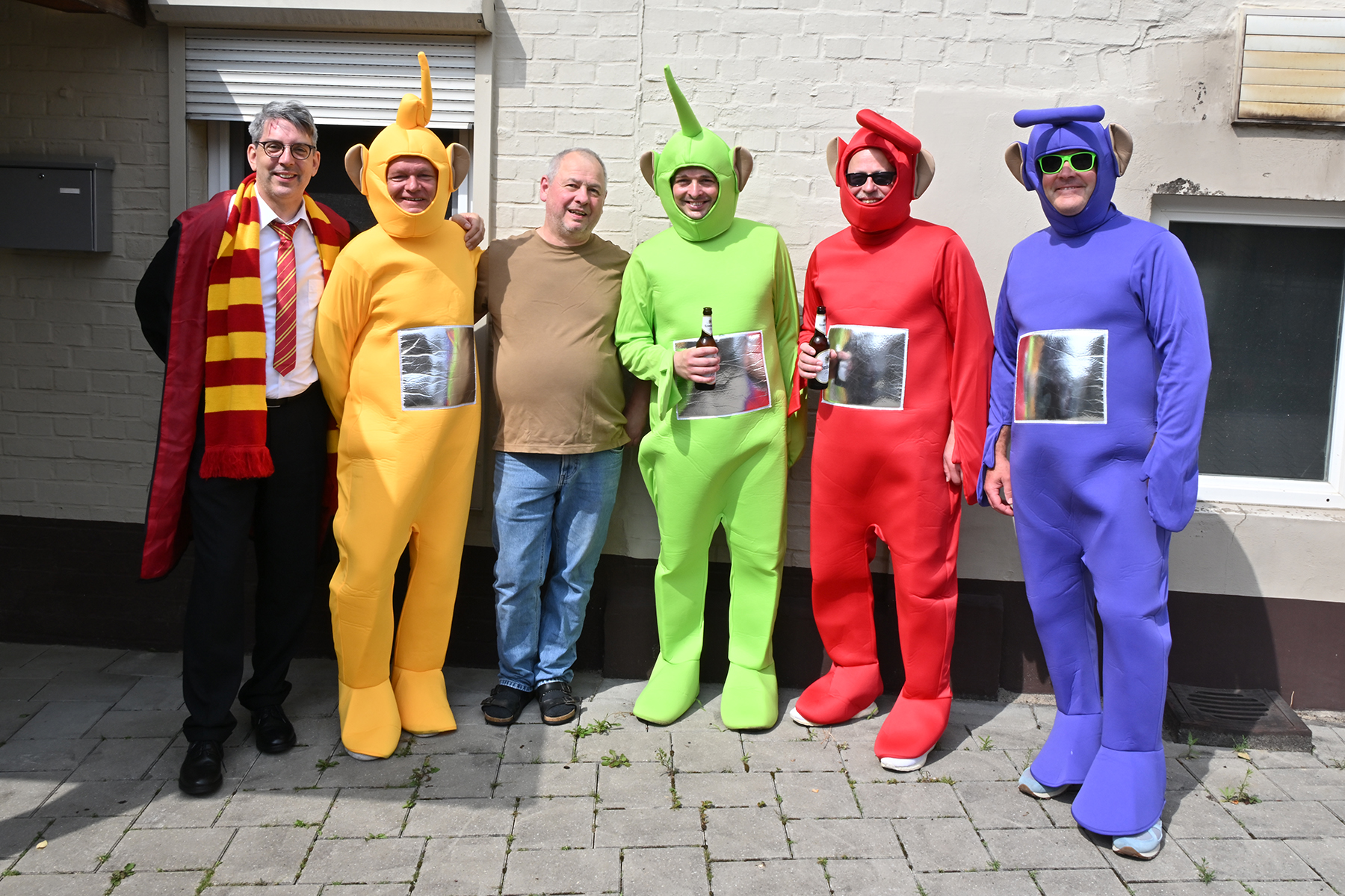 Um 7:45 Uhr starteten sie dann zu ihrer Tour durch die Stadt, um zu sammeln. Begleitet wurden die Junggesellen vom Musikzug der Freiwilligen Feuerwehr Misburg. Als Verkleidungen waren in diesem Jahr unter anderem Teletubbies und Harry Potter zu sehen, aber auch Obelix und Miraculix. Bei wechselndem Sonnenschein und warmen Temperaturen kamen auch schon die Junggesellen in ihren Kostümen ins Schwitzen.