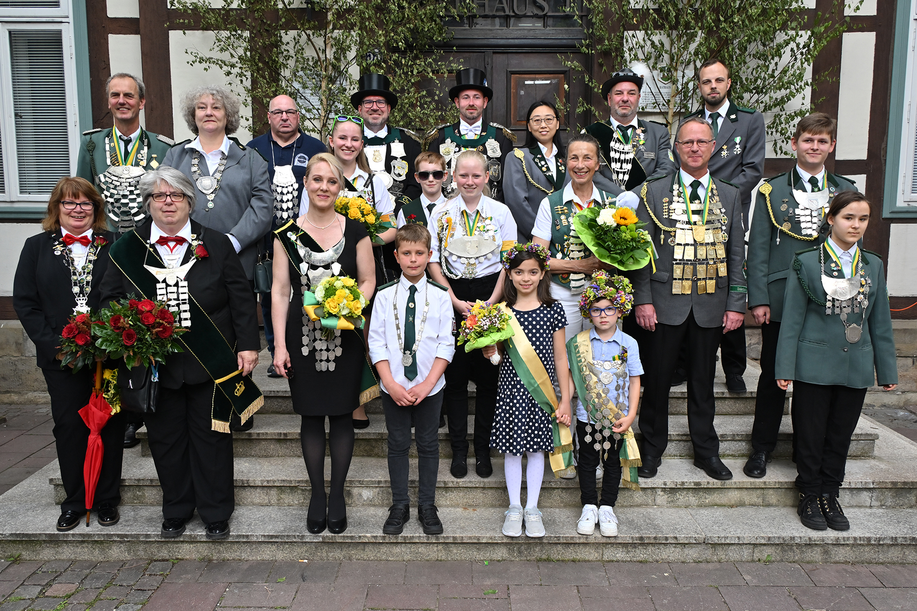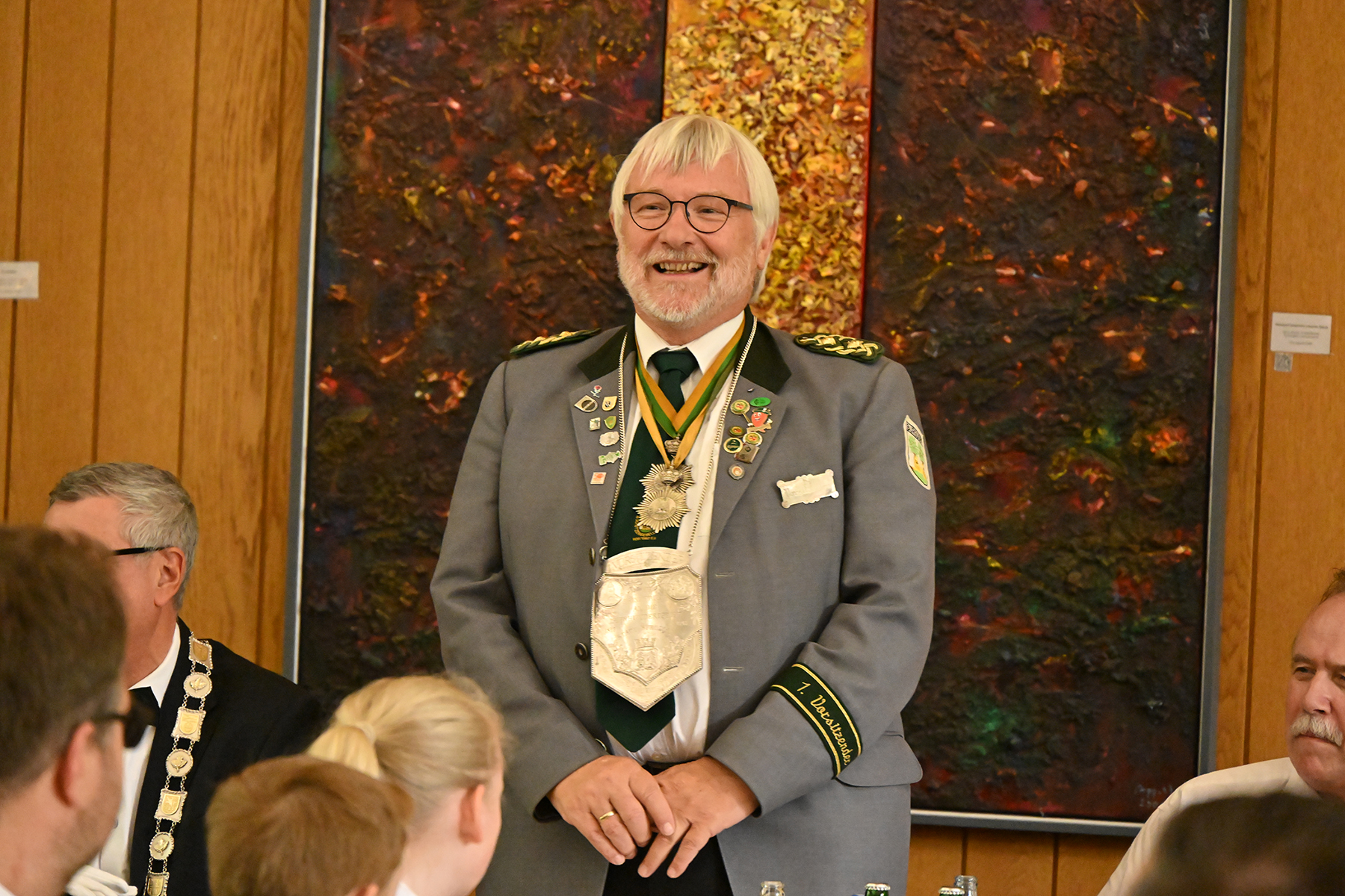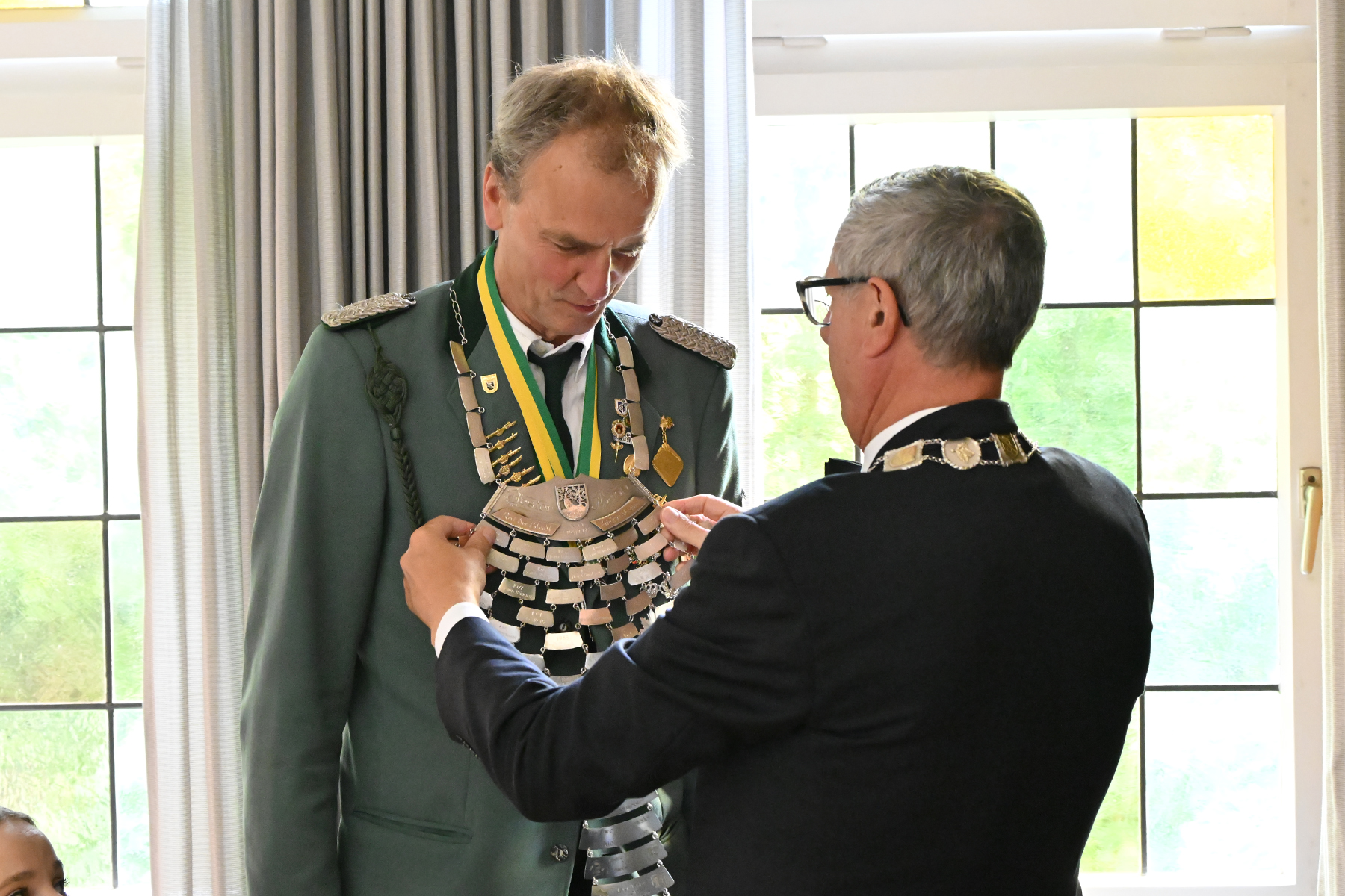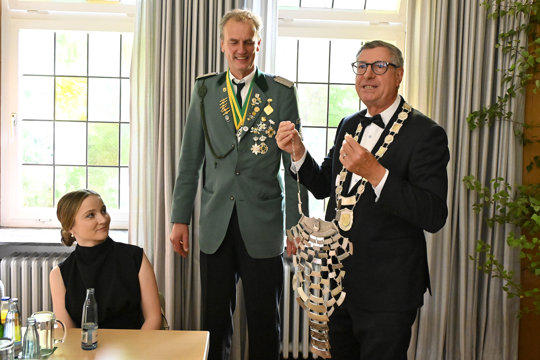 Zuvor hatte Burgdorfs Bürgermeister Armin Pollehn in den Saal des Burgdorfer Schlosses die Schützen und ihre Majestäten eingeladen. Vor rund 90 Gästen begrüßte er nicht nur die Könige und Kreiskönige, sondern auch die Bundestagsabgeordnete Rebecca Schamber und die Landtagsabgeordnete Thordies Hanisch sowie Ratsmitglieder und den Präsidenten des Kreisschützenverbandes, Werner Bösche. Der Bürgermeister freute sich, dass alle Majestäten anwesend sind, und gratulierte ihnen zu ihrer Krönung. "Es ist ein sehr gelungenes Schützenfest", betonte der Bürgermeister. Es sei friedlich abgelaufen und auch habe sich niemand wegen der Lautstärke beschwert. Das Burgdorfer Schützenfest trage positiv zum Image der Stadt bei, betonte er. Er konnte am heutigen Sonntag noch eine Ehrung nachholen. Cord-Heinrich Schweer erhielt heute die Ratskette und auch Juniorenkönigin Rieke Hansen, die am Freitag bei der Proklamation nicht anwesend war, wurde nun ihre Kette überreicht, sodass alle Majestäten vor dem Umzug mit ihren Insignien ausgestattet worden waren.