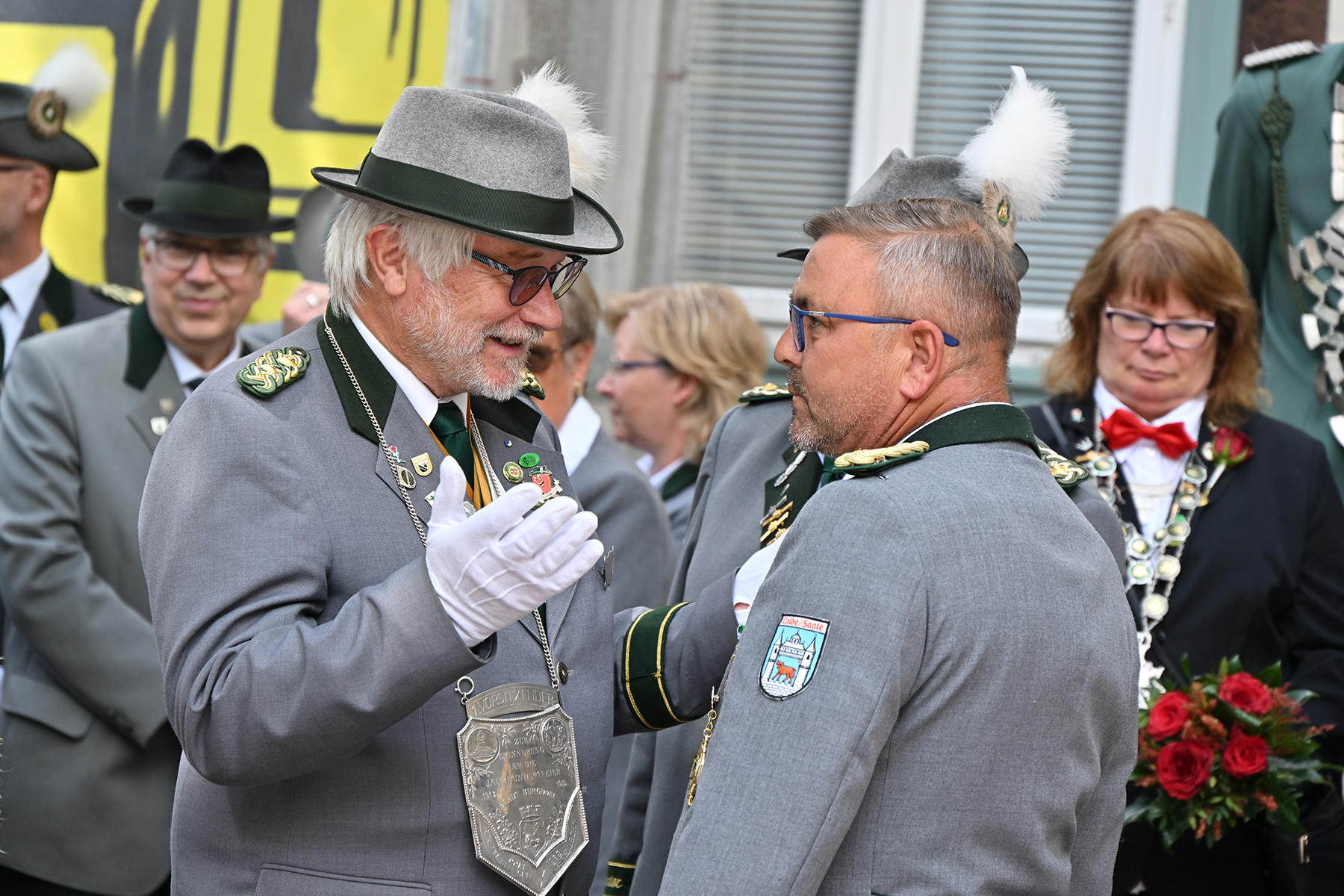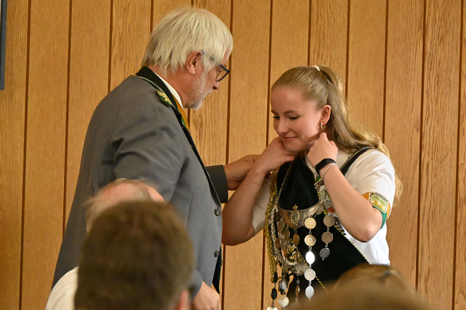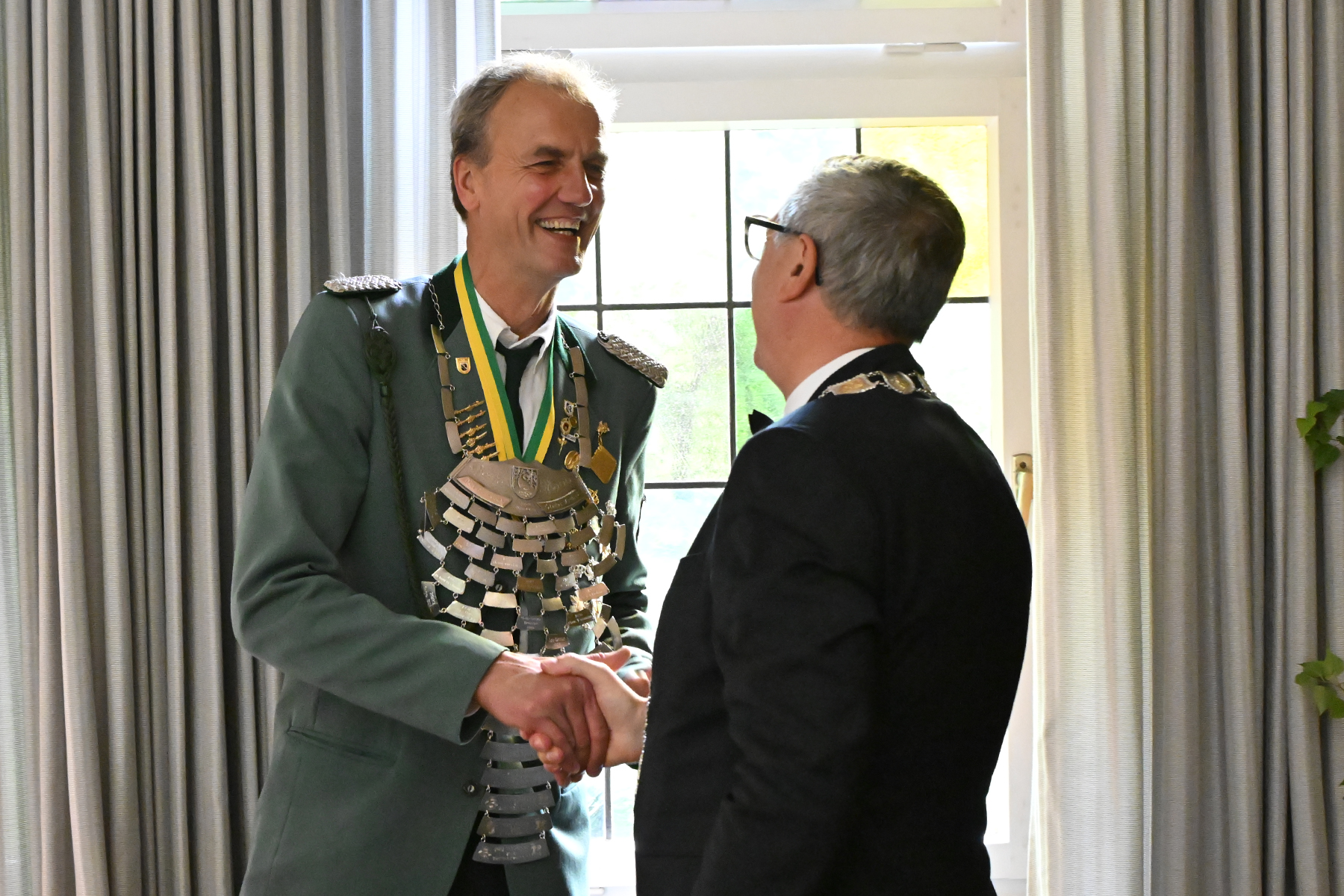 Zuvor hatte Burgdorfs Bürgermeister Armin Pollehn in den Saal des Burgdorfer Schlosses die Schützen und ihre Majestäten eingeladen. Vor rund 90 Gästen begrüßte er nicht nur die Könige und Kreiskönige, sondern auch die Bundestagsabgeordnete Rebecca Schamber und die Landtagsabgeordnete Thordies Hanisch sowie Ratsmitglieder und den Präsidenten des Kreisschützenverbandes, Werner Bösche. Der Bürgermeister freute sich, dass alle Majestäten anwesend sind, und gratulierte ihnen zu ihrer Krönung. "Es ist ein sehr gelungenes Schützenfest", betonte der Bürgermeister. Es sei friedlich abgelaufen und auch habe sich niemand wegen der Lautstärke beschwert. Das Burgdorfer Schützenfest trage positiv zum Image der Stadt bei, betonte er. Er konnte am heutigen Sonntag noch eine Ehrung nachholen. Cord-Heinrich Schweer erhielt heute die Ratskette und auch Juniorenkönigin Rieke Hansen, die am Freitag bei der Proklamation nicht anwesend war, wurde nun ihre Kette überreicht, sodass alle Majestäten vor dem Umzug mit ihren Insignien ausgestattet worden waren.