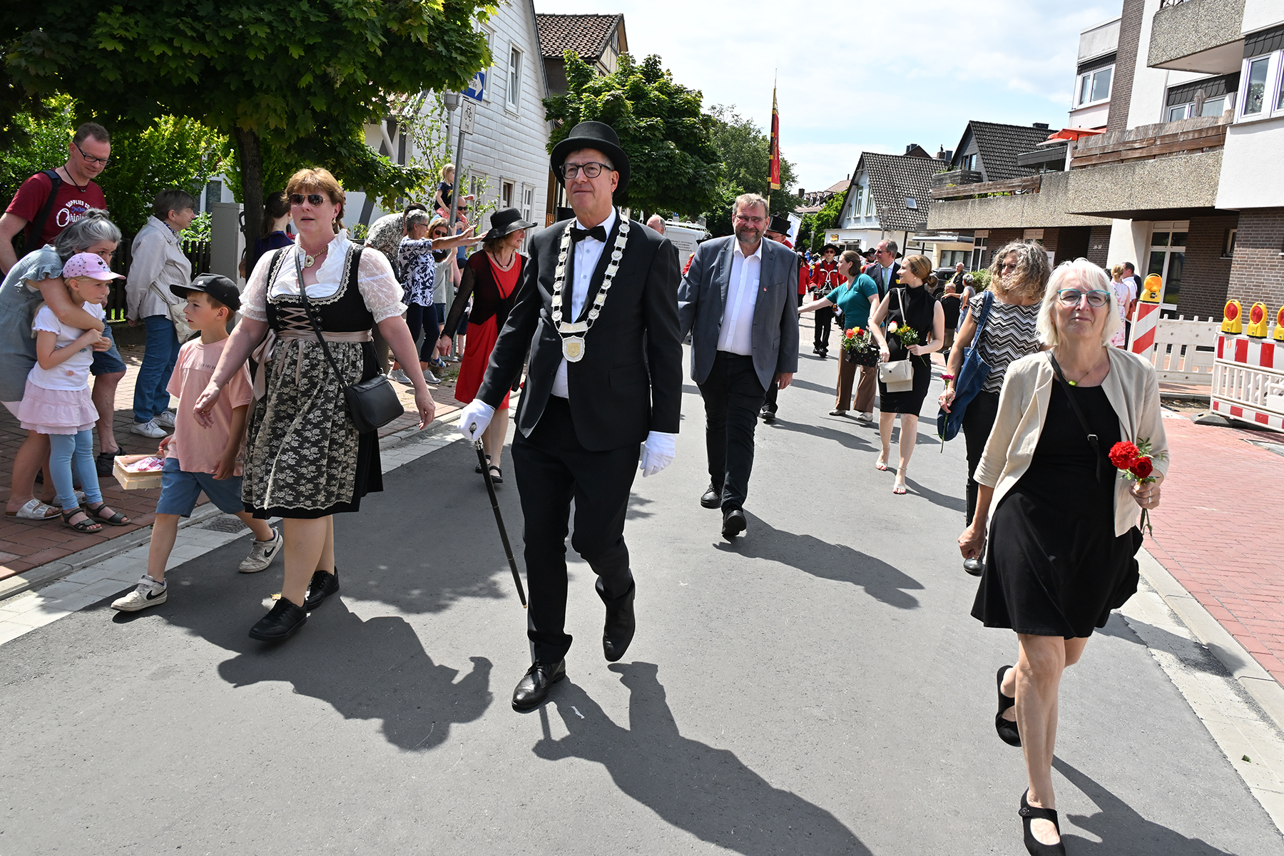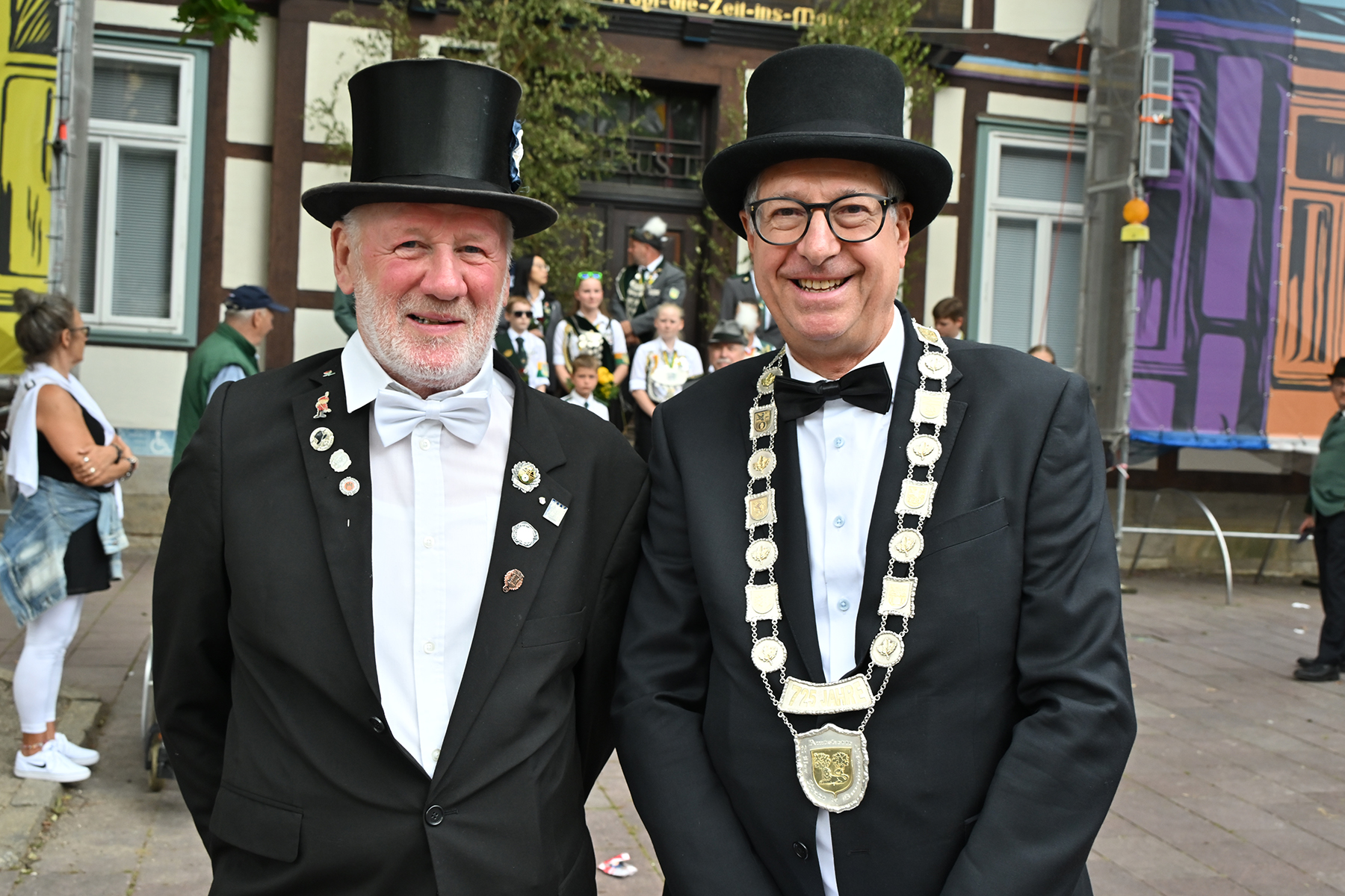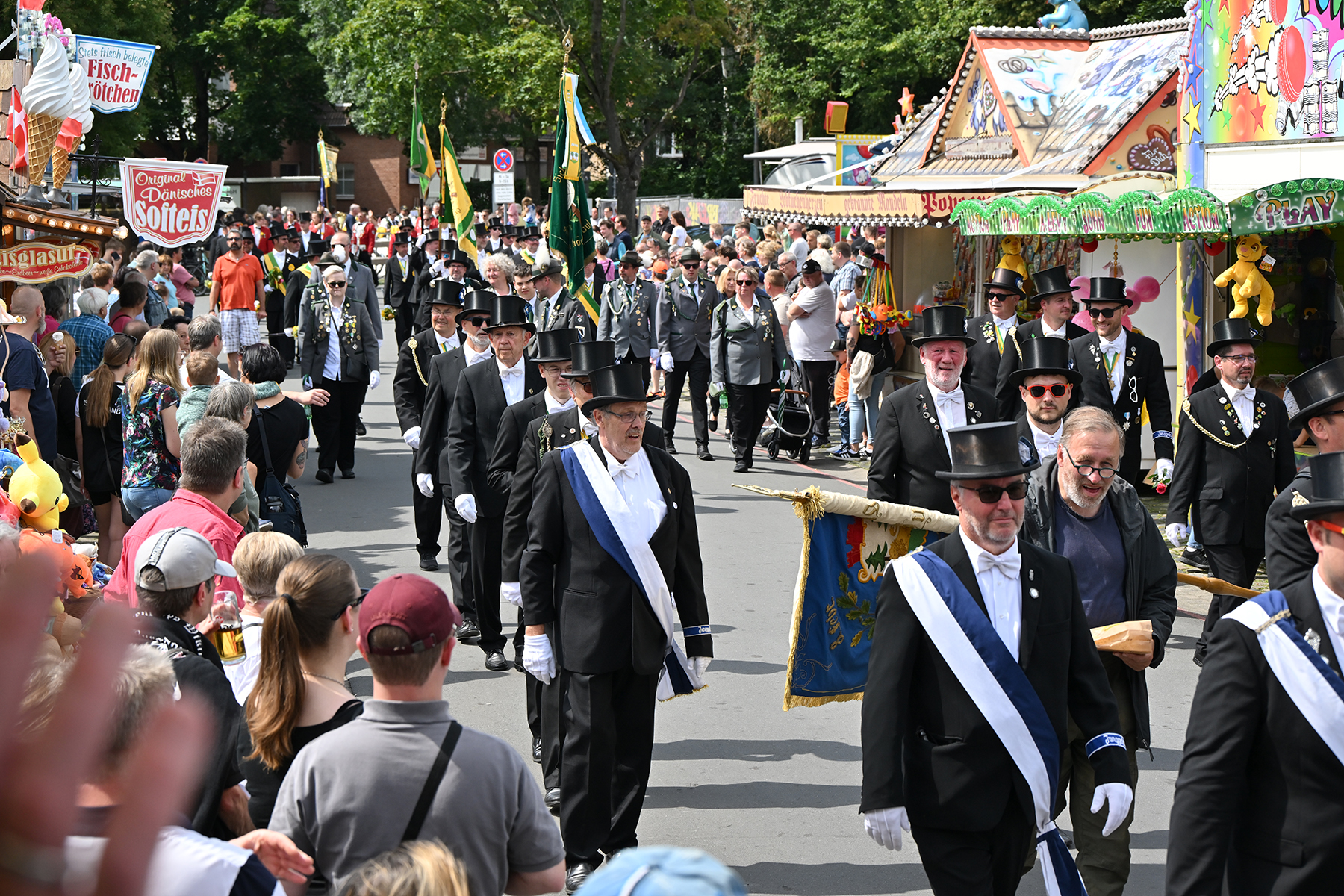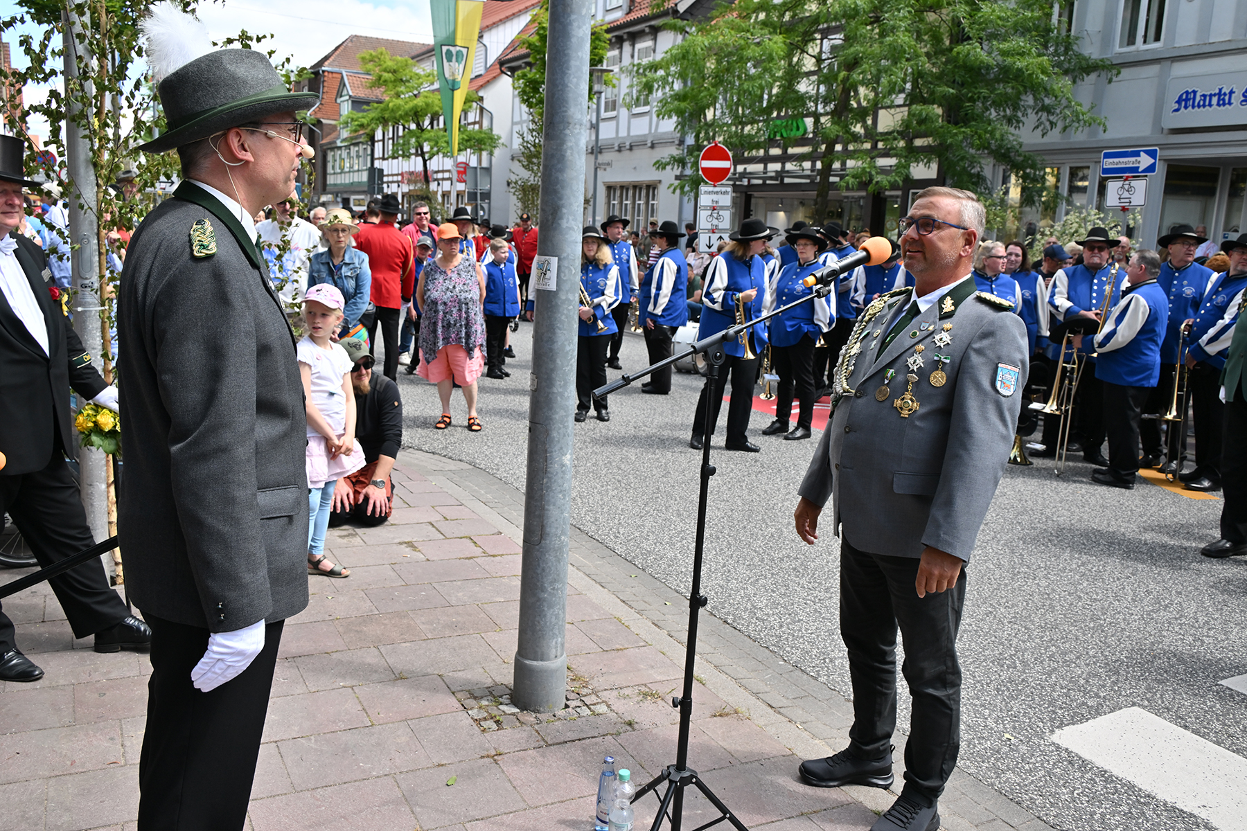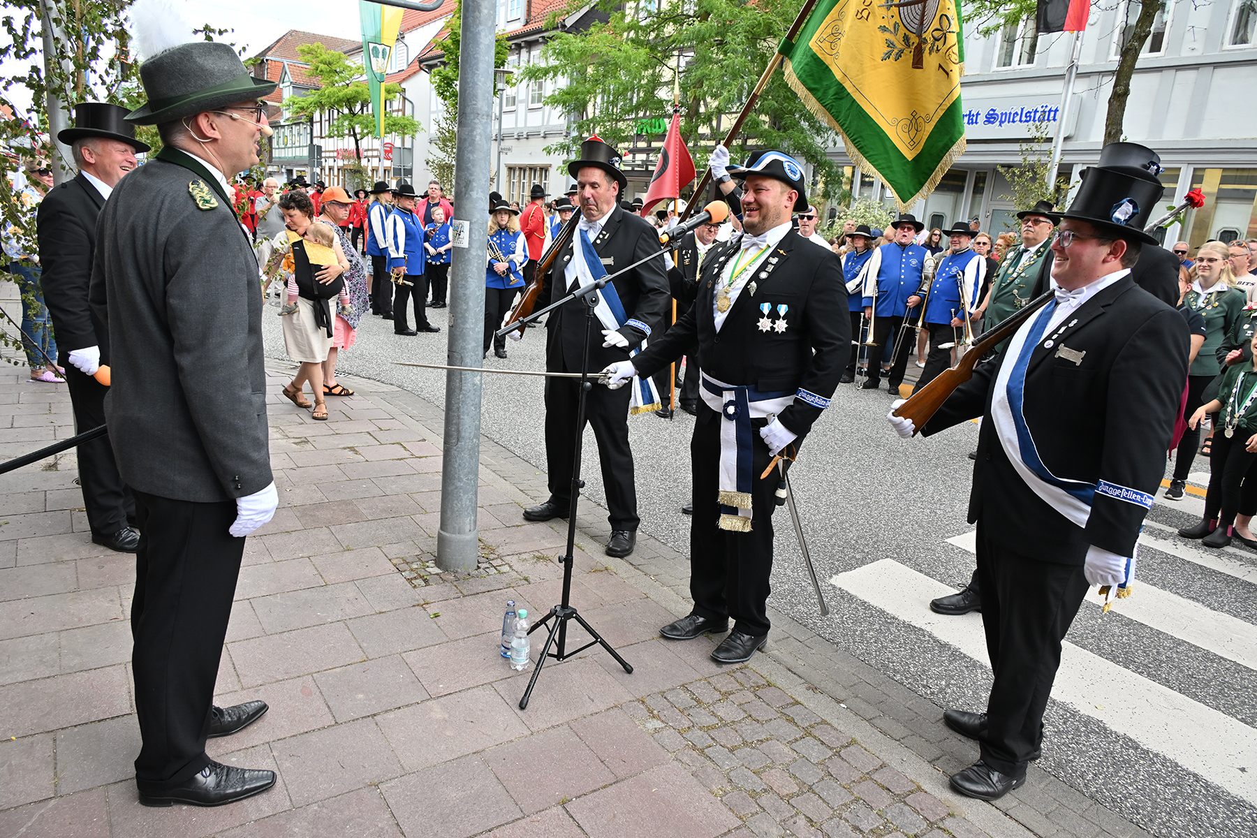 Eine besondere Ehre war es dem Schützen-Vorsitzenden Jörg Hoppe, dass auch wieder eine Abordnung vom befreundeten Schützenverein aus Calbe (Saale) nach Burgdorf gekommen war. "Es ist mir eine Freude, dass die Calbenser zu uns kommen und beim Umzug mitmachen", so Jörg Hoppe. Er freute sich zudem, dass das Schützenfest weiterhin gut angenommen werde. Rund 900 Gäste kamen zum gestrigen Festball ins Festzelt. Auch der Festplatz sei gut besucht gewesen. "Wir haben alles dafür getan, ein gelungenes Schützenfest zu feiern", unterstrich er.
