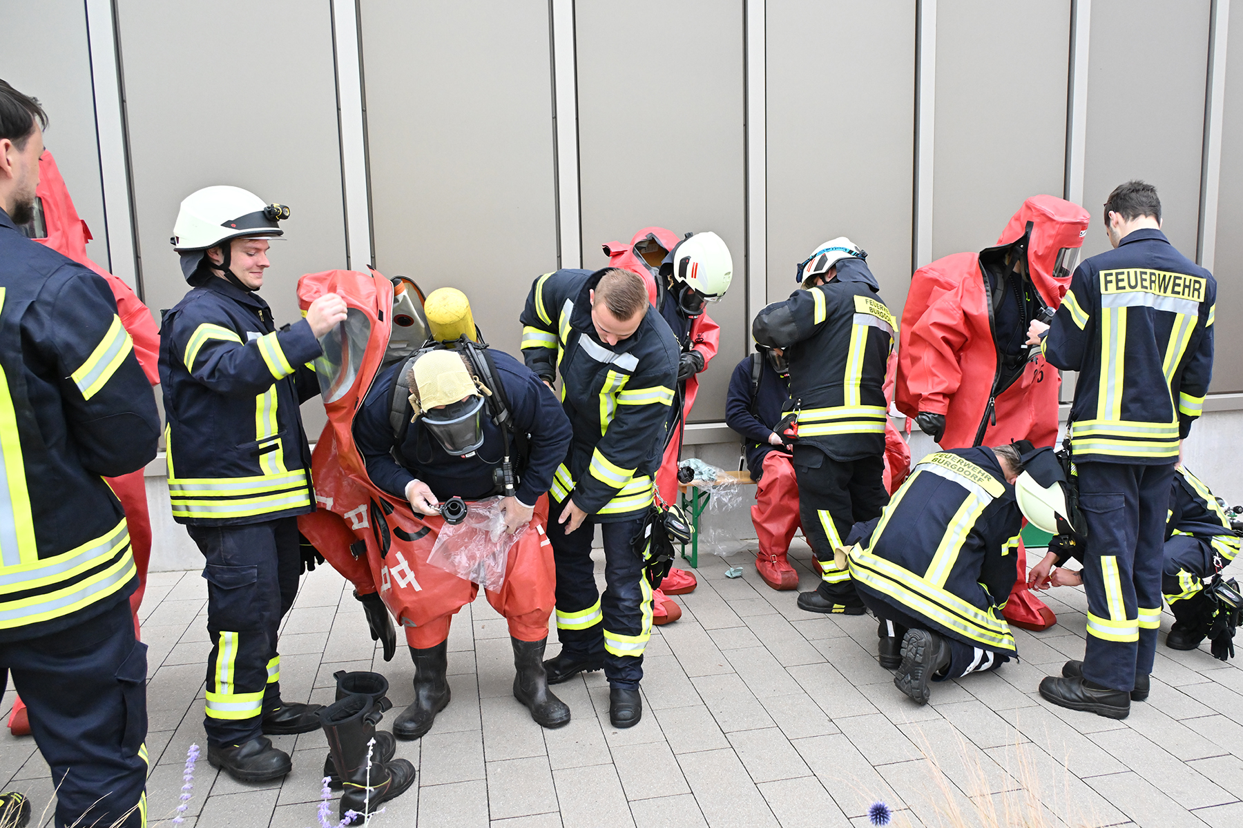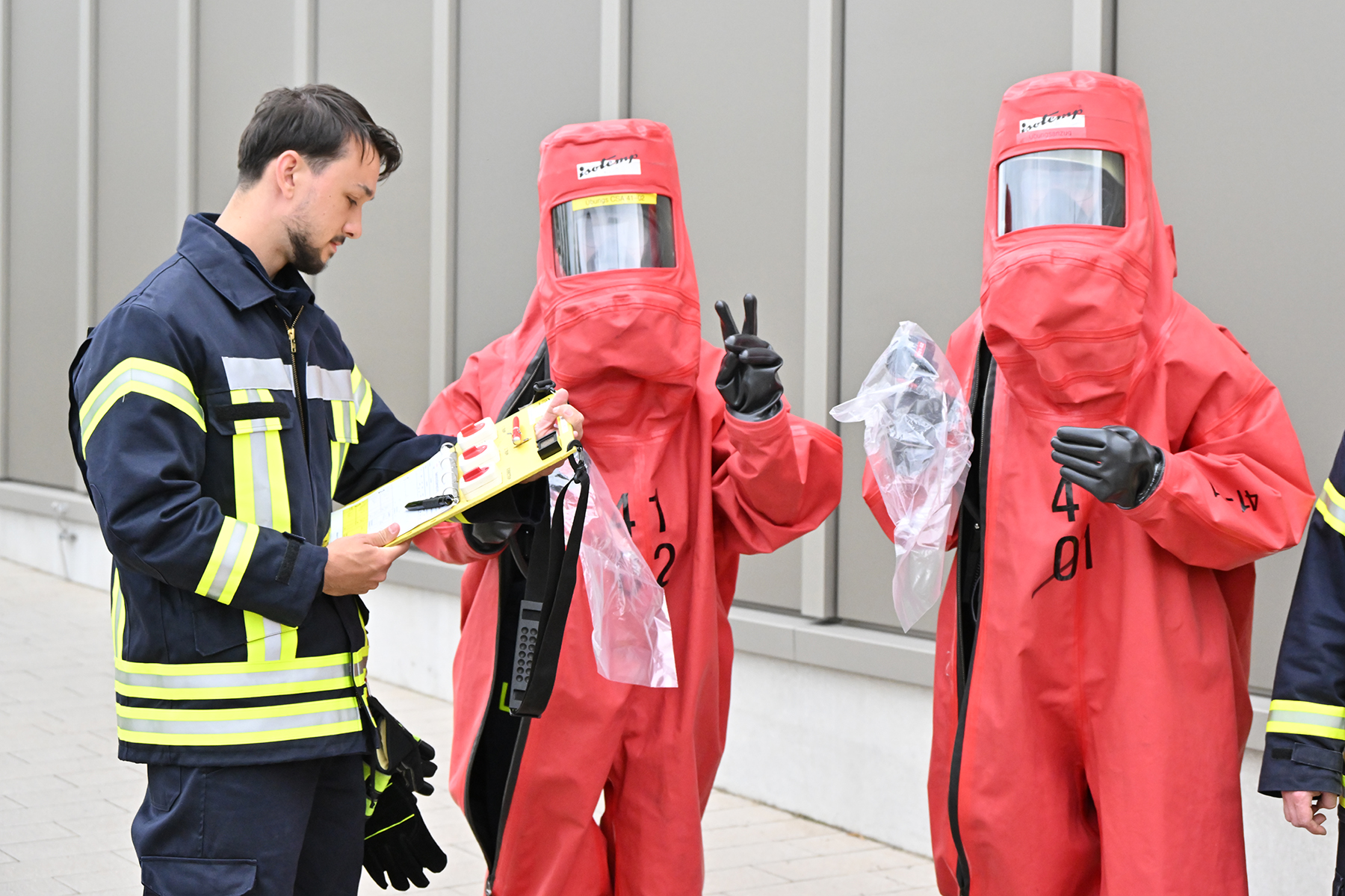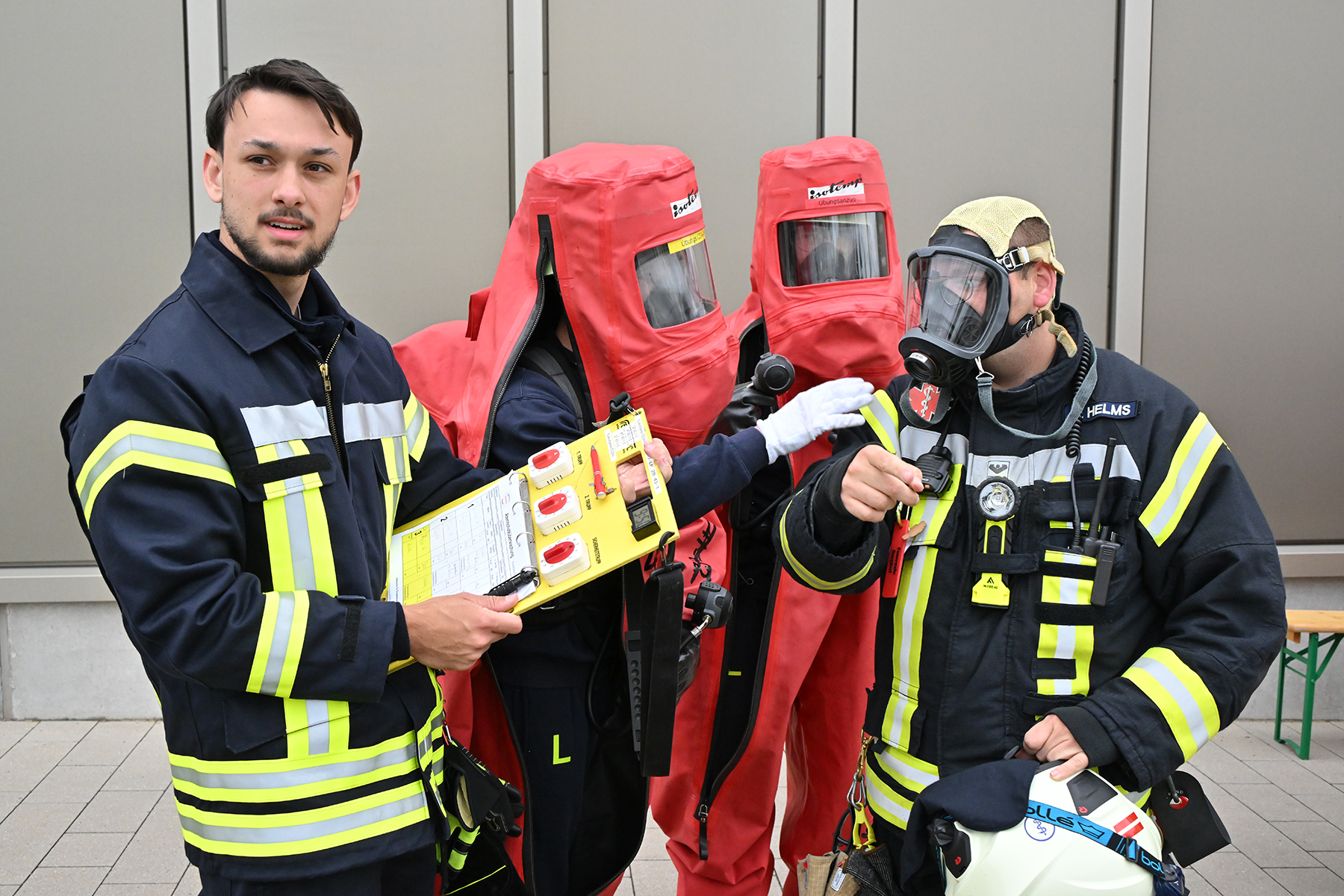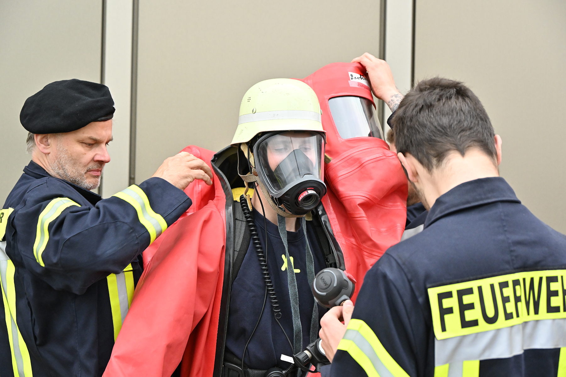 Kommt es hier zu einem Stoffaustritt, ist besonderer Schutz notwendig. Hierbei kommen die CSA-Träger zum Einsatz, deren Arbeit im Gegensatz zu einem Brand meist langsamer abläuft. Doch bevor es an die Arbeit geht, heißt es: Um- und anziehen. Die Feuerwehrkräfte legen hierbei zunächst einen einfachen Sportanzug an, dazu Atemschutzgerät, Atemschutzmaske, Helm und Funkgerät. Danach geht es in den luftdichten Schutzanzug, in dem es schon mal sehr warm werden kann, da eine Luftzirkulation unterbunden ist. Nur die ausgeatmete Atemluft wird aus dem Schutzanzug geführt. Zudem tragen die Feuerwehrkräfte Baumwollhandschuhe unter den im Schutzanzug befindlichen Handschuhen.
