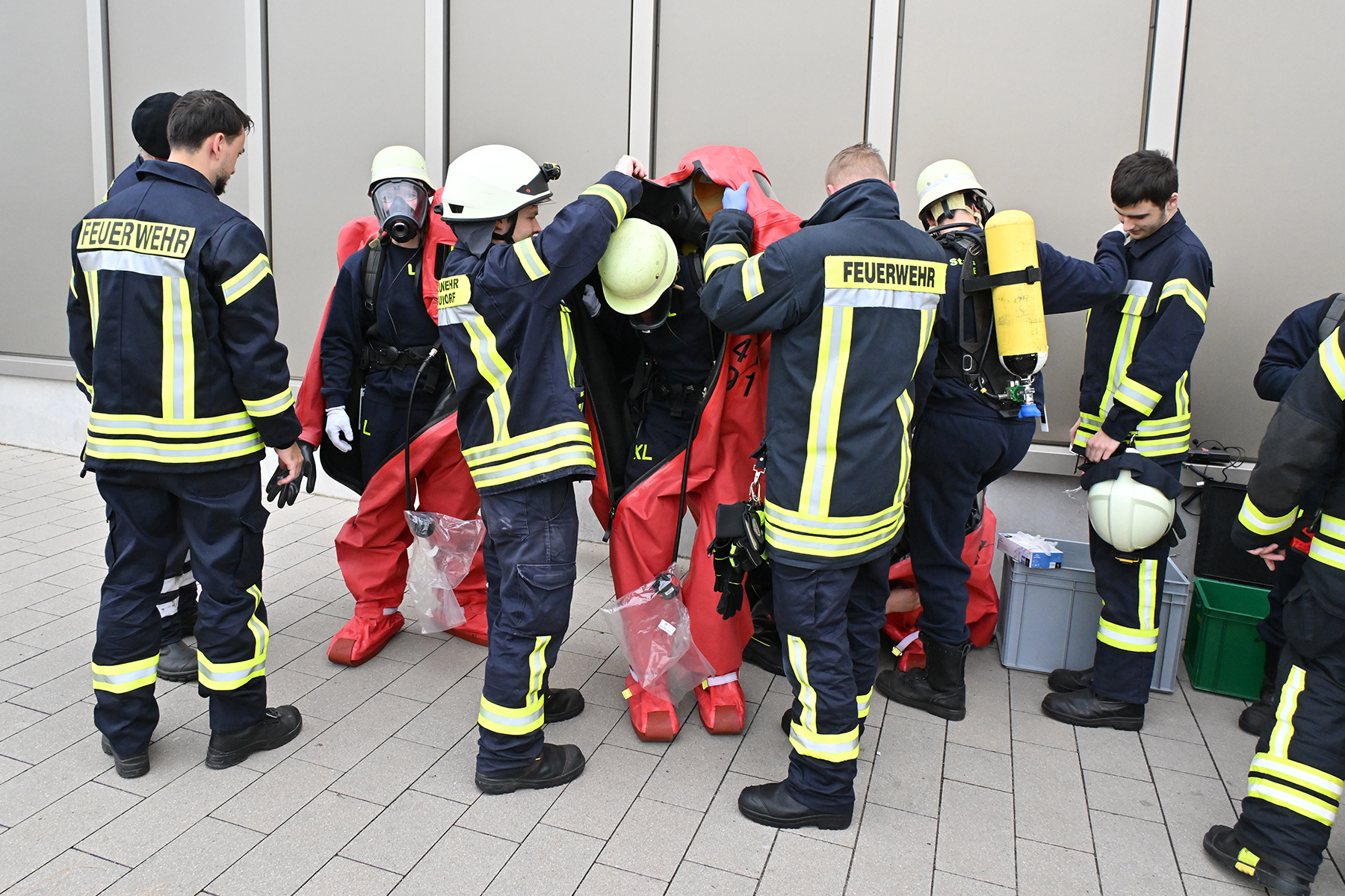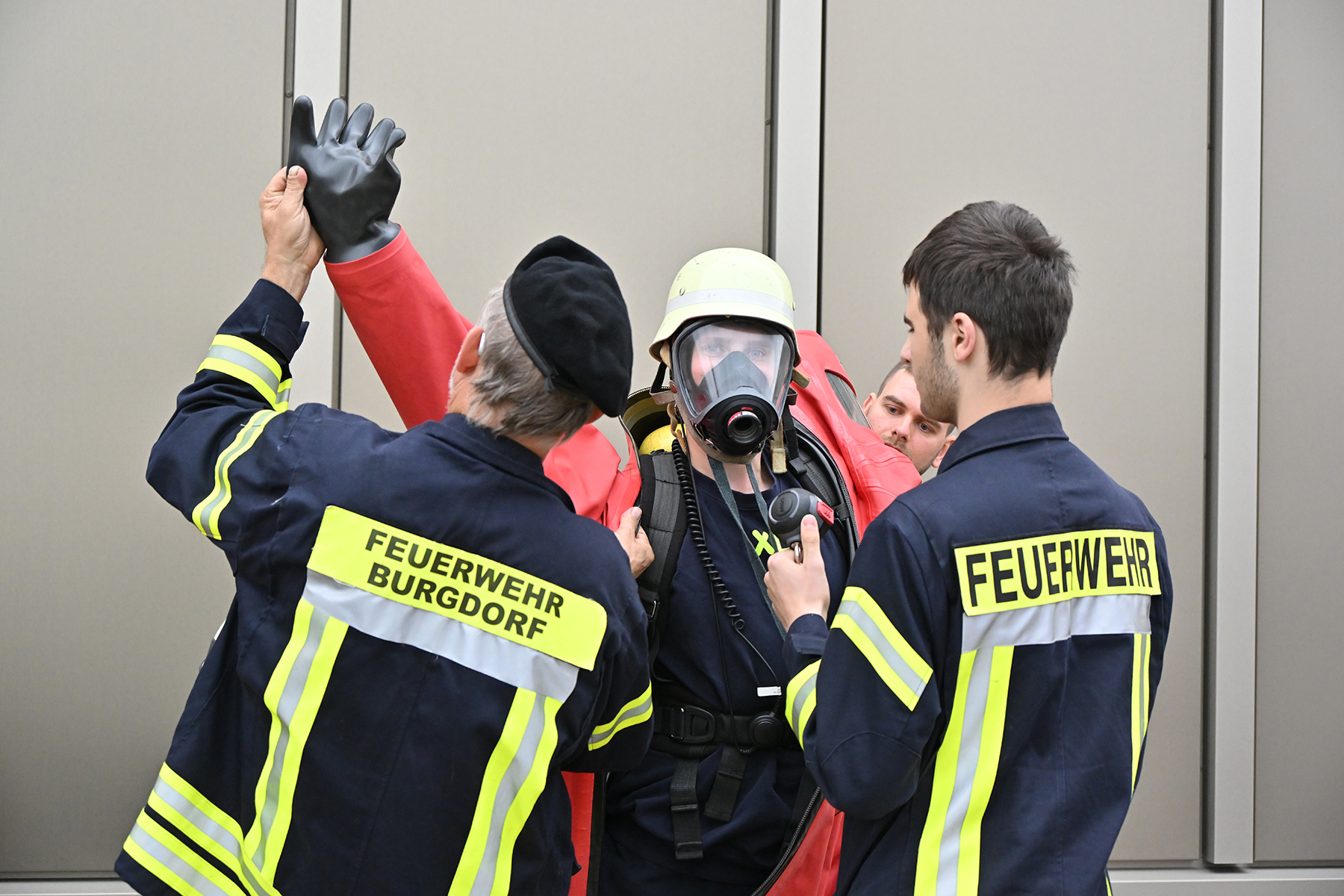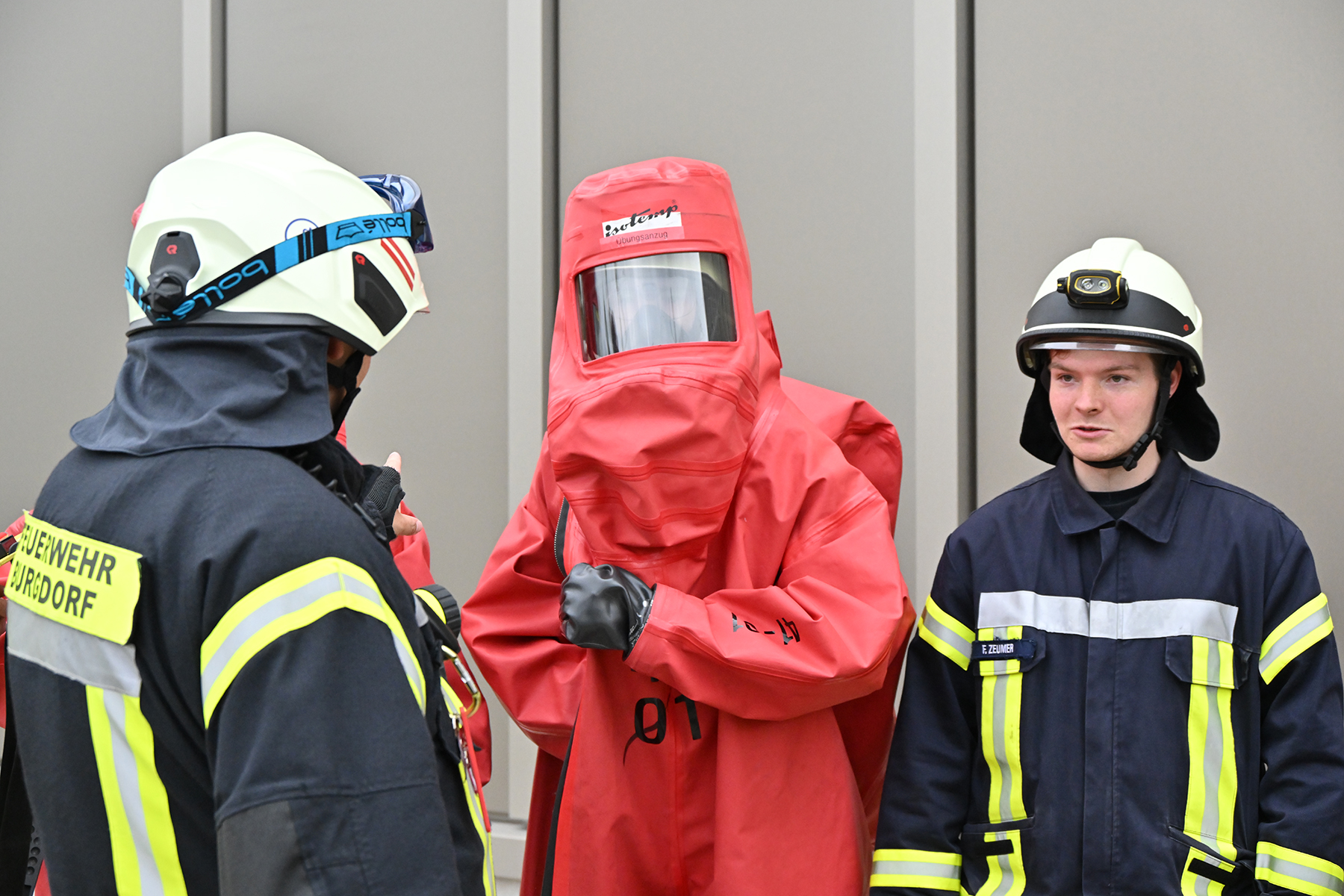 Kommt es hier zu einem Stoffaustritt, ist besonderer Schutz notwendig. Hierbei kommen die CSA-Träger zum Einsatz, deren Arbeit im Gegensatz zu einem Brand meist langsamer abläuft. Doch bevor es an die Arbeit geht, heißt es: Um- und anziehen. Die Feuerwehrkräfte legen hierbei zunächst einen einfachen Sportanzug an, dazu Atemschutzgerät, Atemschutzmaske, Helm und Funkgerät. Danach geht es in den luftdichten Schutzanzug, in dem es schon mal sehr warm werden kann, da eine Luftzirkulation unterbunden ist. Nur die ausgeatmete Atemluft wird aus dem Schutzanzug geführt. Zudem tragen die Feuerwehrkräfte Baumwollhandschuhe unter den im Schutzanzug befindlichen Handschuhen.