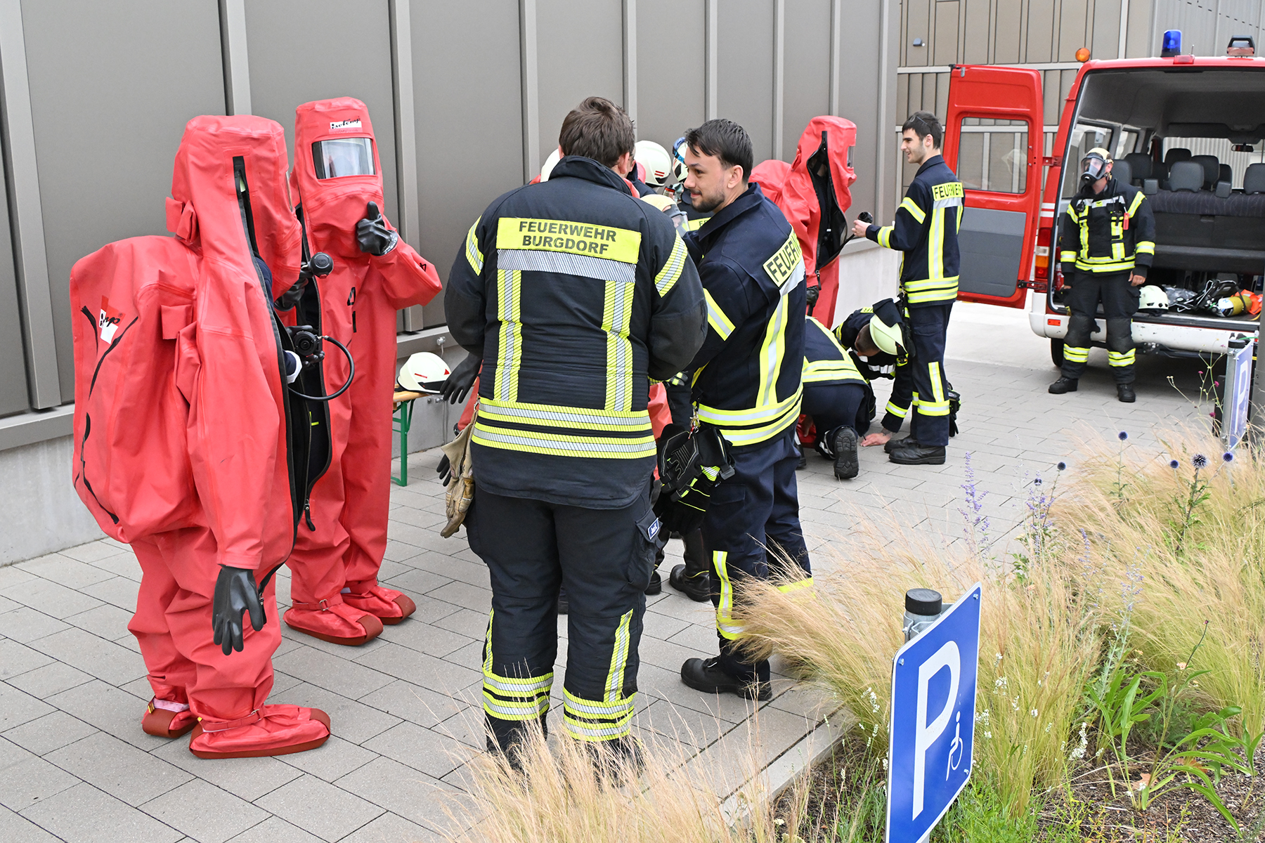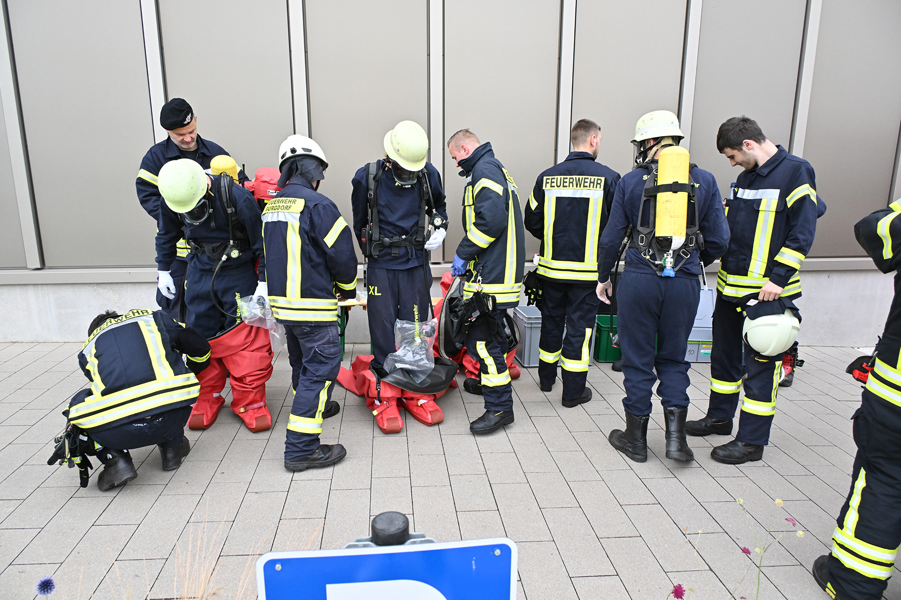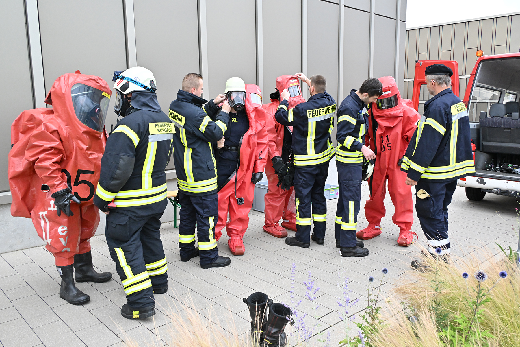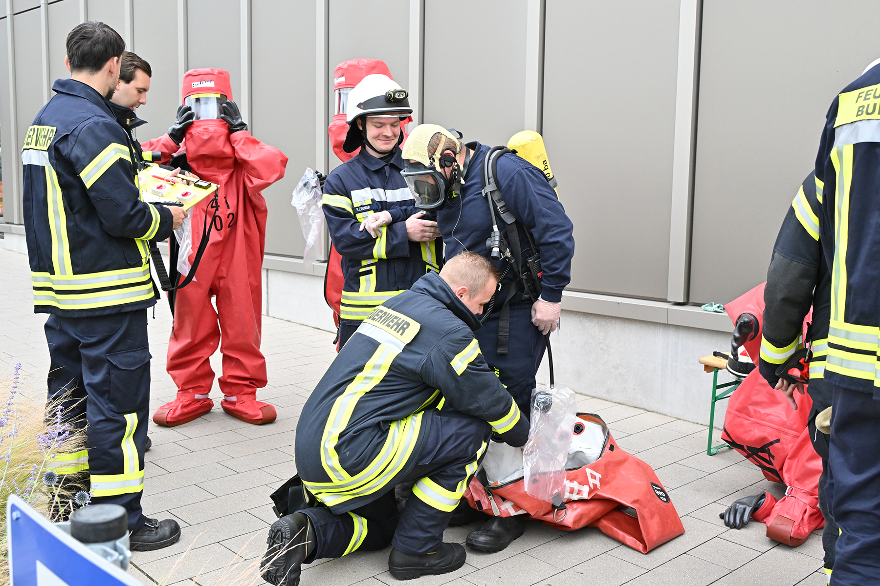 Kommt es hier zu einem Stoffaustritt, ist besonderer Schutz notwendig. Hierbei kommen die CSA-Träger zum Einsatz, deren Arbeit im Gegensatz zu einem Brand meist langsamer abläuft. Doch bevor es an die Arbeit geht, heißt es: Um- und anziehen. Die Feuerwehrkräfte legen hierbei zunächst einen einfachen Sportanzug an, dazu Atemschutzgerät, Atemschutzmaske, Helm und Funkgerät. Danach geht es in den luftdichten Schutzanzug, in dem es schon mal sehr warm werden kann, da eine Luftzirkulation unterbunden ist. Nur die ausgeatmete Atemluft wird aus dem Schutzanzug geführt. Zudem tragen die Feuerwehrkräfte Baumwollhandschuhe unter den im Schutzanzug befindlichen Handschuhen.