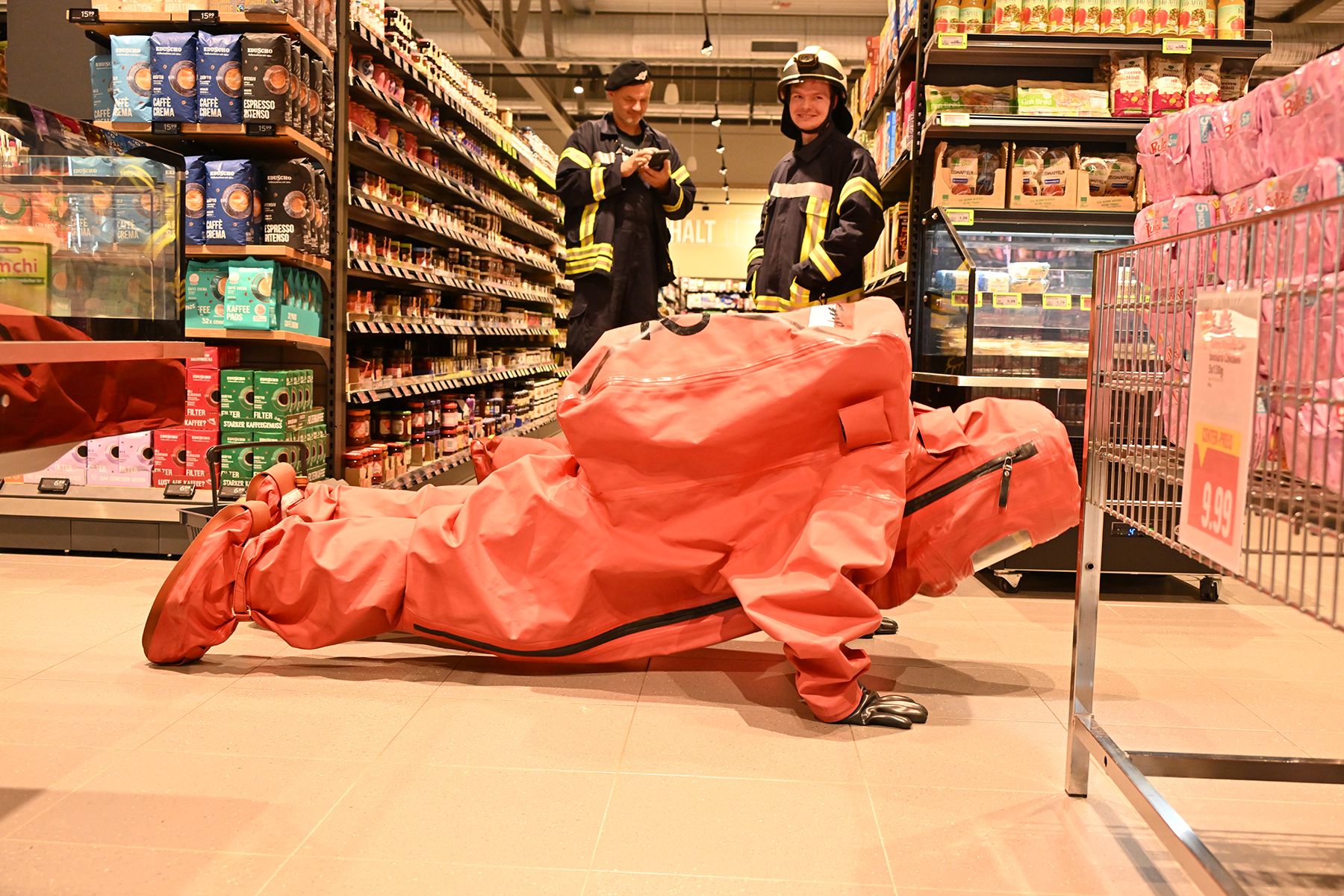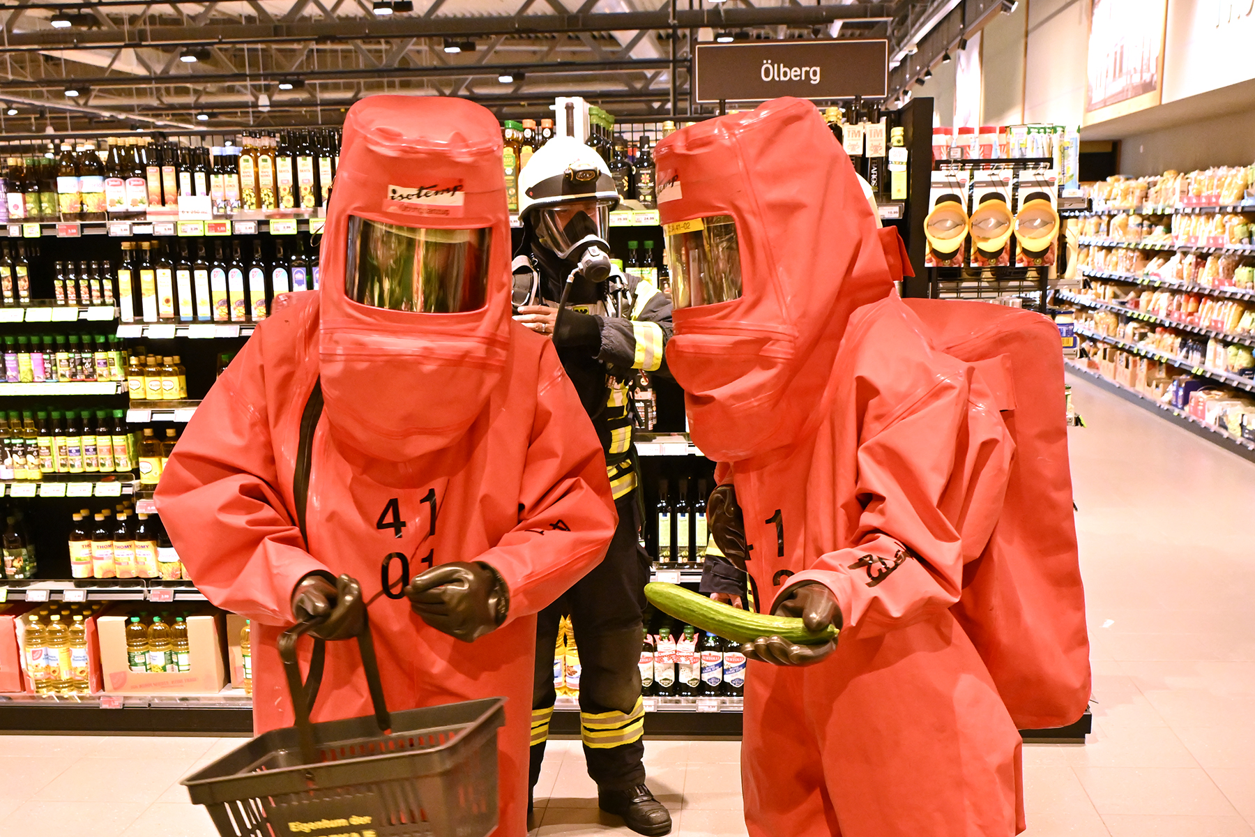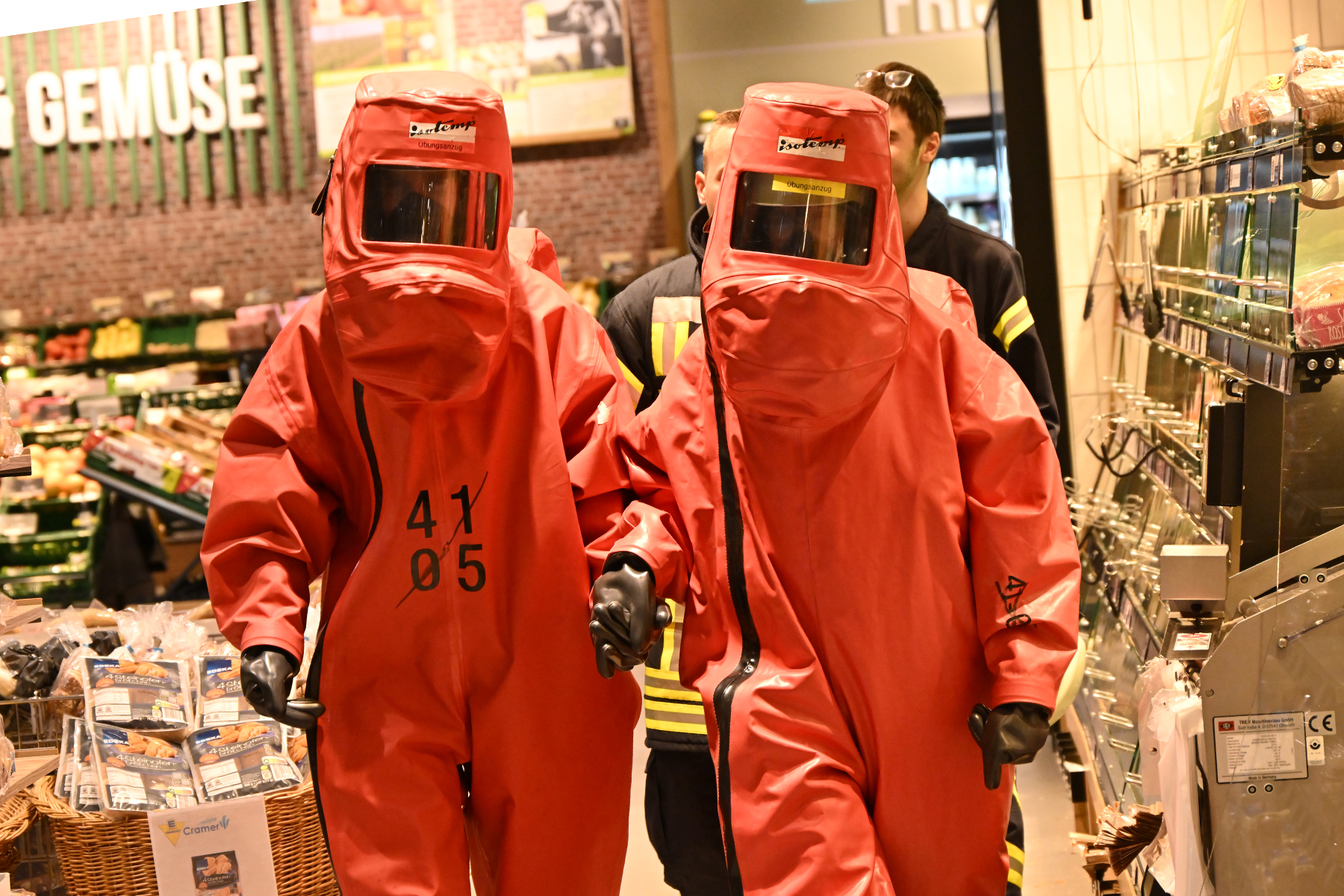 Schon durch die Atemschutzmaske ist das Sichtfeld eingeschränkt, der Chemikalienschutzanzug hat ein noch kleineres Sichtfeld. Daher müssen die Einsatzkräfte besonders vorsichtig vorgehen. Auch halten sie sich an den Händen. So ging es auch gestern durch das E-Center. Doch galt es nicht, Leckagen abzudichten, sondern ähnliche Aufgaben zu erledigen.