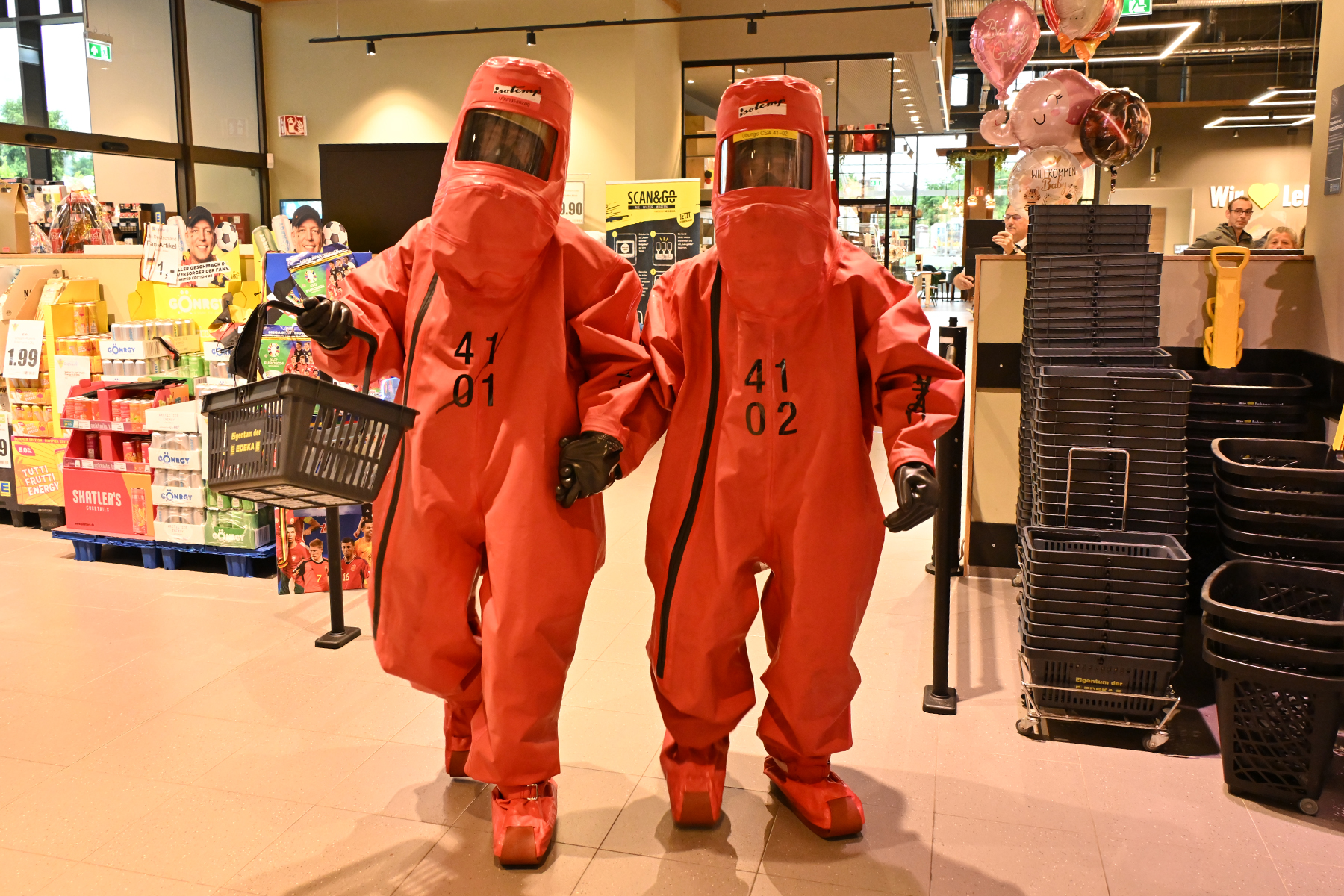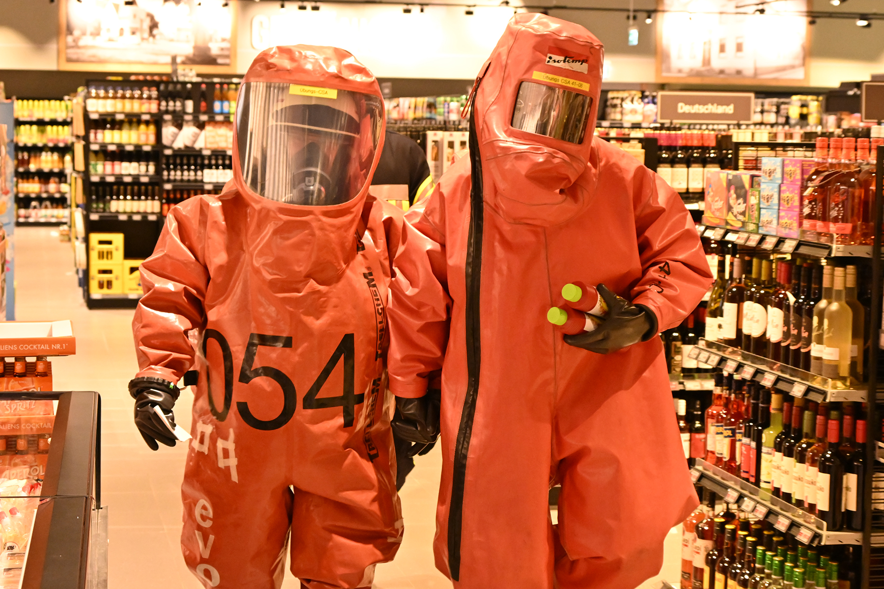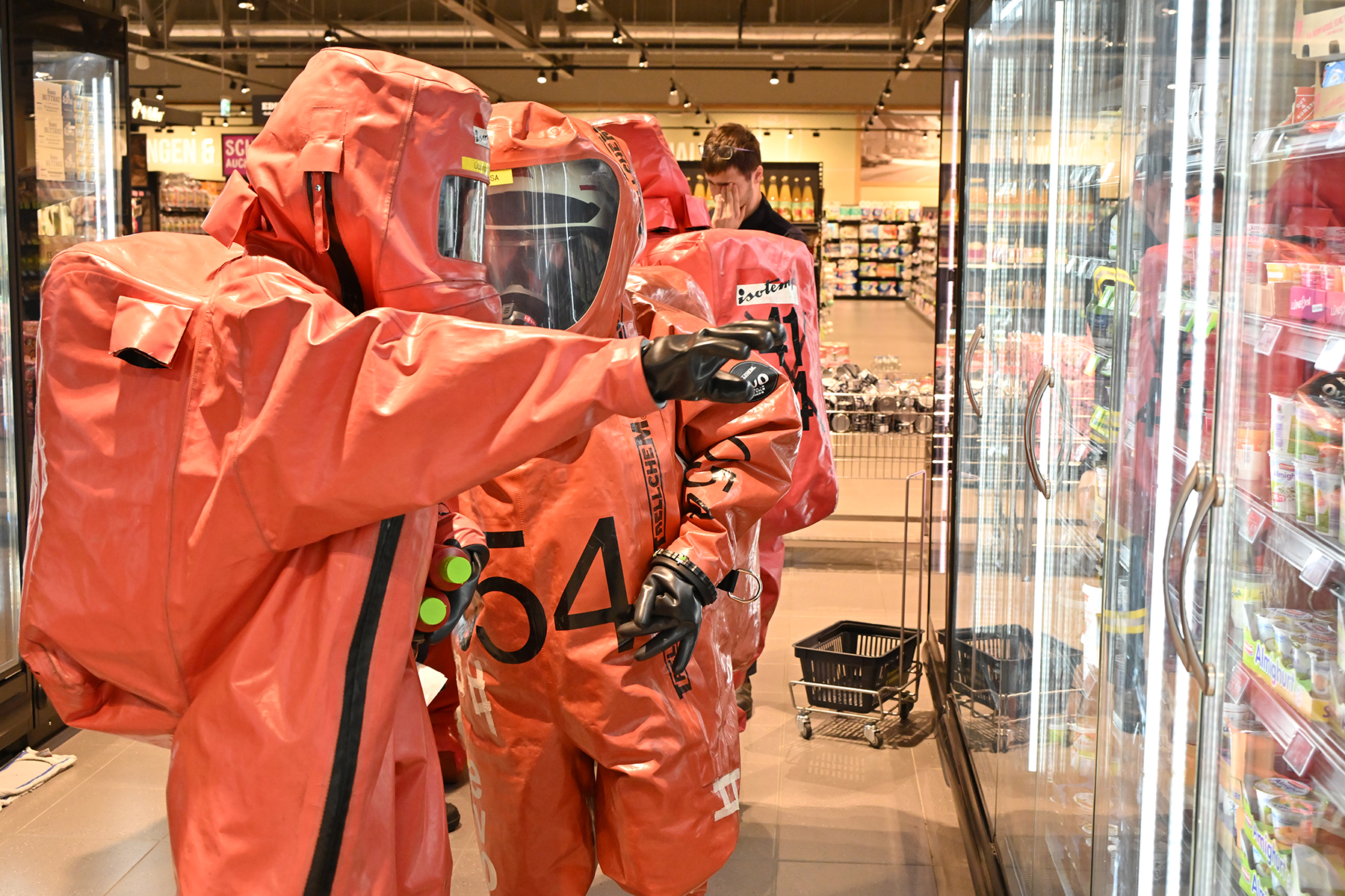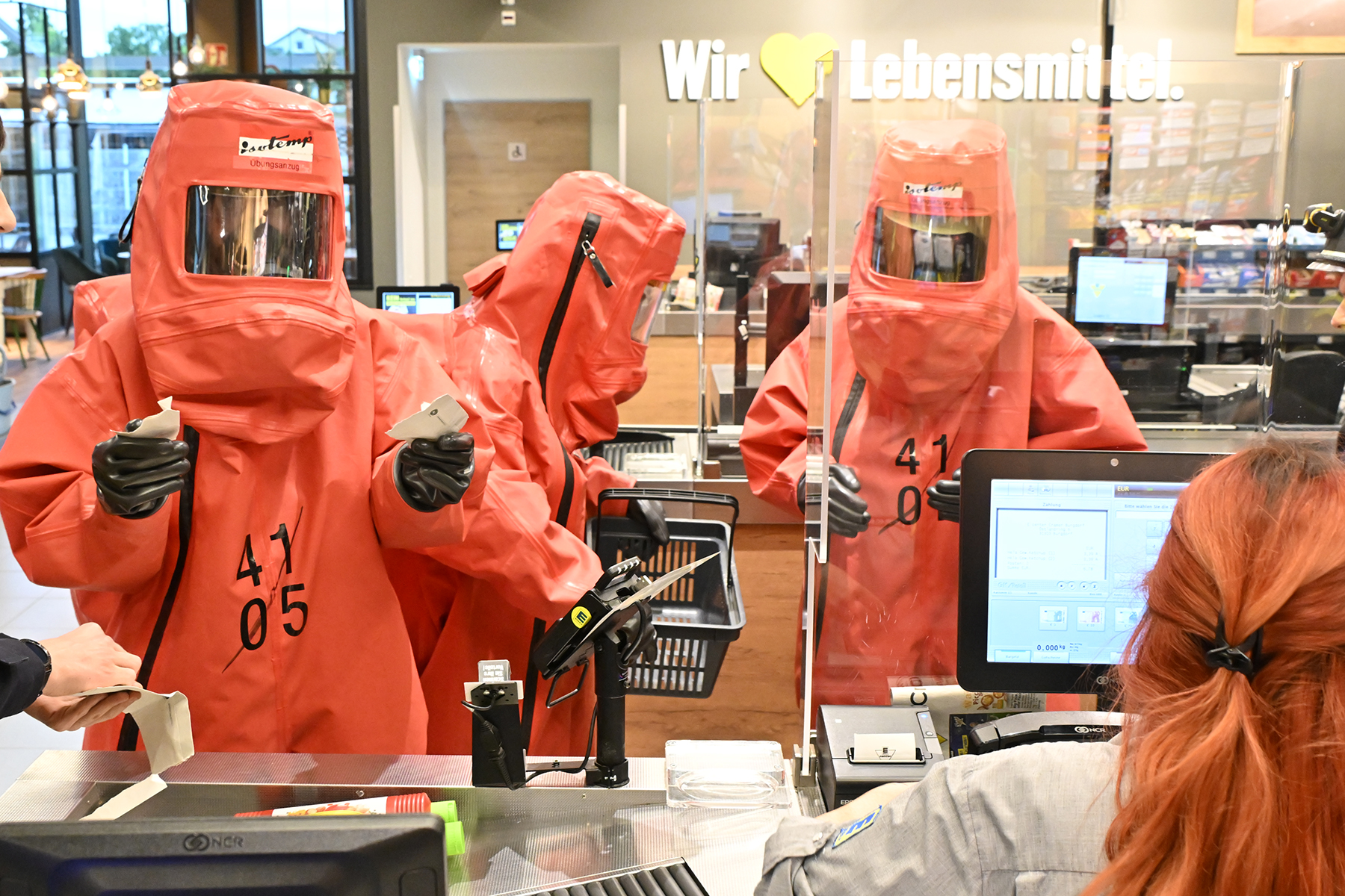 Schon durch die Atemschutzmaske ist das Sichtfeld eingeschränkt, der Chemikalienschutzanzug hat ein noch kleineres Sichtfeld. Daher müssen die Einsatzkräfte besonders vorsichtig vorgehen. Auch halten sie sich an den Händen. So ging es auch gestern durch das E-Center. Doch galt es nicht, Leckagen abzudichten, sondern ähnliche Aufgaben zu erledigen.