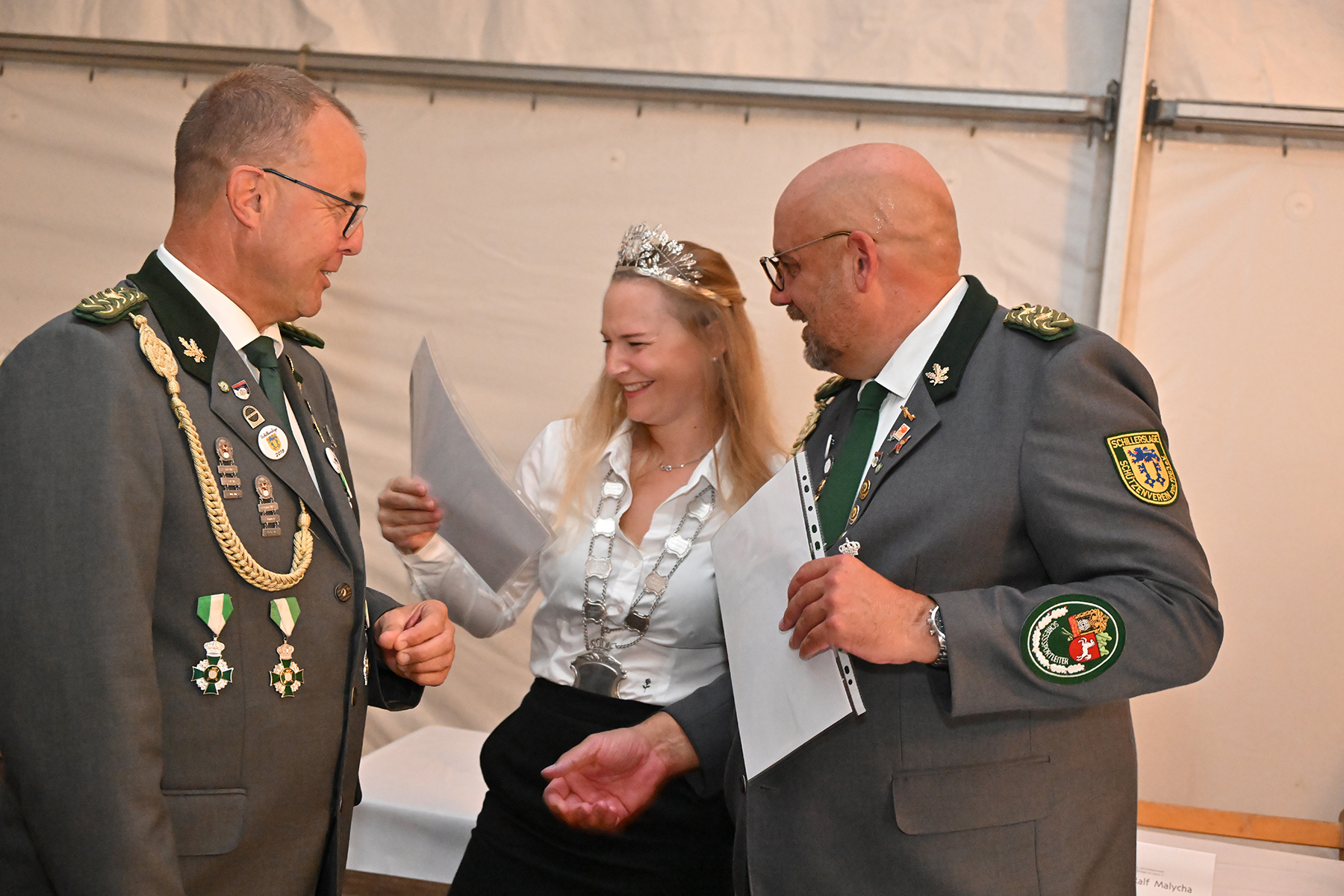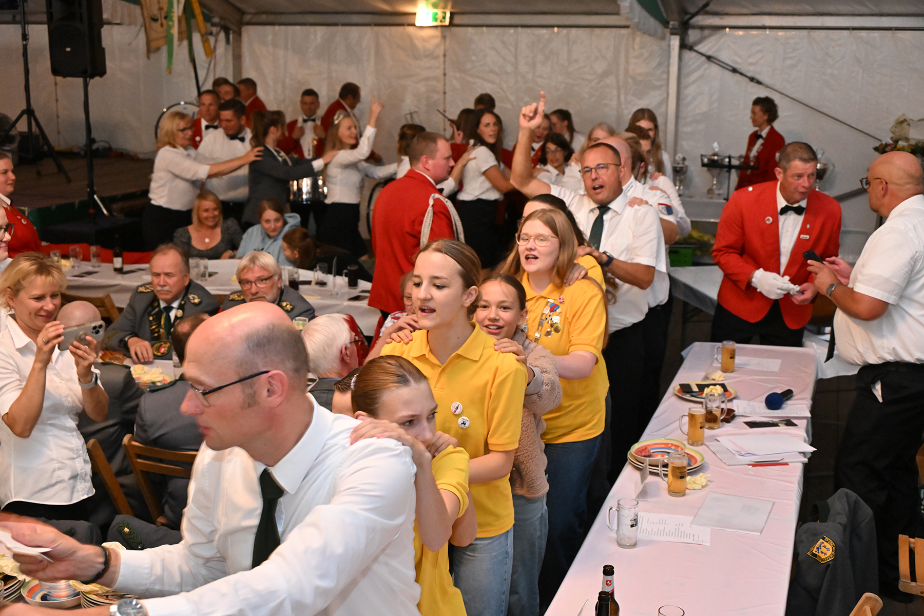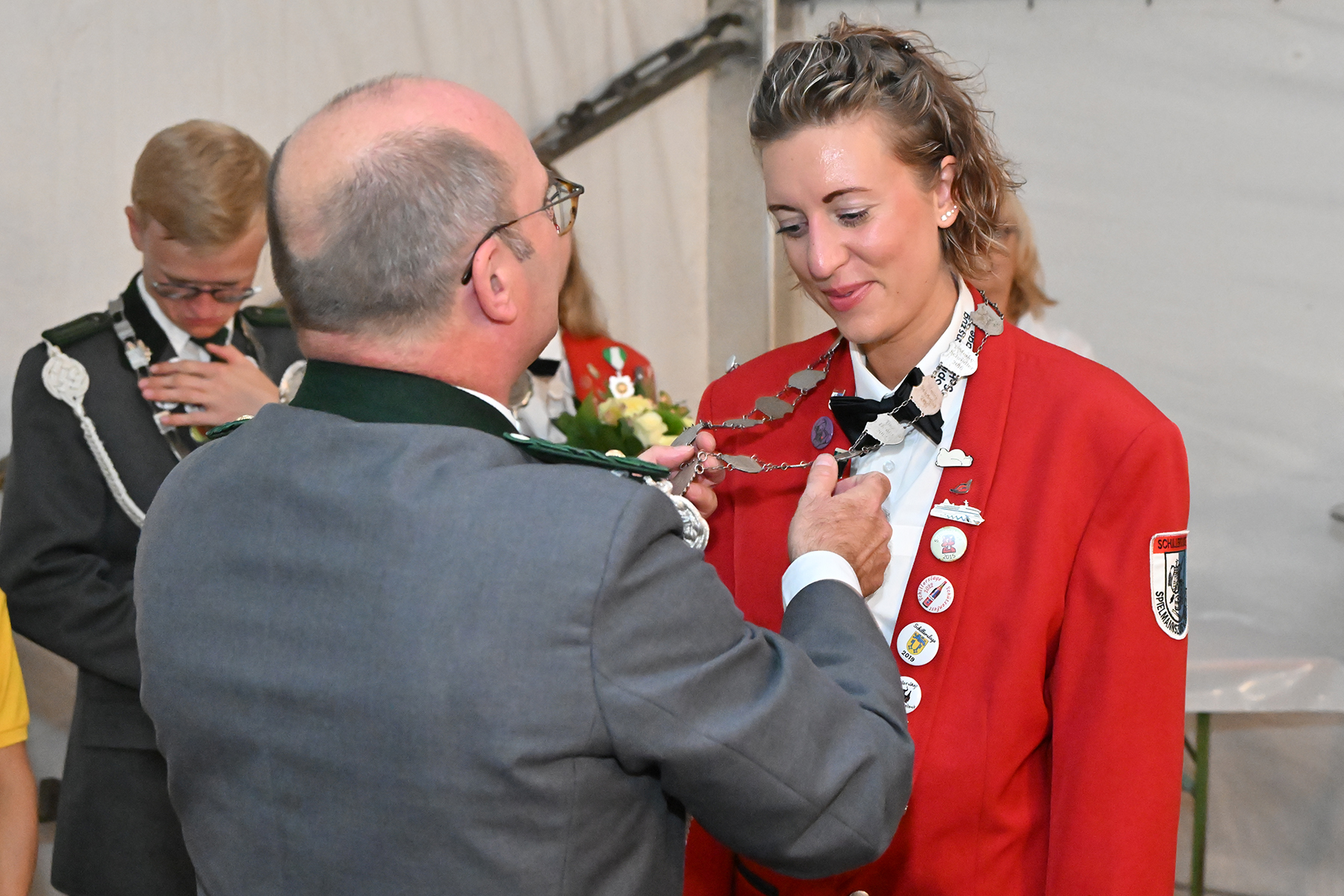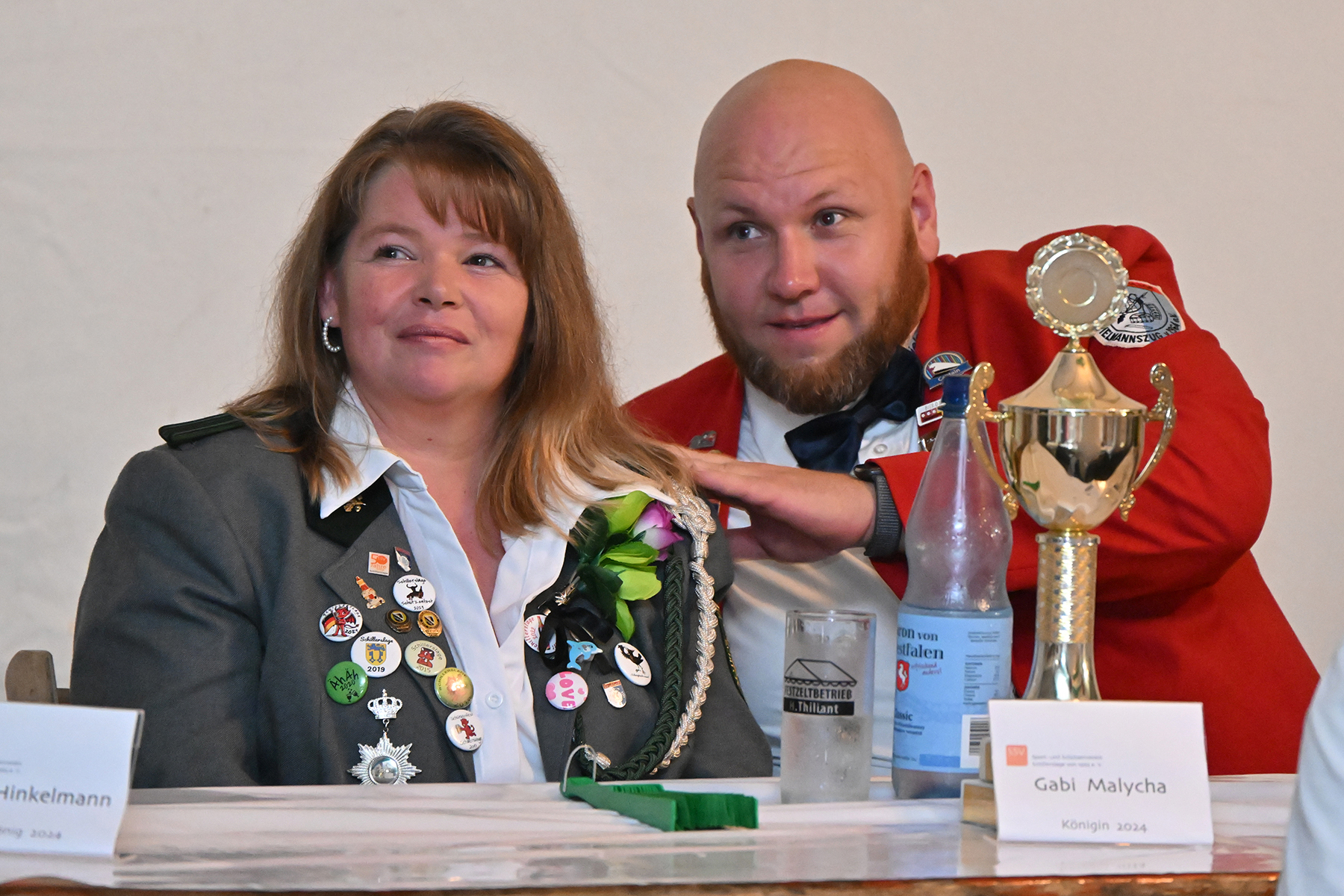 Was wäre ein Schützenfest ohne die Majestäten? So traten die Vorjahresmajestäten zu Beginn des Festkommerses ab und wurden mit einem Ablöseorden bedacht. Die neuen Majestäten sind: König Tobias Bähr, Königin Gabi Malycha, KK-König Ralf Malycha, KK-Königin Yasemin Molenda, Jugendkönigin Larissa Gawlik, Kinderkönig Bennit Hinkelmann und Lichtpunktkönig Mats Thieleking, die entsprechend gefeiert wurden. Traditionell sangen die Schützendamen ein Lied für ihre neue Königin.
