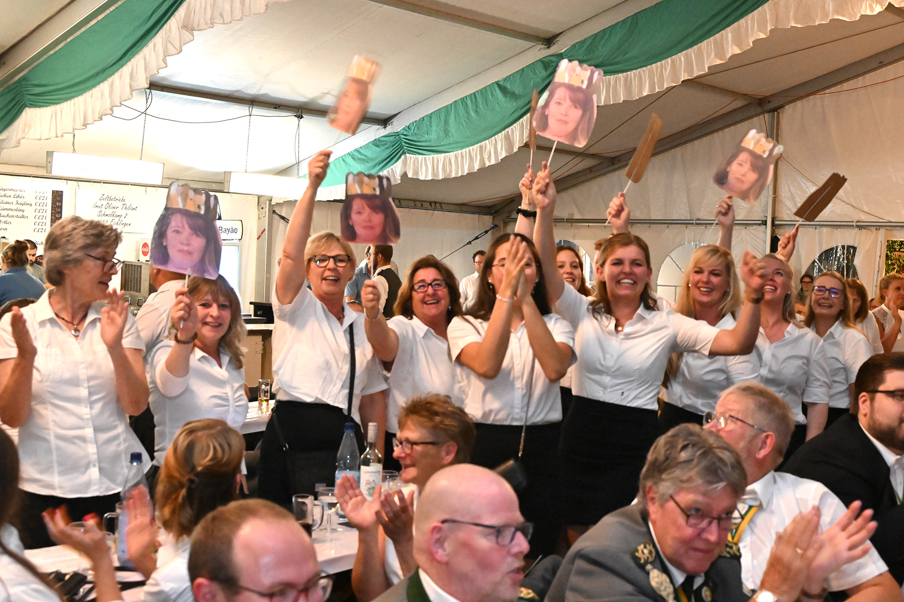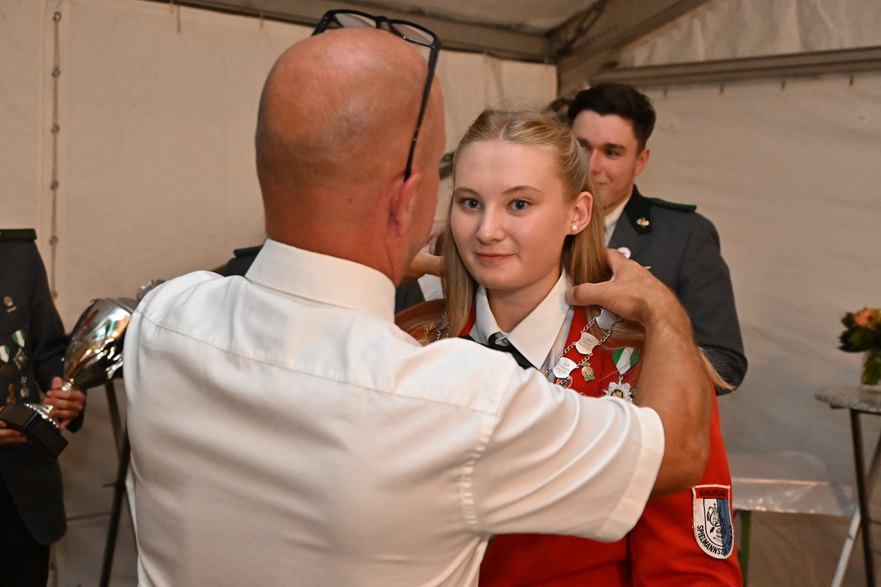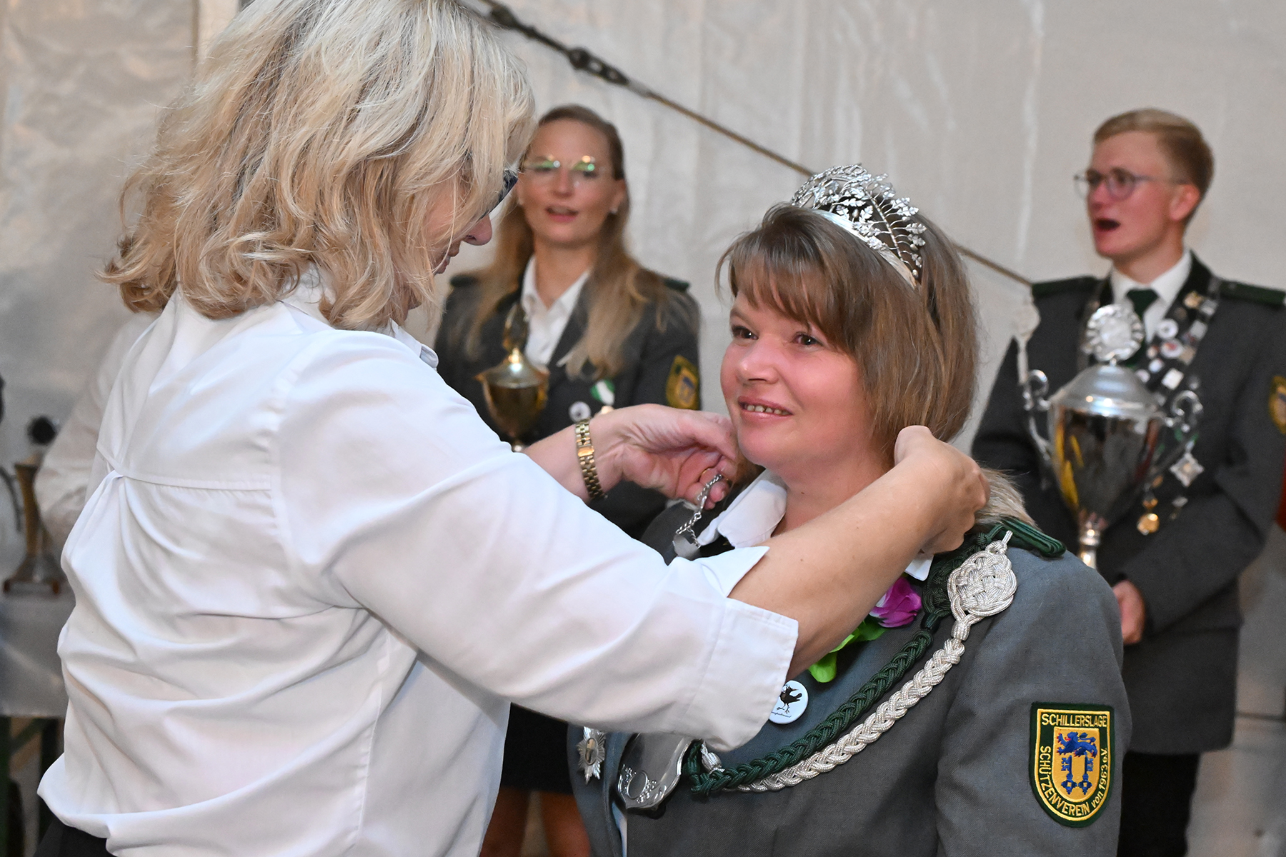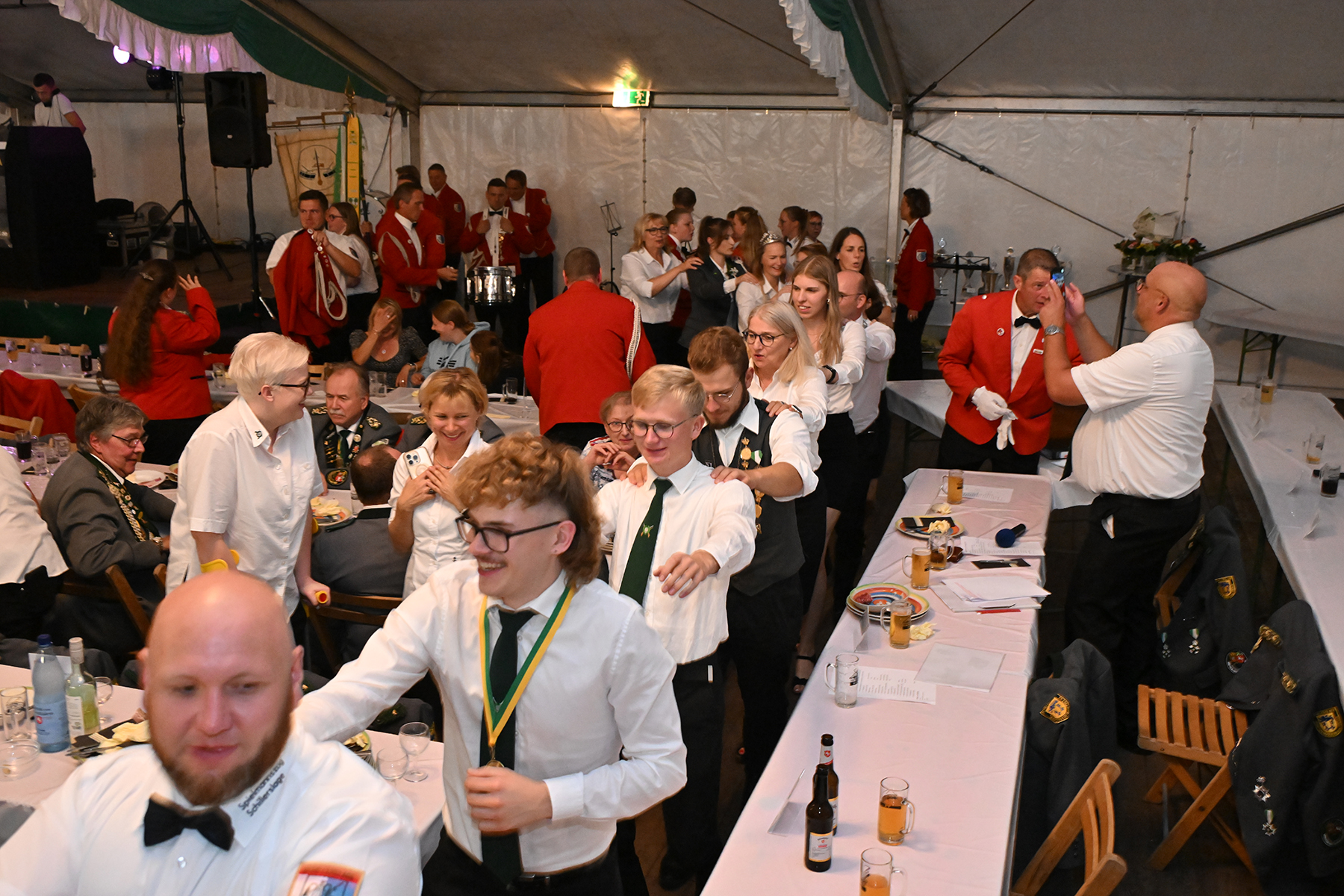 Was wäre ein Schützenfest ohne die Majestäten? So traten die Vorjahresmajestäten zu Beginn des Festkommerses ab und wurden mit einem Ablöseorden bedacht. Die neuen Majestäten sind: König Tobias Bähr, Königin Gabi Malycha, KK-König Ralf Malycha, KK-Königin Yasemin Molenda, Jugendkönigin Larissa Gawlik, Kinderkönig Bennit Hinkelmann und Lichtpunktkönig Mats Thieleking, die entsprechend gefeiert wurden. Traditionell sangen die Schützendamen ein Lied für ihre neue Königin.