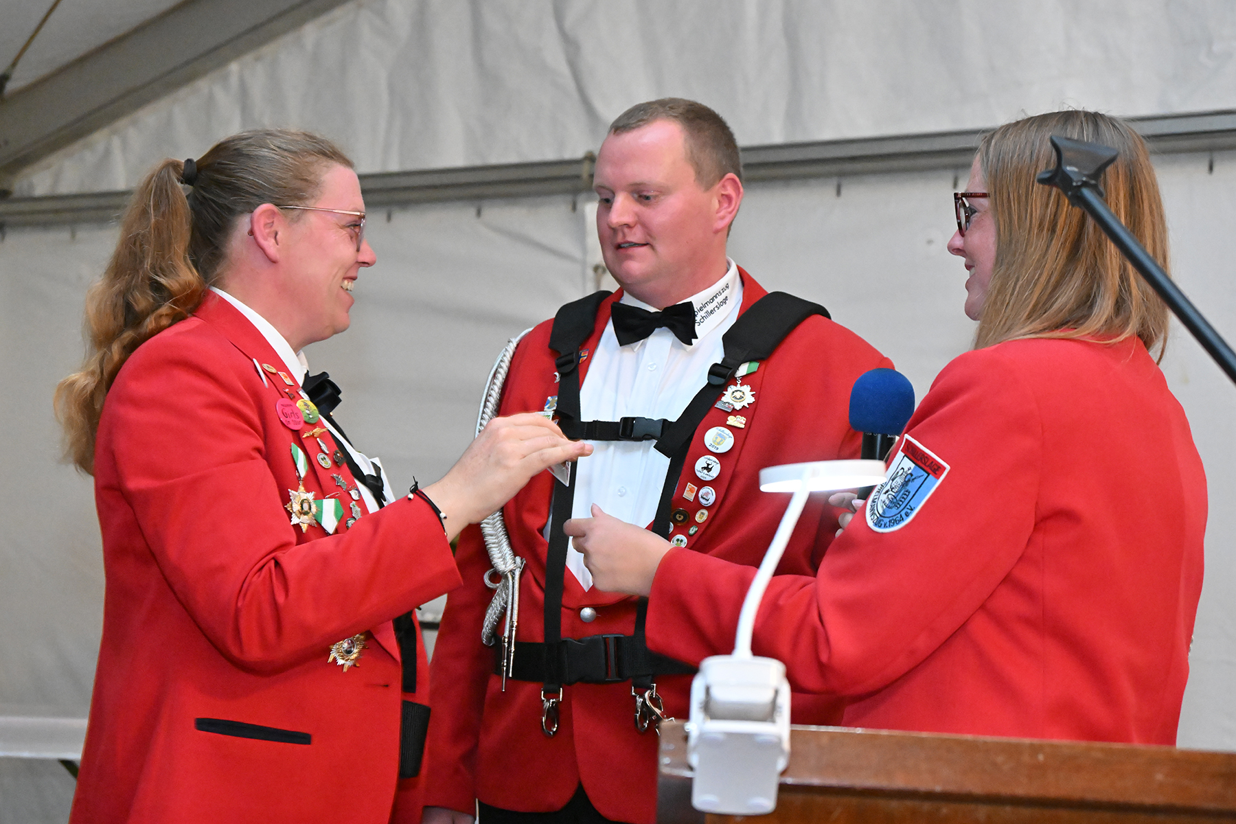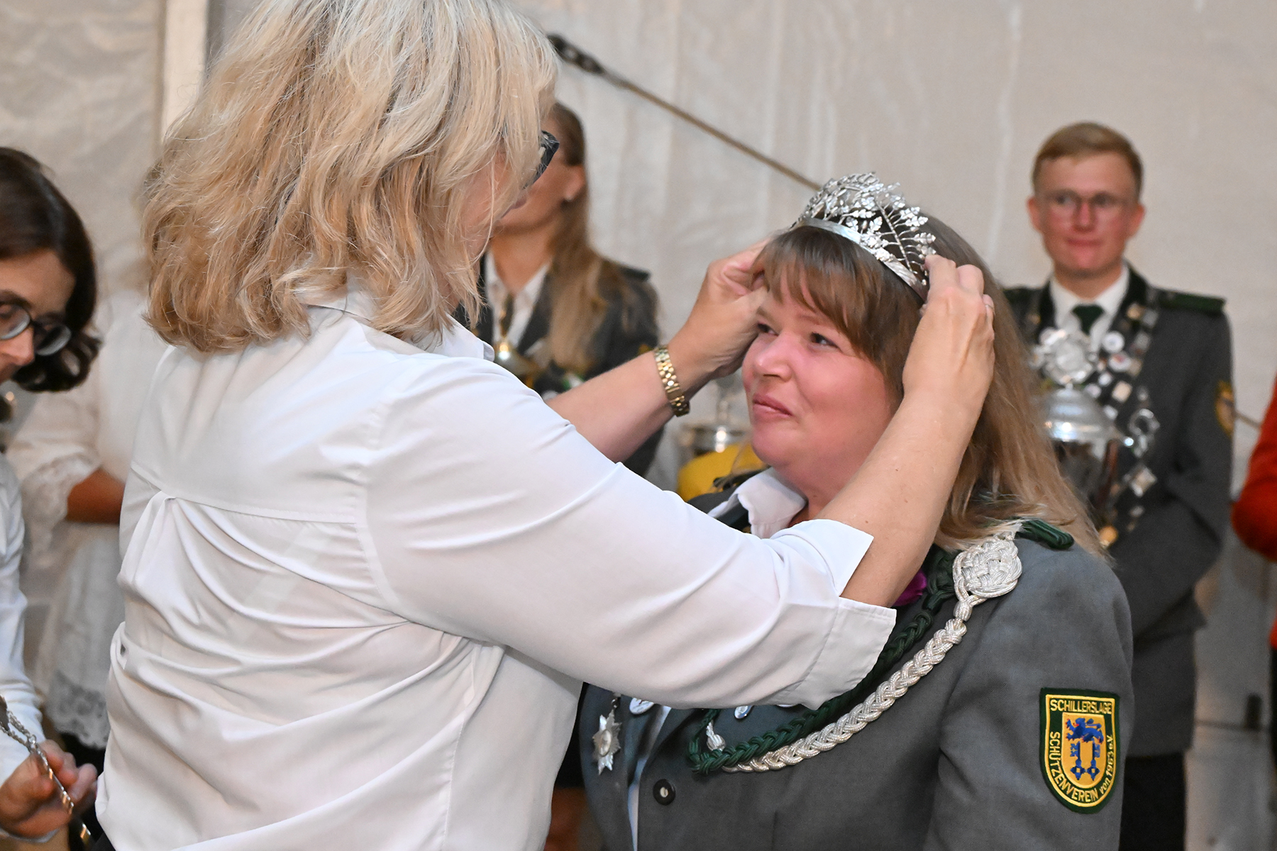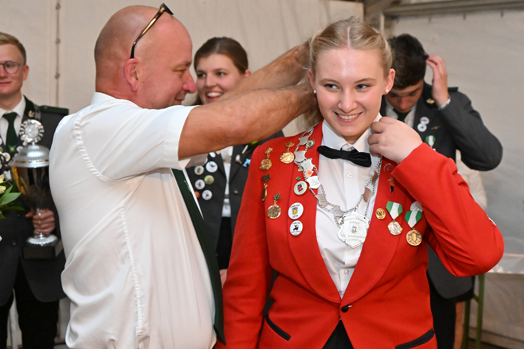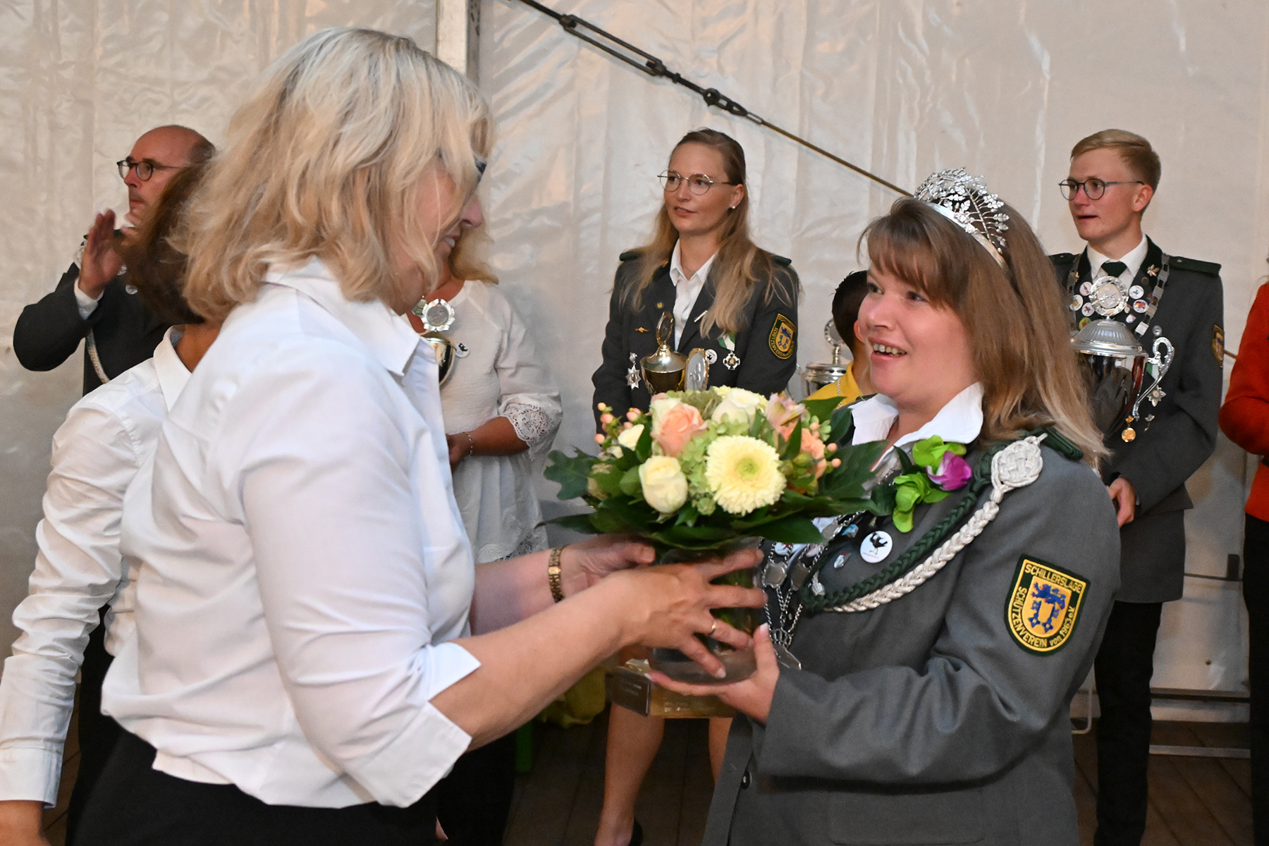 Was wäre ein Schützenfest ohne die Majestäten? So traten die Vorjahresmajestäten zu Beginn des Festkommerses ab und wurden mit einem Ablöseorden bedacht. Die neuen Majestäten sind: König Tobias Bähr, Königin Gabi Malycha, KK-König Ralf Malycha, KK-Königin Yasemin Molenda, Jugendkönigin Larissa Gawlik, Kinderkönig Bennit Hinkelmann und Lichtpunktkönig Mats Thieleking, die entsprechend gefeiert wurden. Traditionell sangen die Schützendamen ein Lied für ihre neue Königin.