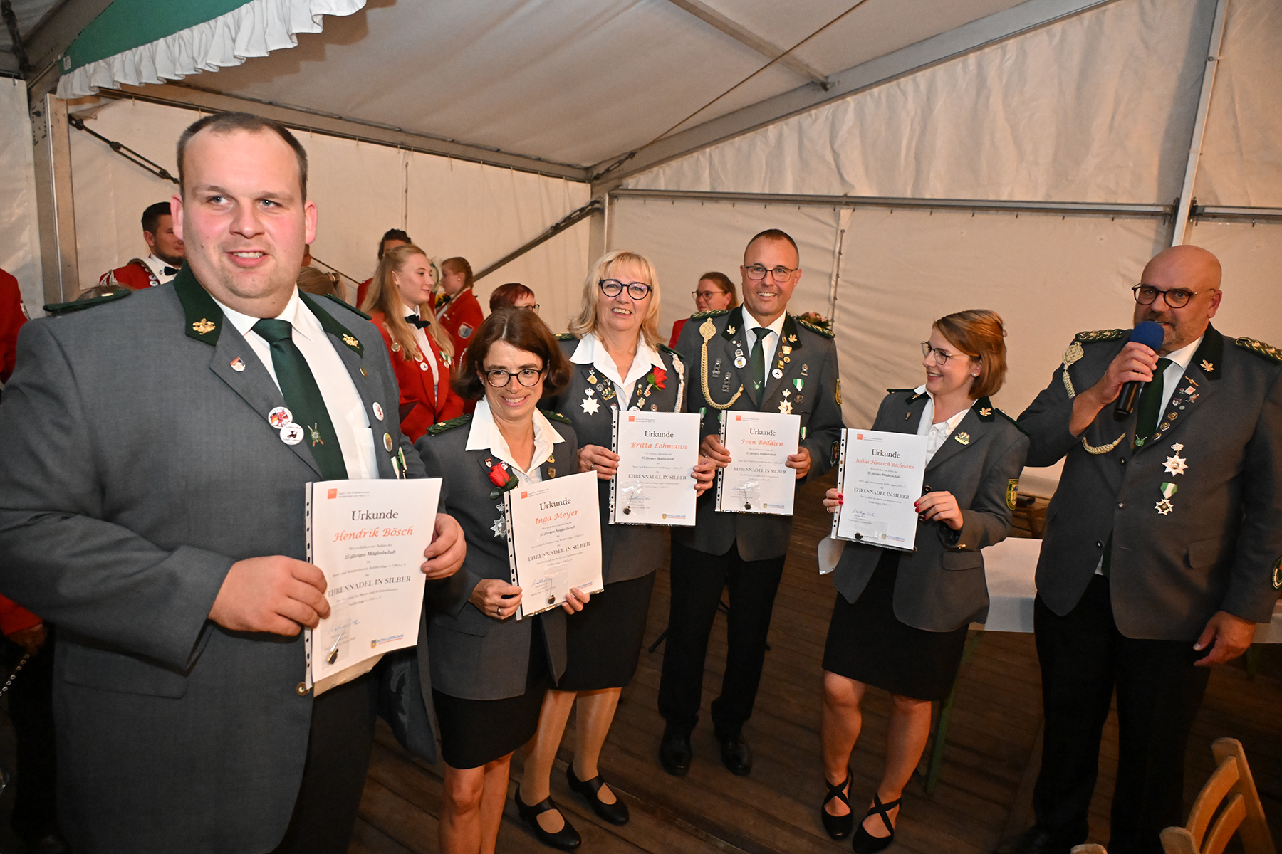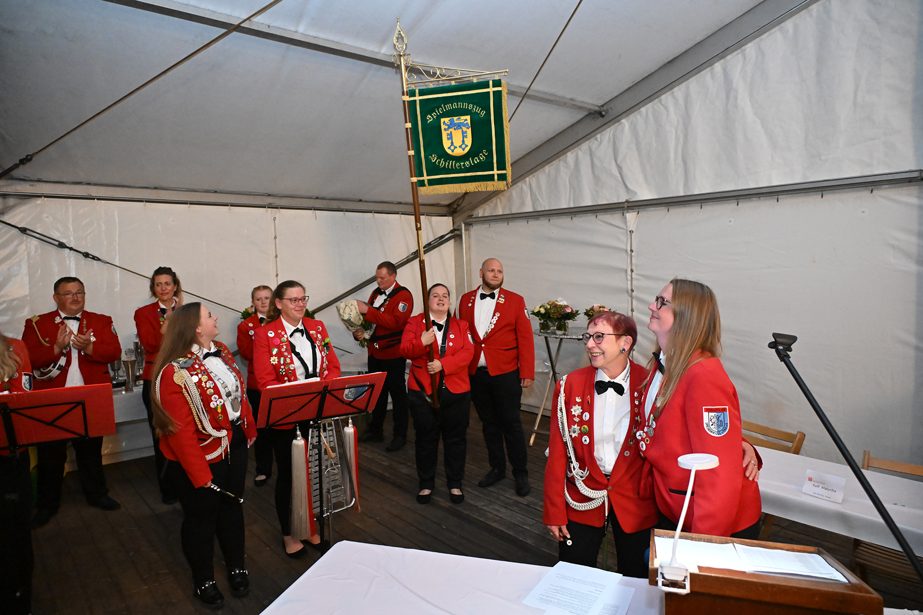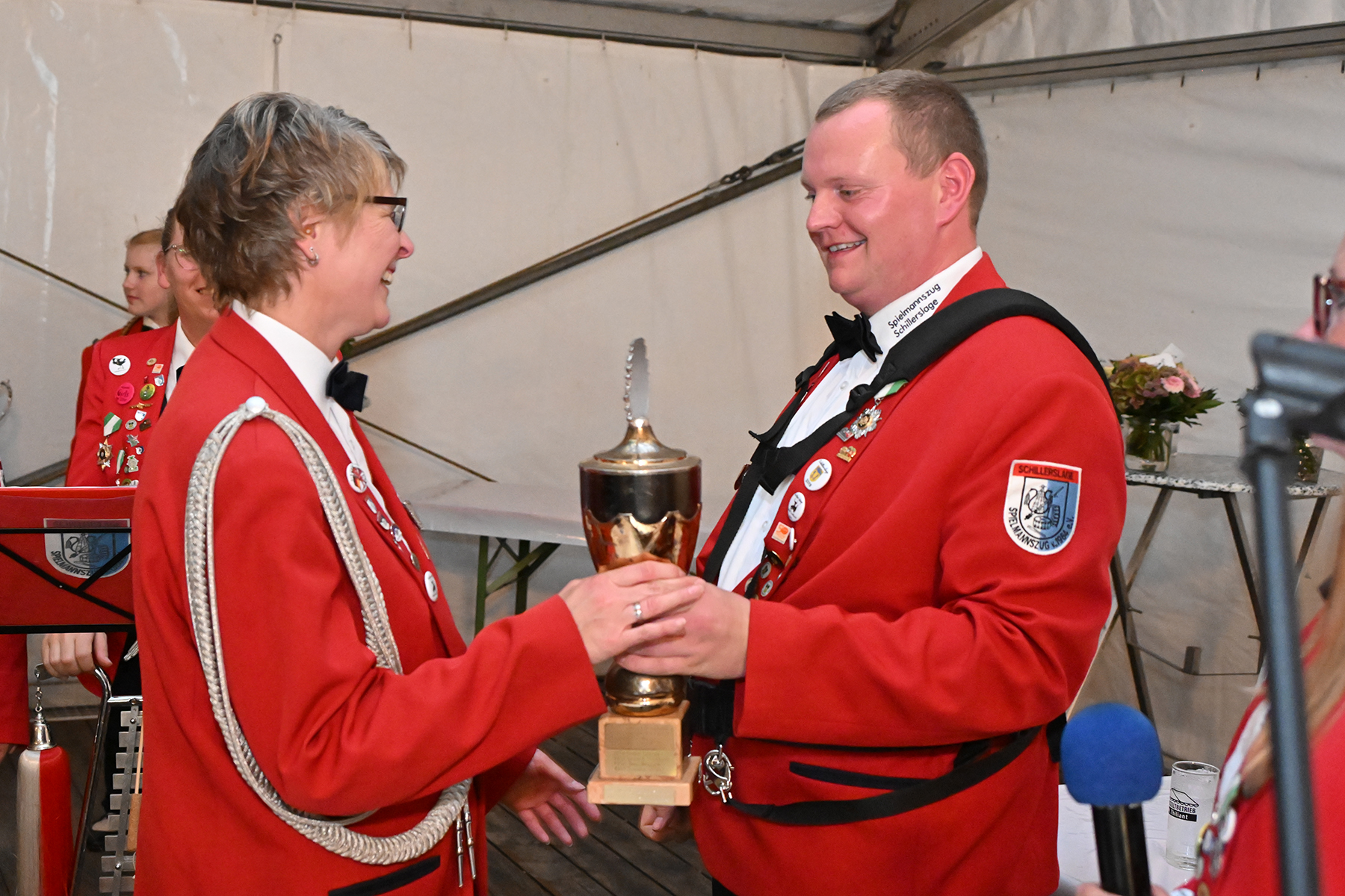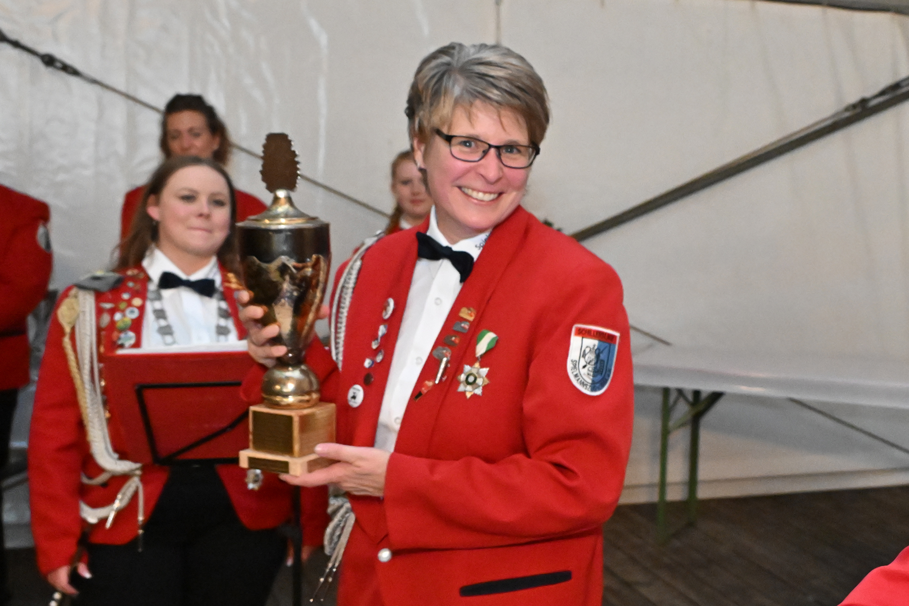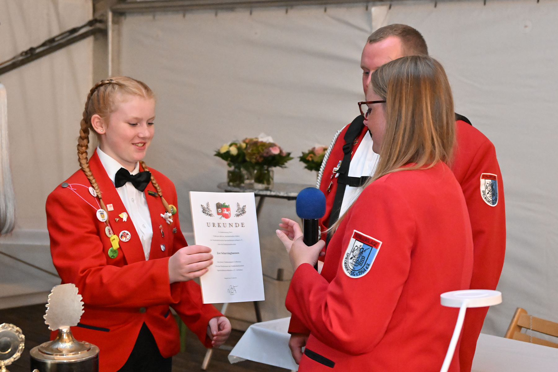 Besonders im Mittelpunkt steht in diesem Jahr der Spielmannszug, der seinen 60. Geburtstag feiert. Die Spielleute hatten anlässlich des runden Geburtstags einen Orden ausgeschossen, den Katharina Scharringhausen gewann. Standing Ovations erhielt Elke Nowicki, die dem Spielmannszug eine neue Standarte gespendet hatte. "Ich hoffe, dass wir noch viele Jahre zusammen haben", sagte die edle Spenderin. Zudem überreichte der Spielmannszug den Pokal der 1000 Möglichkeiten als Dank für besondere Verdienste an Gaby Malycha. Den Oldie-Pokal holte sich Nadine Bethmann, die auch den Damen-Wanderpokal gewann. Für fünfjährige Mitgliedschaft wurde Zoe Scharringhausen geehrt. Der SSV ehrte zudem Olaf Meyer-Weißhaar und Annedore Beinsen für 50-jährige Mitgliedschaft sowie Sven Boddien, Hendrik Bösch, Britta Lohmann und Inga Meyer für 25-jährige Mitgliedschaft im Verein.