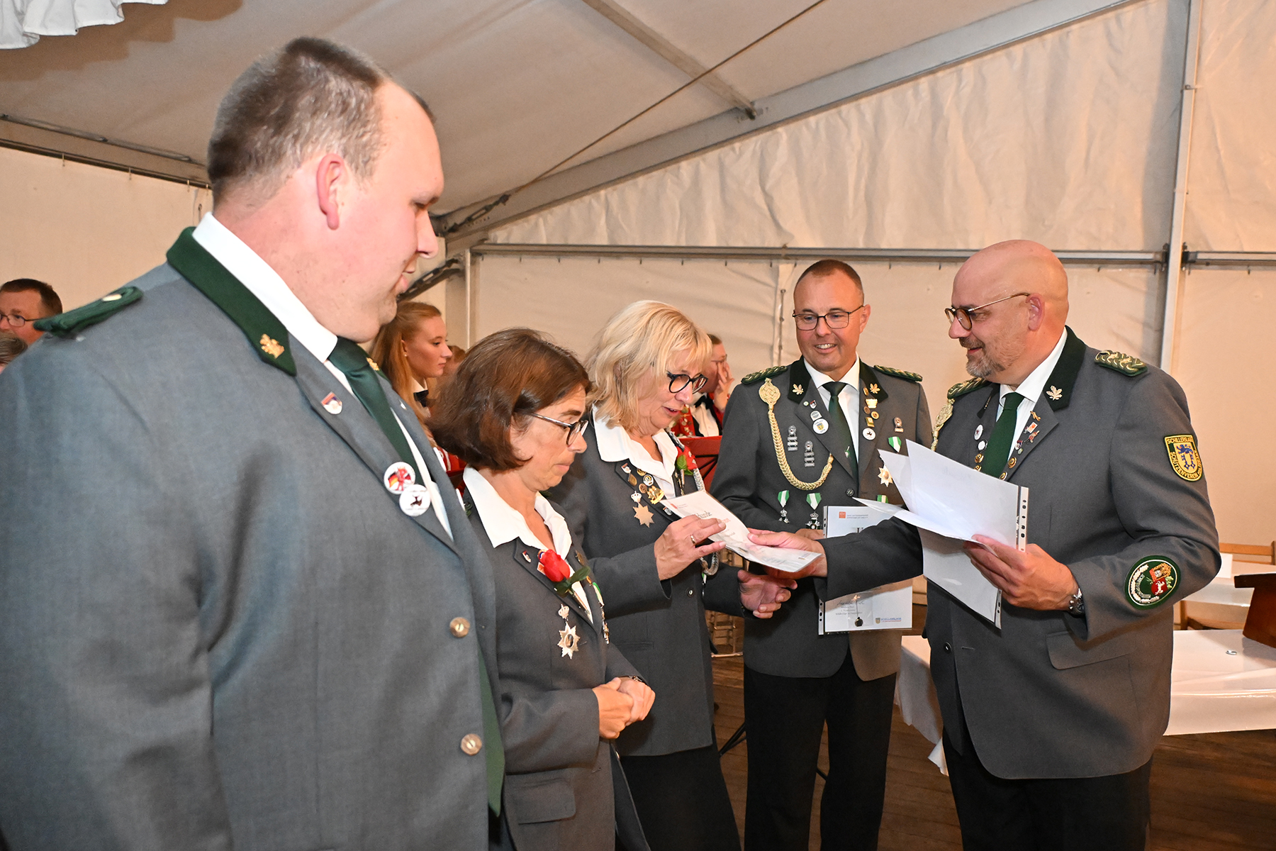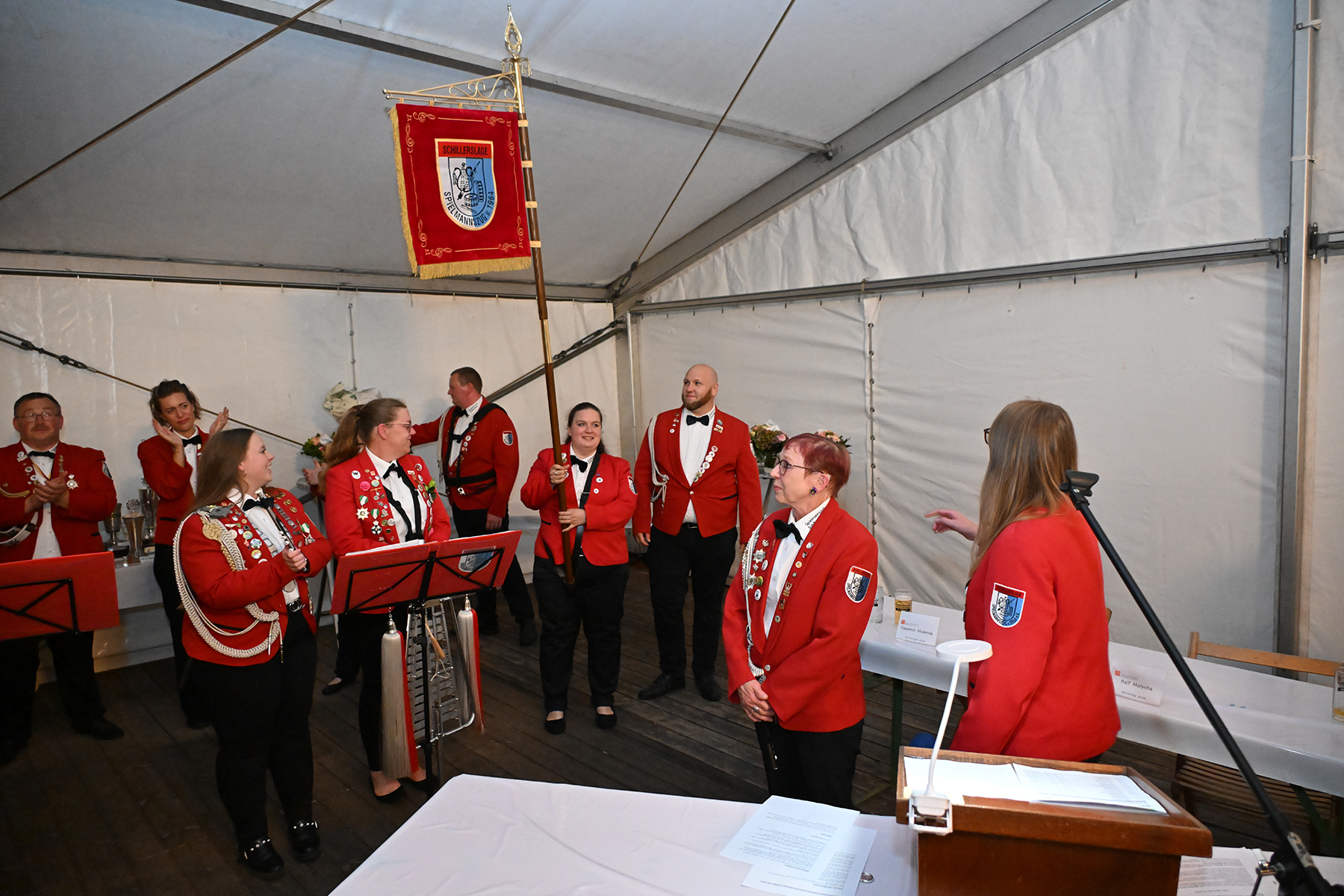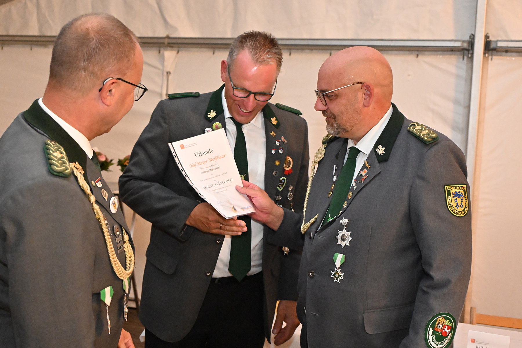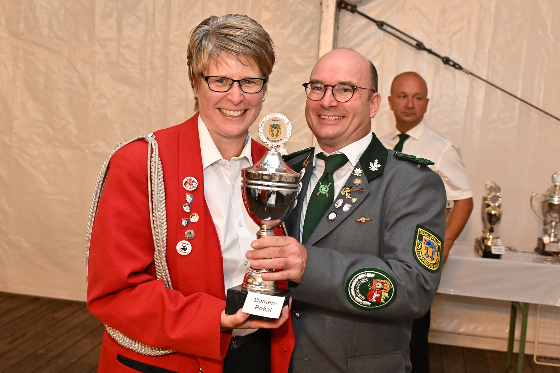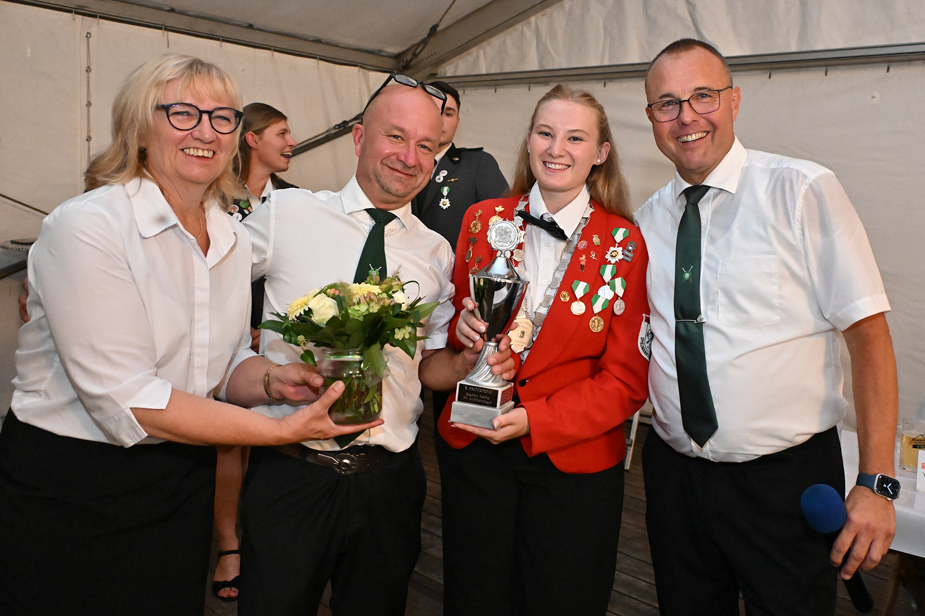 Besonders im Mittelpunkt steht in diesem Jahr der Spielmannszug, der seinen 60. Geburtstag feiert. Die Spielleute hatten anlässlich des runden Geburtstags einen Orden ausgeschossen, den Katharina Scharringhausen gewann. Standing Ovations erhielt Elke Nowicki, die dem Spielmannszug eine neue Standarte gespendet hatte. "Ich hoffe, dass wir noch viele Jahre zusammen haben", sagte die edle Spenderin. Zudem überreichte der Spielmannszug den Pokal der 1000 Möglichkeiten als Dank für besondere Verdienste an Gaby Malycha. Den Oldie-Pokal holte sich Nadine Bethmann, die auch den Damen-Wanderpokal gewann. Für fünfjährige Mitgliedschaft wurde Zoe Scharringhausen geehrt. Der SSV ehrte zudem Olaf Meyer-Weißhaar und Annedore Beinsen für 50-jährige Mitgliedschaft sowie Sven Boddien, Hendrik Bösch, Britta Lohmann und Inga Meyer für 25-jährige Mitgliedschaft im Verein.