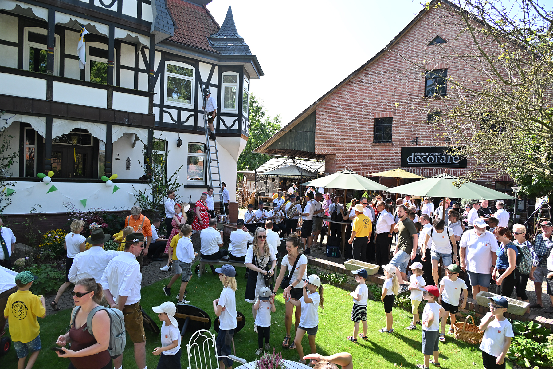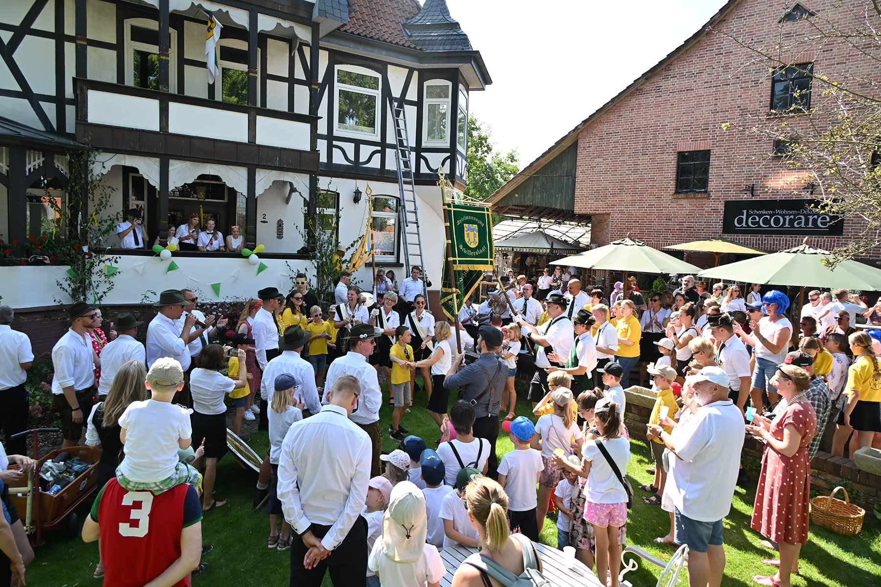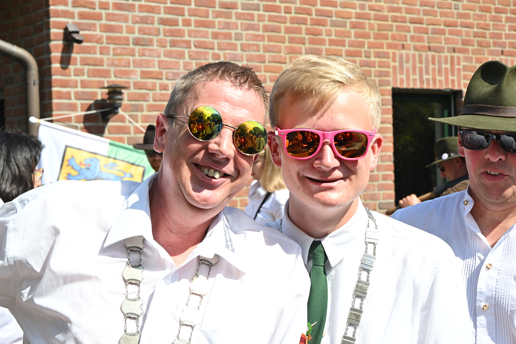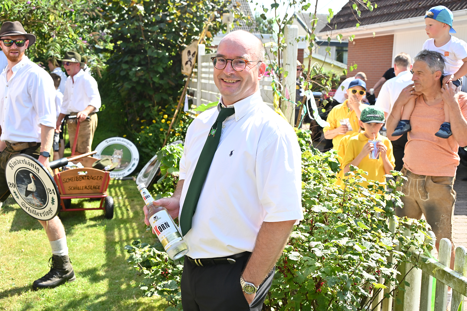 Schon am ersten Schützenfesttag, am Freitag, 23. August 2024, hatte der Vorsitzende des SSV Schillerslage, Matthias Huth, für den gestrigen Sonnabend eine Marscherleichterung ausgesprochen, denn "es wird kein schönes Wetter geben", so der 1. Vorsitzende beim Festkommers. 31 Grad Celsius waren vorhergesagt, und die Vorhersage sollte sich gestern dann auch bewahrheiten. So kamen die Schützen ohne Jacken und teilweise in kurzen Hosen zum Festumzug anlässlich des Scheibenaufhängens in Schillerslage.