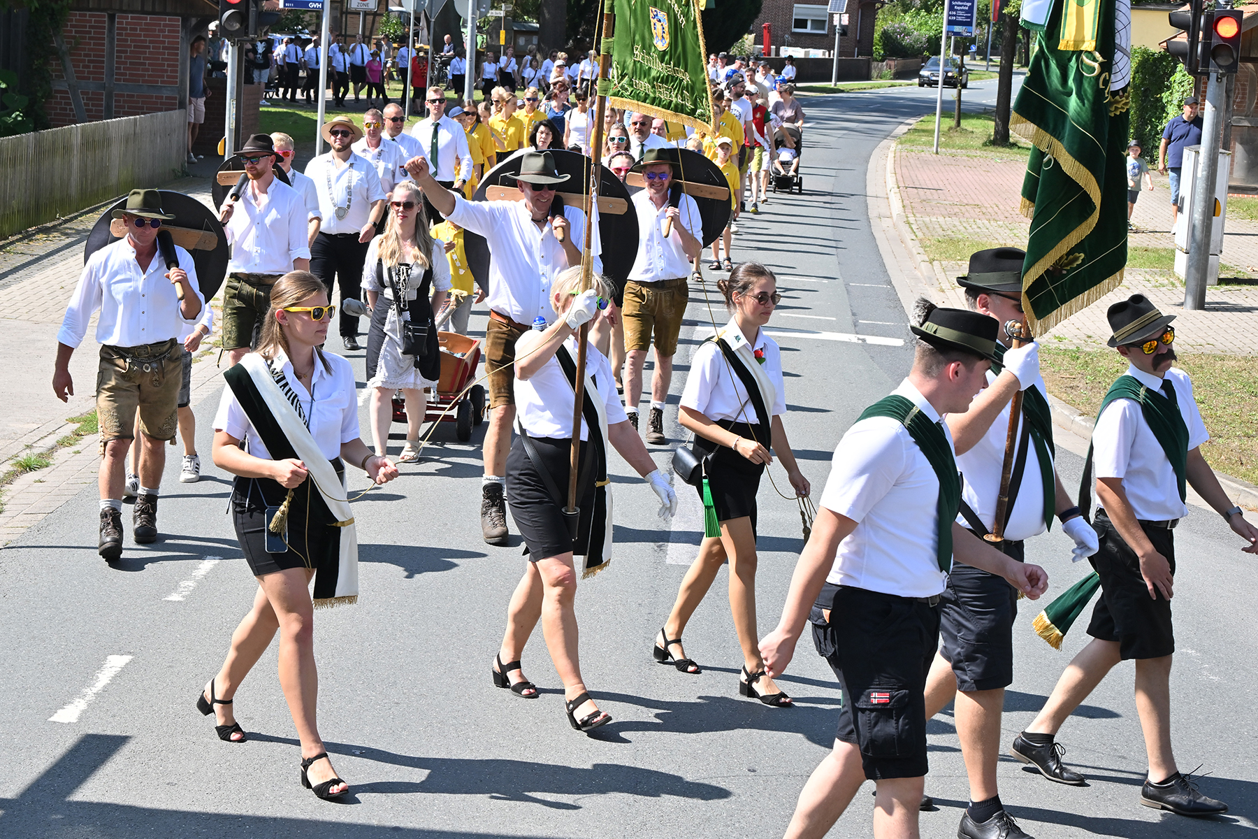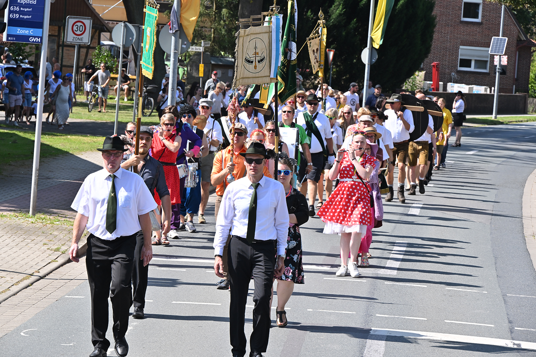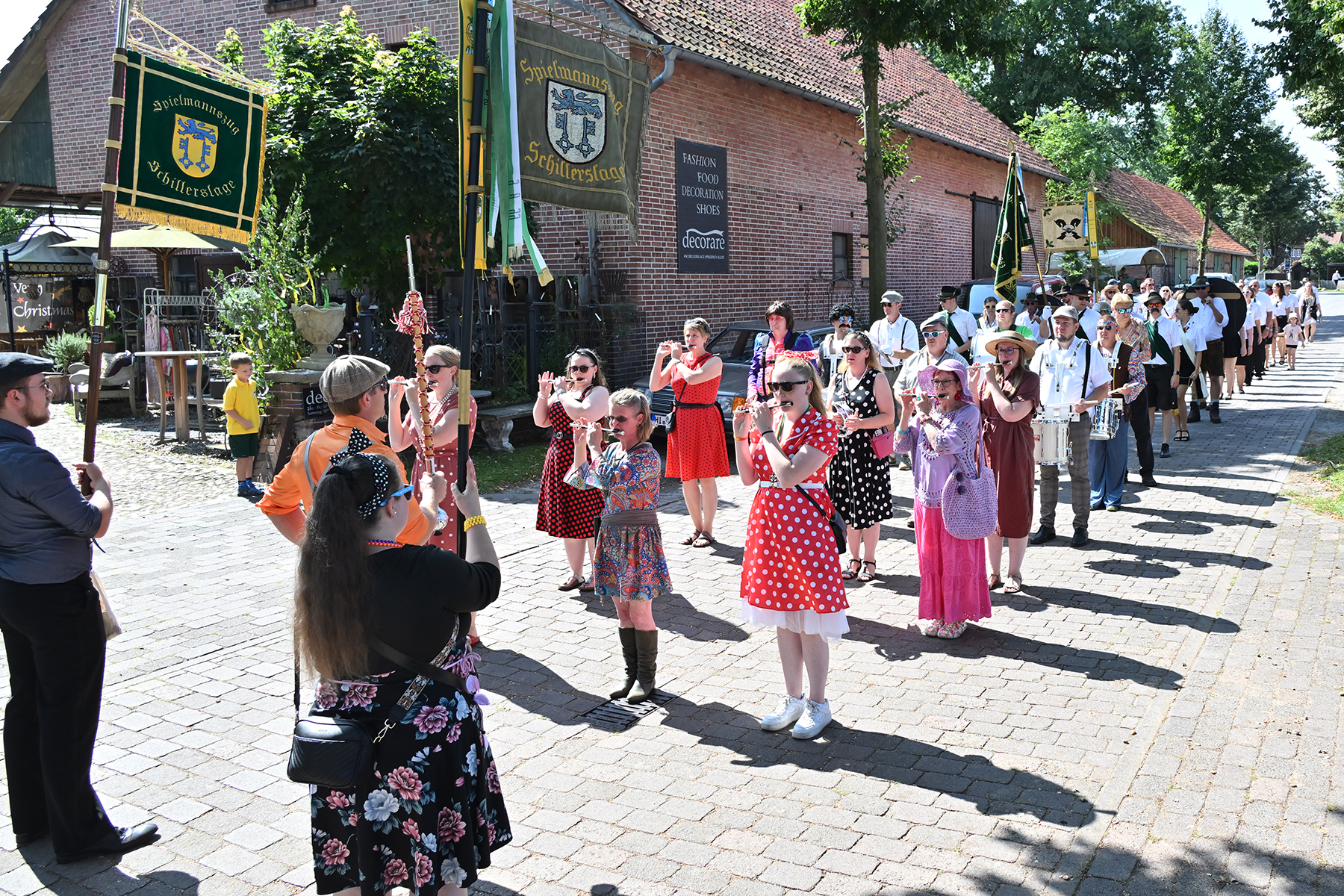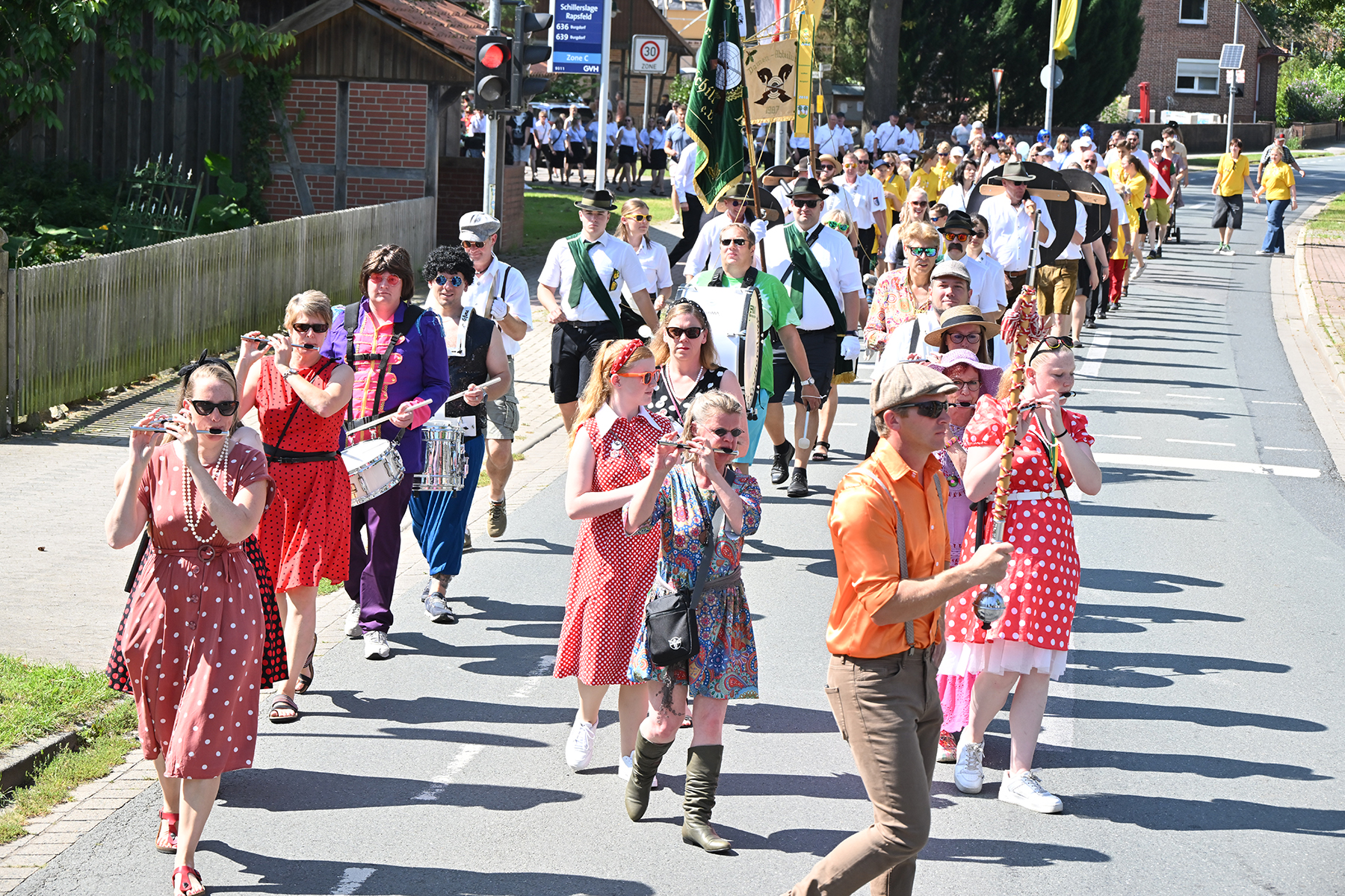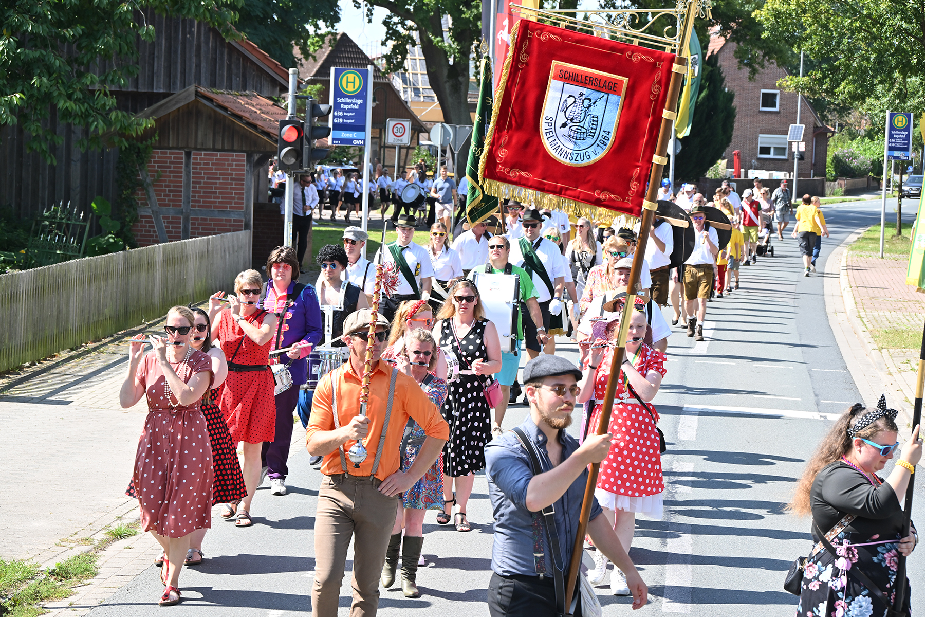 Der Schützenumzug, traditionell begleitet von der Musikkapelle Diekholzen und dem Spielmannszug Schillerslage, setzte sich dann fort. Der Spielmannszug hatte sich wieder besonders in Schale geworden: Die 1960er Jahre waren das Motto ihrer Kleidung. Weiter zog der Umzug dann zur Jugendkönigin Larissa Gawlik.