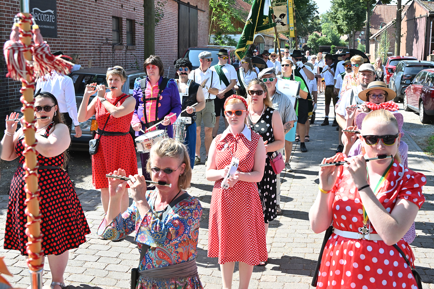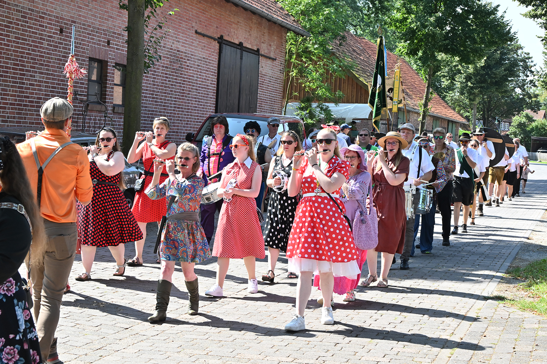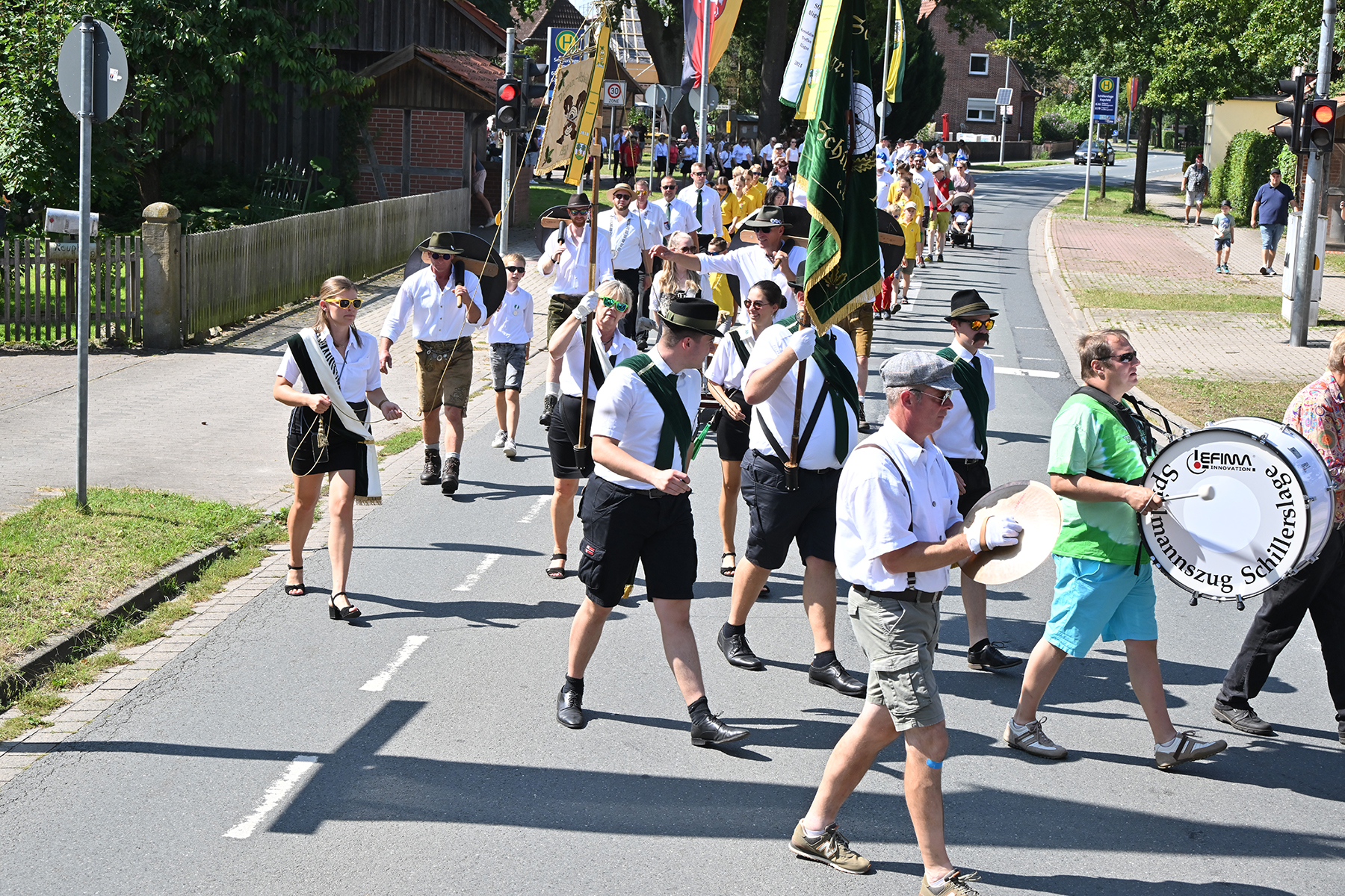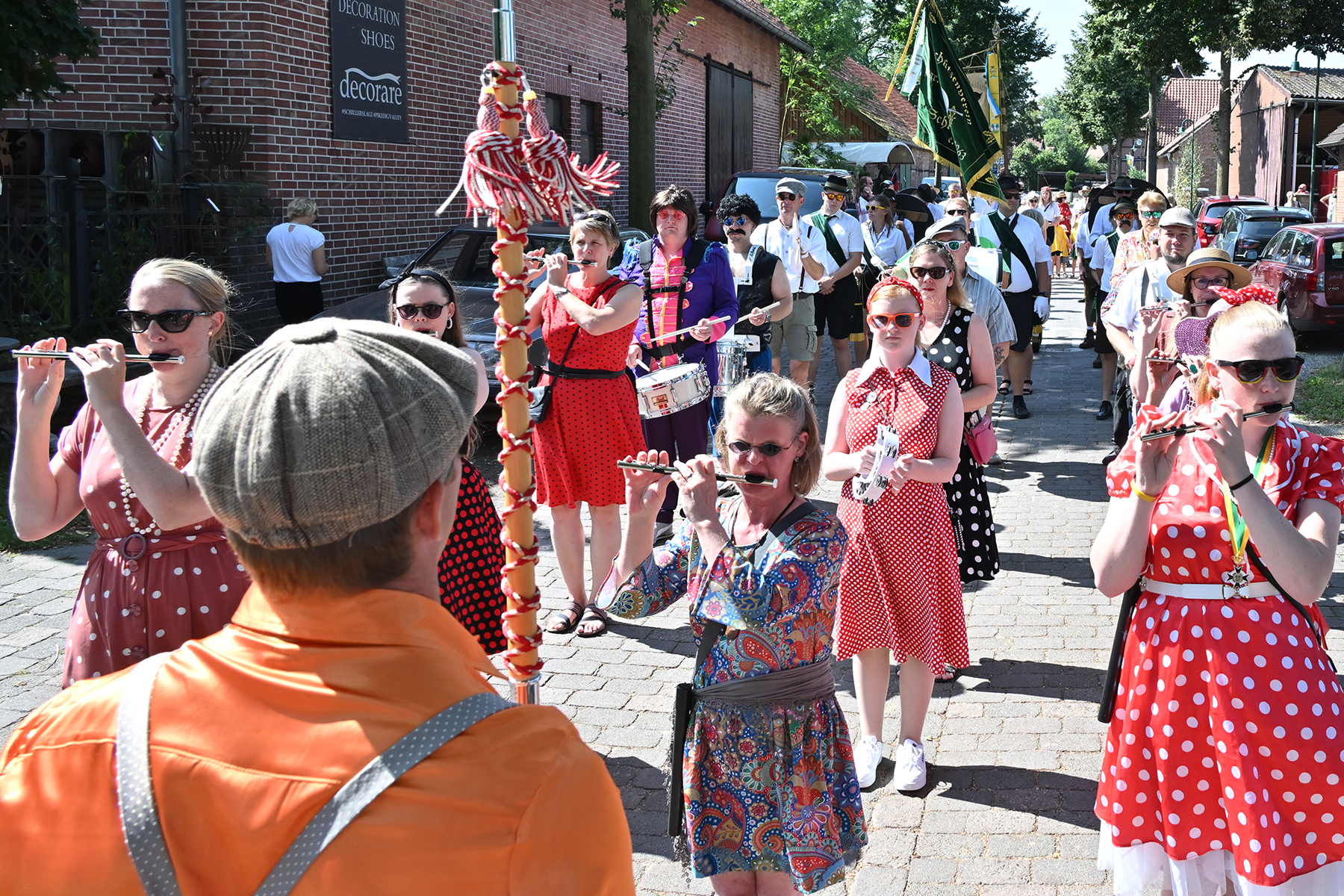 Der Schützenumzug, traditionell begleitet von der Musikkapelle Diekholzen und dem Spielmannszug Schillerslage, setzte sich dann fort. Der Spielmannszug hatte sich wieder besonders in Schale geworden: Die 1960er Jahre waren das Motto ihrer Kleidung. Weiter zog der Umzug dann zur Jugendkönigin Larissa Gawlik.