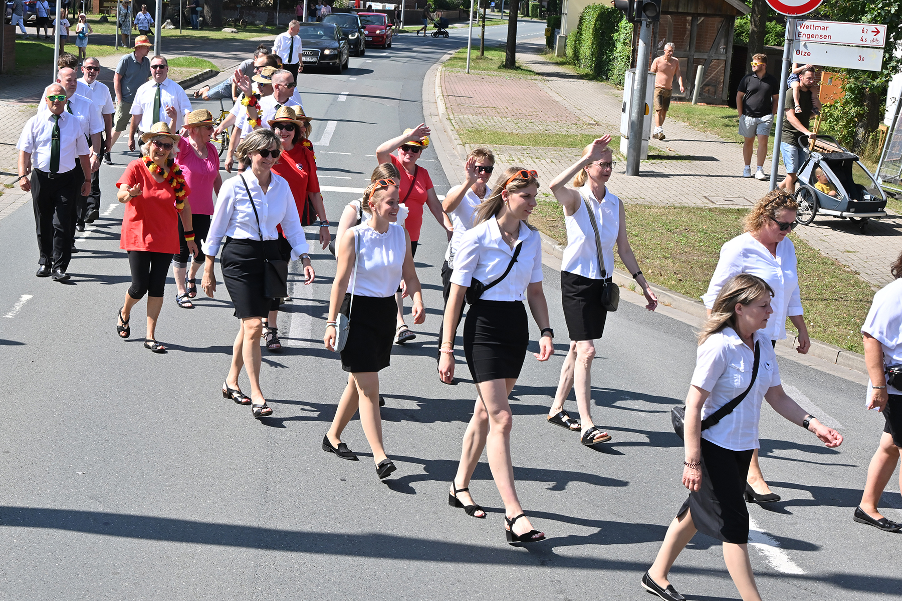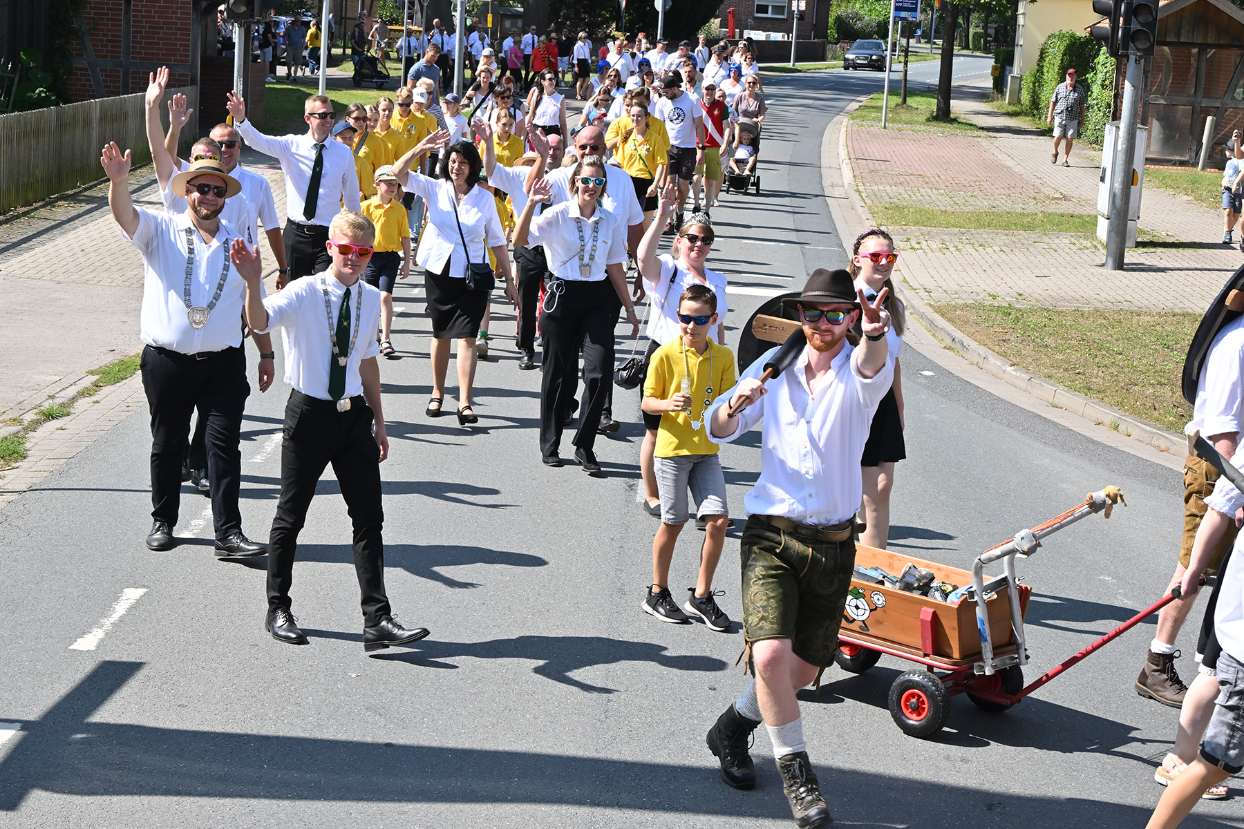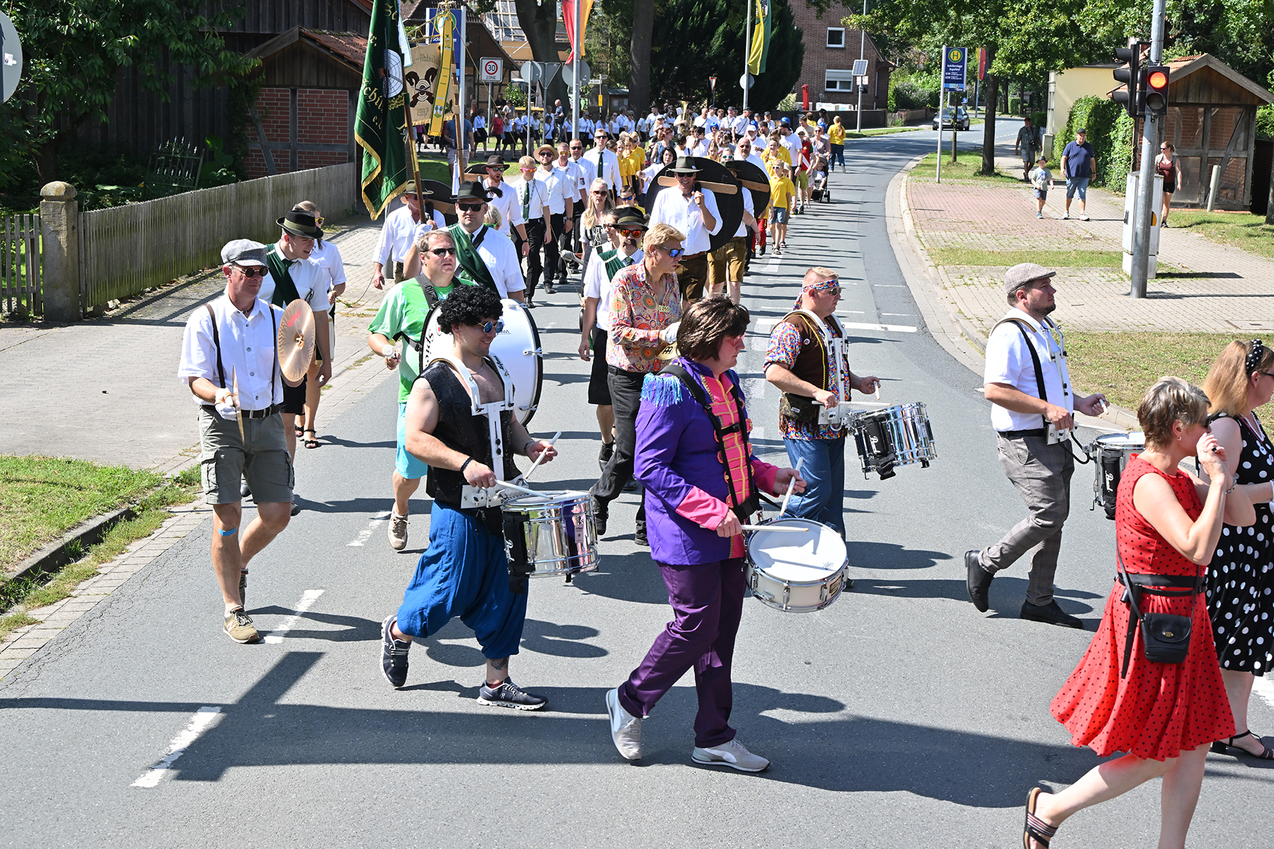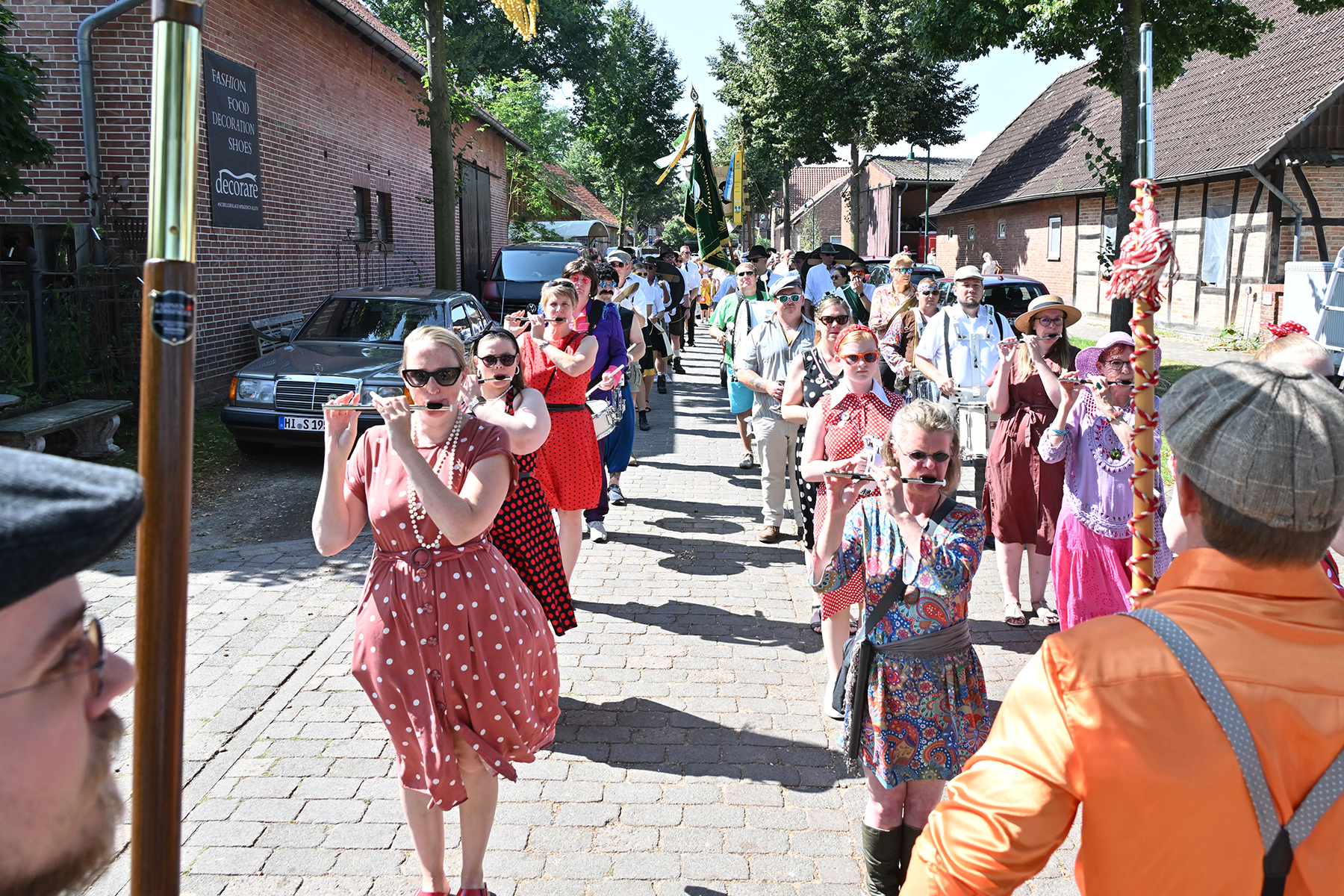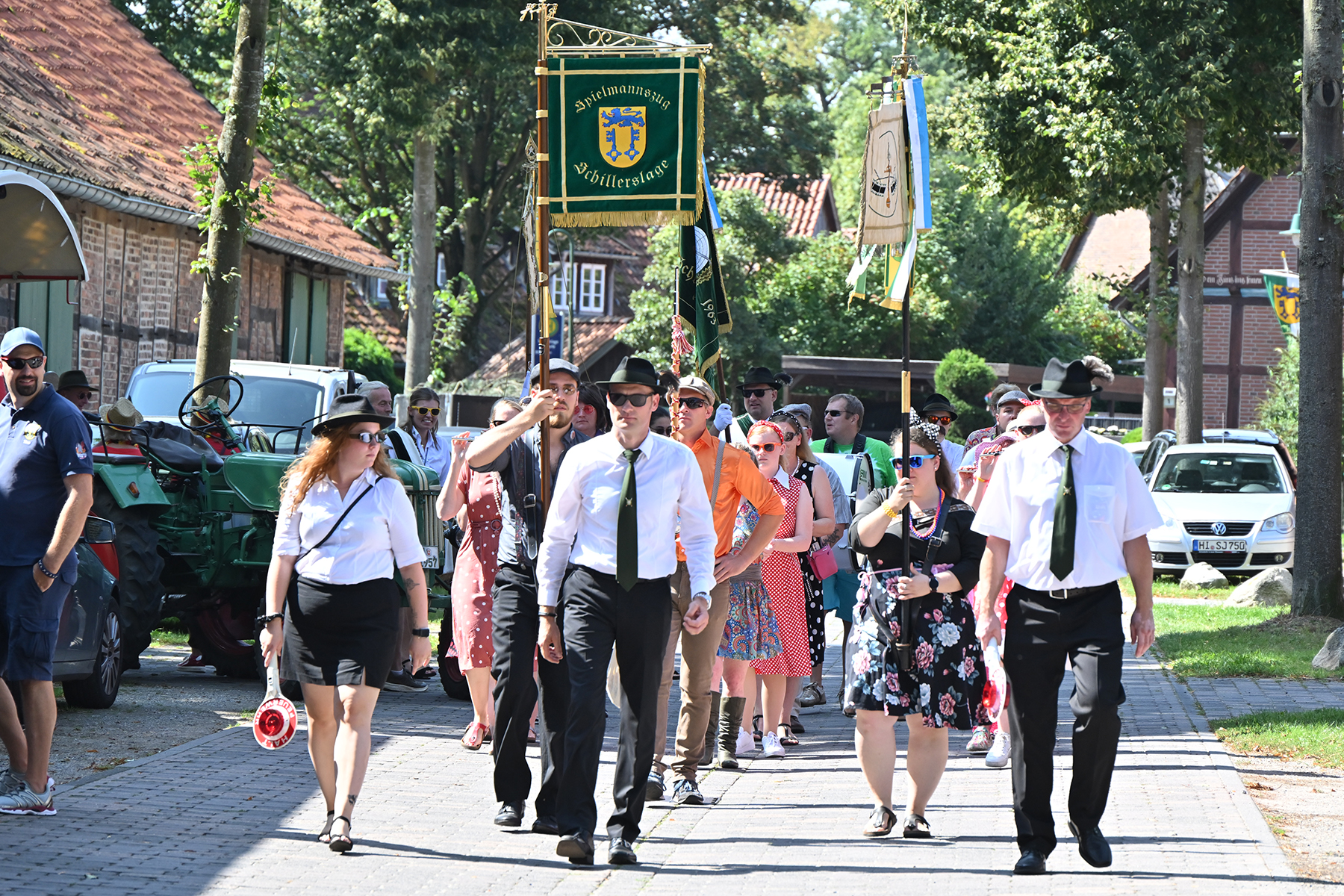 Der Schützenumzug, traditionell begleitet von der Musikkapelle Diekholzen und dem Spielmannszug Schillerslage, setzte sich dann fort. Der Spielmannszug hatte sich wieder besonders in Schale geworden: Die 1960er Jahre waren das Motto ihrer Kleidung. Weiter zog der Umzug dann zur Jugendkönigin Larissa Gawlik.