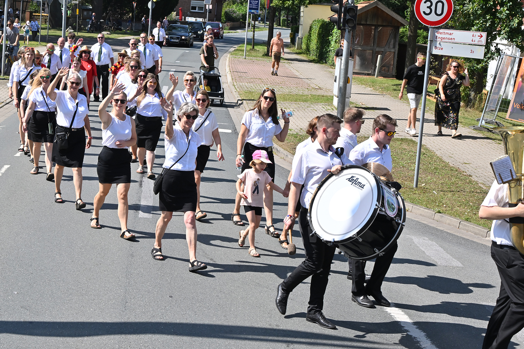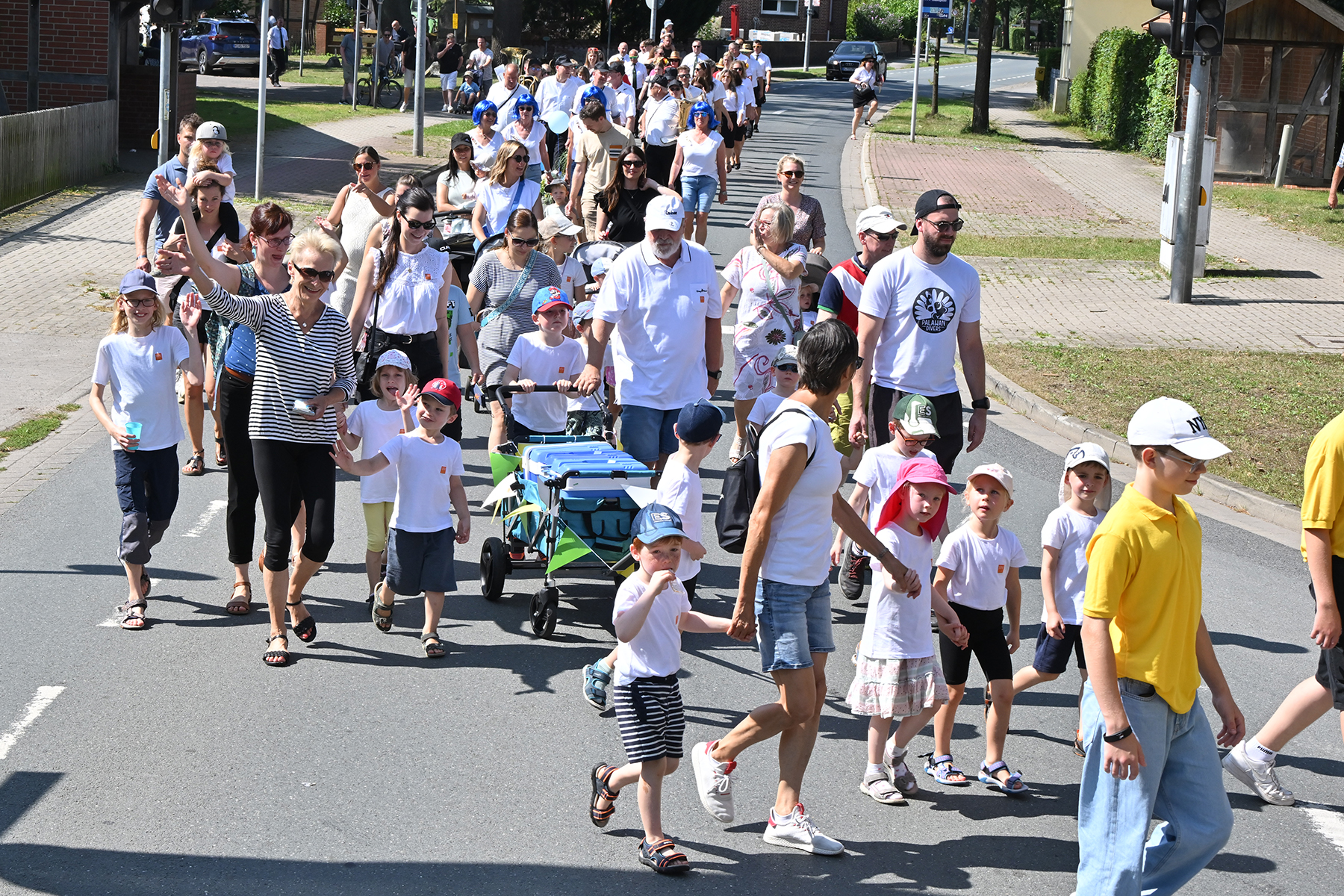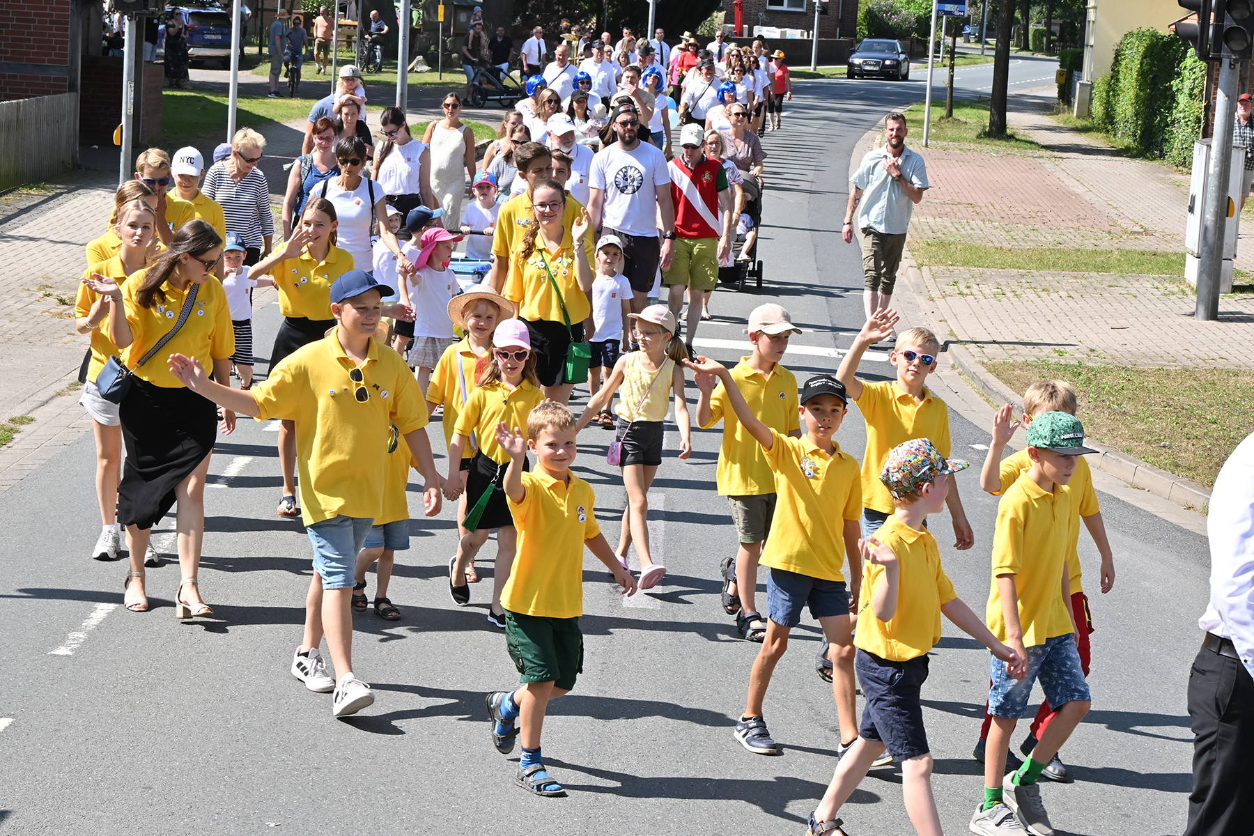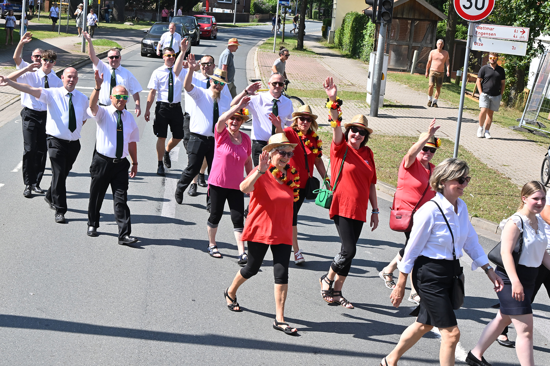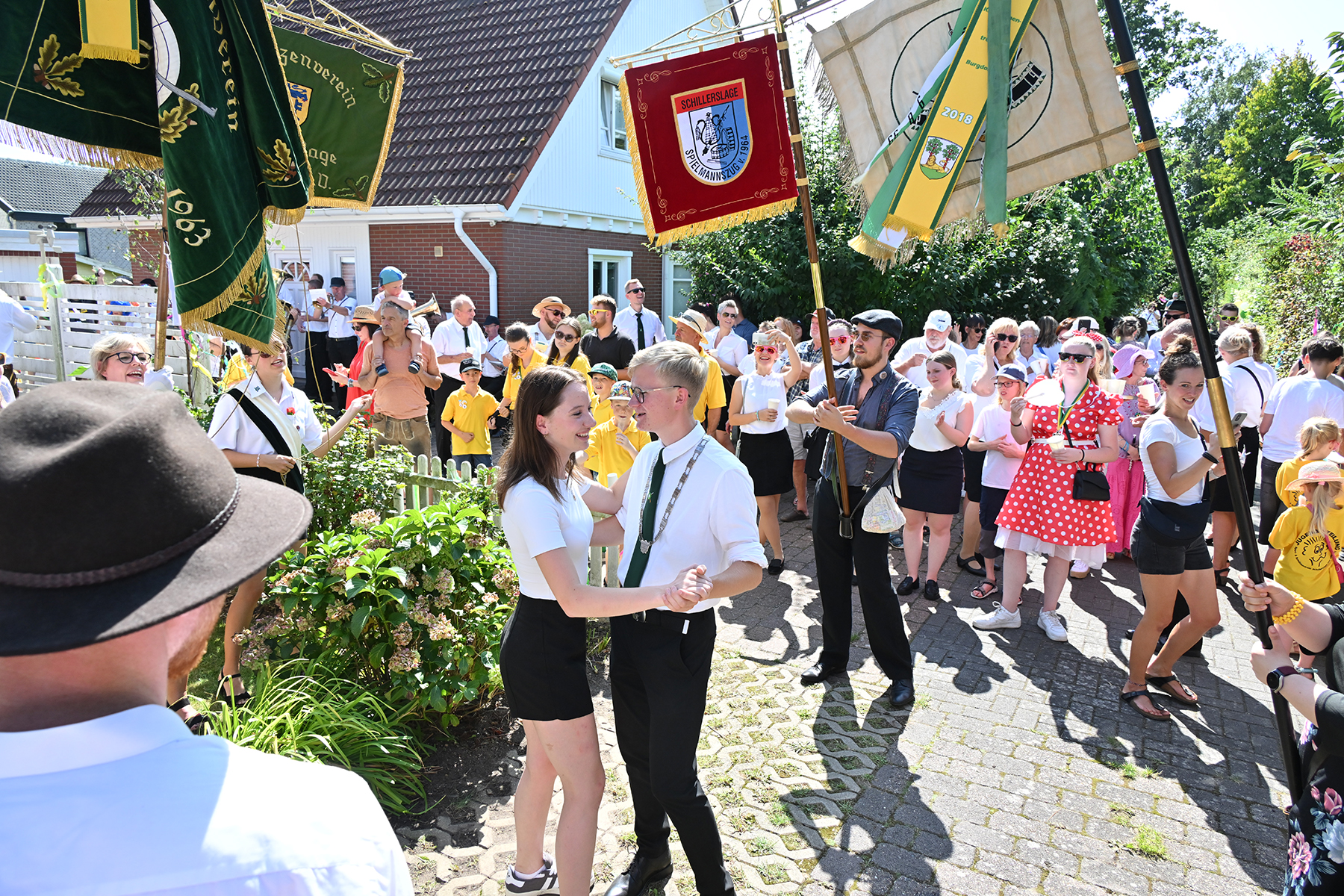 Der Schützenumzug, traditionell begleitet von der Musikkapelle Diekholzen und dem Spielmannszug Schillerslage, setzte sich dann fort. Der Spielmannszug hatte sich wieder besonders in Schale geworden: Die 1960er Jahre waren das Motto ihrer Kleidung. Weiter zog der Umzug dann zur Jugendkönigin Larissa Gawlik.