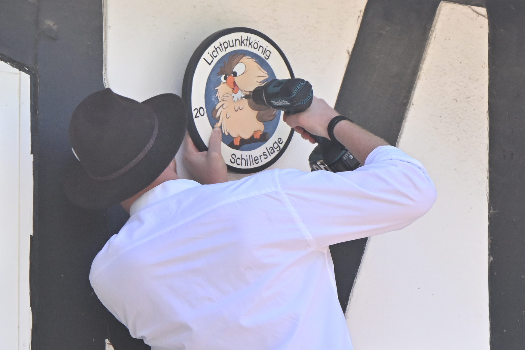 Kinderkönig Bennett Hinkelmann passte beim Aufhängen seiner Scheibe besonders auf. Er schien zu wissen, dass die Scheibe traditionell zunächst ein wenig schief aufgehängt wird, und befahl deshalb, dass auch seine Scheibe zunächst einmal auf dem Kopf stehen sollte. Mit ein paar begleitenden Anweisungen wurde die Scheibe schließlich korrekt angebracht.